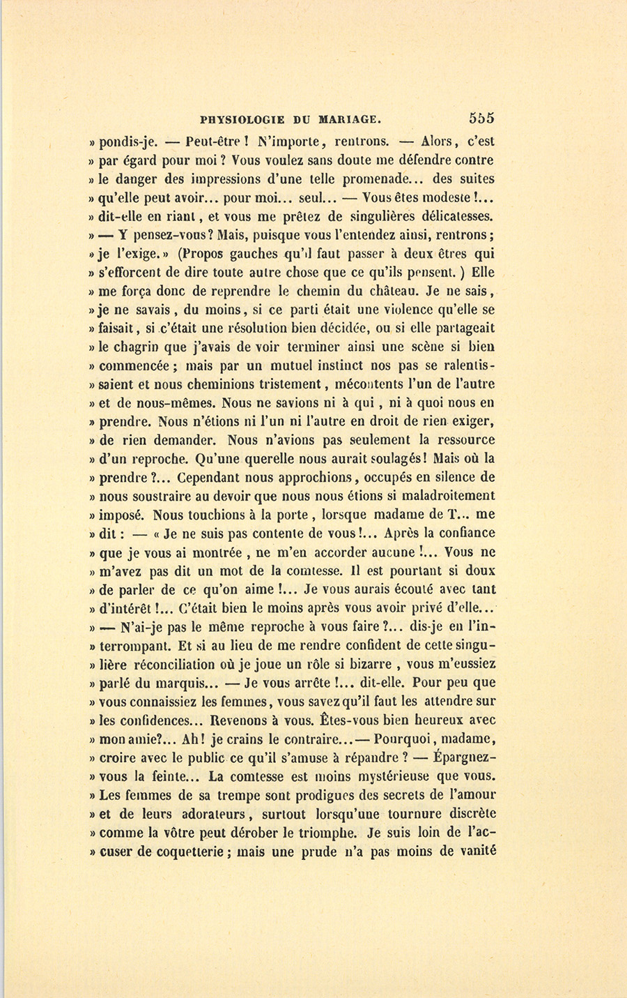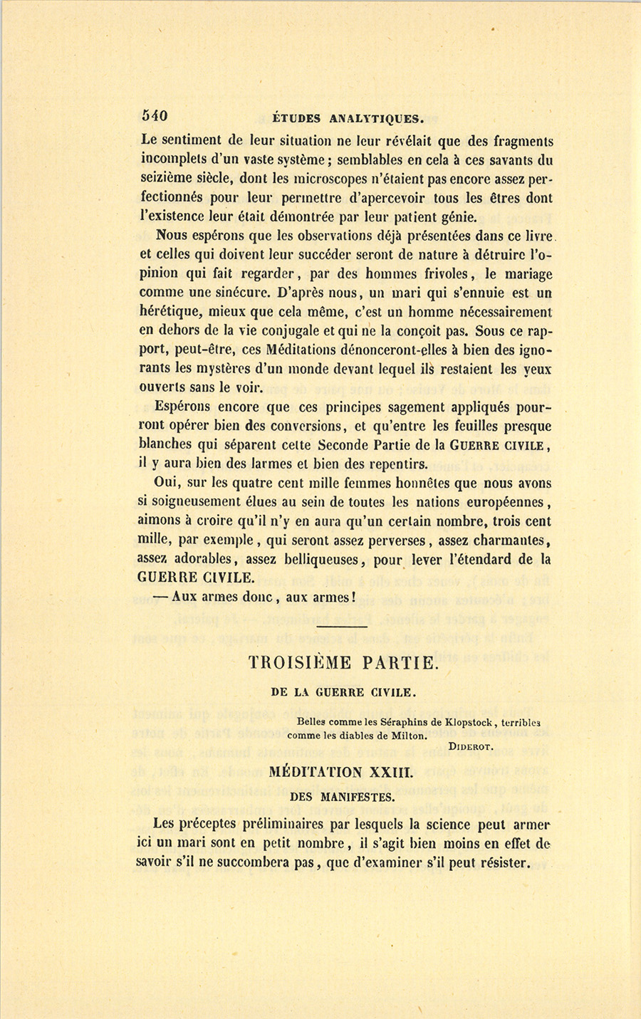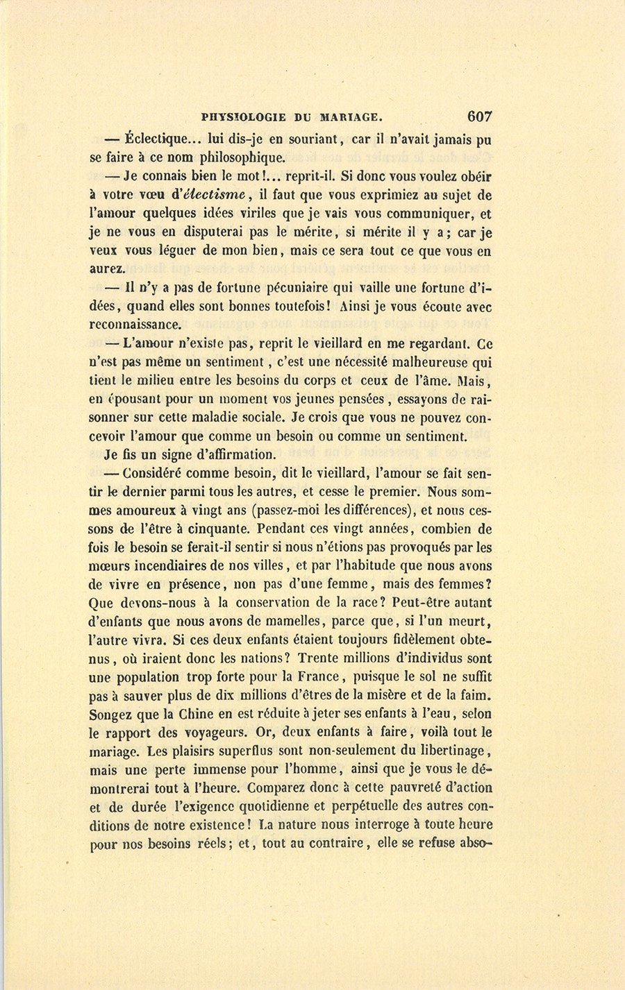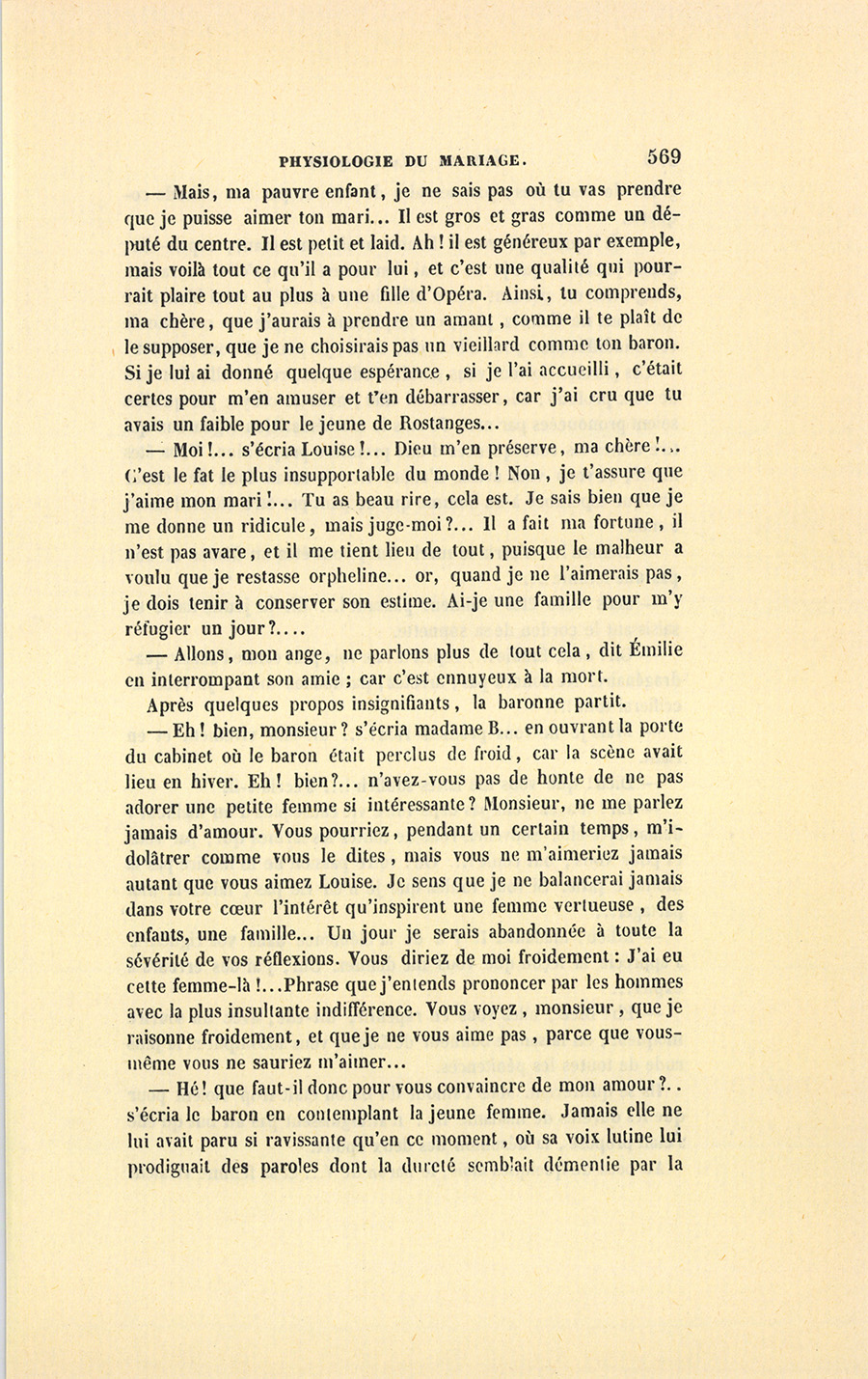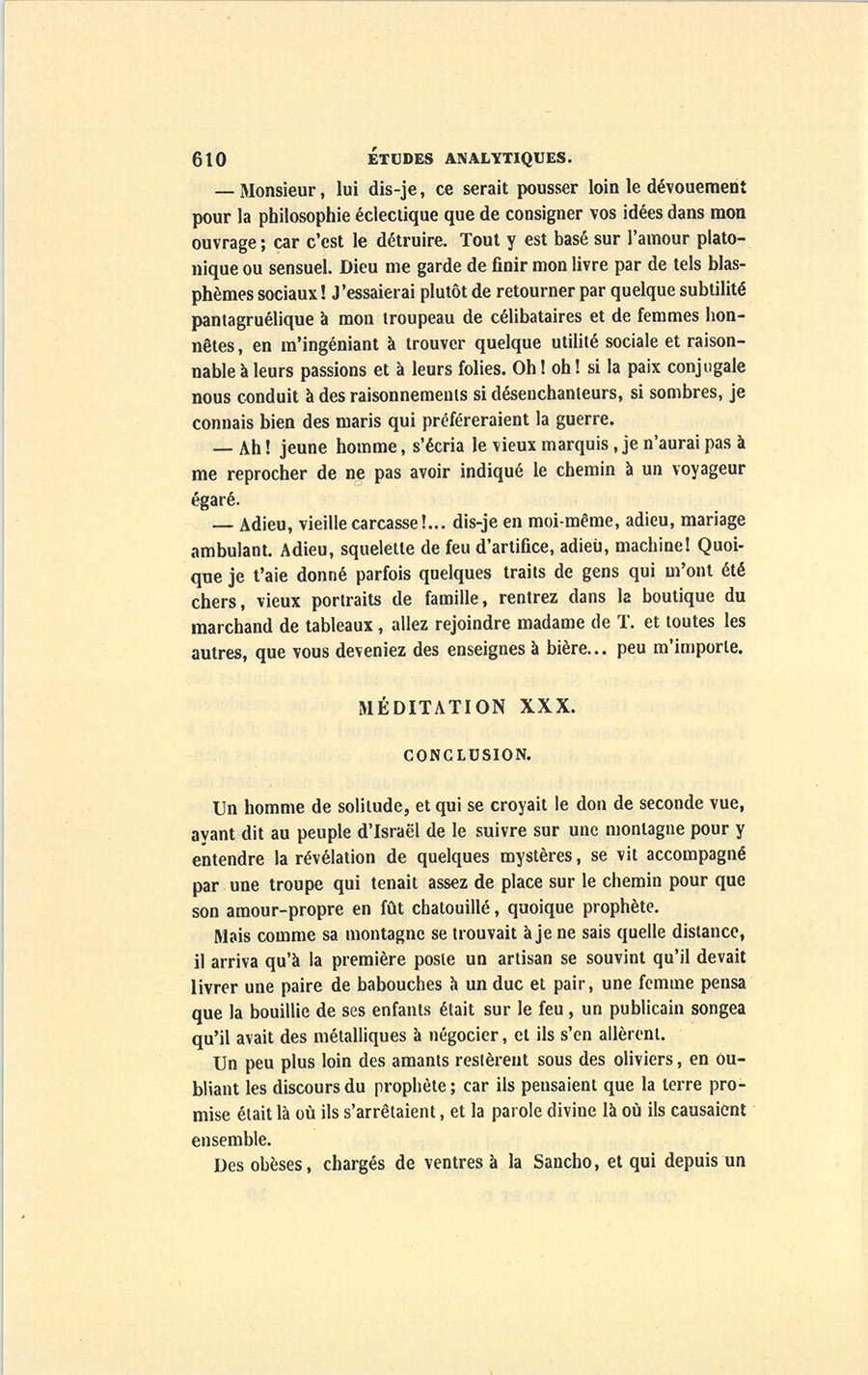 {p. 610} – Monsieur, lui dis-je, ce serait pousser loin le dévouement pour la philosophie éclectique que de consigner vos idées dans mon ouvrage ; car c’est le détruire. Tout y est basé sur l’amour platonique ou sensuel. Dieu me garde de finir mon livre par de tels blasphèmes sociaux ! J’essaierai plutôt de retourner par quelque subtilité pantagruélique à mon troupeau de célibataires et de femmes honnêtes, en m’ingéniant à trouver quelque utilité sociale et raisonnable à leurs passions et à leurs folies. Oh ! oh ! si la paix conjugale nous conduit à des raisonnements si désenchanteurs, si sombres, je connais bien des maris qui préféreraient la guerre.
