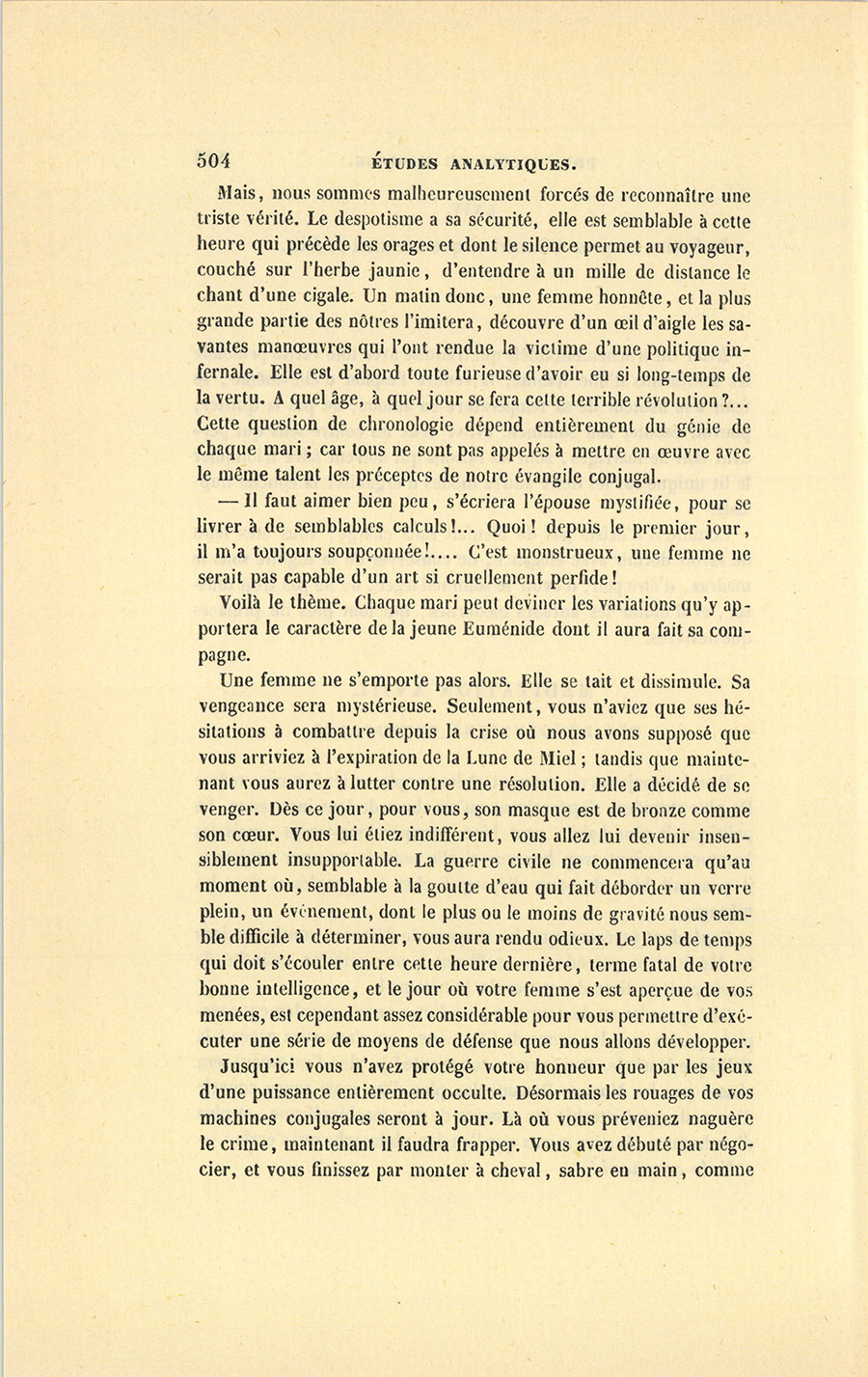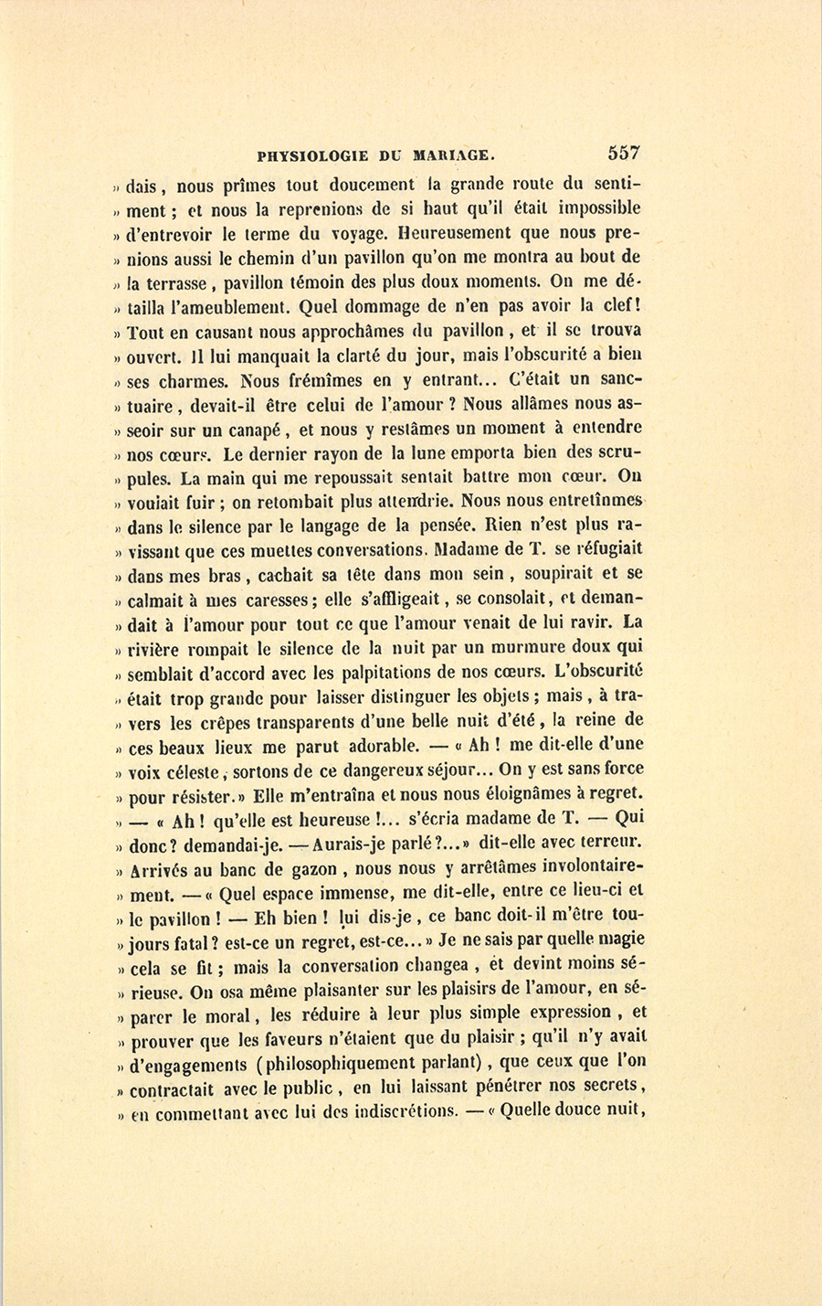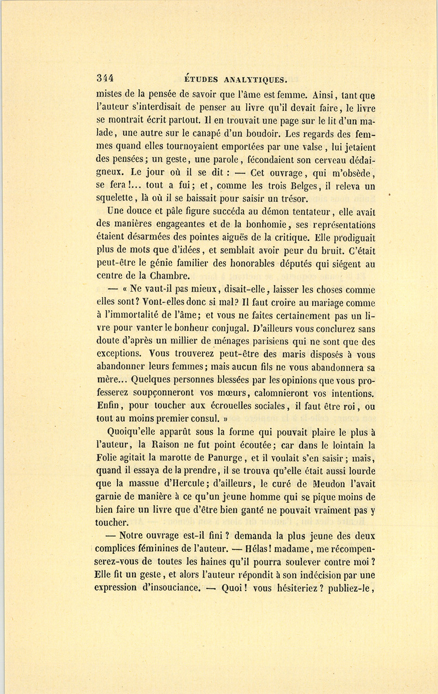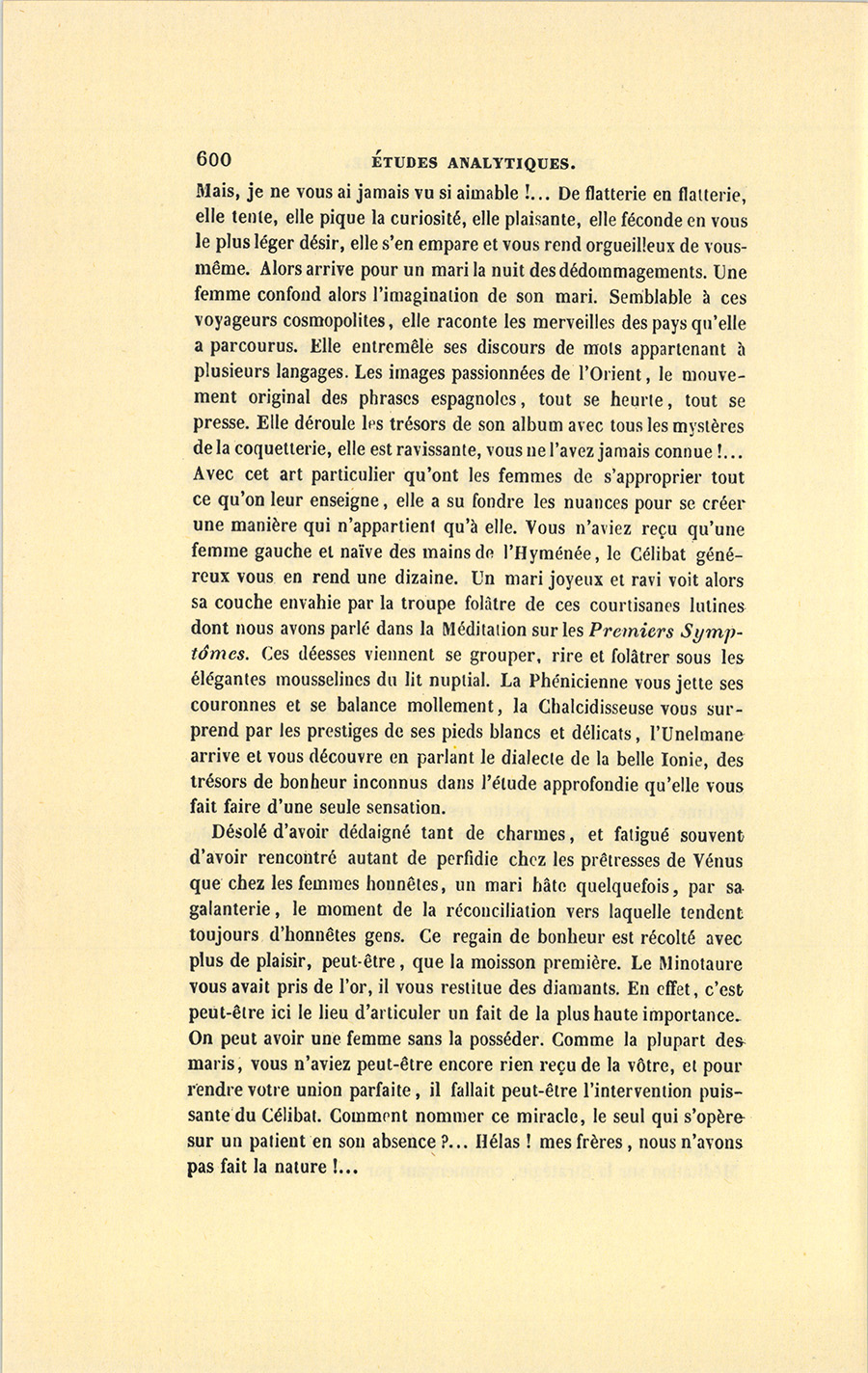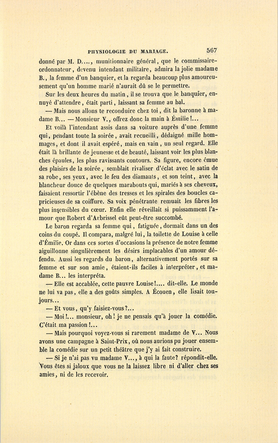 {p. 610} – Monsieur, lui dis-je, ce serait pousser loin le dévouement pour la philosophie éclectique que de consigner vos idées dans mon ouvrage ; car c’est le détruire. Tout y est basé sur l’amour platonique ou sensuel. Dieu me garde de finir mon livre par de tels blasphèmes sociaux ! J’essaierai plutôt de retourner par quelque subtilité pantagruélique à mon troupeau de célibataires et de femmes honnêtes, en m’ingéniant à trouver quelque utilité sociale et raisonnable à leurs passions et à leurs folies. Oh ! oh ! si la paix conjugale nous conduit à des raisonnements si désenchanteurs, si sombres, je connais bien des maris qui préféreraient la guerre.