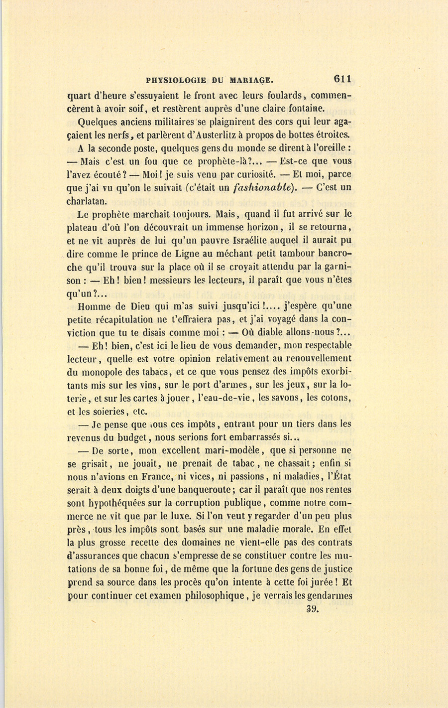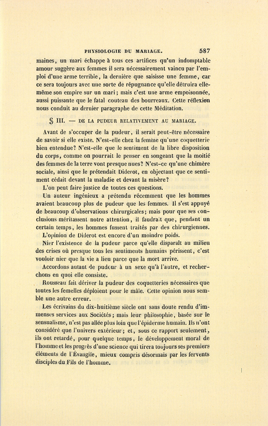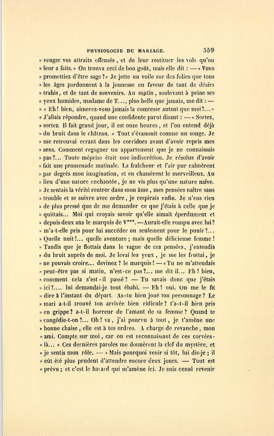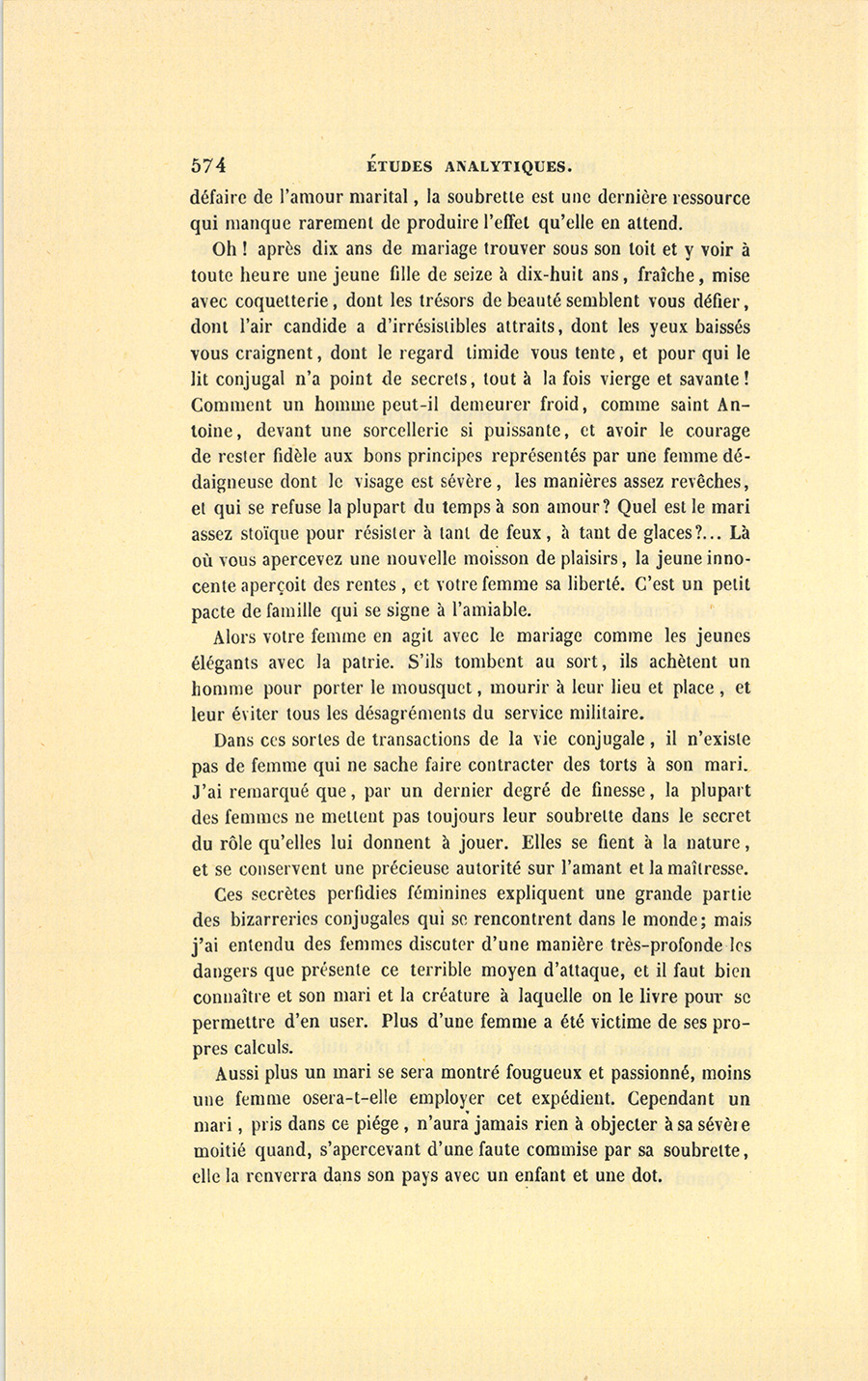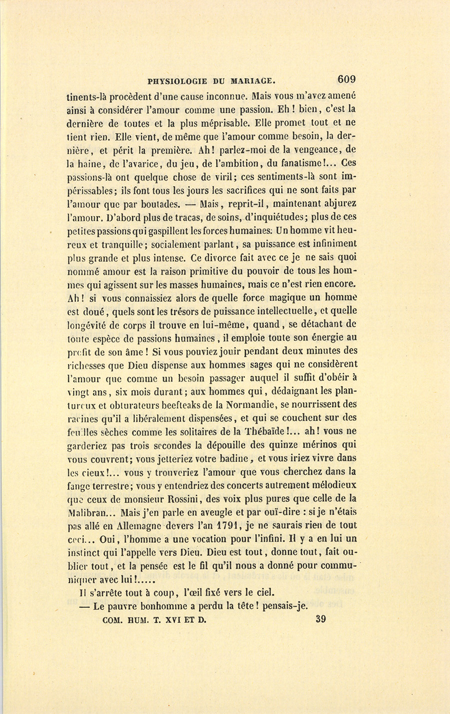 {p. 610} – Monsieur, lui dis-je, ce serait pousser loin le dévouement pour la philosophie éclectique que de consigner vos idées dans mon ouvrage ; car c’est le détruire. Tout y est basé sur l’amour platonique ou sensuel. Dieu me garde de finir mon livre par de tels blasphèmes sociaux ! J’essaierai plutôt de retourner par quelque subtilité pantagruélique à mon troupeau de célibataires et de femmes honnêtes, en m’ingéniant à trouver quelque utilité sociale et raisonnable à leurs passions et à leurs folies. Oh ! oh ! si la paix conjugale nous conduit à des raisonnements si désenchanteurs, si sombres, je connais bien des maris qui préféreraient la guerre.