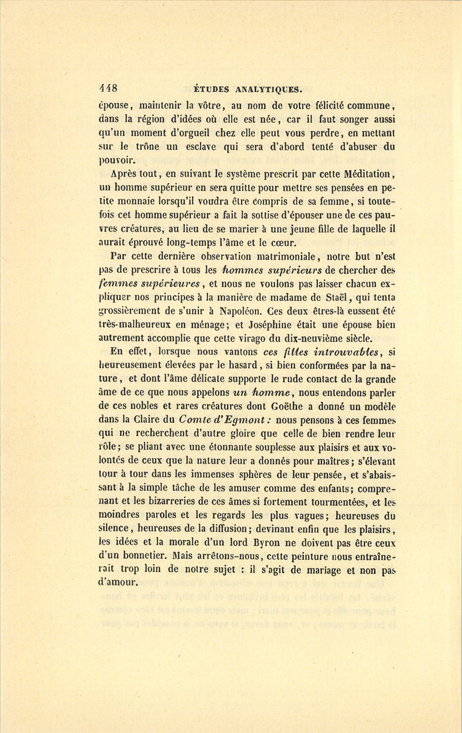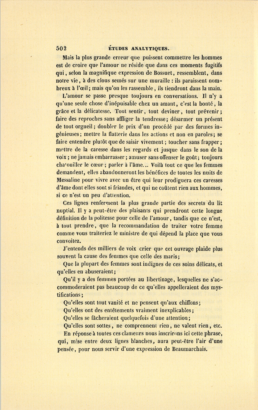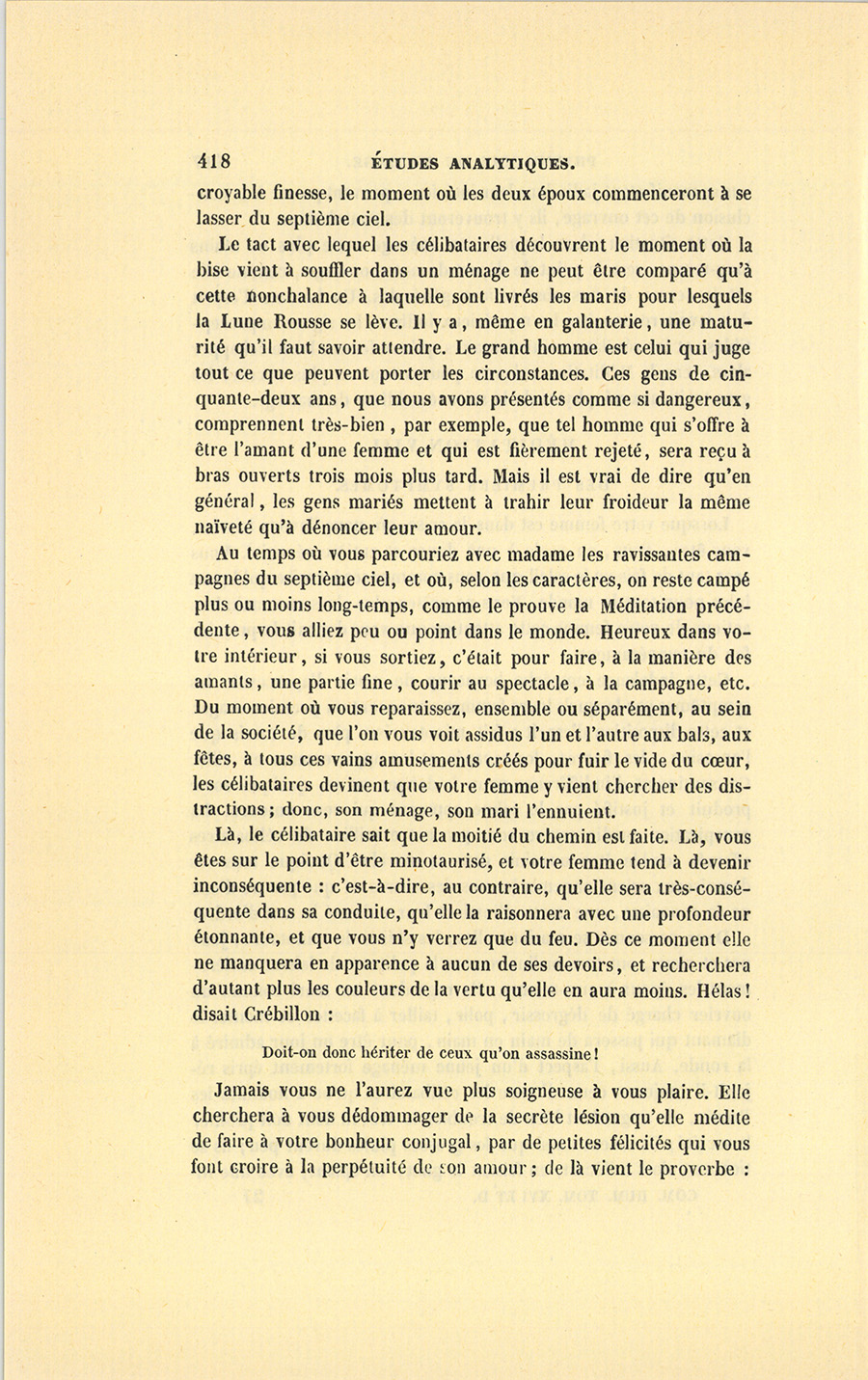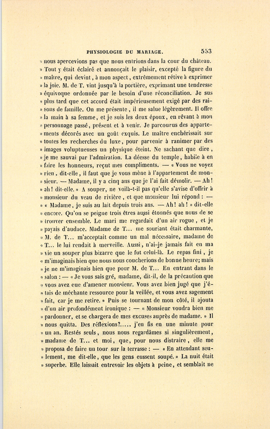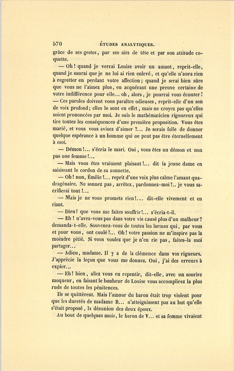 {p. 610} – Monsieur, lui dis-je, ce serait pousser loin le dévouement pour la philosophie éclectique que de consigner vos idées dans mon ouvrage ; car c’est le détruire. Tout y est basé sur l’amour platonique ou sensuel. Dieu me garde de finir mon livre par de tels blasphèmes sociaux ! J’essaierai plutôt de retourner par quelque subtilité pantagruélique à mon troupeau de célibataires et de femmes honnêtes, en m’ingéniant à trouver quelque utilité sociale et raisonnable à leurs passions et à leurs folies. Oh ! oh ! si la paix conjugale nous conduit à des raisonnements si désenchanteurs, si sombres, je connais bien des maris qui préféreraient la guerre.