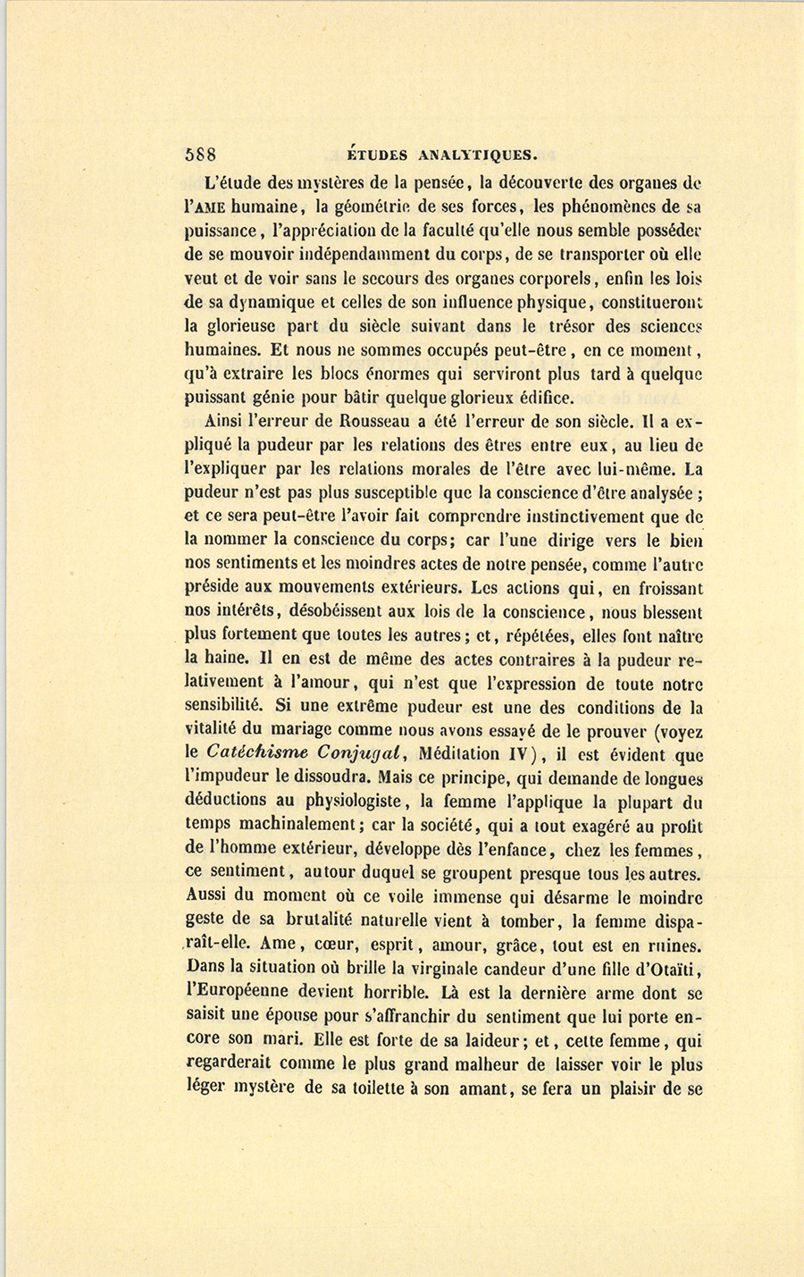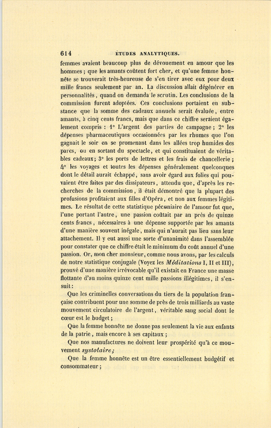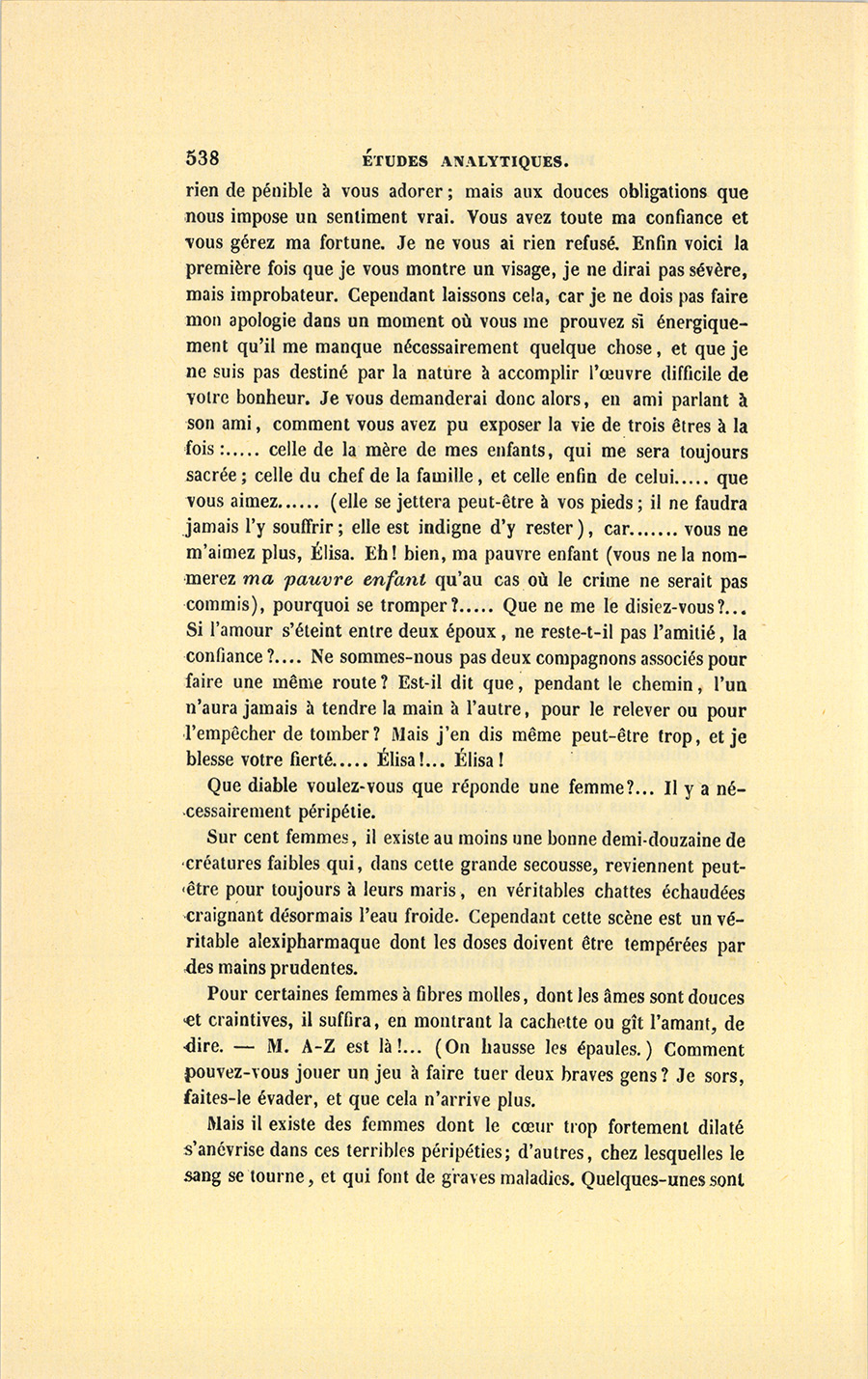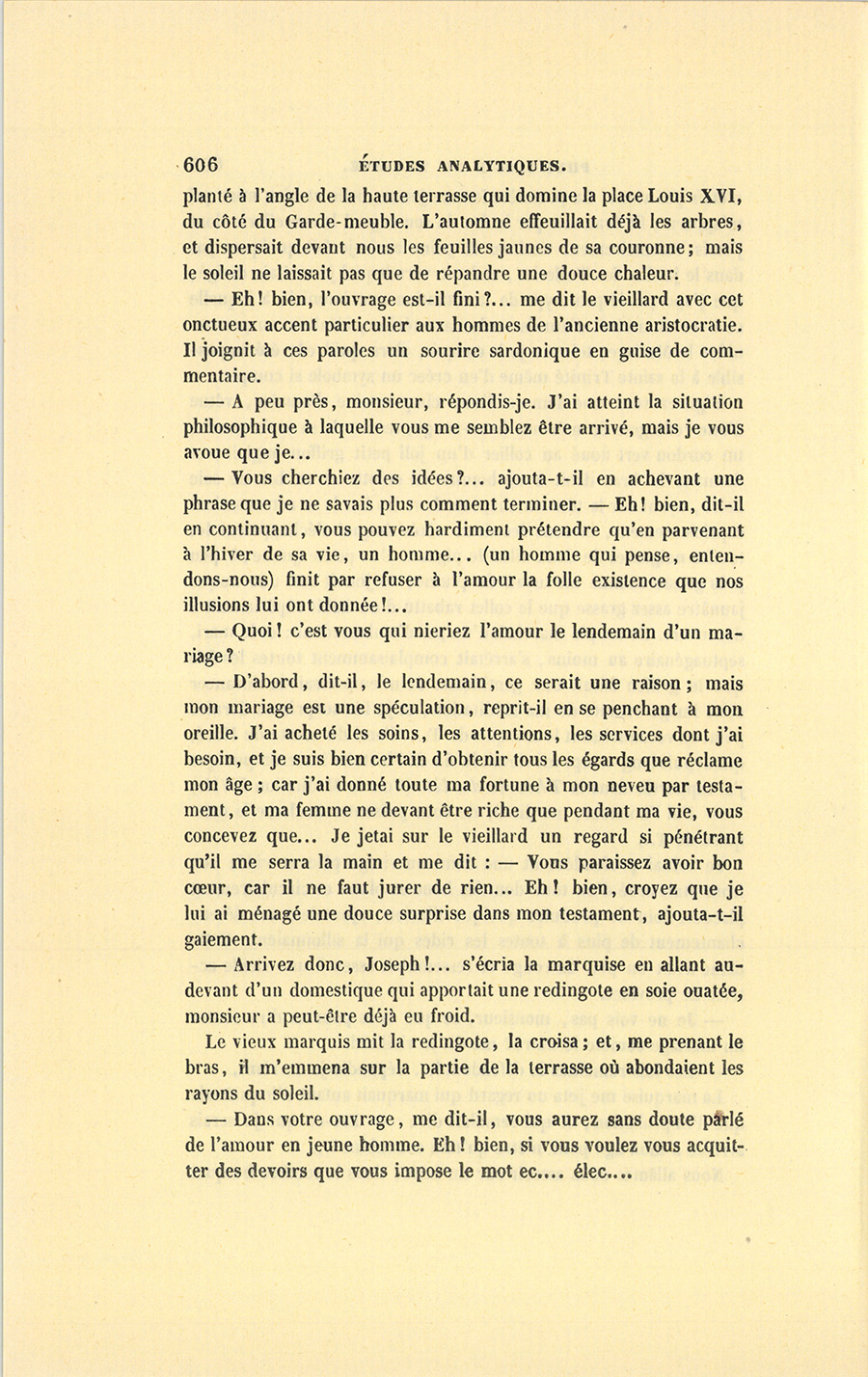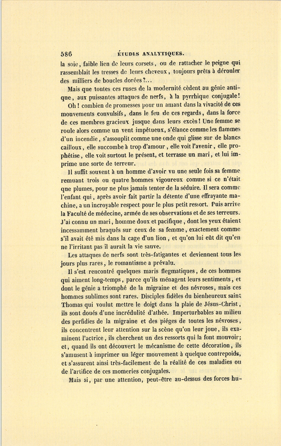 {p. 610} – Monsieur, lui dis-je, ce serait pousser loin le dévouement pour la philosophie éclectique que de consigner vos idées dans mon ouvrage ; car c’est le détruire. Tout y est basé sur l’amour platonique ou sensuel. Dieu me garde de finir mon livre par de tels blasphèmes sociaux ! J’essaierai plutôt de retourner par quelque subtilité pantagruélique à mon troupeau de célibataires et de femmes honnêtes, en m’ingéniant à trouver quelque utilité sociale et raisonnable à leurs passions et à leurs folies. Oh ! oh ! si la paix conjugale nous conduit à des raisonnements si désenchanteurs, si sombres, je connais bien des maris qui préféreraient la guerre.