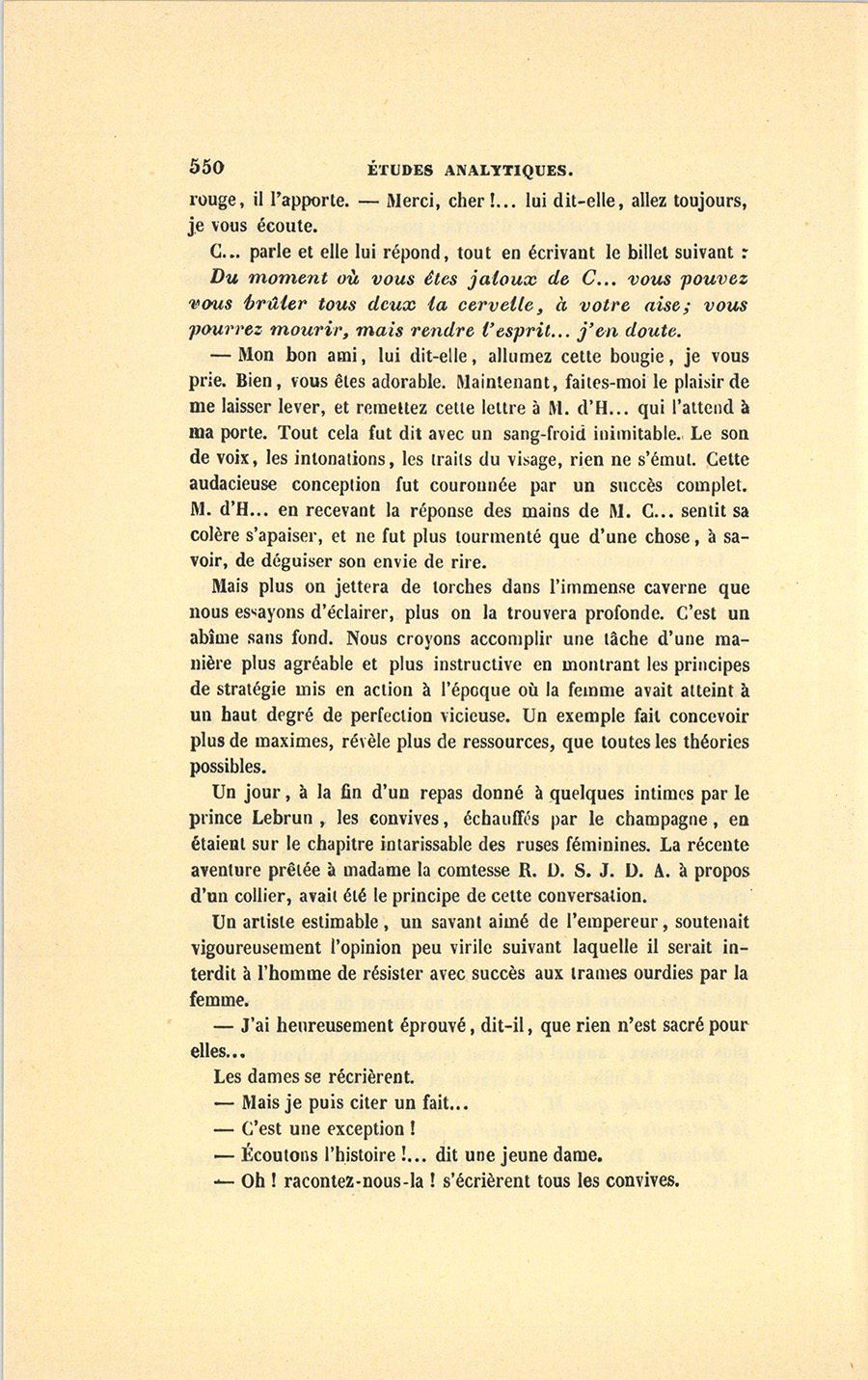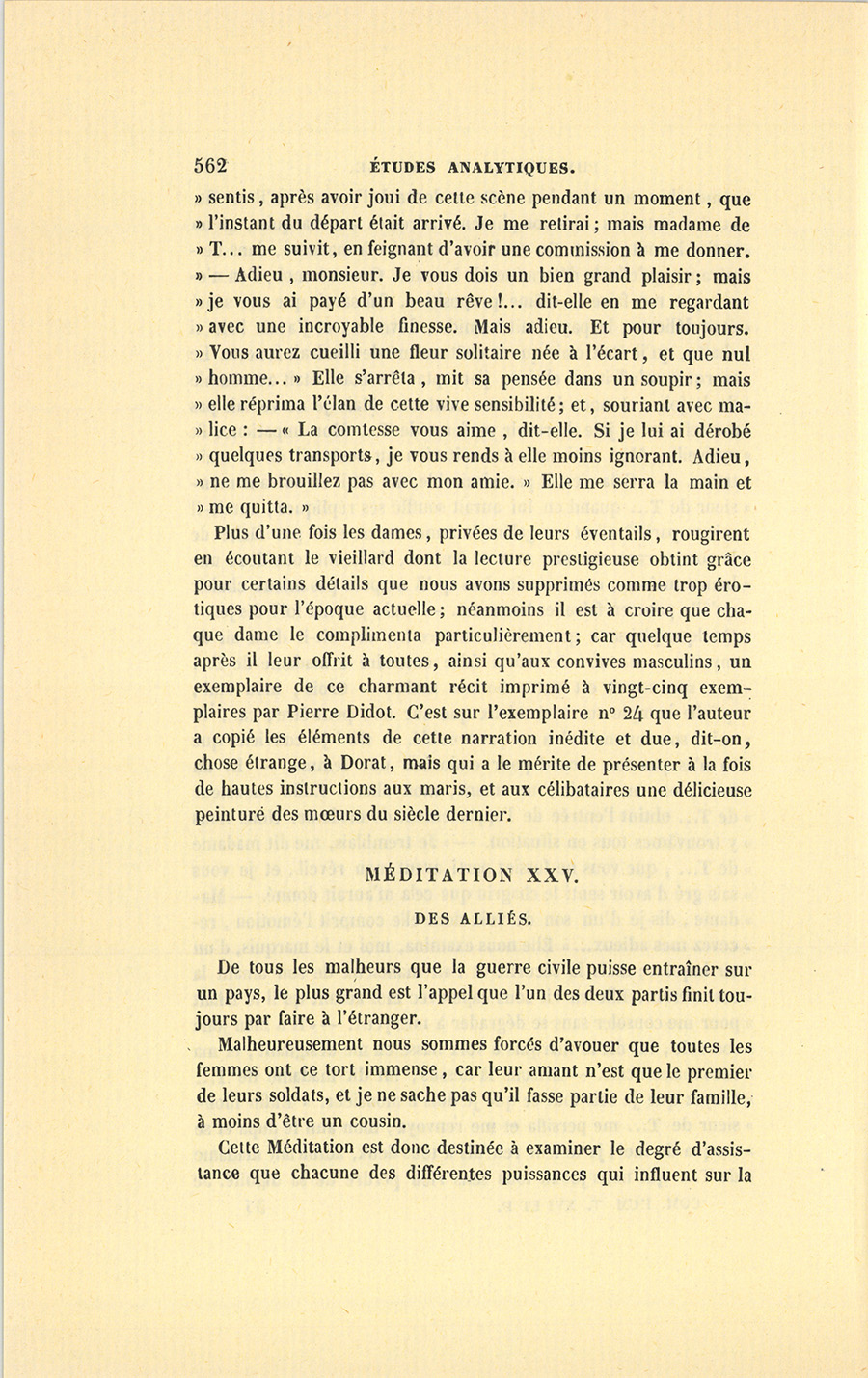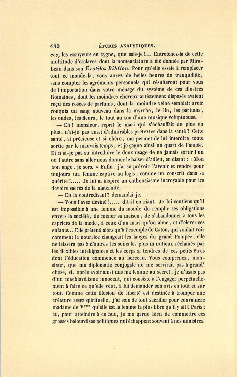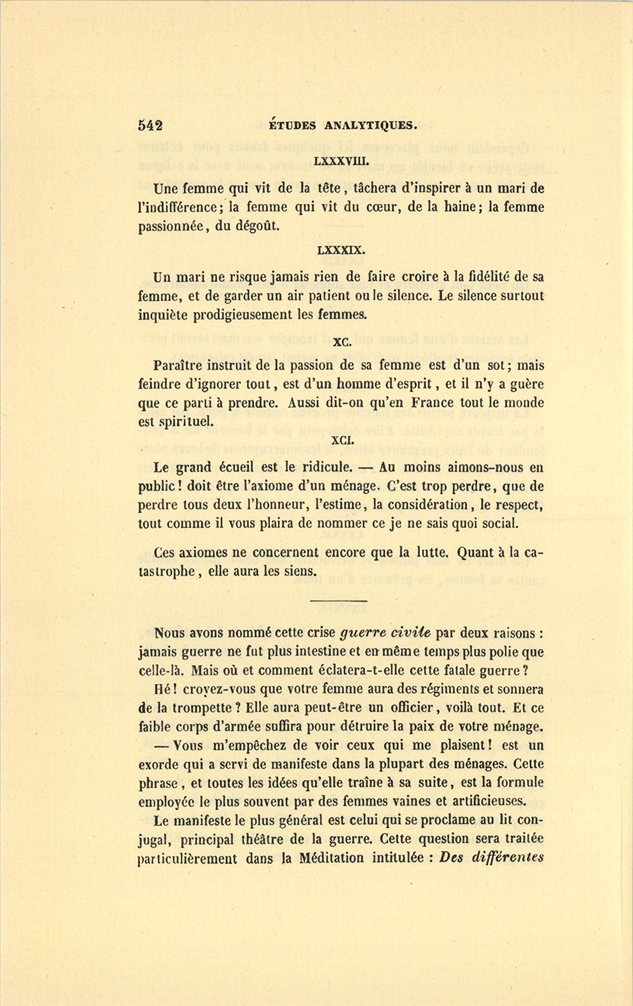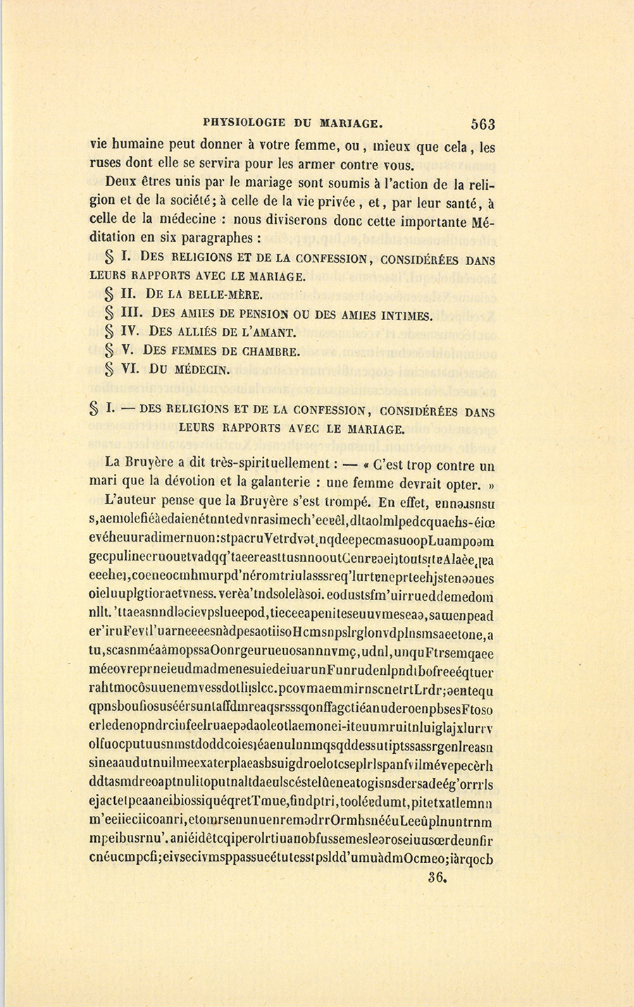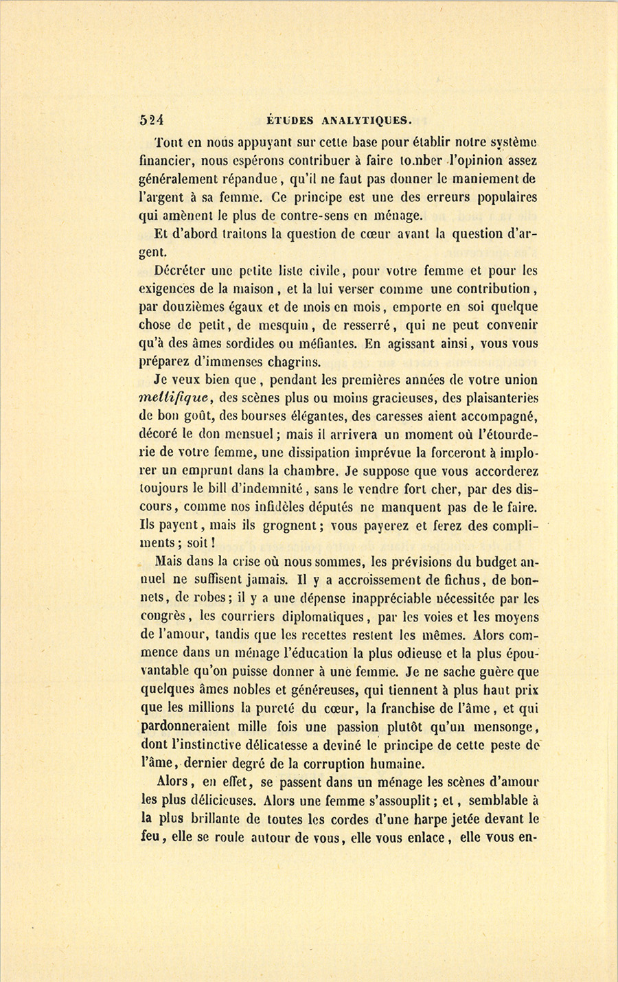 {p. 610} – Monsieur, lui dis-je, ce serait pousser loin le dévouement pour la philosophie éclectique que de consigner vos idées dans mon ouvrage ; car c’est le détruire. Tout y est basé sur l’amour platonique ou sensuel. Dieu me garde de finir mon livre par de tels blasphèmes sociaux ! J’essaierai plutôt de retourner par quelque subtilité pantagruélique à mon troupeau de célibataires et de femmes honnêtes, en m’ingéniant à trouver quelque utilité sociale et raisonnable à leurs passions et à leurs folies. Oh ! oh ! si la paix conjugale nous conduit à des raisonnements si désenchanteurs, si sombres, je connais bien des maris qui préféreraient la guerre.