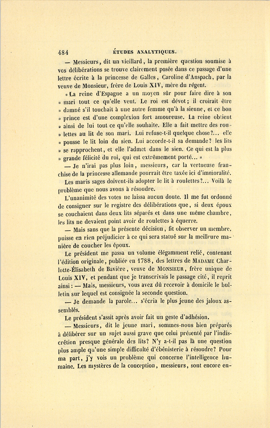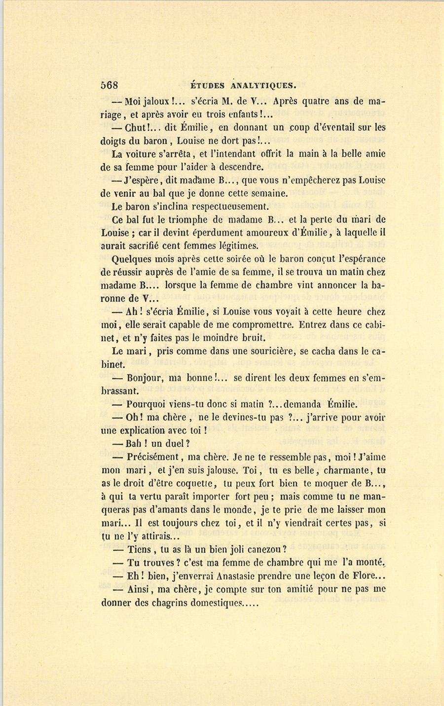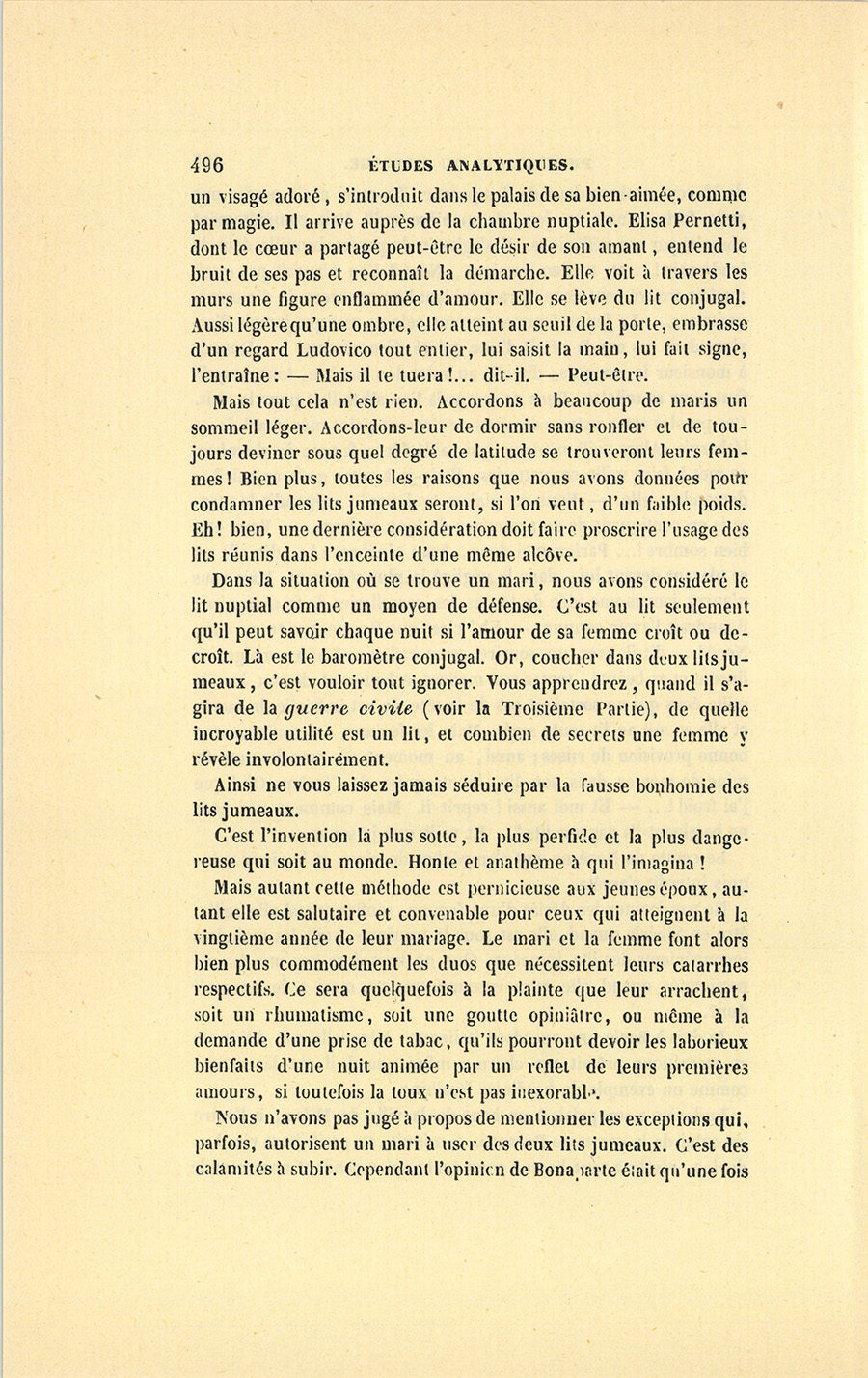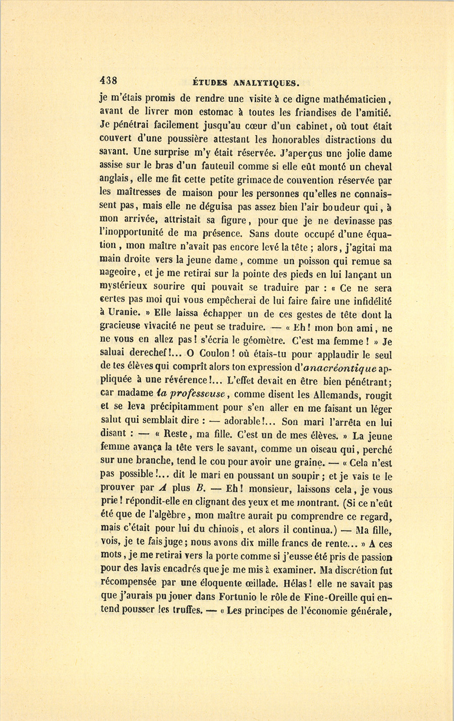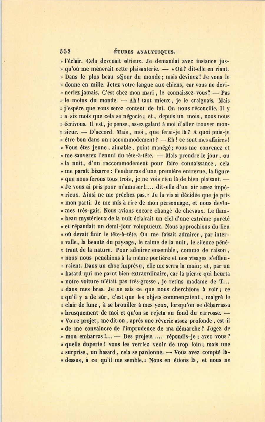 {p. 610} – Monsieur, lui dis-je, ce serait pousser loin le dévouement pour la philosophie éclectique que de consigner vos idées dans mon ouvrage ; car c’est le détruire. Tout y est basé sur l’amour platonique ou sensuel. Dieu me garde de finir mon livre par de tels blasphèmes sociaux ! J’essaierai plutôt de retourner par quelque subtilité pantagruélique à mon troupeau de célibataires et de femmes honnêtes, en m’ingéniant à trouver quelque utilité sociale et raisonnable à leurs passions et à leurs folies. Oh ! oh ! si la paix conjugale nous conduit à des raisonnements si désenchanteurs, si sombres, je connais bien des maris qui préféreraient la guerre.