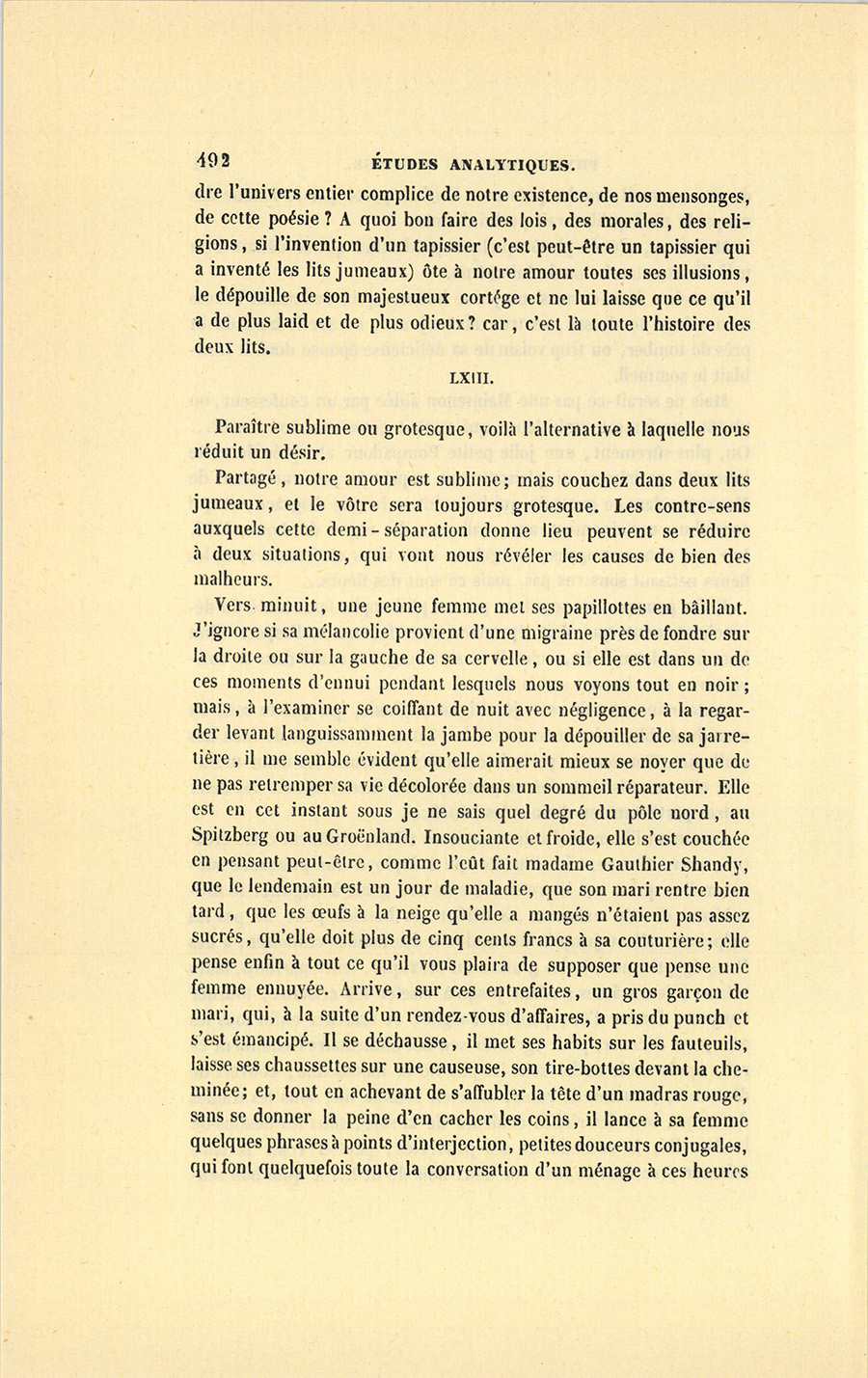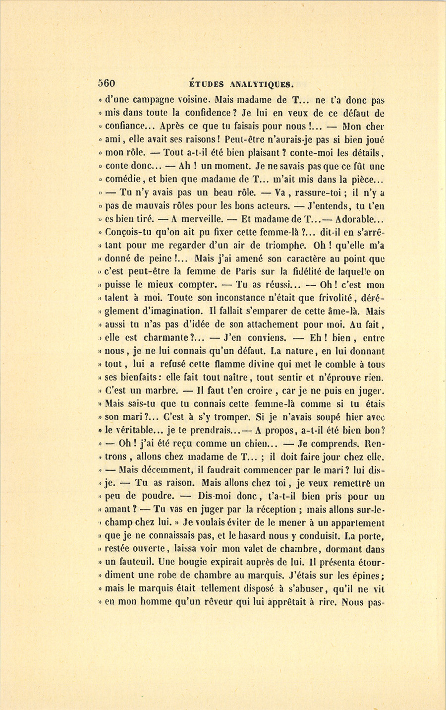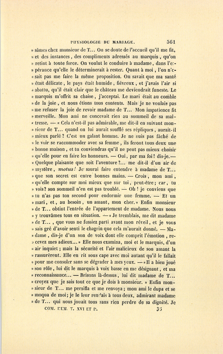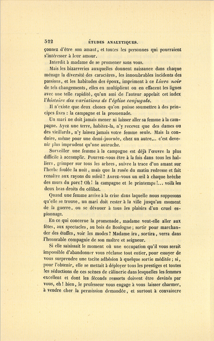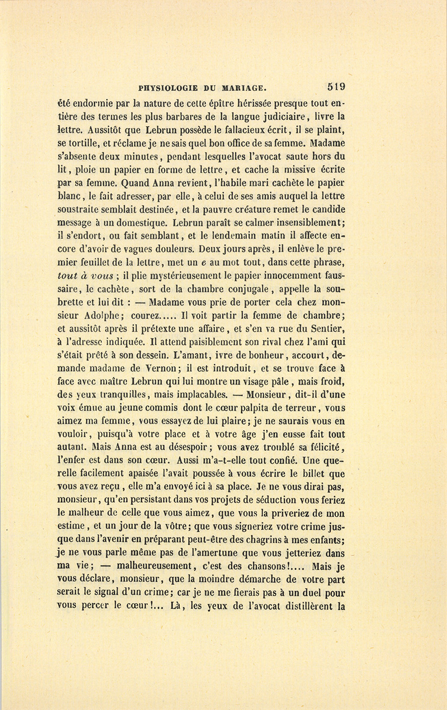 {p. 610} – Monsieur, lui dis-je, ce serait pousser loin le dévouement pour la philosophie éclectique que de consigner vos idées dans mon ouvrage ; car c’est le détruire. Tout y est basé sur l’amour platonique ou sensuel. Dieu me garde de finir mon livre par de tels blasphèmes sociaux ! J’essaierai plutôt de retourner par quelque subtilité pantagruélique à mon troupeau de célibataires et de femmes honnêtes, en m’ingéniant à trouver quelque utilité sociale et raisonnable à leurs passions et à leurs folies. Oh ! oh ! si la paix conjugale nous conduit à des raisonnements si désenchanteurs, si sombres, je connais bien des maris qui préféreraient la guerre.