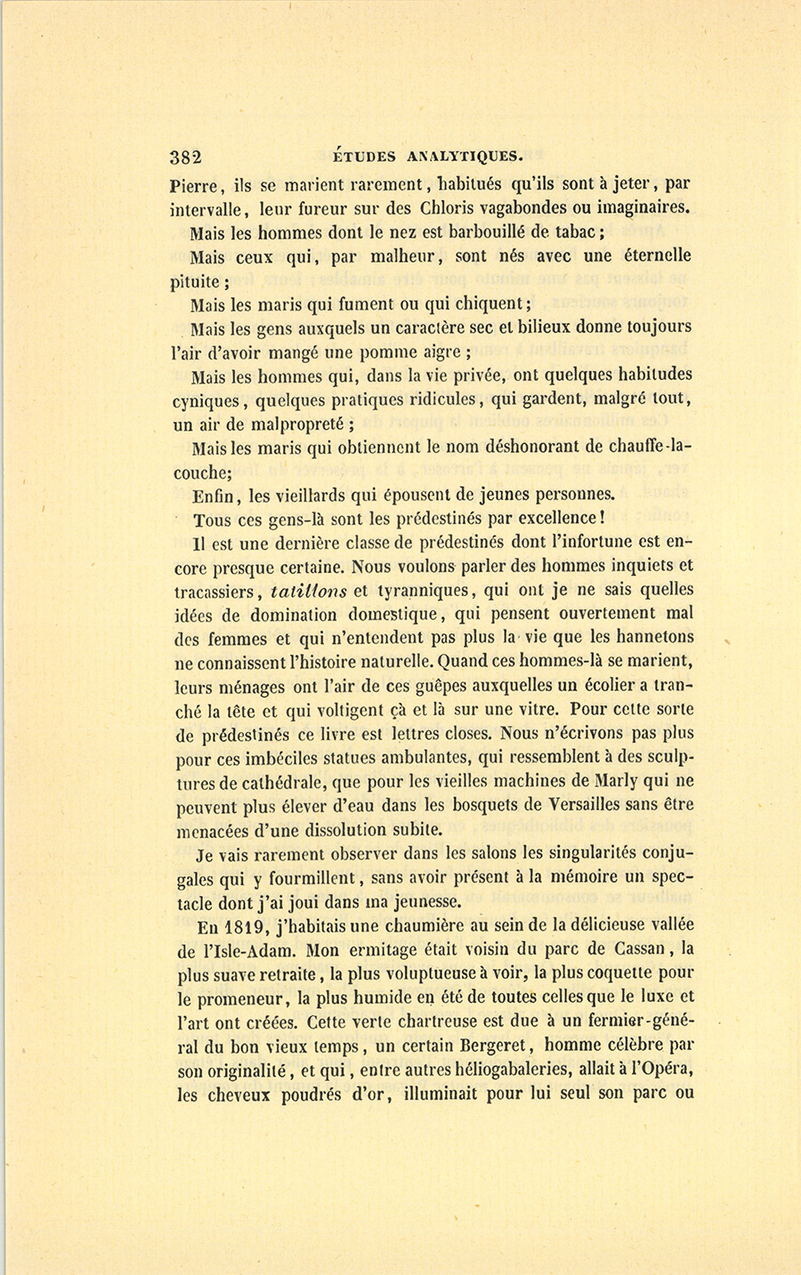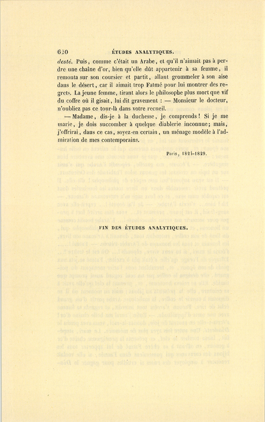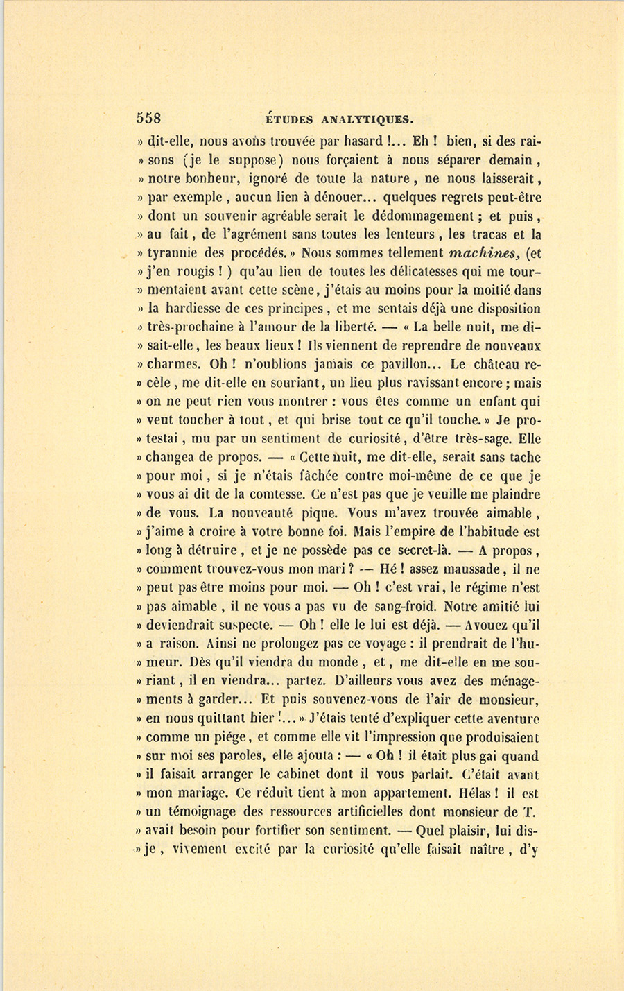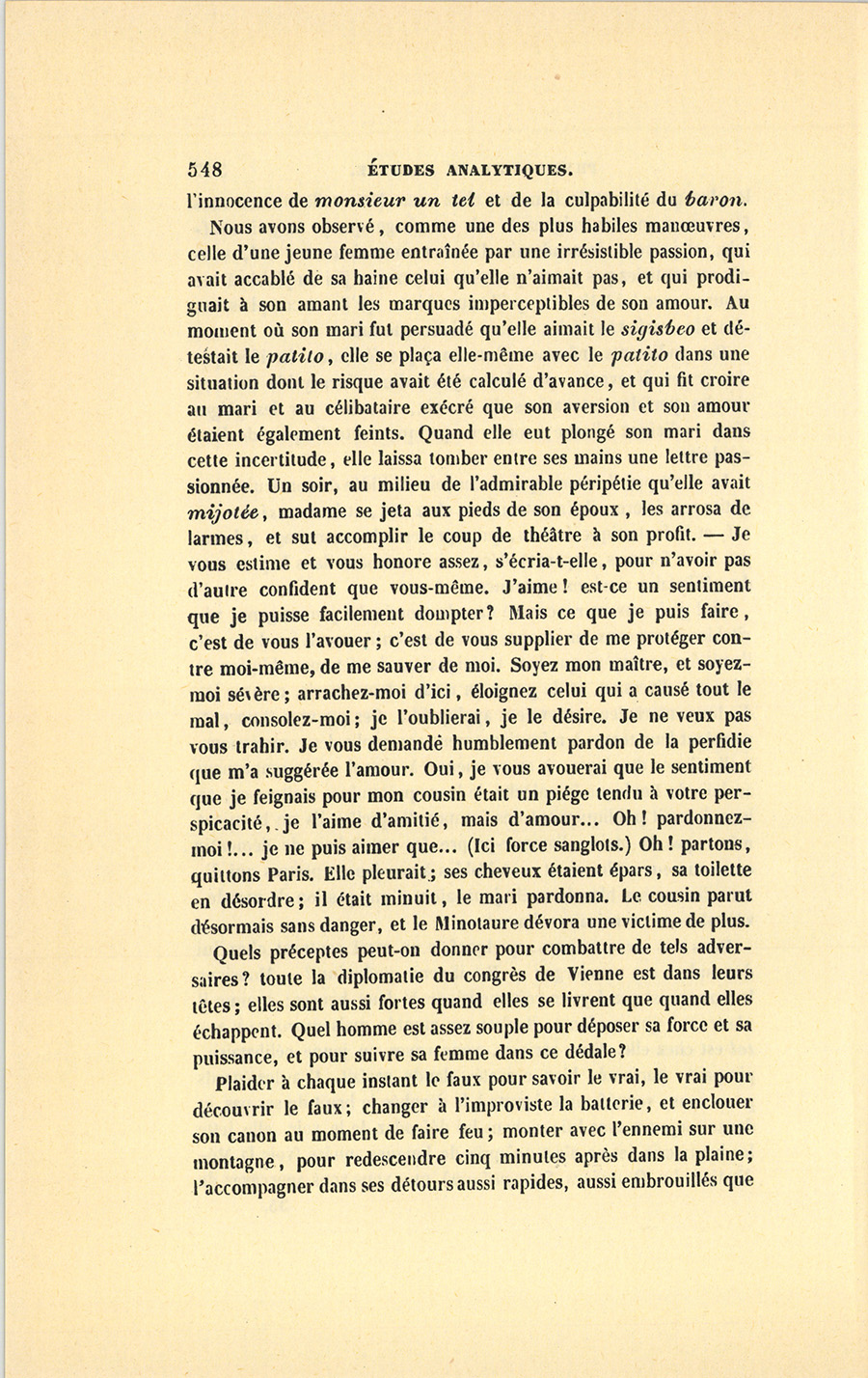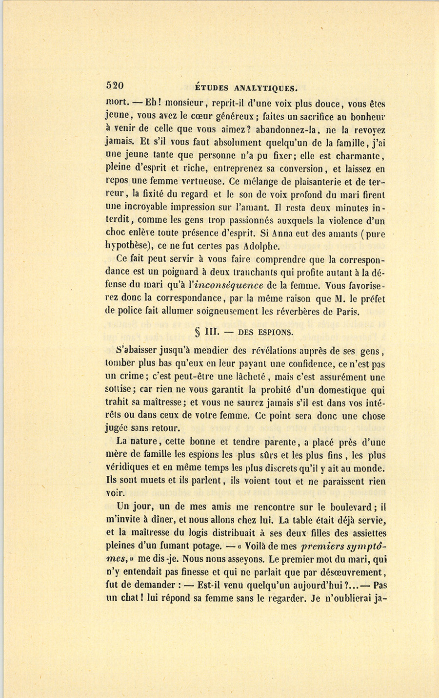 {p. 610} – Monsieur, lui dis-je, ce serait pousser loin le dévouement pour la philosophie éclectique que de consigner vos idées dans mon ouvrage ; car c’est le détruire. Tout y est basé sur l’amour platonique ou sensuel. Dieu me garde de finir mon livre par de tels blasphèmes sociaux ! J’essaierai plutôt de retourner par quelque subtilité pantagruélique à mon troupeau de célibataires et de femmes honnêtes, en m’ingéniant à trouver quelque utilité sociale et raisonnable à leurs passions et à leurs folies. Oh ! oh ! si la paix conjugale nous conduit à des raisonnements si désenchanteurs, si sombres, je connais bien des maris qui préféreraient la guerre.