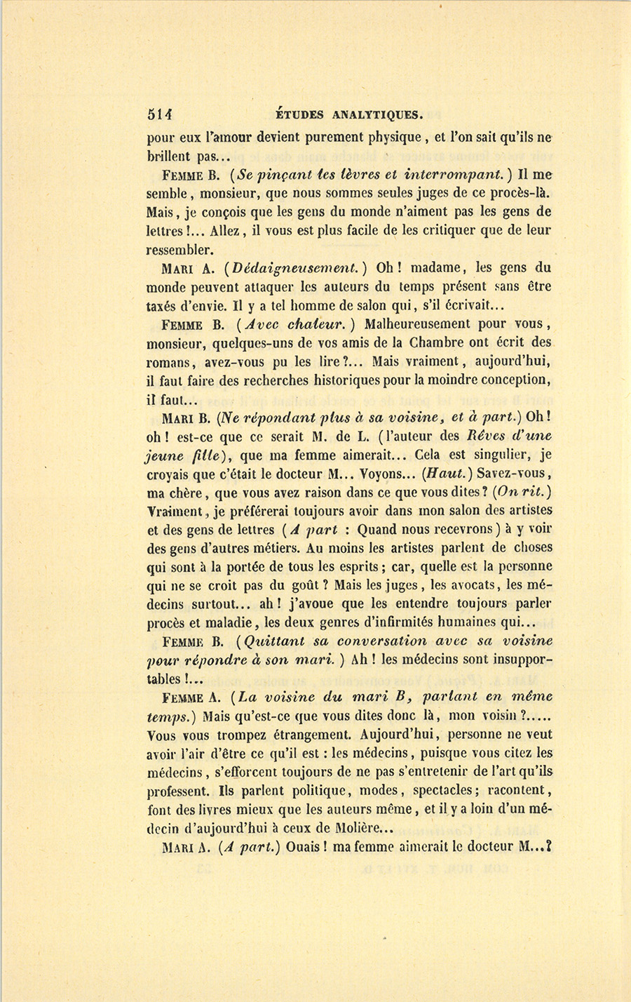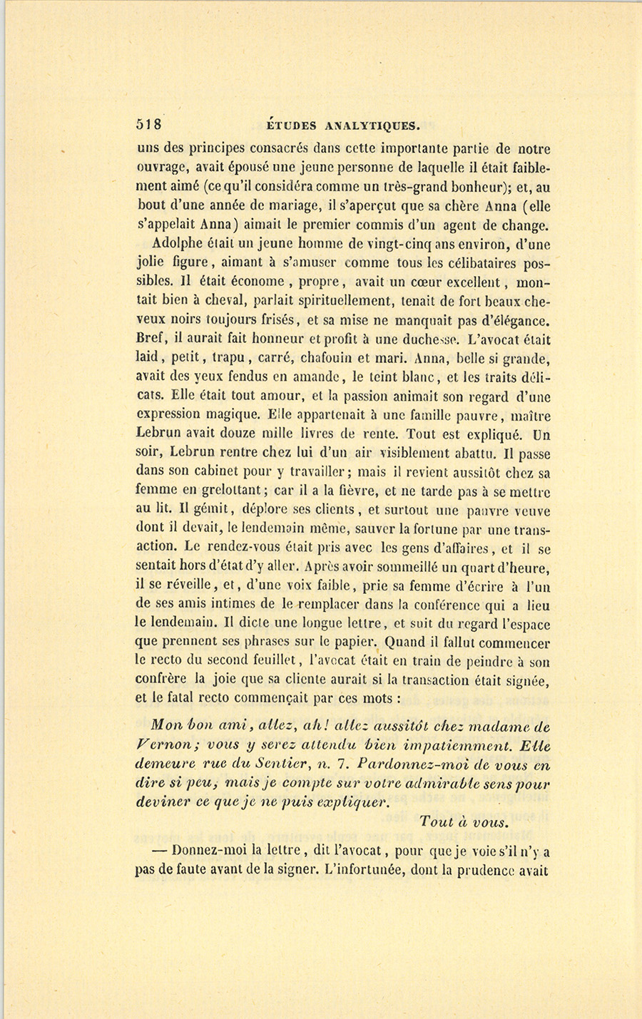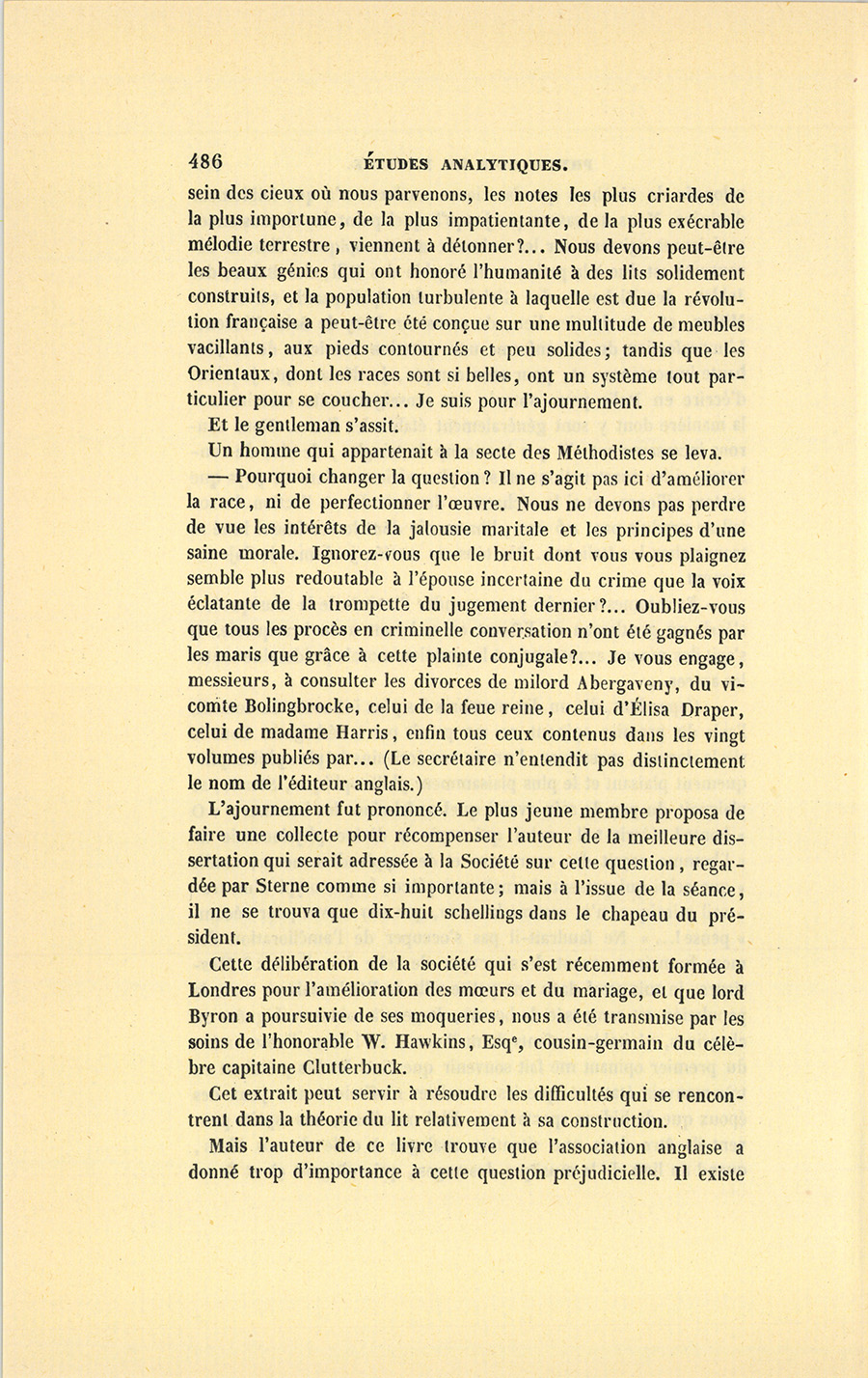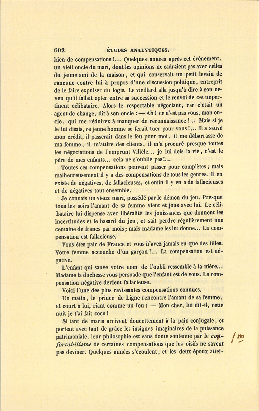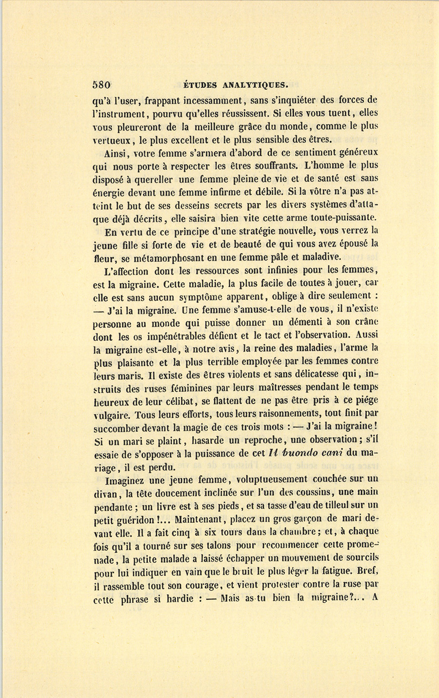 {p. 610} – Monsieur, lui dis-je, ce serait pousser loin le dévouement pour la philosophie éclectique que de consigner vos idées dans mon ouvrage ; car c’est le détruire. Tout y est basé sur l’amour platonique ou sensuel. Dieu me garde de finir mon livre par de tels blasphèmes sociaux ! J’essaierai plutôt de retourner par quelque subtilité pantagruélique à mon troupeau de célibataires et de femmes honnêtes, en m’ingéniant à trouver quelque utilité sociale et raisonnable à leurs passions et à leurs folies. Oh ! oh ! si la paix conjugale nous conduit à des raisonnements si désenchanteurs, si sombres, je connais bien des maris qui préféreraient la guerre.