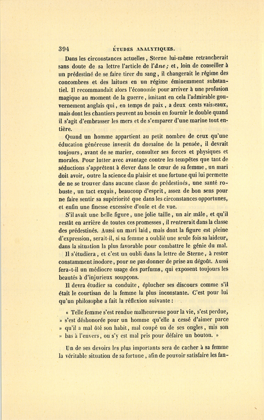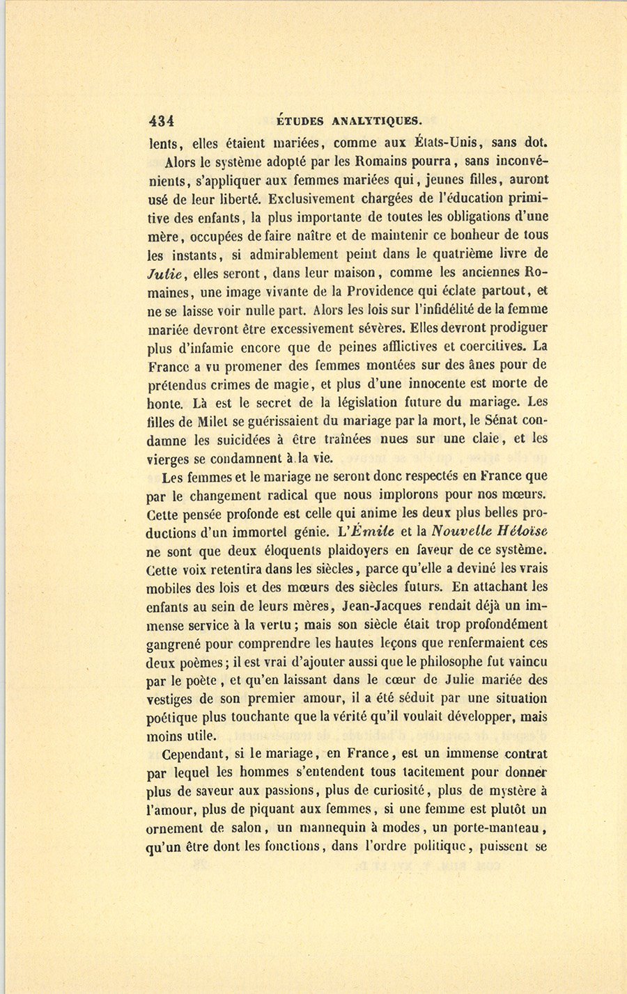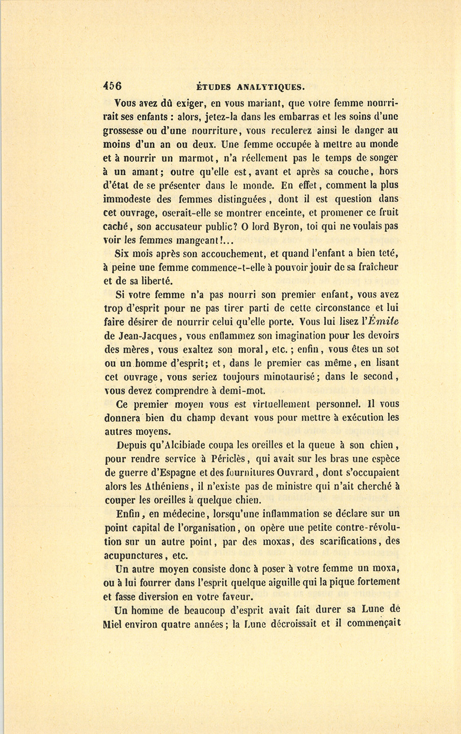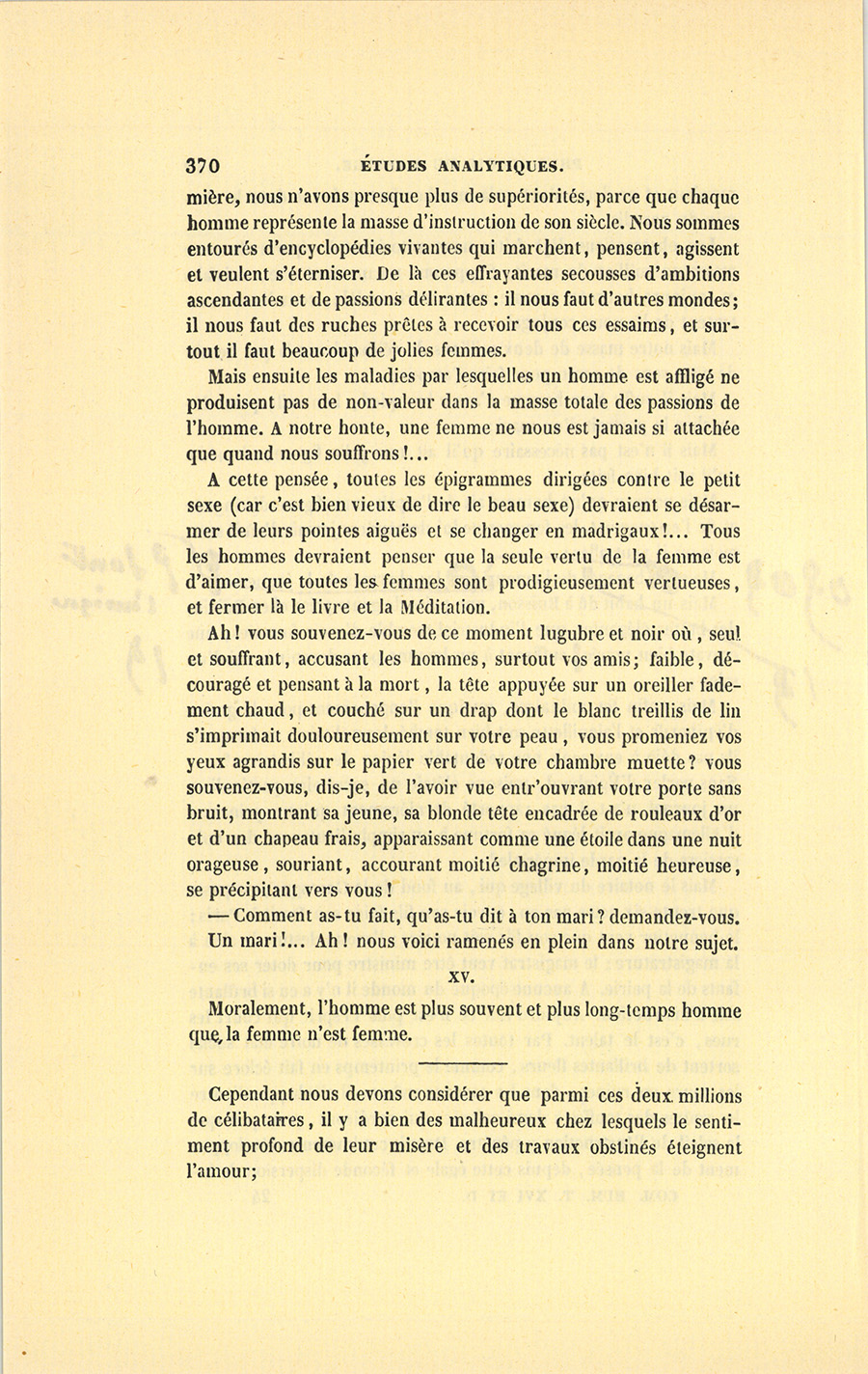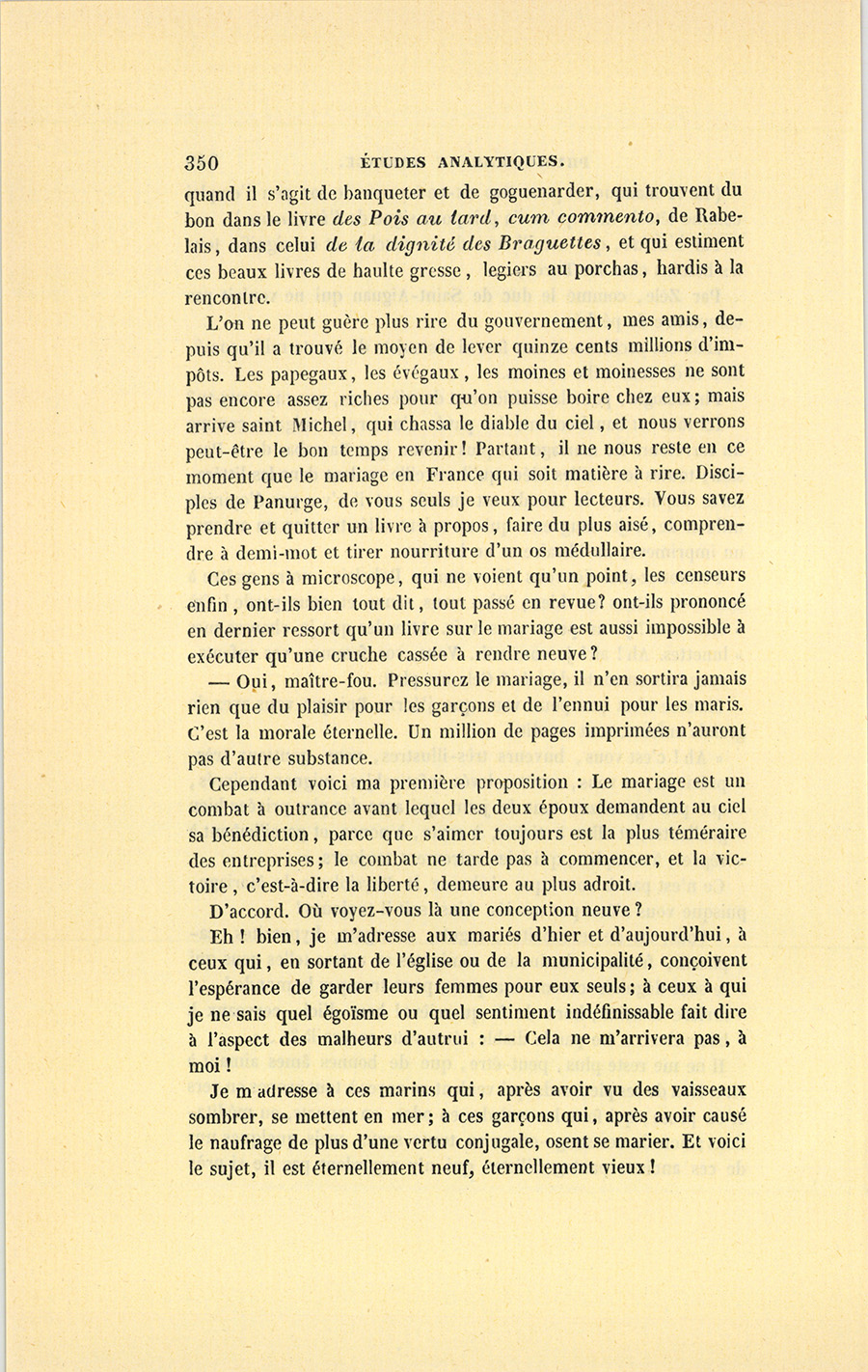 Ici tout est banal comme les pavés d’une rue, vulgaire comme un carrefour. Le mariage est plus connu que Barrabas de la Passion ; toutes les vieilles idées qu’il réveille roulent dans les littératures depuis que le monde est monde, et il n’y a pas d’opinion utile et de projet saugrenu qui ne soient allés trouver un auteur, un imprimeur, un libraire et un lecteur.