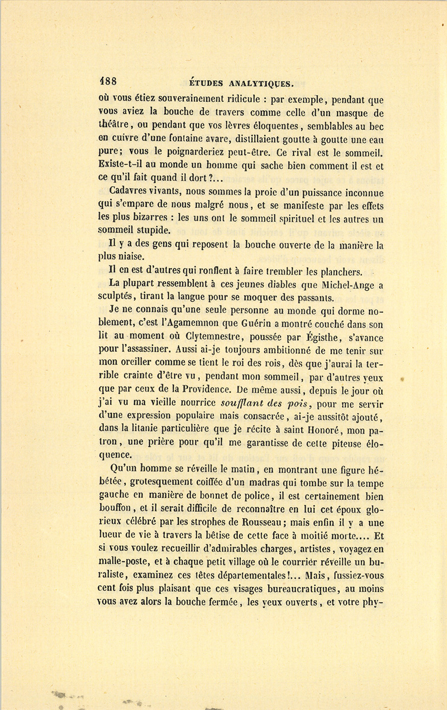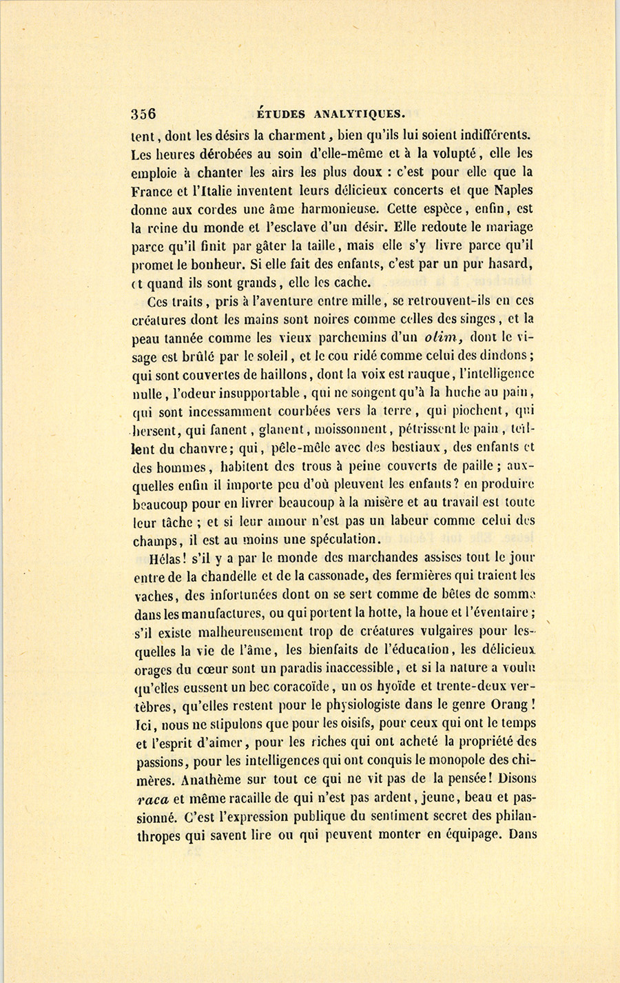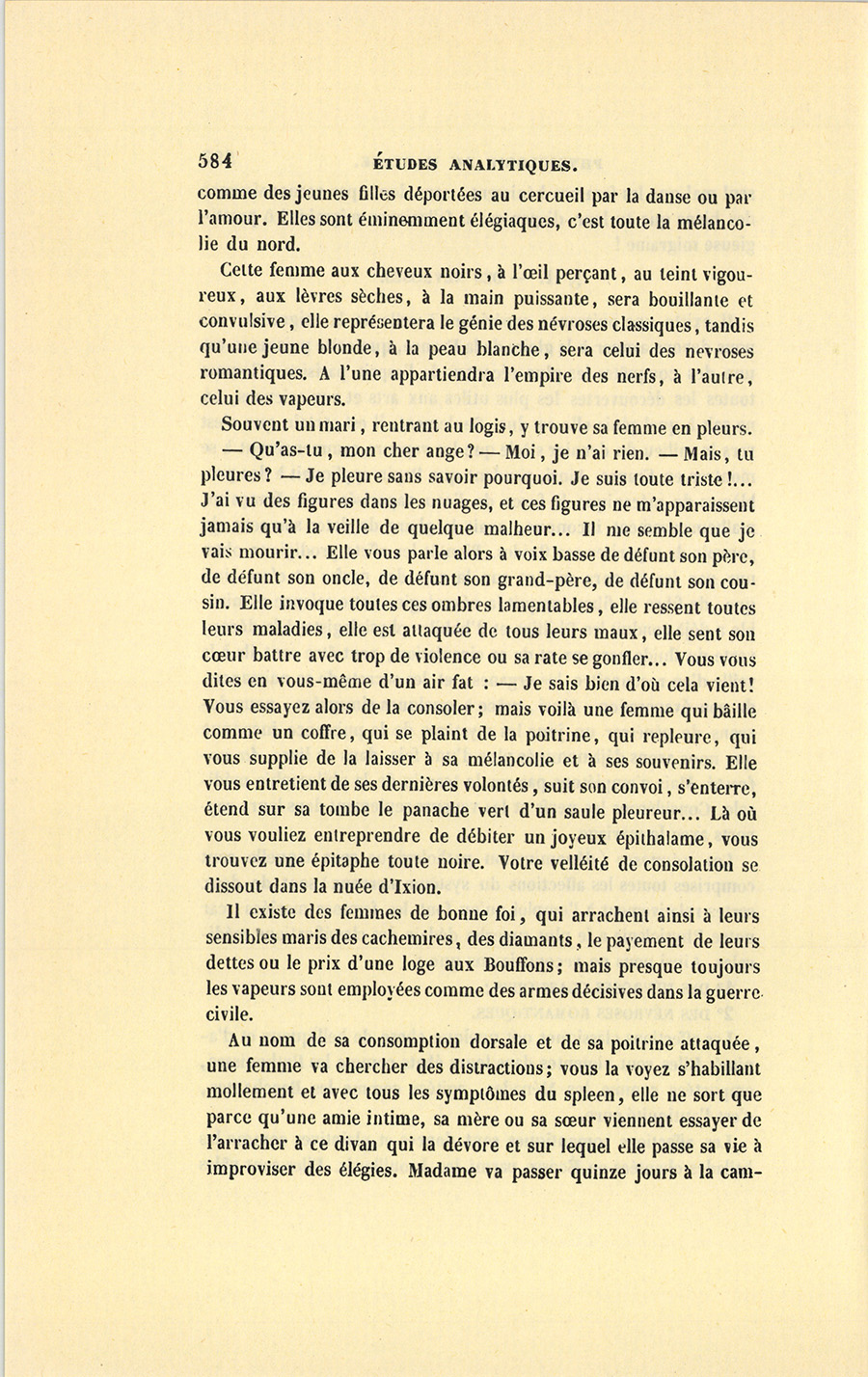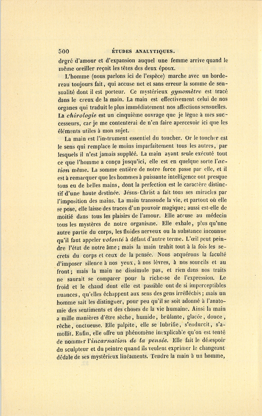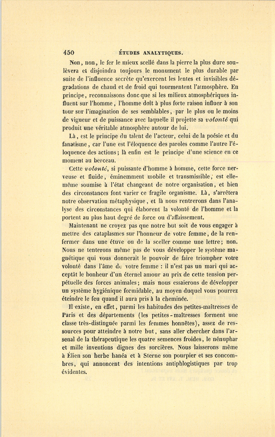 Si l’auteur écrit ici la biographie de son livre, ce n’est par aucune inspiration de fatuité. Il raconte des faits qui pourront servir à l’histoire de la pensée humaine, et qui expliqueront sans doute l’ouvrage même. Il n’est peut-être pas indifférent à certains {p. 344} anatomistes de la pensée de savoir que l’âme est femme. Ainsi, tant que l’auteur s’interdisait de penser au livre qu’il devait faire, le livre se montrait écrit partout. Il en trouvait une page sur le lit d’un malade, une autre sur le canapé d’un boudoir. Les regards des femmes quand elles tournoyaient emportées par une valse, lui jetaient des pensées ; un geste, une parole, fécondaient son cerveau dédaigneux. Le jour où il se dit : – Cet ouvrage, qui m’obsède, se fera !… tout a fui ; et, comme les trois Belges, il releva un squelette, là où il se baissait pour saisir un trésor.