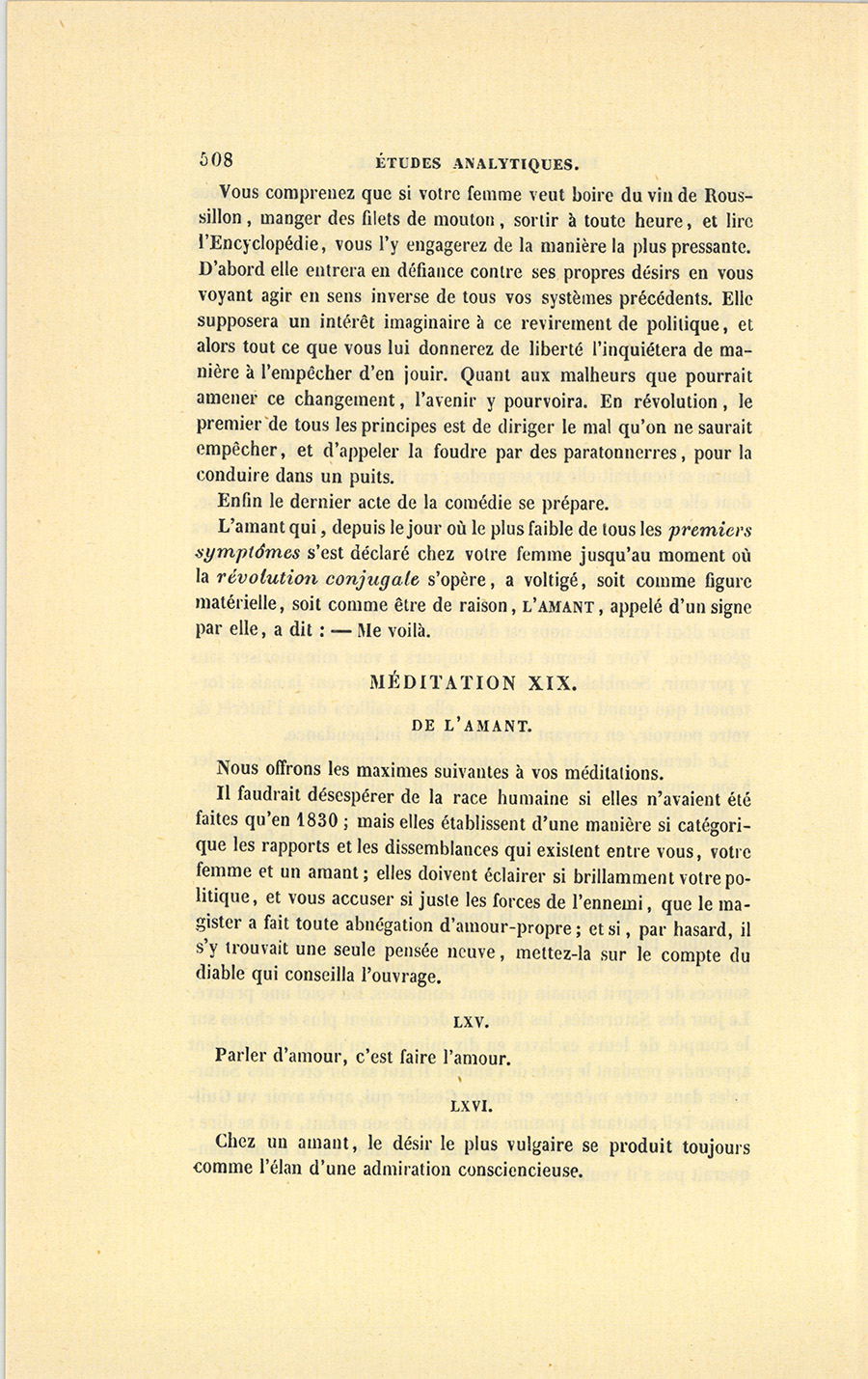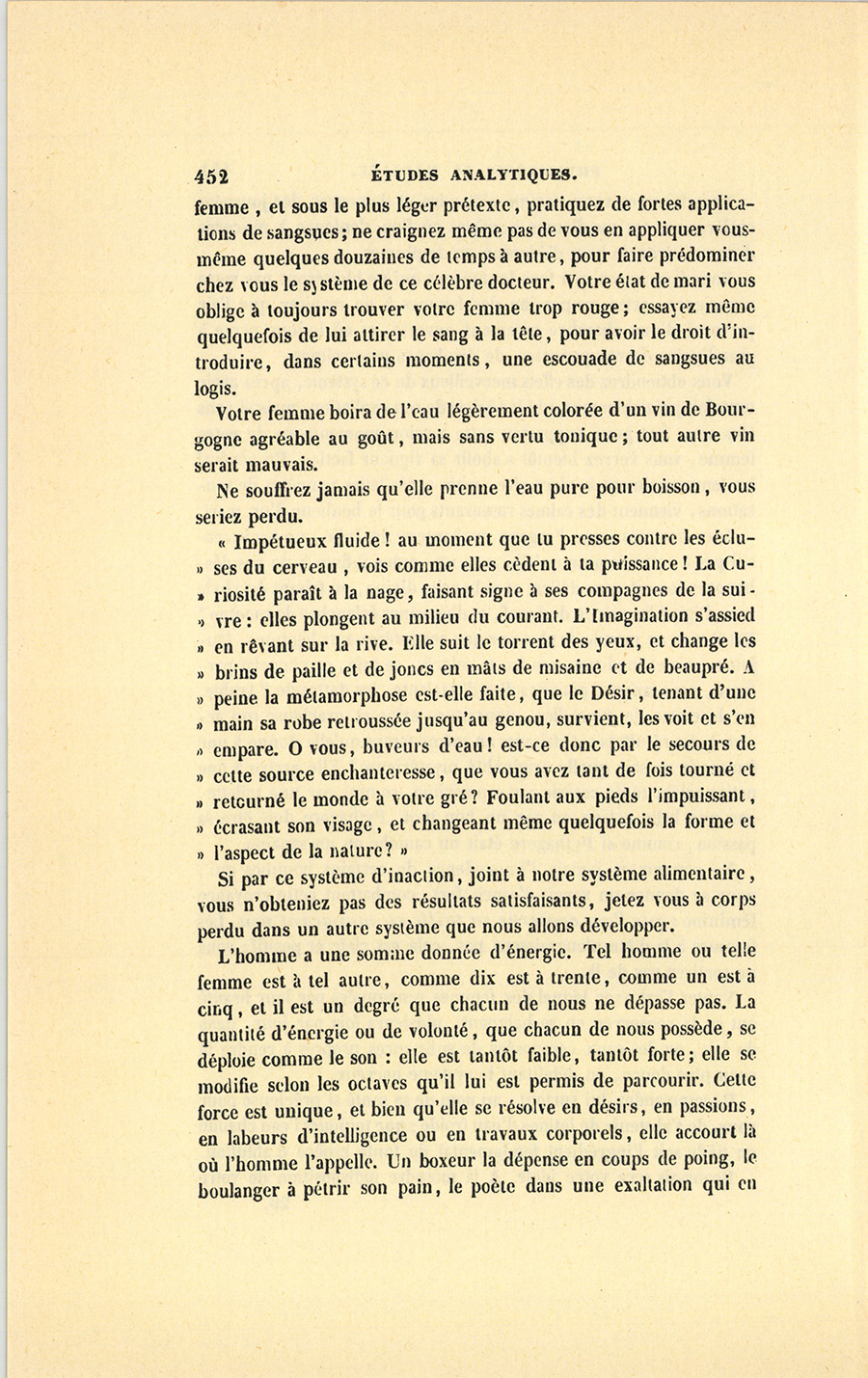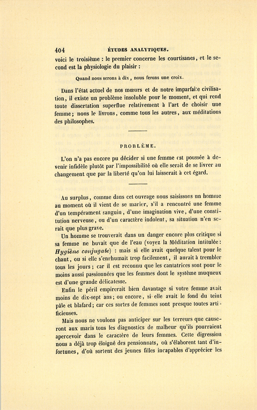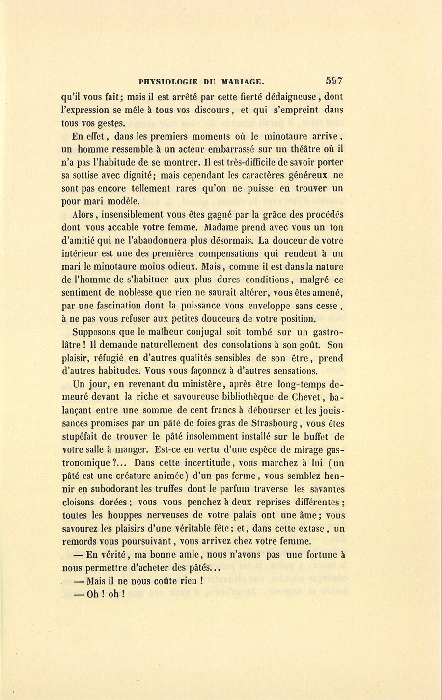 Un jour, en revenant du ministère, après être long-temps demeuré devant la riche et savoureuse bibliothèque de Chevet, balançant entre une somme de cent francs à débourser et les jouissances promises par un pâté de foies gras de Strasbourg, vous êtes stupéfait de trouver le pâté insolemment installé sur le buffet de votre salle à manger. Est-ce en vertu d’une espèce de mirage gastronomique ?… Dans cette incertitude, vous marchez à lui (un pâté est une créature animée) d’un pas ferme, vous semblez hennir en subodorant les truffes dont le parfum traverse les savantes cloisons dorées ; vous vous penchez à deux reprises différentes ; toutes les houppes nerveuses de votre palais ont une âme ; vous savourez les plaisirs d’une véritable fête ; et, dans cette extase, un remords vous poursuivant, vous arrivez chez votre femme.