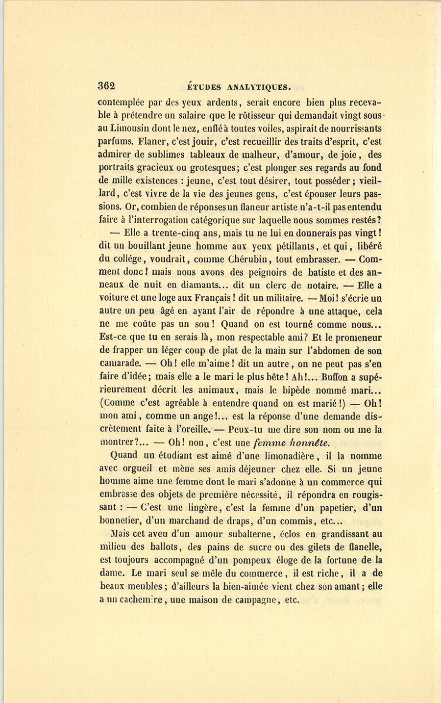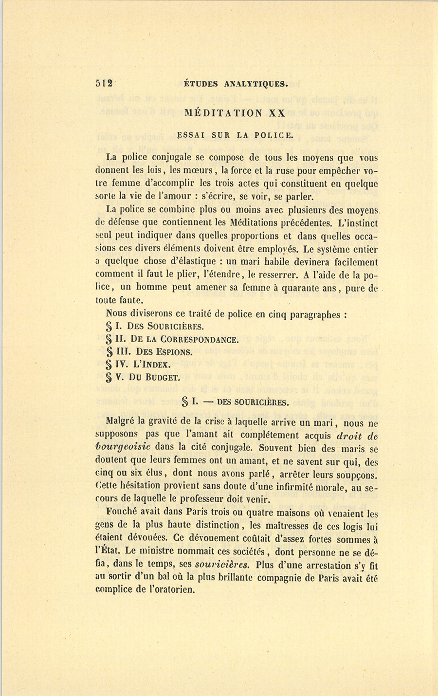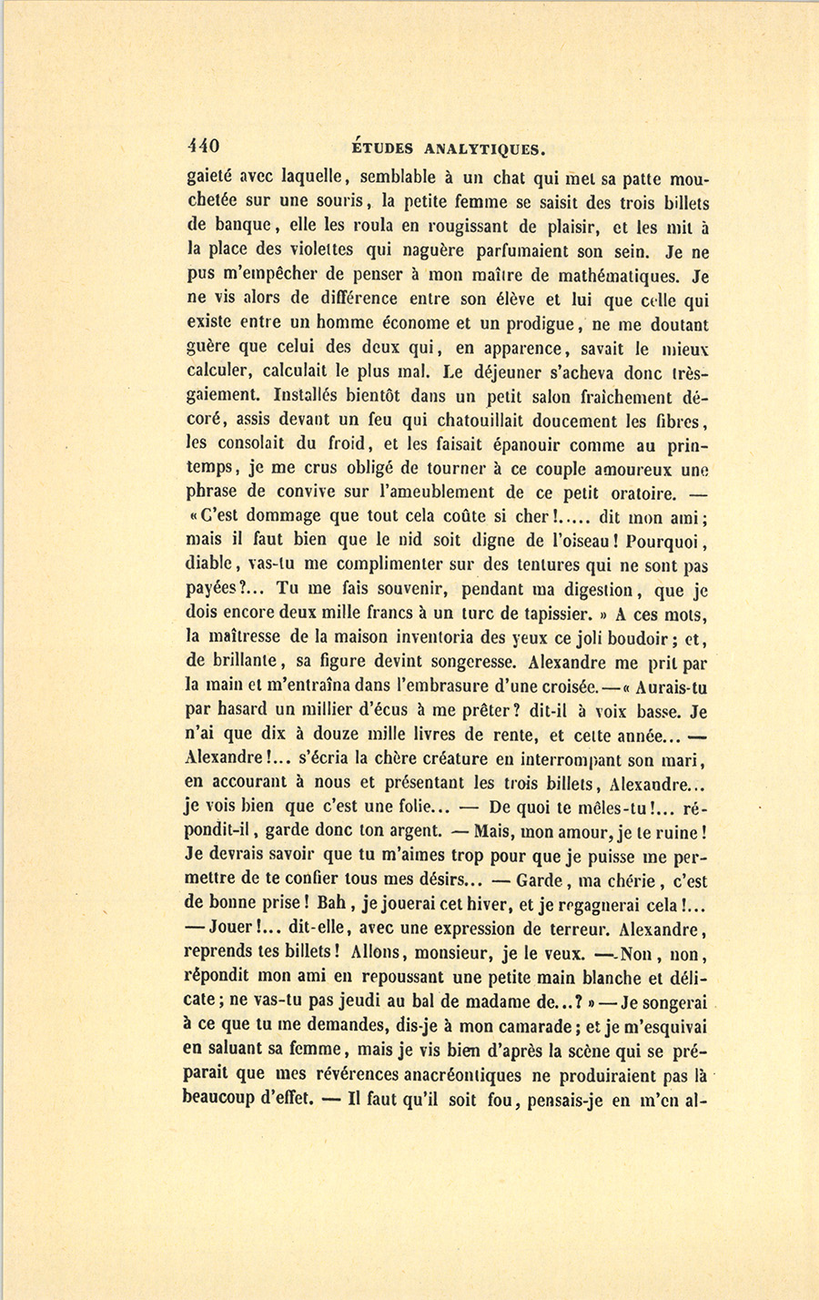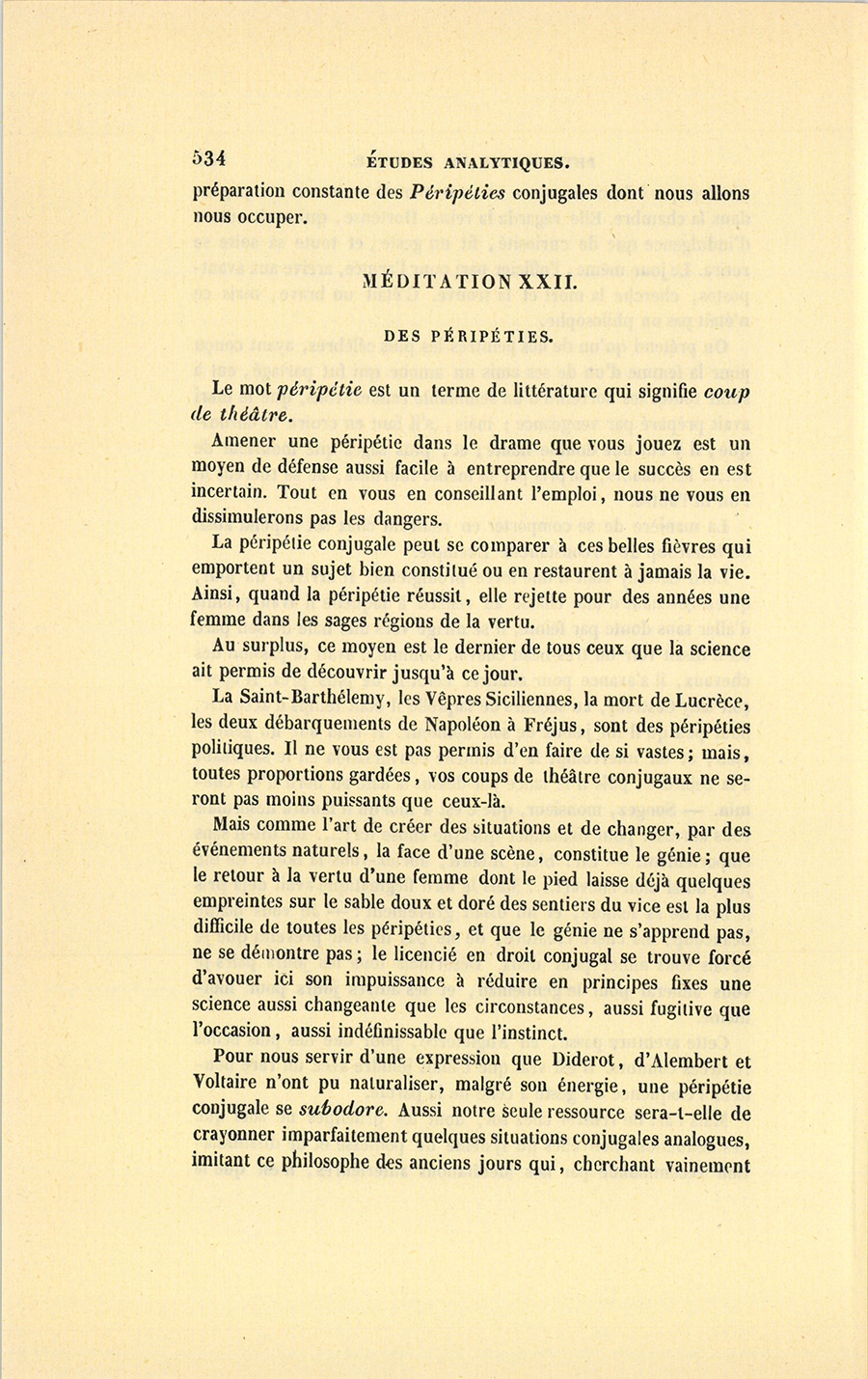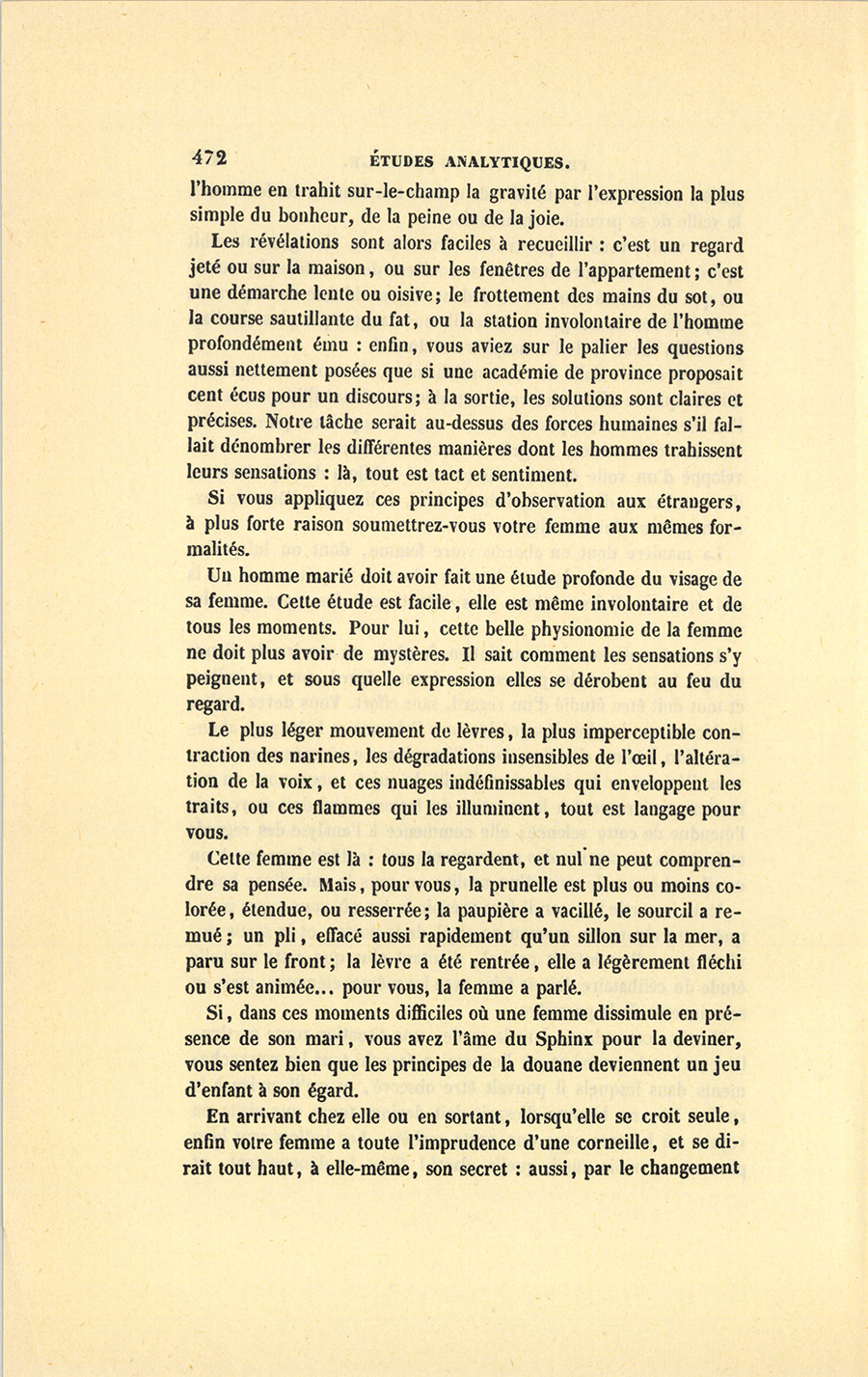 Un jour, en revenant du ministère, après être long-temps demeuré devant la riche et savoureuse bibliothèque de Chevet, balançant entre une somme de cent francs à débourser et les jouissances promises par un pâté de foies gras de Strasbourg, vous êtes stupéfait de trouver le pâté insolemment installé sur le buffet de votre salle à manger. Est-ce en vertu d’une espèce de mirage gastronomique ?… Dans cette incertitude, vous marchez à lui (un pâté est une créature animée) d’un pas ferme, vous semblez hennir en subodorant les truffes dont le parfum traverse les savantes cloisons dorées ; vous vous penchez à deux reprises différentes ; toutes les houppes nerveuses de votre palais ont une âme ; vous savourez les plaisirs d’une véritable fête ; et, dans cette extase, un remords vous poursuivant, vous arrivez chez votre femme.