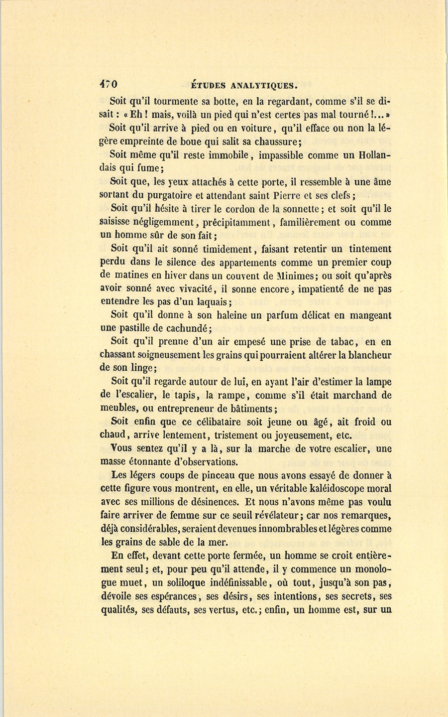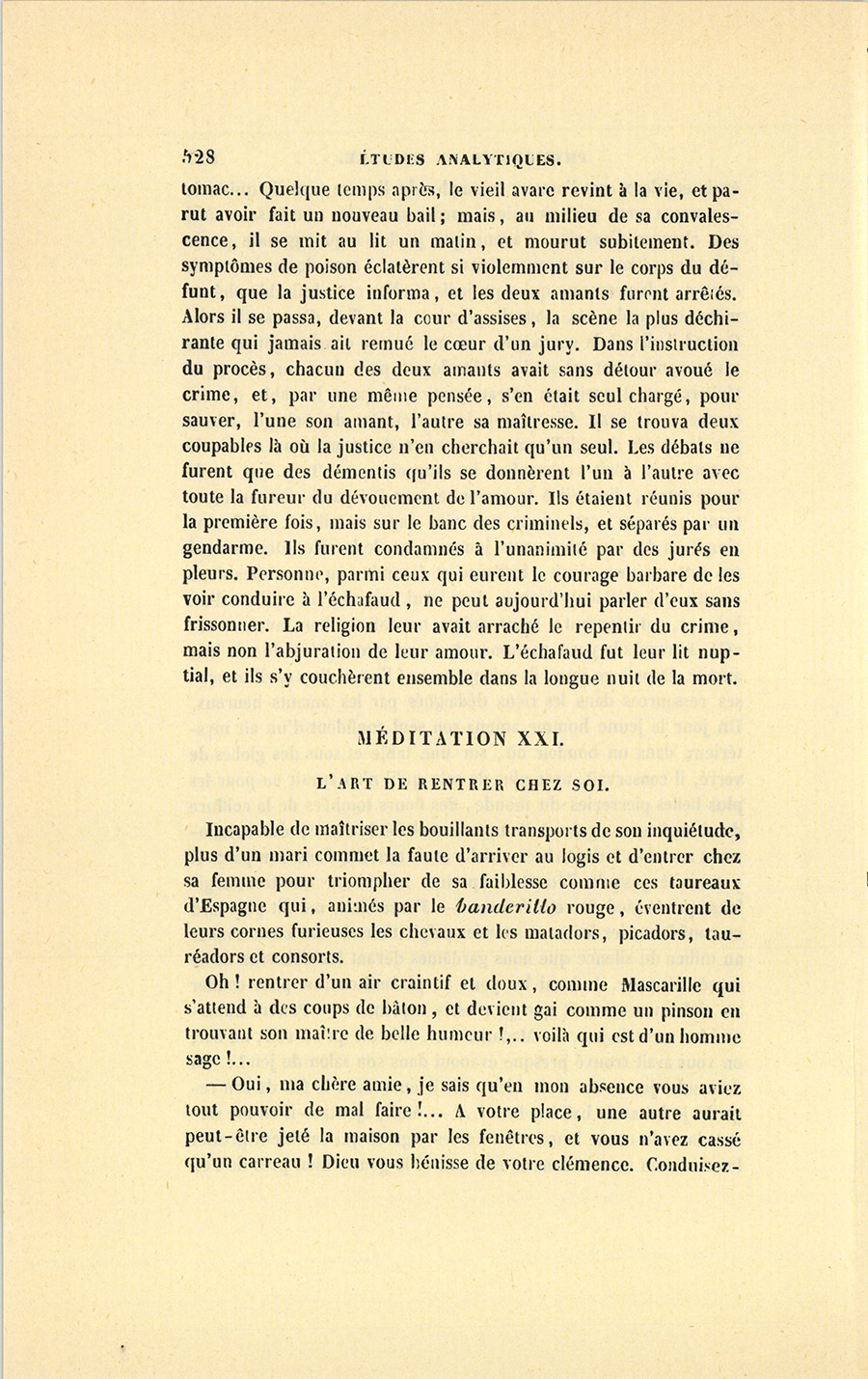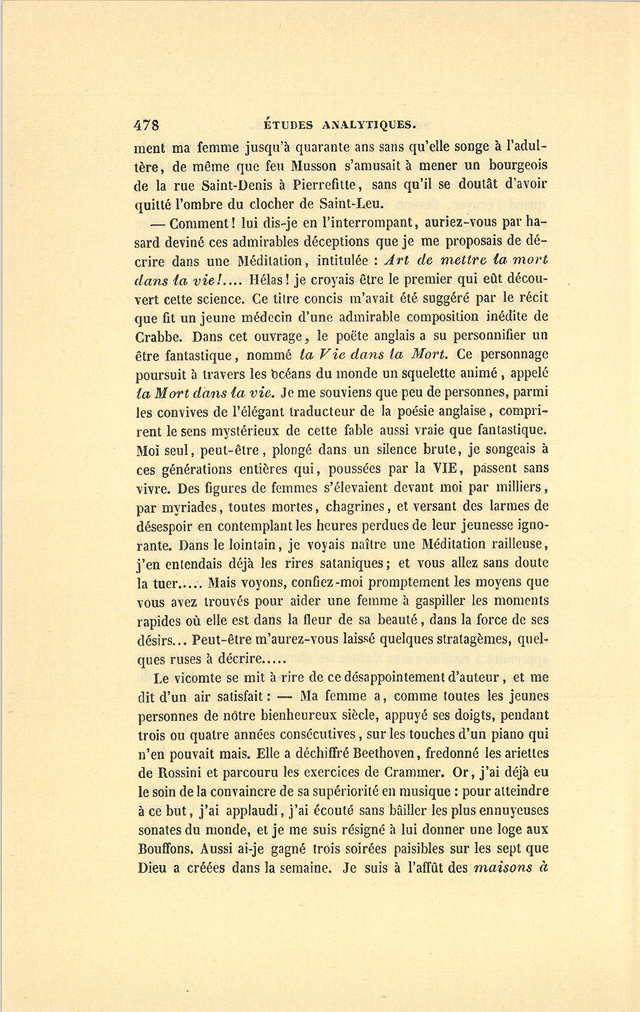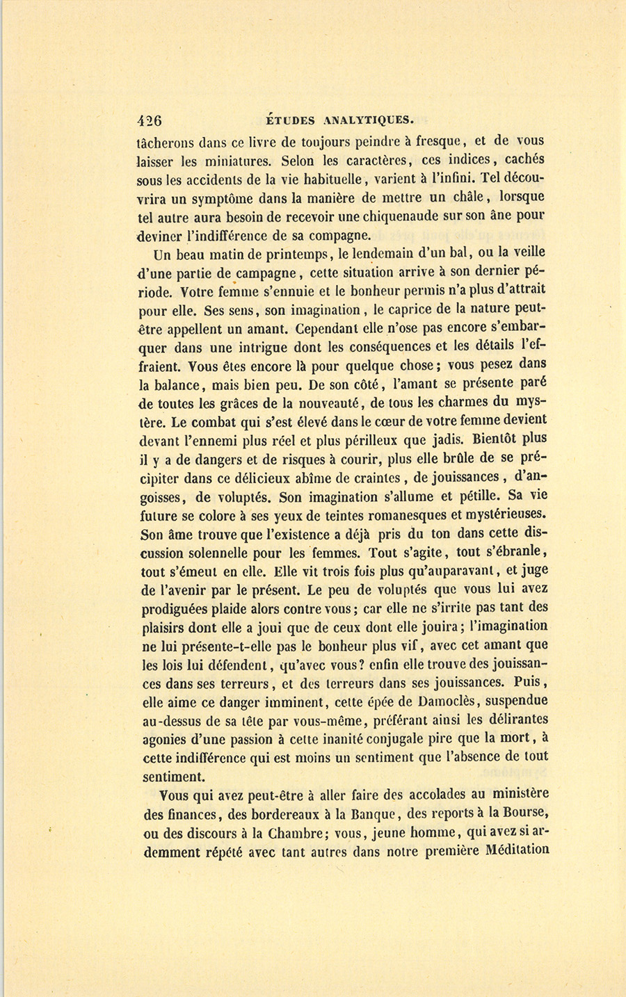 Un jour, en revenant du ministère, après être long-temps demeuré devant la riche et savoureuse bibliothèque de Chevet, balançant entre une somme de cent francs à débourser et les jouissances promises par un pâté de foies gras de Strasbourg, vous êtes stupéfait de trouver le pâté insolemment installé sur le buffet de votre salle à manger. Est-ce en vertu d’une espèce de mirage gastronomique ?… Dans cette incertitude, vous marchez à lui (un pâté est une créature animée) d’un pas ferme, vous semblez hennir en subodorant les truffes dont le parfum traverse les savantes cloisons dorées ; vous vous penchez à deux reprises différentes ; toutes les houppes nerveuses de votre palais ont une âme ; vous savourez les plaisirs d’une véritable fête ; et, dans cette extase, un remords vous poursuivant, vous arrivez chez votre femme.