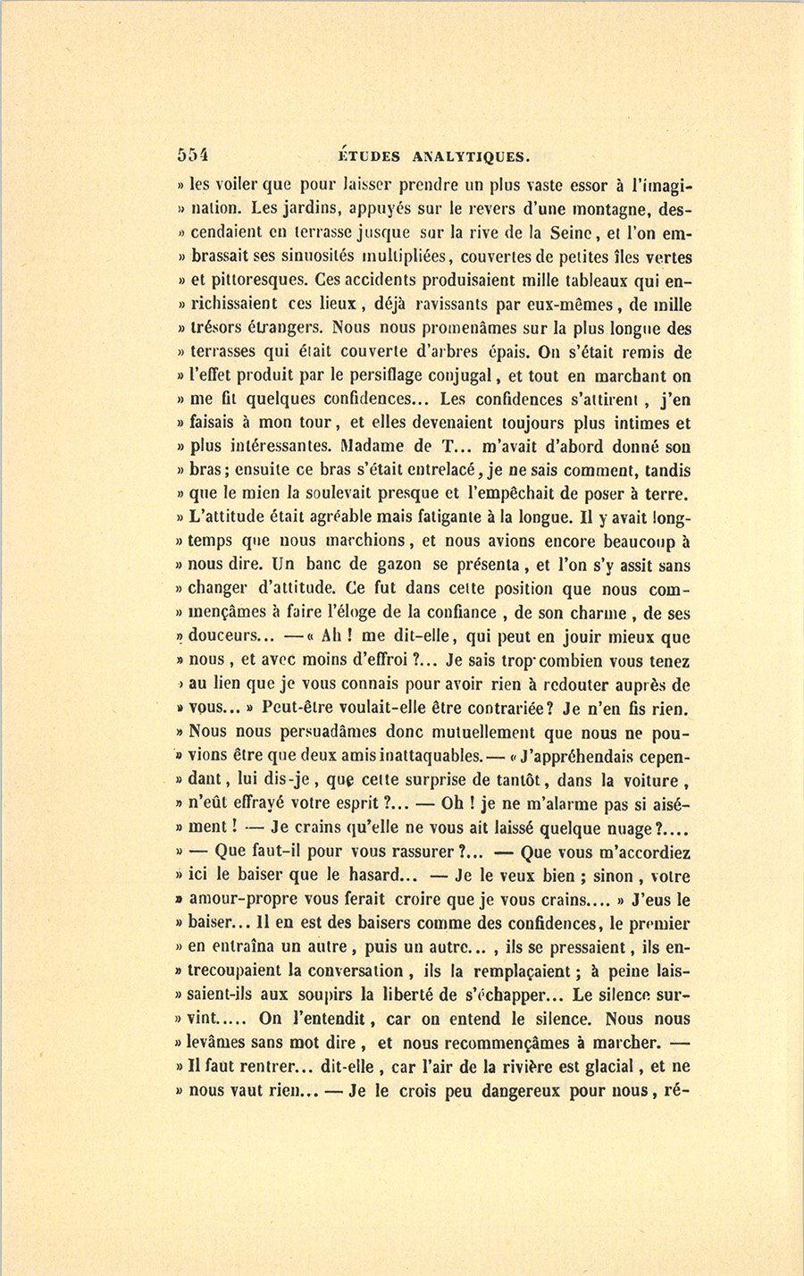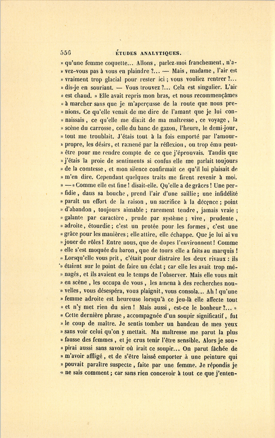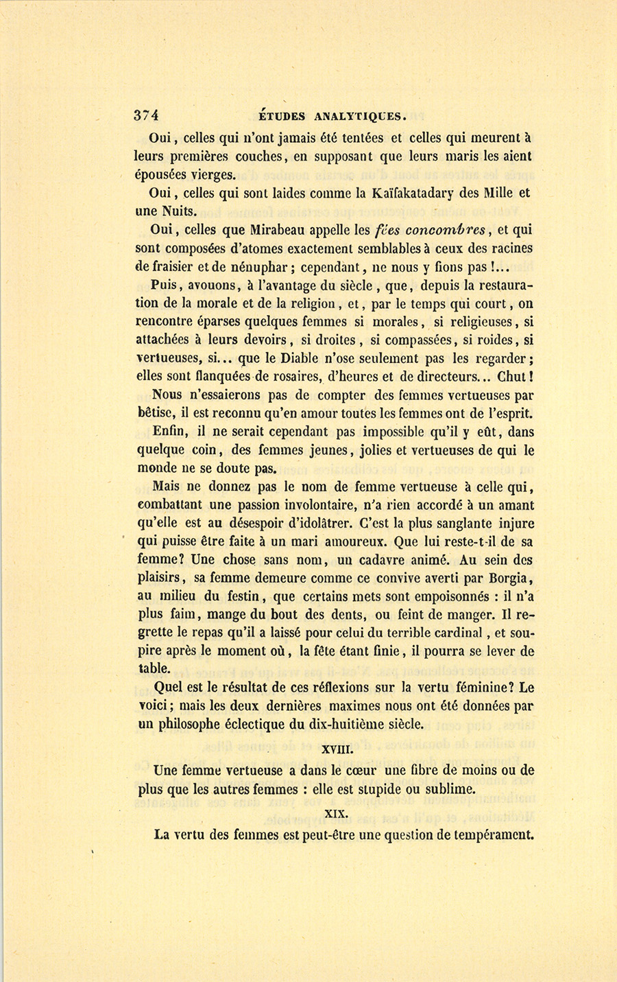 L’auteur arrêta le torrent de ces révélations en faisant part aux deux dames du projet d’ouvrage par lequel il était persécuté, elles y sourirent, et promirent beaucoup de conseils. La plus jeune fournit gaiement un des premiers capitaux de l’entreprise, en disant qu’elle se chargeait de prouver mathématiquement que les femmes entièrement vertueuses étaient des êtres de raison.