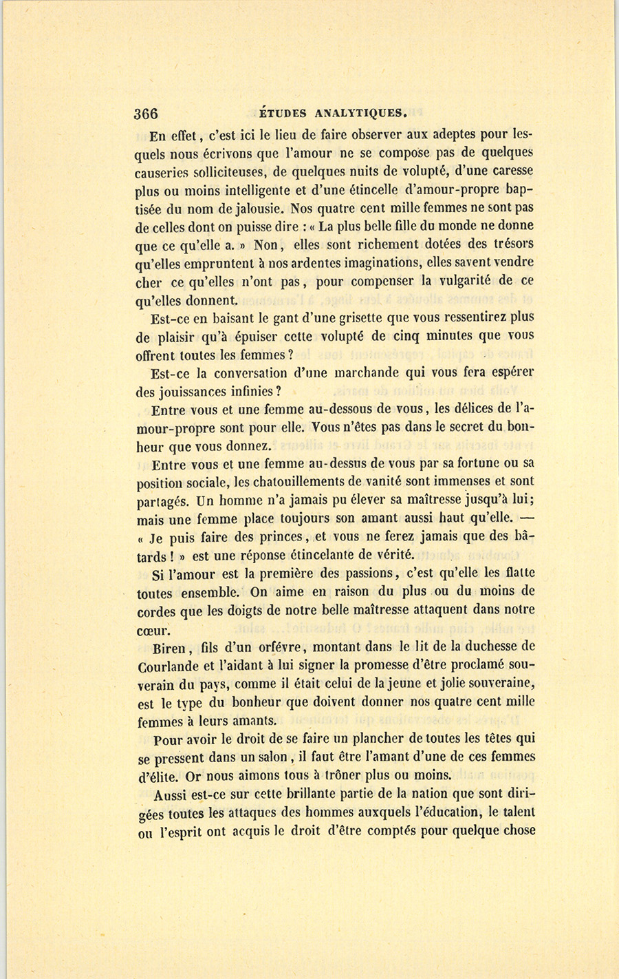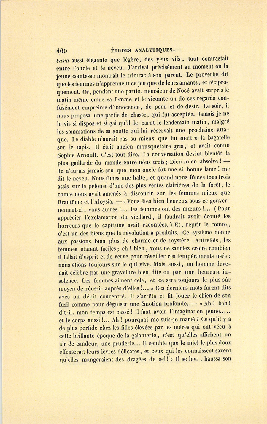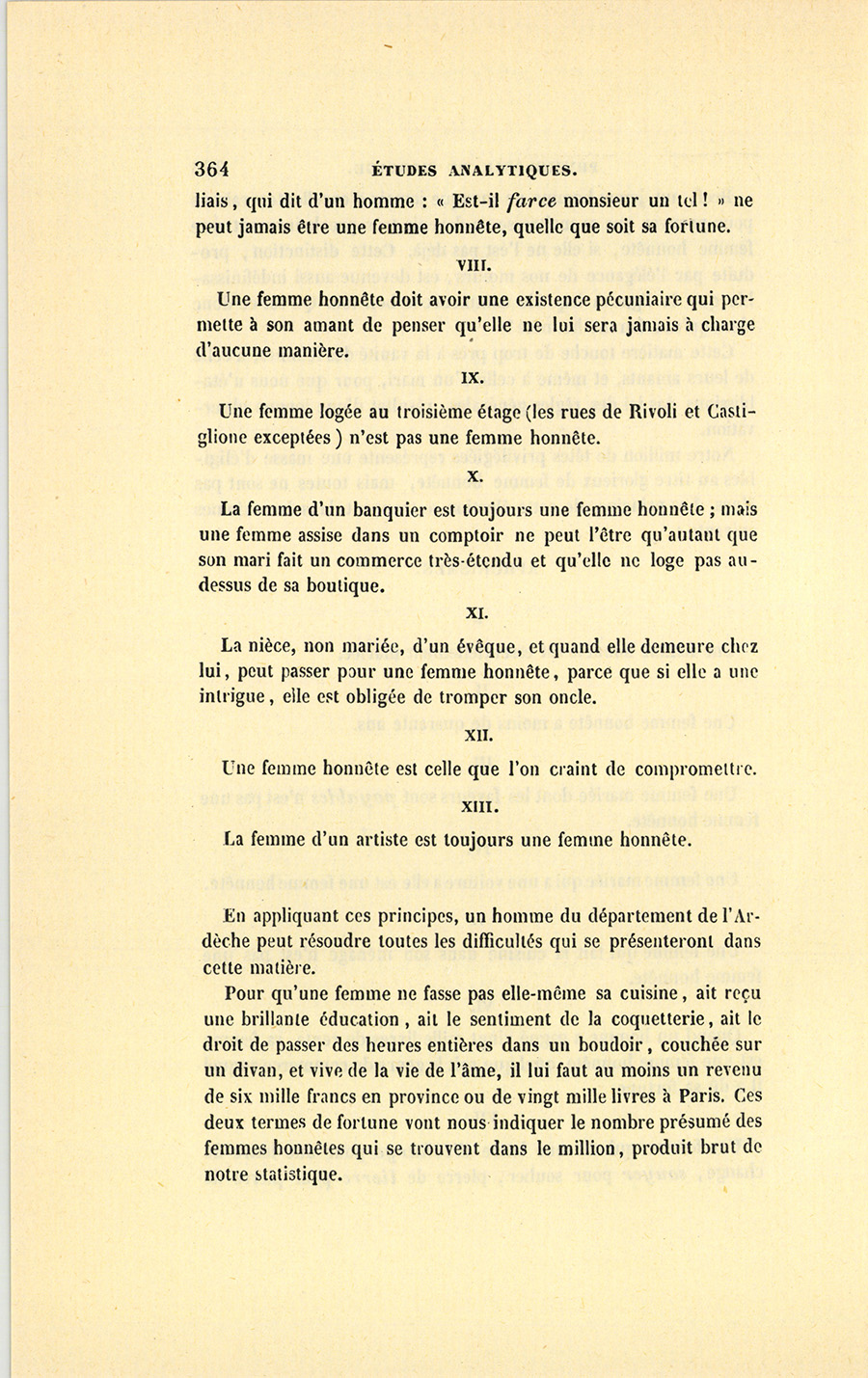 L’auteur arrêta le torrent de ces révélations en faisant part aux deux dames du projet d’ouvrage par lequel il était persécuté, elles y sourirent, et promirent beaucoup de conseils. La plus jeune fournit gaiement un des premiers capitaux de l’entreprise, en disant qu’elle se chargeait de prouver mathématiquement que les femmes entièrement vertueuses étaient des êtres de raison.