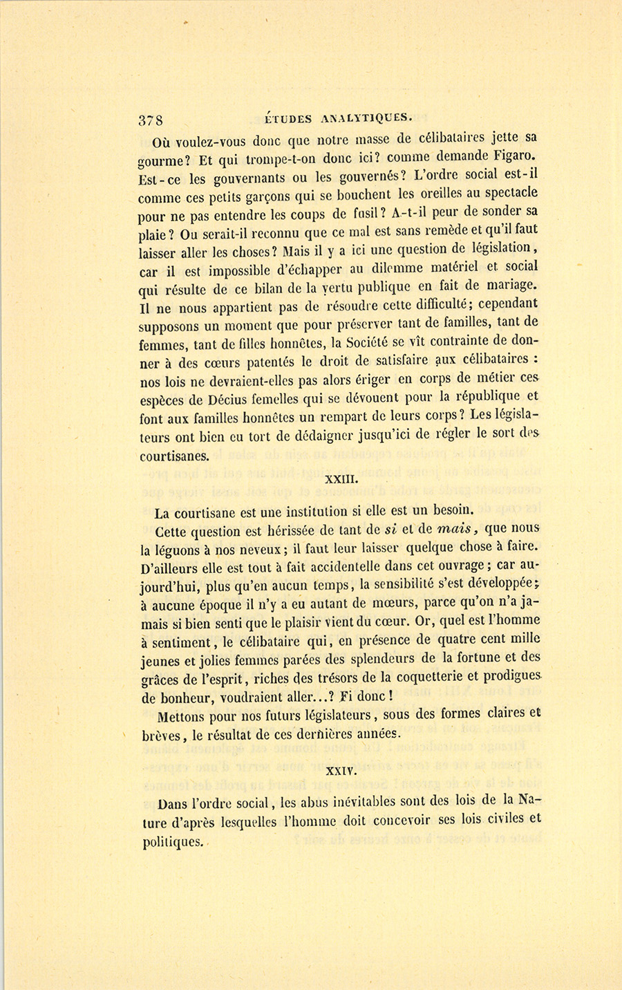 Serait-ce qu’il faut une petite Agar dans chaque ménage ? Il n’est pas besoin de loi pour cela. L’article du Code qui prononce des peines contre la femme adultère, en quelque lieu que le crime se soit commis, et celui qui ne punit un mari qu’autant que sa concubine habite sous le toit conjugal, admettent implicitement des maîtresses en ville.