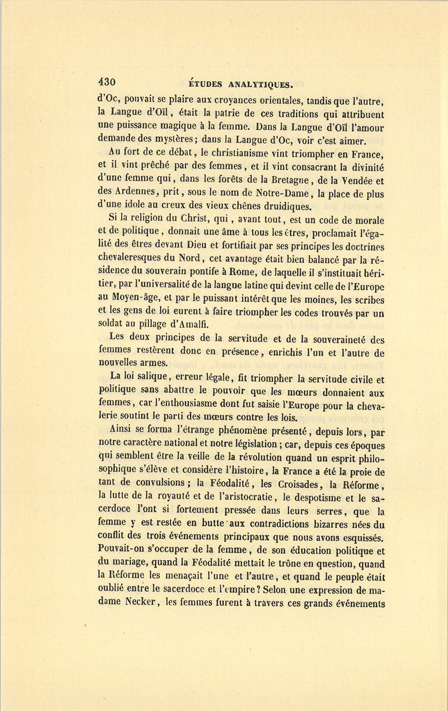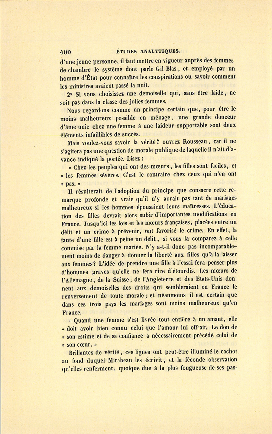 – « Ne vaut-il pas mieux, disait-elle, laisser les choses comme elles sont ? Vont-elles donc si mal ? Il faut croire au mariage comme à l’immortalité de l’âme ; et vous ne faites certainement pas un livre pour vanter le bonheur conjugal. D’ailleurs vous conclurez sans doute d’après un millier de ménages parisiens qui ne sont que des exceptions. Vous trouverez peut-être des maris disposés à vous abandonner leurs femmes ; mais aucun fils ne vous abandonnera sa mère… Quelques personnes blessées par les opinions que vous professerez soupçonneront vos mœurs, calomnieront vos intentions. Enfin, pour toucher aux écrouelles sociales, il faut être roi, ou tout au moins premier consul. »