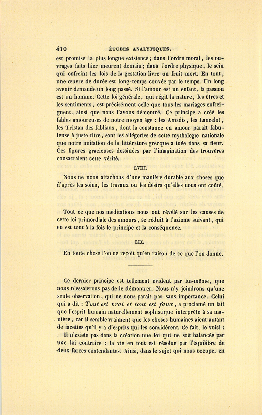– L’amour n’existe pas, reprit le vieillard en me regardant. Ce n’est pas même un sentiment, c’est une nécessité malheureuse qui tient le milieu entre les besoins du corps et ceux de l’âme. Mais, en épousant pour un moment vos jeunes pensées, essayons de raisonner sur cette maladie sociale. Je crois que vous ne pouvez concevoir l’amour que comme un besoin ou comme un sentiment.