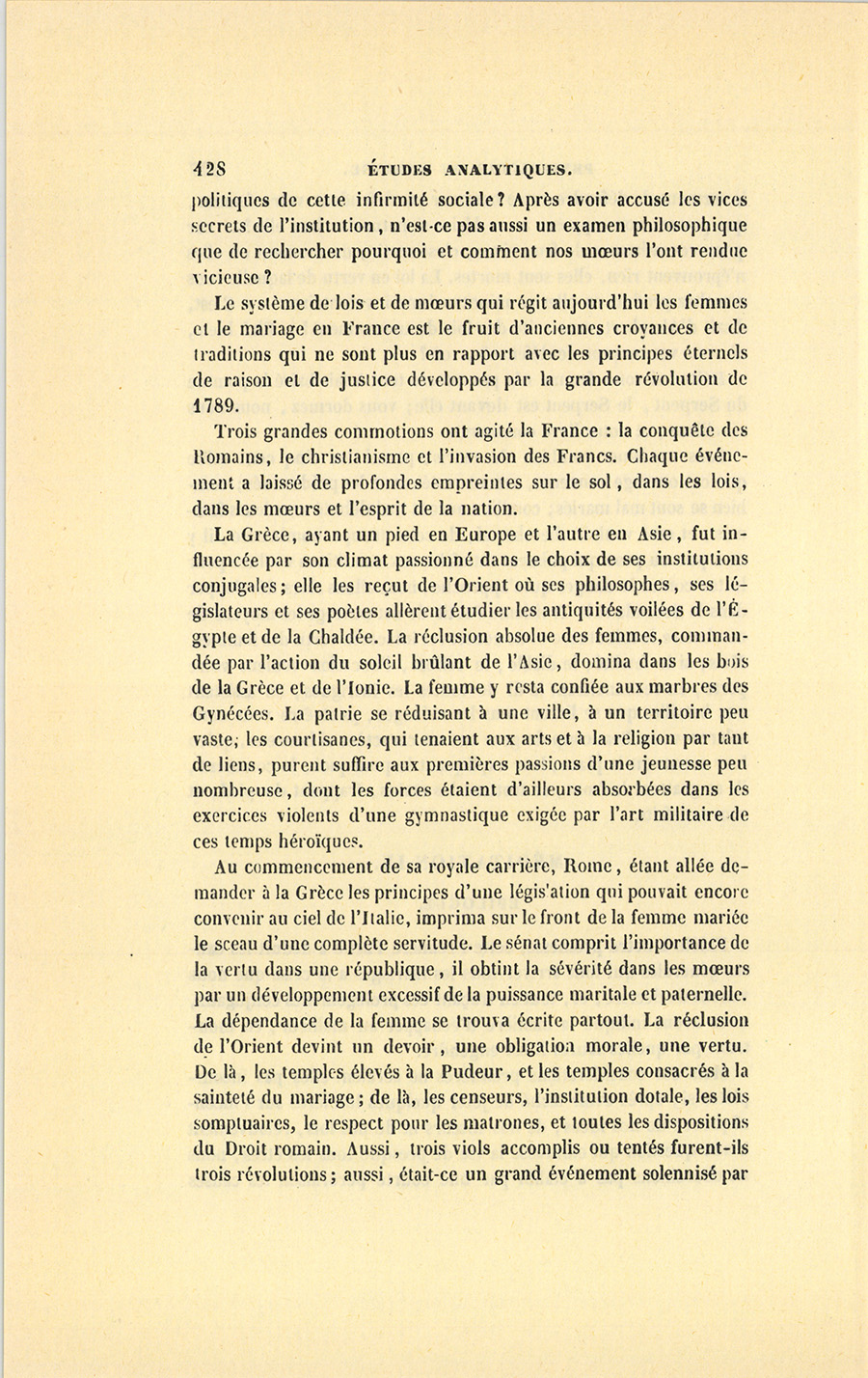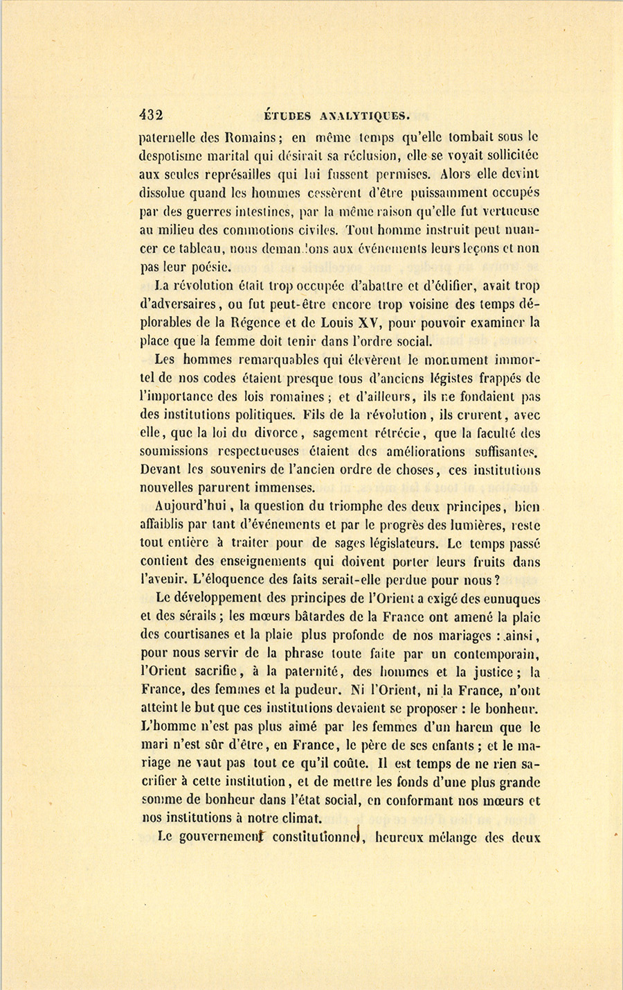 « Le mariage ne dérive point de la nature. – La famille orientale diffère entièrement de la famille occidentale. – L’homme est le ministre de la nature, et la société vient s’enter sur elle. – Les lois sont faites pour les mœurs, et les mœurs varient. »