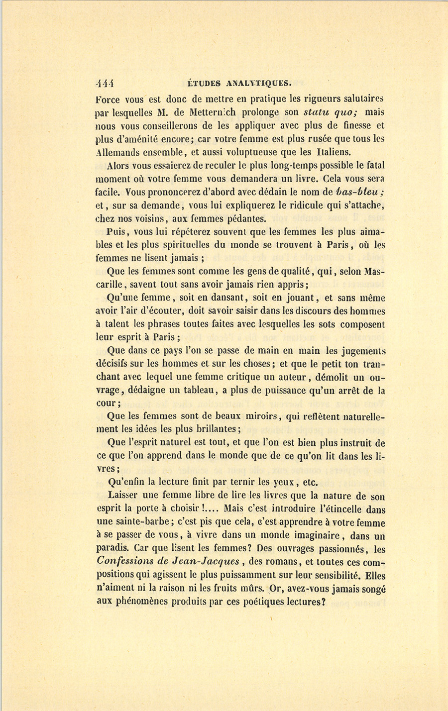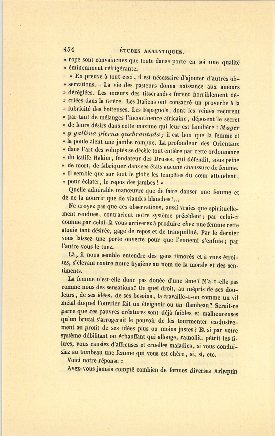 La femme qui, sur le titre de ce livre, serait tentée de l’ouvrir, peut s’en dispenser, elle l’a déjà lu sans le savoir. Un homme, quelque malicieux qu’il puisse être, ne dira jamais des femmes autant de bien ni autant de mal qu’elles en pensent elles-mêmes. Si, malgré cet avis, une femme persistait à lire l’ouvrage, la délicatesse devra lui imposer la loi de ne pas médire de l’auteur, du moment où, se privant des approbations qui flattent le plus les artistes, il a en quelque sorte gravé sur le frontispice de son livre la prudente inscription mise sur la porte de quelques établissements : Les dames n’entrent pas ici.