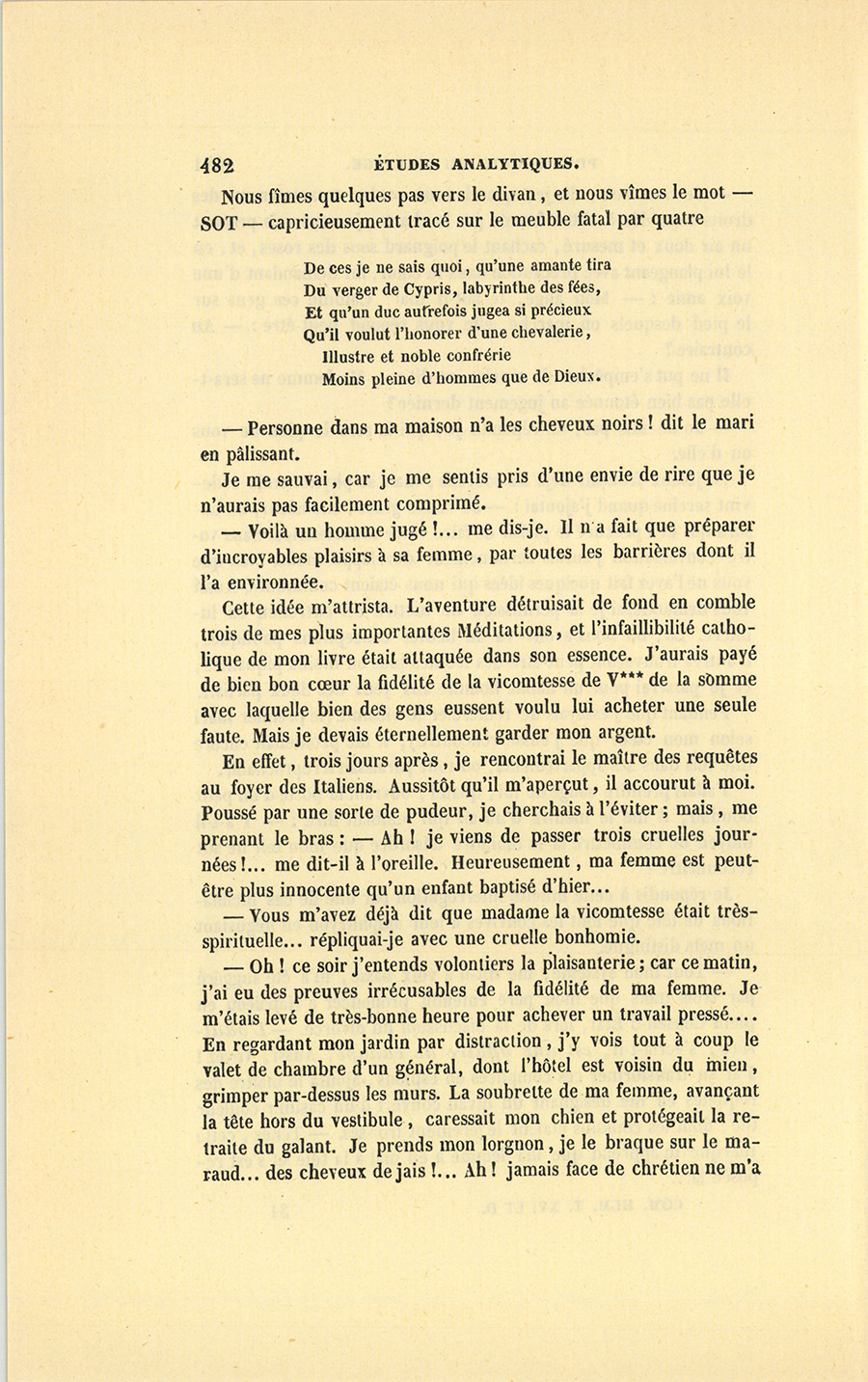 Le narrateur de cette vieille histoire était un grand homme sec, à l’œil fauve, à cheveux bruns, et l’auteur crut apercevoir de vagues ressemblances entre lui et le démon qui, jadis, l’avait tant tourmenté ; mais l’étranger n’avait pas le pied fourchu. Tout à coup le mot adultère sonna aux oreilles de l’auteur ; et alors, cette espèce de cloche réveilla, dans son imagination, les figures les plus lugubres du cortége qui naguère défilait à la suite de ces prestigieuses syllabes.
