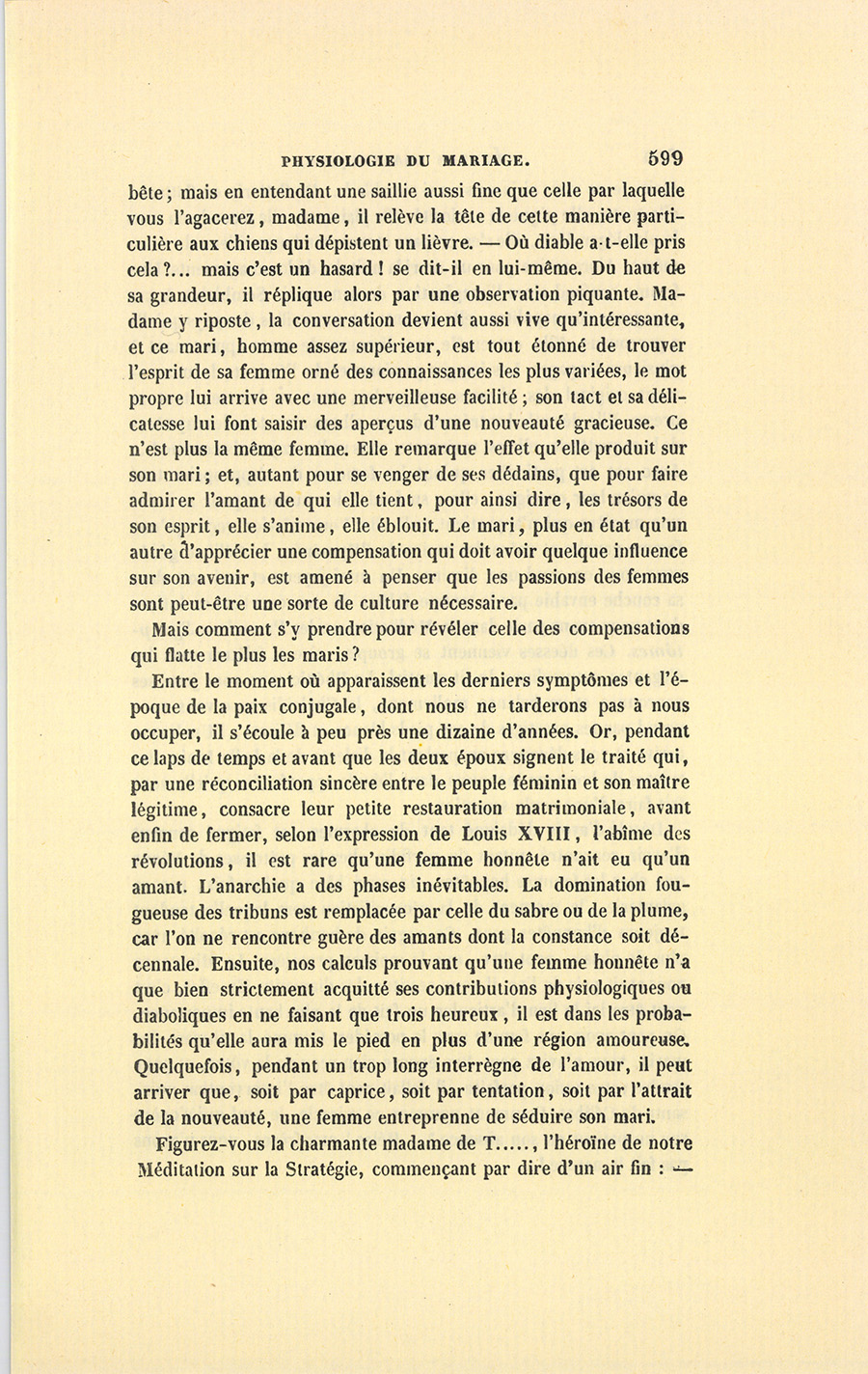 Certain soir, un pauvre mari, retenu au logis par une pluie battante, ou lassé peut-être d’aller passer ses soirées au jeu, au café, dans le monde, ennuyé de tout, se voit contraint après le dîner de suivre sa femme dans la chambre conjugale. Il se plonge dans une bergère et attend sultanesquement son café ; il semble se dire : – Après tout, c’est ma femme !… La syrène apprête elle-même la boisson favorite, elle met un soin particulier à la distiller, la sucre, y goûte, la lui présente ; et, en souriant, elle hasarde, odalisque soumise, une plaisanterie, afin de dérider le front de son maître et seigneur. Jusqu’alors, il avait cru que sa femme était {p. 599} bête ; mais en entendant une saillie aussi fine que celle par laquelle vous l’agacerez, madame, il relève la tête de cette manière particulière aux chiens qui dépistent un lièvre. – Où diable a-t-elle pris cela ?… mais c’est un hasard ! se dit-il en lui-même. Du haut de sa grandeur, il réplique alors par une observation piquante. Madame y riposte, la conversation devient aussi vive qu’intéressante, et ce mari, homme assez supérieur, est tout étonné de trouver l’esprit de sa femme orné des connaissances les plus variées, le mot propre lui arrive avec une merveilleuse facilité ; son tact et sa délicatesse lui font saisir des aperçus d’une nouveauté gracieuse. Ce n’est plus la même femme. Elle remarque l’effet qu’elle produit sur son mari ; et, autant pour se venger de ses dédains, que pour faire admirer l’amant de qui elle tient, pour ainsi dire, les trésors de son esprit, elle s’anime, elle éblouit. Le mari, plus en état qu’un autre d’apprécier une compensation qui doit avoir quelque influence sur son avenir, est amené à penser que les passions des femmes sont peut-être une sorte de culture nécessaire.