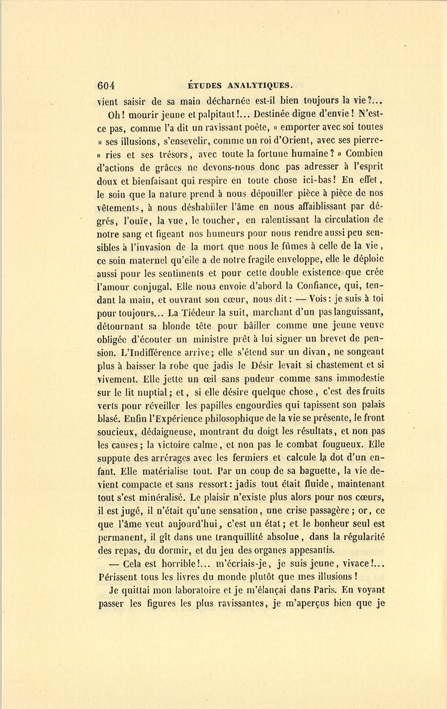 Oh ! mourir jeune et palpitant !… Destinée digne d’envie ! N’est-ce pas, comme l’a dit un ravissant poète, « emporter avec soi toutes ses illusions, s’ensevelir, comme un roi d’Orient, avec ses pierreries et ses trésors, avec toute la fortune humaine ? » Combien d’actions de grâces ne devons-nous donc pas adresser à l’esprit doux et bienfaisant qui respire en toute chose ici-bas ! En effet, le soin que la nature prend à nous dépouiller pièce à pièce de nos vêtements, à nous déshabiller l’âme en nous affaiblissant par degrés, l’ouïe, la vue, le toucher, en ralentissant la circulation de notre sang et figeant nos humeurs pour nous rendre aussi peu sensibles à l’invasion de la mort que nous le fûmes à celle de la vie, ce soin maternel qu’elle a de notre fragile enveloppe, elle le déploie aussi pour les sentiments et pour cette double existence que crée l’amour conjugal. Elle nous envoie d’abord la Confiance, qui, tendant la main, et ouvrant son cœur, nous dit : – Vois : je suis à toi pour toujours… La Tiédeur la suit, marchant d’un pas languissant, détournant sa blonde tête pour bâiller comme une jeune veuve obligée d’écouter un ministre prêt à lui signer un brevet de pension. L’Indifférence arrive ; elle s’étend sur un divan, ne songeant plus à baisser la robe que jadis le Désir levait si chastement et si vivement. Elle jette un œil sans pudeur comme sans immodestie sur le lit nuptial ; et, si elle désire quelque chose, c’est des fruits verts pour réveiller les papilles engourdies qui tapissent son palais blasé. Enfin l’Expérience philosophique de la vie se présente, le front soucieux, dédaigneuse, montrant du doigt les résultats, et non pas les causes ; la victoire calme, et non pas le combat fougueux. Elle suppute des arrérages avec les fermiers et calcule la dot d’un enfant. Elle matérialise tout. Par un coup de sa baguette, la vie devient compacte et sans ressort : jadis tout était fluide, maintenant tout s’est minéralisé. Le plaisir n’existe plus alors pour nos cœurs, il est jugé, il n’était qu’une sensation, une crise passagère ; or, ce que l’âme veut aujourd’hui, c’est un état ; et le bonheur seul est permanent, il gît dans une tranquillité absolue, dans la régularité des repas, du dormir, et du jeu des organes appesantis.