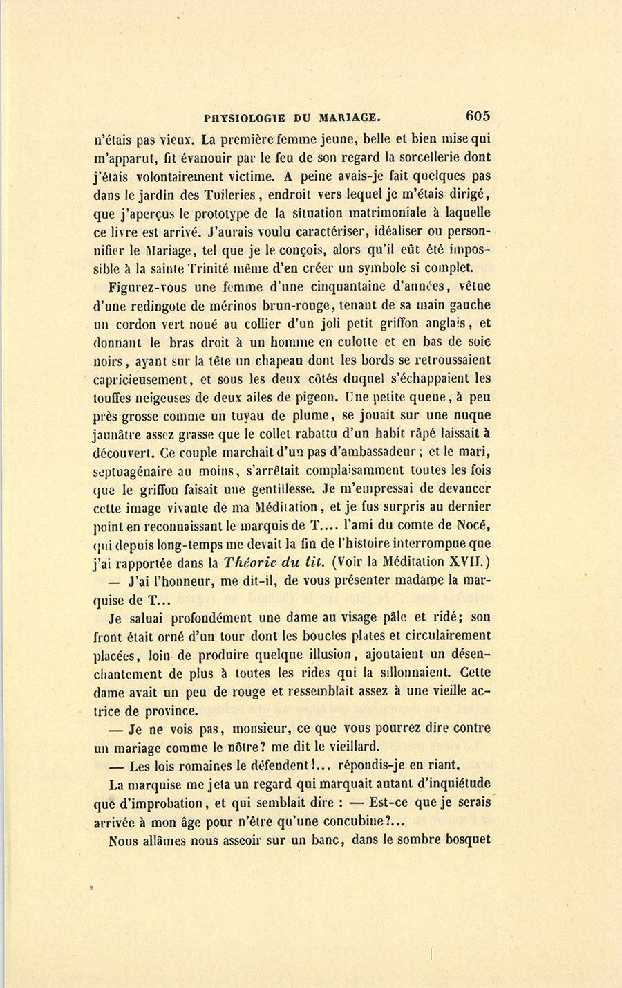 Figurez-vous une femme d’une cinquantaine d’années, vêtue d’une redingote de mérinos brun-rouge, tenant de sa main gauche un cordon vert noué au collier d’un joli petit griffon anglais, et donnant le bras droit à un homme en culotte et en bas de soie noirs, ayant sur la tête un chapeau dont les bords se retroussaient capricieusement, et sous les deux côtés duquel s’échappaient les touffes neigeuses de deux ailes de pigeon. Une petite queue, à peu près grosse comme un tuyau de plume, se jouait sur une nuque jaunâtre assez grasse que le collet rabattu d’un habit râpé laissait à découvert. Ce couple marchait d’un pas d’ambassadeur ; et le mari, septuagénaire au moins, s’arrêtait complaisamment toutes les fois que le griffon faisait une gentillesse. Je m’empressai de devancer cette image vivante de ma Méditation, et je fus surpris au dernier point en reconnaissant le marquis de T…, l’ami du comte de Nocé, qui depuis long-temps me devait la fin de l’histoire interrompue que j’ai rapportée dans la Théorie du lit. (Voir la Méditation XVII.)