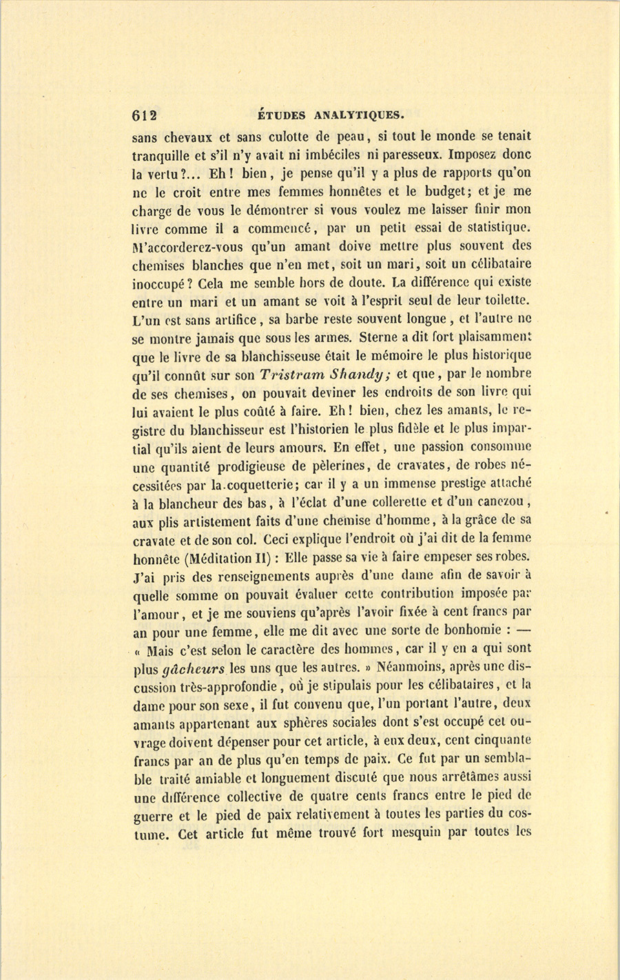 – De sorte, mon excellent mari-modèle, que si personne ne se grisait, ne jouait, ne prenait de tabac, ne chassait ; enfin si nous n’avions en France, ni vices, ni passions, ni maladies, l’État serait à deux doigts d’une banqueroute ; car il paraît que nos rentes sont hypothéquées sur la corruption publique, comme notre commerce ne vit que par le luxe. Si l’on veut y regarder d’un peu plus près, tous les impôts sont basés sur une maladie morale. En effet la plus grosse recette des domaines ne vient-elle pas des contrats d’assurances que chacun s’empresse de se constituer contre les mutations de sa bonne foi, de même que la fortune des gens de justice prend sa source dans les procès qu’on intente à cette foi jurée ! Et pour continuer cet examen philosophique, je verrais les gendarmes {p. 612} sans chevaux et sans culotte de peau, si tout le monde se tenait tranquille et s’il n’y avait ni imbéciles ni paresseux. Imposez donc la vertu ?… Eh ! bien, je pense qu’il y a plus de rapports qu’on ne le croit entre mes femmes honnêtes et le budget ; et je me charge de vous le démontrer si vous voulez me laisser finir mon livre comme il a commencé, par un petit essai de statistique. M’accorderez-vous qu’un amant doive mettre plus souvent des chemises blanches que n’en met, soit un mari, soit un célibataire inoccupé ? Cela me semble hors de doute. La différence qui existe entre un mari et un amant se voit à l’esprit seul de leur toilette. L’un est sans artifice, sa barbe reste souvent longue, et l’autre ne se montre jamais que sous les armes. Sterne a dit fort plaisamment que le livre de sa blanchisseuse était le mémoire le plus historique qu’il connût sur son Tristram Shandy ; et que, par le nombre de ses chemises, on pouvait deviner les endroits de son livre qui lui avaient le plus coûté à faire. Eh ! bien, chez les amants, le registre du blanchisseur est l’historien le plus fidèle et le plus impartial qu’ils aient de leurs amours. En effet, une passion consomme une quantité prodigieuse de pèlerines, de cravates, de robes nécessitées par la coquetterie ; car il y a un immense prestige attaché à la blancheur des bas, à l’éclat d’une collerette et d’un canezou, aux plis artistement faits d’une chemise d’homme, à la grâce de sa cravate et de son col. Ceci explique l’endroit où j’ai dit de la femme honnête (Méditation II) : Elle passe sa vie à faire empeser ses robes. J’ai pris des renseignements auprès d’une dame afin de savoir à quelle somme on pouvait évaluer cette contribution imposée par l’amour, et je me souviens qu’après l’avoir fixée à cent francs par an pour une femme, elle me dit avec une sorte de bonhomie : – « Mais c’est selon le caractère des hommes, car il y en a qui sont plus gâcheurs les uns que les autres. » Néanmoins, après une discussion très-approfondie, où je stipulais pour les célibataires, et la dame pour son sexe, il fut convenu que, l’un portant l’autre, deux amants appartenant aux sphères sociales dont s’est occupé cet ouvrage doivent dépenser pour cet article, à eux deux, cent cinquante francs par an de plus qu’en temps de paix. Ce fut par un semblable traité amiable et longuement discuté que nous arrêtâmes aussi une différence collective de quatre cents francs entre le pied de guerre et le pied de paix relativement à toutes les parties du costume. Cet article fut même trouvé fort mesquin par toutes les {p. 613} puissances viriles et féminines que nous consultâmes. Les lumières qui nous furent apportées par quelques personnes pour nous éclairer sur ces matières délicates nous donnèrent l’idée de réunir dans un dîner quelques têtes savantes, afin d’être guidés par des opinions sages dans ces importantes recherches. L’assemblée eut lieu. Ce fut le verre à la main, et après de brillantes improvisations, que les chapitres suivants du budget de l’amour reçurent une sorte de sanction législative. La somme de cent francs fut allouée pour les commissionnaires et les voitures. Celle de cinquante écus parut très-raisonnable pour les petits pâtés que l’on mange en se promenant, pour les bouquets de violettes et les parties de spectacle. Une somme de deux cents francs fut reconnue nécessaire à la solde extraordinaire demandée par la bouche et les dîners chez les restaurateurs. Du moment où la dépense était admise, il fallait bien la couvrir par une recette. Ce fut dans cette discussion qu’un jeune chevau-léger (car le roi n’avait pas encore supprimé sa maison rouge à l’époque où cette transaction fut méditée), rendu presque ebriolus par le vin de champagne, fut rappelé à l’ordre pour avoir osé comparer les amants à des appareils distillatoires. Mais un chapitre qui donna lieu aux plus violentes discussions, qui resta même ajourné pendant plusieurs semaines, et qui nécessita un rapport, fut celui des cadeaux. Dans la dernière séance, la délicate madame de D… opina la première ; et, par un discours plein de grâce et qui prouvait la noblesse de ses sentiments, elle essaya de démontrer que la plupart du temps les dons de l’amour n’avaient aucune valeur intrinsèque. L’auteur répondit qu’il n’y avait pas d’amants qui ne fissent faire leurs portraits. Une dame objecta que le portrait n’était qu’un premier capital, et qu’on avait toujours soin de se les redemander pour leur donner un nouveau cours. Mais tout à coup un gentilhomme provençal se leva pour prononcer une philippique contre les femmes. Il parla de l’incroyable faim qui dévore la plupart des amantes pour les fourrures, les pièces de satin, les étoffes, les bijoux et les meubles ; mais une dame l’interrompit en lui demandant si madame d’O… y, son amie intime, ne lui avait pas déjà payé deux fois ses dettes. – Vous vous trompez, madame, reprit le Provençal, c’est son mari. – L