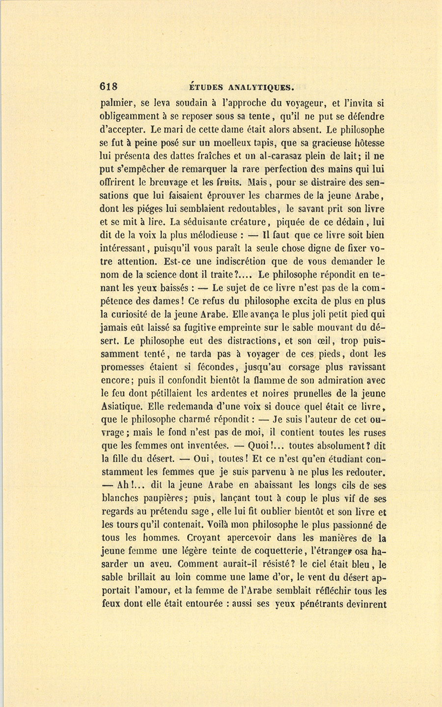 Elle sourit malicieusement et reprit en ces termes : – Un philosophe avait composé un fort ample recueil de tous les tours que notre sexe peut jouer ; et, pour se garantir de nous, il le portait continuellement sur lui. Un jour, en voyageant, il se trouva près d’un camp d’Arabes. Une jeune femme, assise à l’ombre d’un {p. 618} palmier, se leva soudain à l’approche du voyageur, et l’invita si obligeamment à se reposer sous sa tente, qu’il ne put se défendre d’accepter. Le mari de cette dame était alors absent. Le philosophe se fut à peine posé sur un moelleux tapis, que sa gracieuse hôtesse lui présenta des dattes fraîches et un al-carasaz plein de lait ; il ne put s’empêcher de remarquer la rare perfection des mains qui lui offrirent le breuvage et les fruits. Mais, pour se distraire des sensations que lui faisaient éprouver les charmes de la jeune Arabe, dont les piéges lui semblaient redoutables, le savant prit son livre et se mit à lire. La séduisante créature, piquée de ce dédain, lui dit de la voix la plus mélodieuse : – Il faut que ce livre soit bien intéressant, puisqu’il vous paraît la seule chose digne de fixer votre attention. Est-ce une indiscrétion que de vous demander le nom de la science dont il traite ?… Le philosophe répondit en tenant les yeux baissés : – Le sujet de ce livre n’est pas de la compétence des dames ! Ce refus du philosophe excita de plus en plus la curiosité de la jeune Arabe. Elle avança le plus joli petit pied qui jamais eût laissé sa fugitive empreinte sur le sable mouvant du désert. Le philosophe eut des distractions, et son œil, trop puissamment tenté, ne tarda pas à voyager de ces pieds, dont les promesses étaient si fécondes, jusqu’au corsage plus ravissant encore ; puis il confondit bientôt la flamme de son admiration avec le feu dont pétillaient les ardentes et noires prunelles de la jeune Asiatique. Elle redemanda d’une voix si douce quel était ce livre, que le philosophe charmé répondit : – Je suis l’auteur de cet ouvrage ; mais le fond n’est pas de moi, il contient toutes les ruses que les femmes ont inventées. – Quoi !… toutes absolument ? dit la fille du désert. – Oui, toutes ! Et ce n’est qu’en étudiant constamment les femmes que je suis parvenu à ne plus les redouter. – Ah !… dit la jeune Arabe en abaissant les longs cils de ses blanches paupières ; puis, lançant tout à coup le plus vif de ses regards au prétendu sage, elle lui fit oublier bientôt et son livre et les tours qu’il contenait. Voilà mon philosophe le plus passionné de tous les hommes. Croyant apercevoir dans les manières de la jeune femme une légère teinte de coquetterie, l’étranger osa hasarder un aveu. Comment aurait-il résisté ? le ciel était bleu, le sable brillait au loin comme une lame d’or, le vent du désert apportait l’amour, et la femme de l’Arabe semblait réfléchir tous les feux dont elle était entourée : aussi ses yeux pénétrants devinrent {p. 619} humides ; et, par un signe de tête qui parut imprimer un mouvement d’ondulation à cette lumineuse atmosphère, elle consentit à écouter les paroles d’amour que disait l’étranger. Le sage s’enivrait déjà des plus flatteuses espérances, quand la jeune femme, entendant au loin le galop d’un cheval qui semblait avoir des ailes, s’écria : – Nous sommes perdus ! mon mari va nous surprendre. Il est jaloux comme un tigre et plus impitoyable… Au nom du prophète, et si vous aimez la vie, cachez-vous dans ce coffre !… L’auteur épouvanté, ne voyant point d’autre parti à prendre pour se tirer de ce mauvais pas, entra dans le coffre, s’y blottit ; et, la femme le refermant sur lui, en prit la clef. Elle alla au-devant de son époux ; et, après quelques caresses qui le mirent en belle humeur : – Il faut, dit-elle, que je vous raconte une aventure bien singulière. – J’écoute, ma gazelle, répondit l’Arabe qui s’assit sur un tapis en croisant les genoux selon l’habitude des Orientaux. – Il est venu aujourd’hui une espèce de philosophe ! dit-elle. Il prétend avoir rassemblé dans un livre toutes les fourberies dont est capable mon sexe, et ce faux sage m’a entretenue d’amour. – Eh ! bien… s’écria l’Arabe. – Je l’ai écouté !… reprit-elle avec sang-froid, il est jeune, pressant et… vous êtes arrivé fort à propos pour secourir ma vertu chancelante !… L’Arabe bondit comme un lionceau, et tira son cangiar en rugissant. Le philosophe qui, du fond de son coffre, entendait tout, donnait à Arimane son livre, les femmes et tous les hommes de l’Arabie-Pétrée. – Fatmé !… s’écria le mari, si tu veux vivre, réponds !… Où est le traître ?… Effrayée de l’orage qu’elle s’était plu à exciter, Fatmé se jeta aux pieds de son époux, et, tremblant sous l’acier menaçant du poignard, elle désigna le coffre par un seul regard aussi prompt que timide. Elle se releva honteuse, et, prenant la clef qu’elle avait à sa ceinture, elle la présenta au jaloux ; mais au moment où il se disposait à ouvrir le coffre, la malicieuse Arabe partit d’un grand éclat de rire. Faroun s’arrêta tout interdit, et regarda sa femme avec une sorte d’inquiétude. – Enfin j’aurai ma belle chaîne d’or ! s’écria-t-elle en sautant de joie, donnez-la-moi, vous avez perdu le Diadesté. Une autre fois ayez plus de mémoire. Le mari, stupéfait, laissa tomber la clef, et présenta la prestigieuse chaîne d’or à genoux, en offrant à sa chère Fatmé de lui apporter tous les bijoux des caravanes qui passeraient dans l’année, si elle voulait renoncer à employer des ruses si cruelles pour gagner le {p. 620} Diadesté. Puis, comme c’était un Arabe, et qu’il n’aimait pas à perdre une chaîne d’or, bien qu’elle dût appartenir à sa femme, il remonta sur son coursier et partit, allant grommeler à son aise dans le d