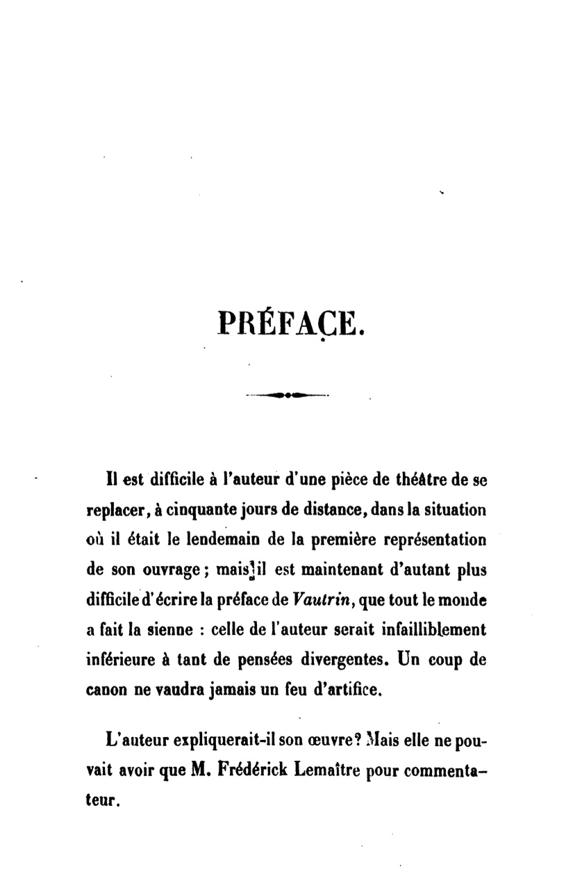 L'auteur expliquerait-ilson œuvre ? Mais elle ne pou vait avoir que monsieur Frédérick Lemaître pour commentateur.