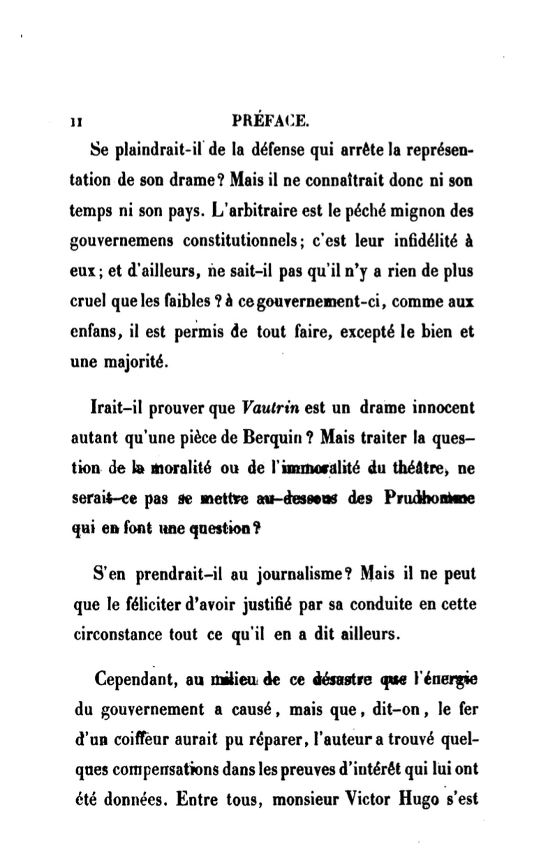 Cependant, au milieu de ce désastre que l'énergie du gouvernement a causé, mais que, dit-on, le fer d'un coiffeur aurait pu réparer, l'auteur a trouvé quelques compensations dans les preuves d'intérêt qui lui ont été données. Entre tous, monsieur Victor Hugo s'est {p. III} montré aussi serviable qu'il est grand poète ; et l'auteur est d'autant plus heureux de publier combien il fut obligeant, que les ennemis de monsieur Hugo ne se font pas faute de calomnier son caractère .