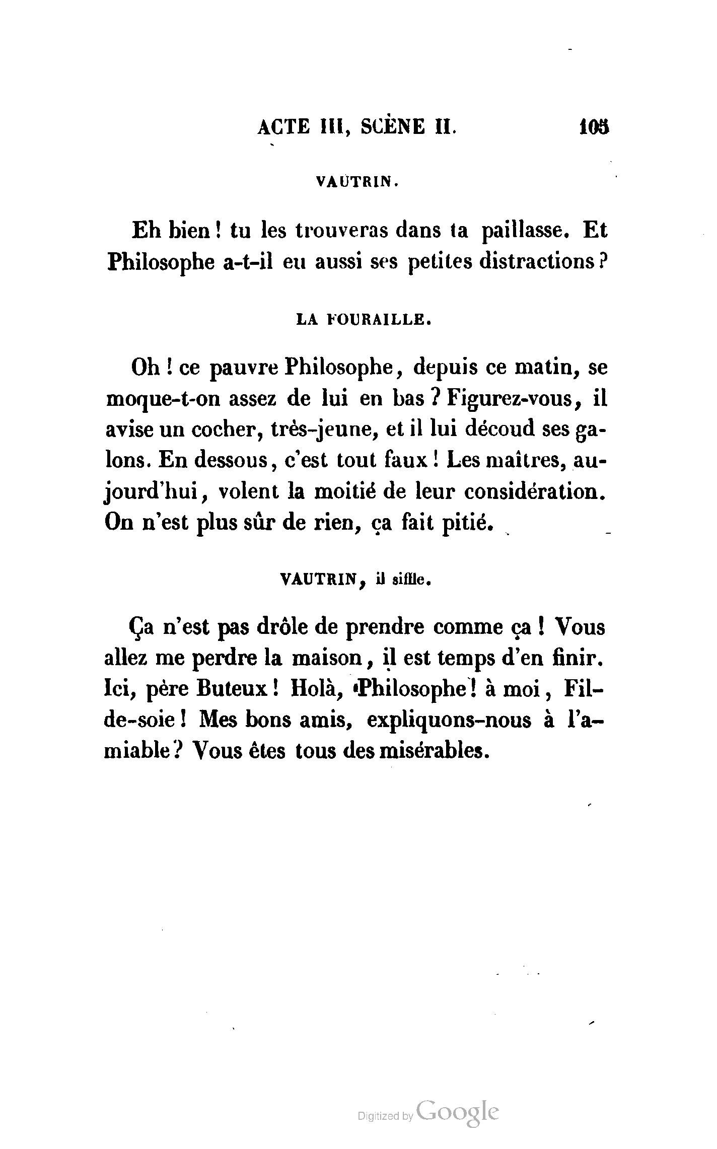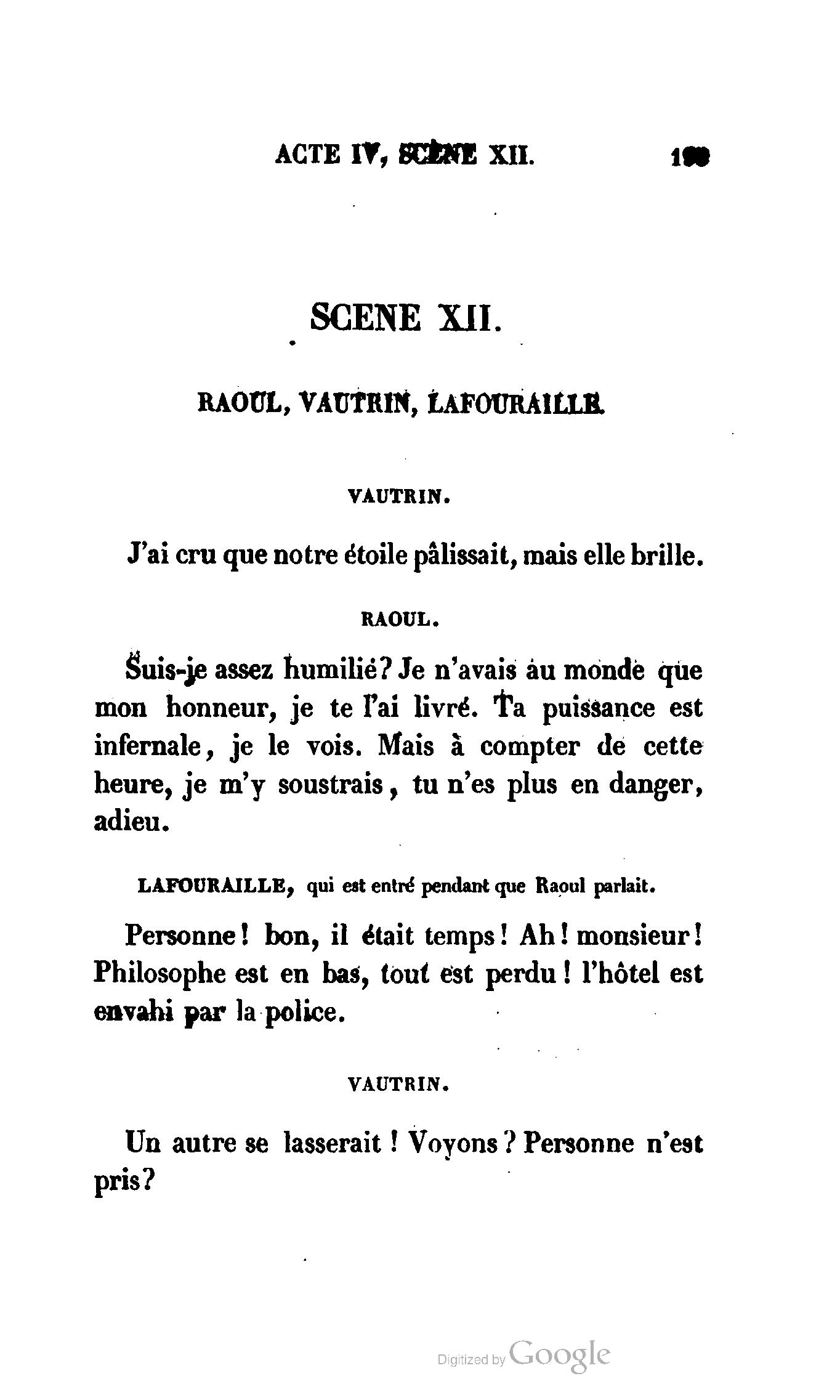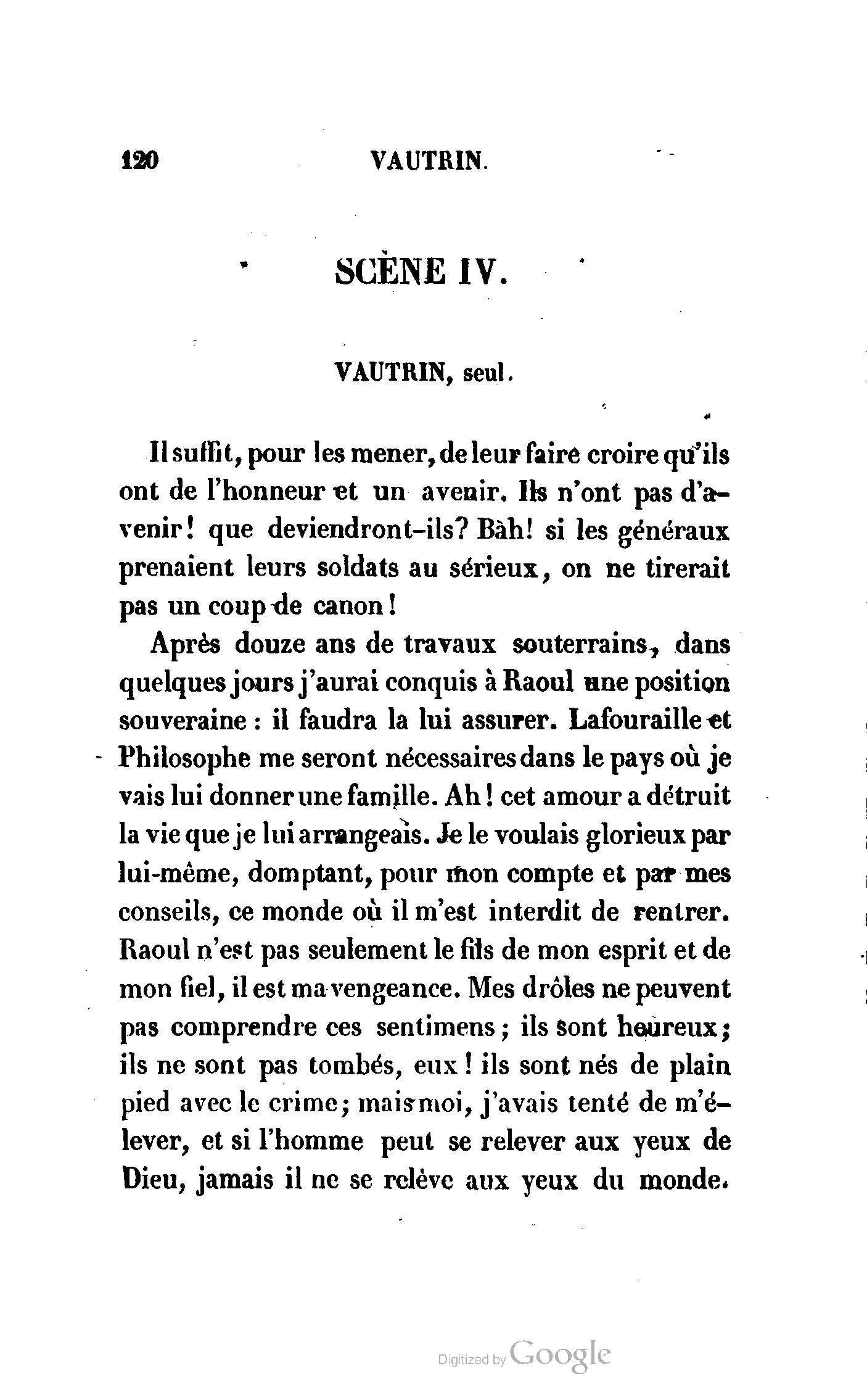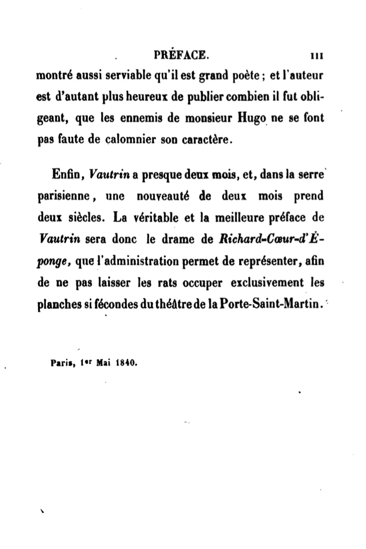 Enfin, Vautrin a presque deux mois, et, dans la serre parisienne, une nouveauté de deux mois prend deux siècles. La véritable et la meilleure préface de Vautrin sera donc le drame de Richard-Caur-d'Éponge, que l'administration permet de représenter, afin de ne pas laisser les rats occuper exclusivement les planches si fécondes du théâtre de la Porte-Saint-Martin.