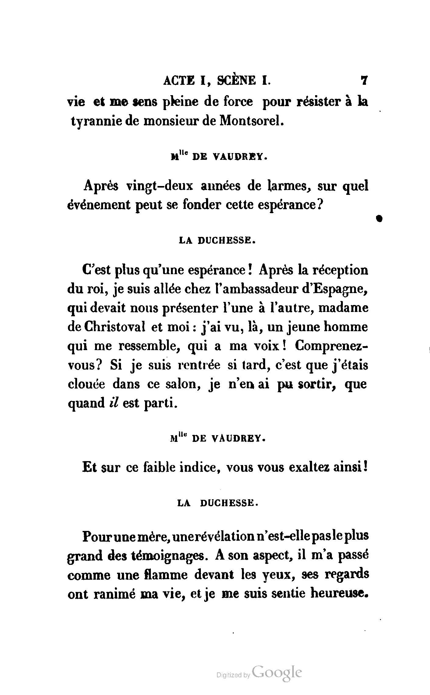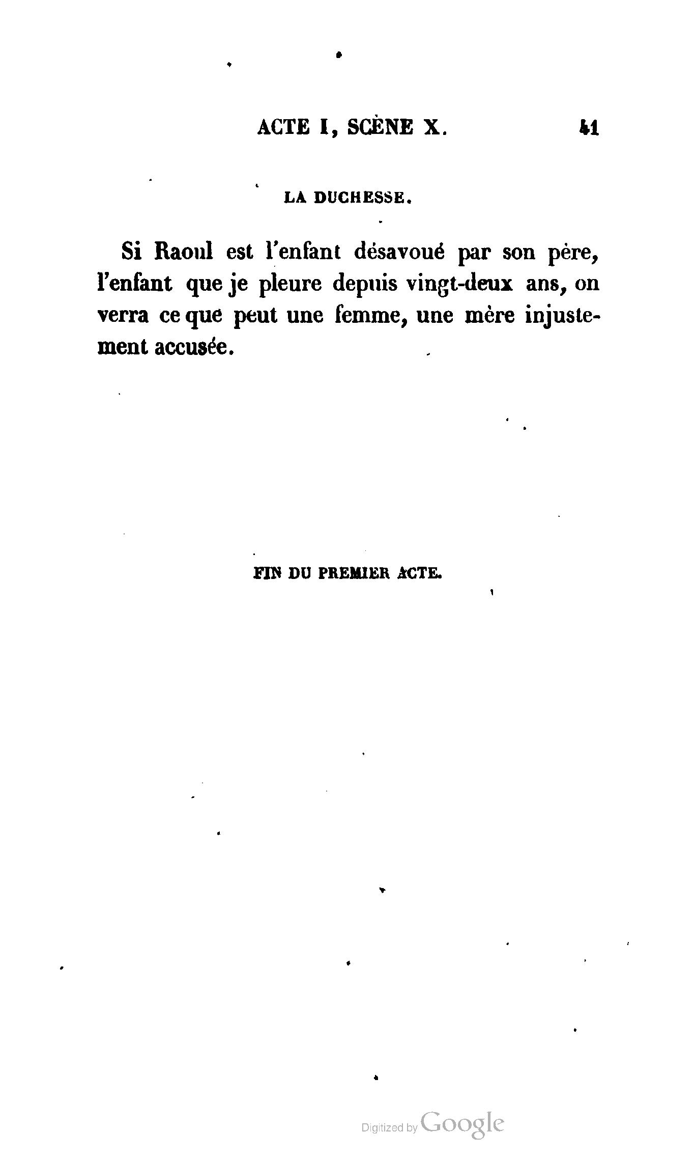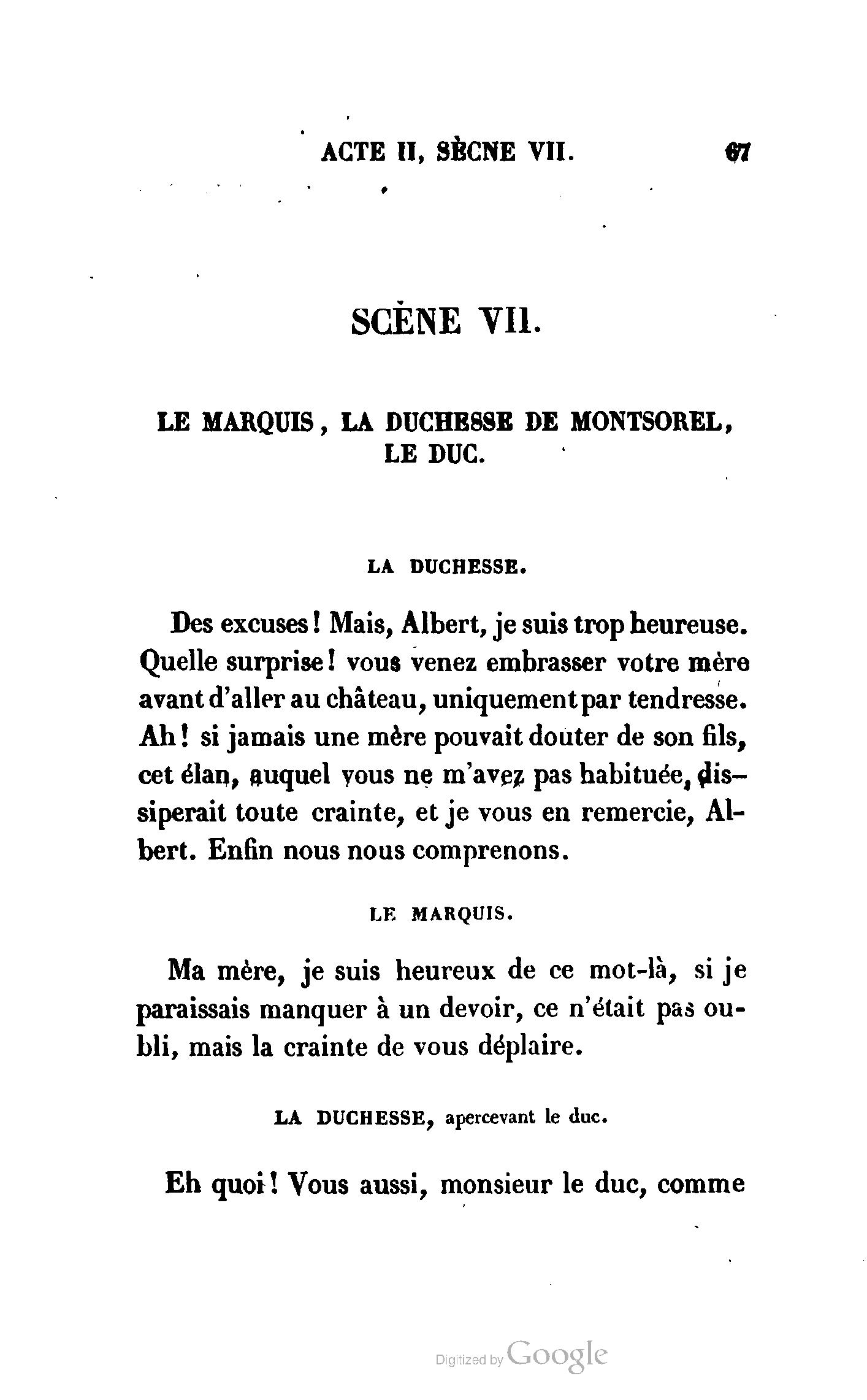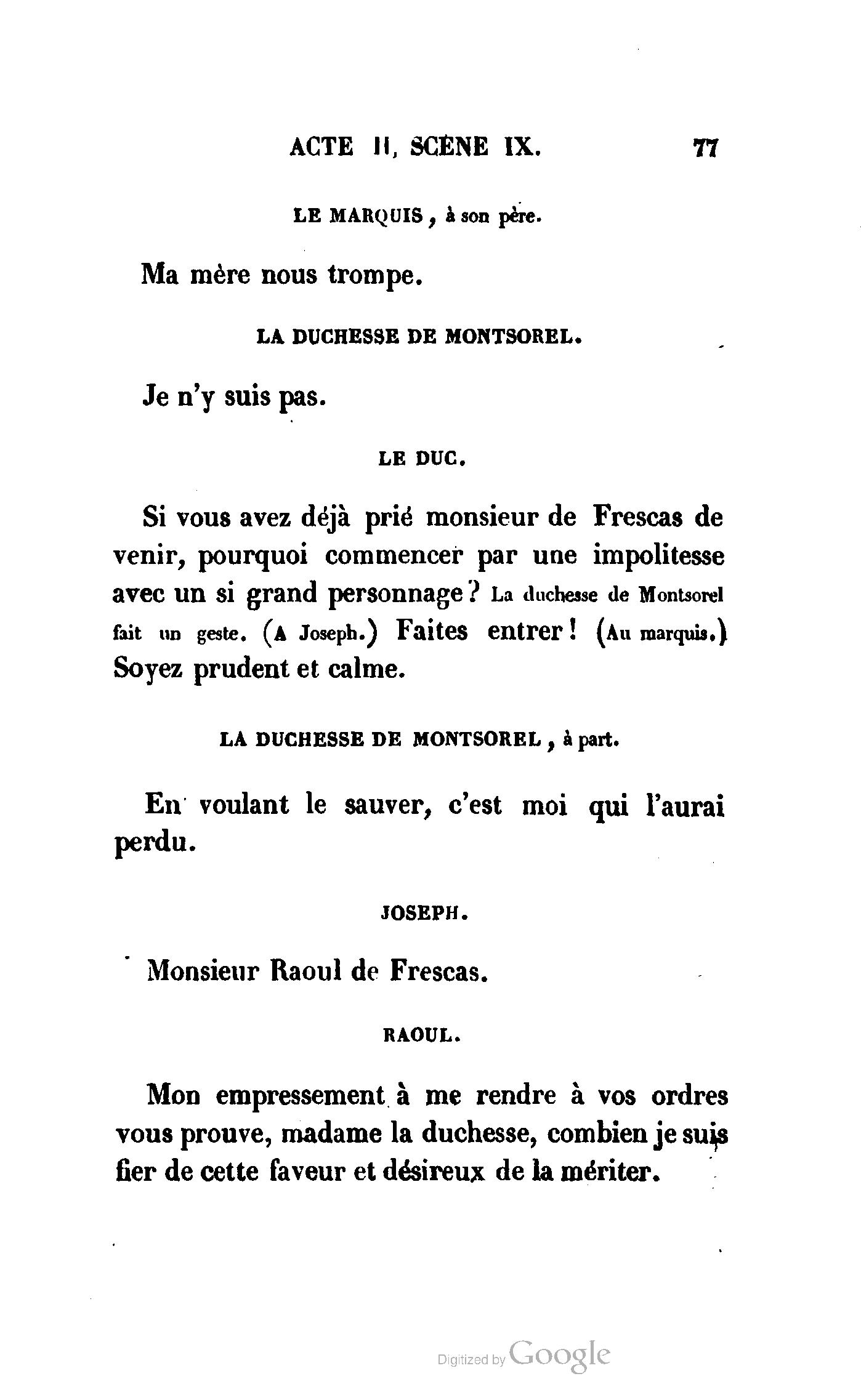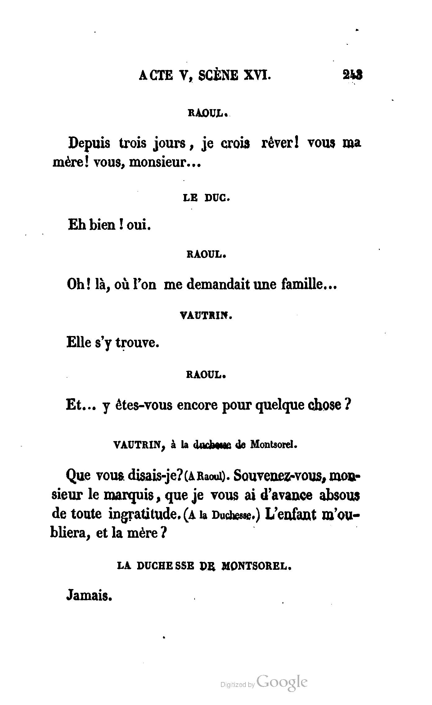 Que vous disais-je ? (À Raoul). Souvenez-vous, Monsieur le marquis, que je vous ai d’avance absous de toute ingratitude. (À la duchesse.) L’enfant m’oubliera, et la mère ?