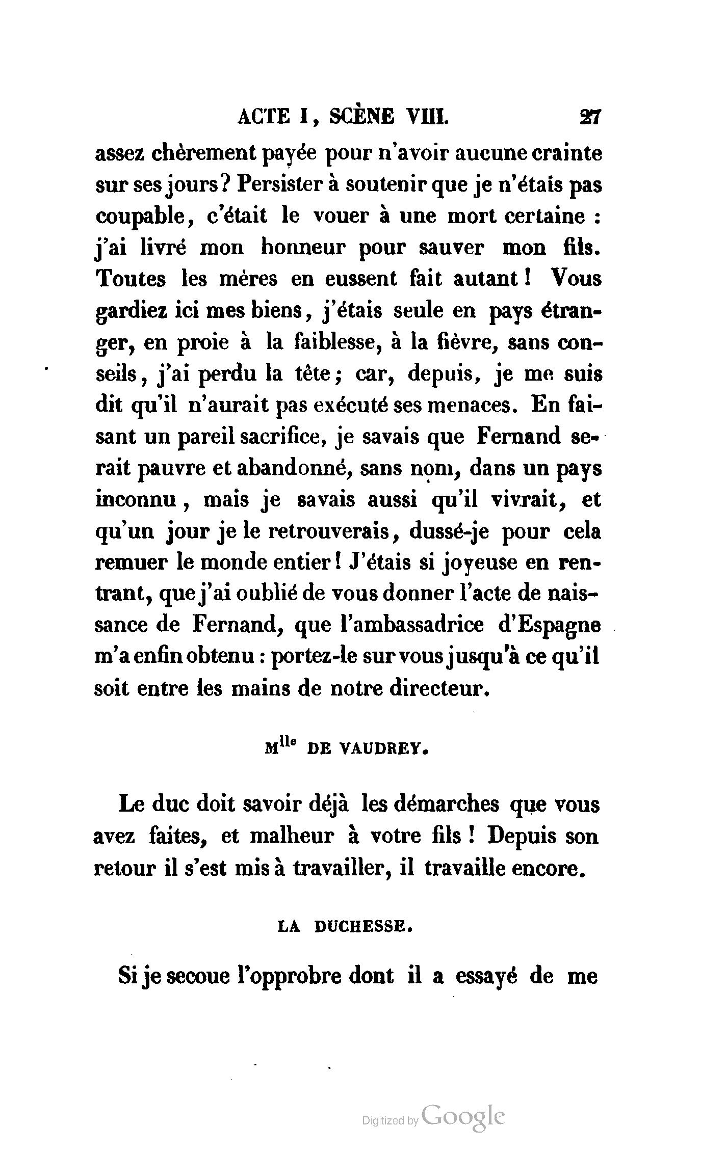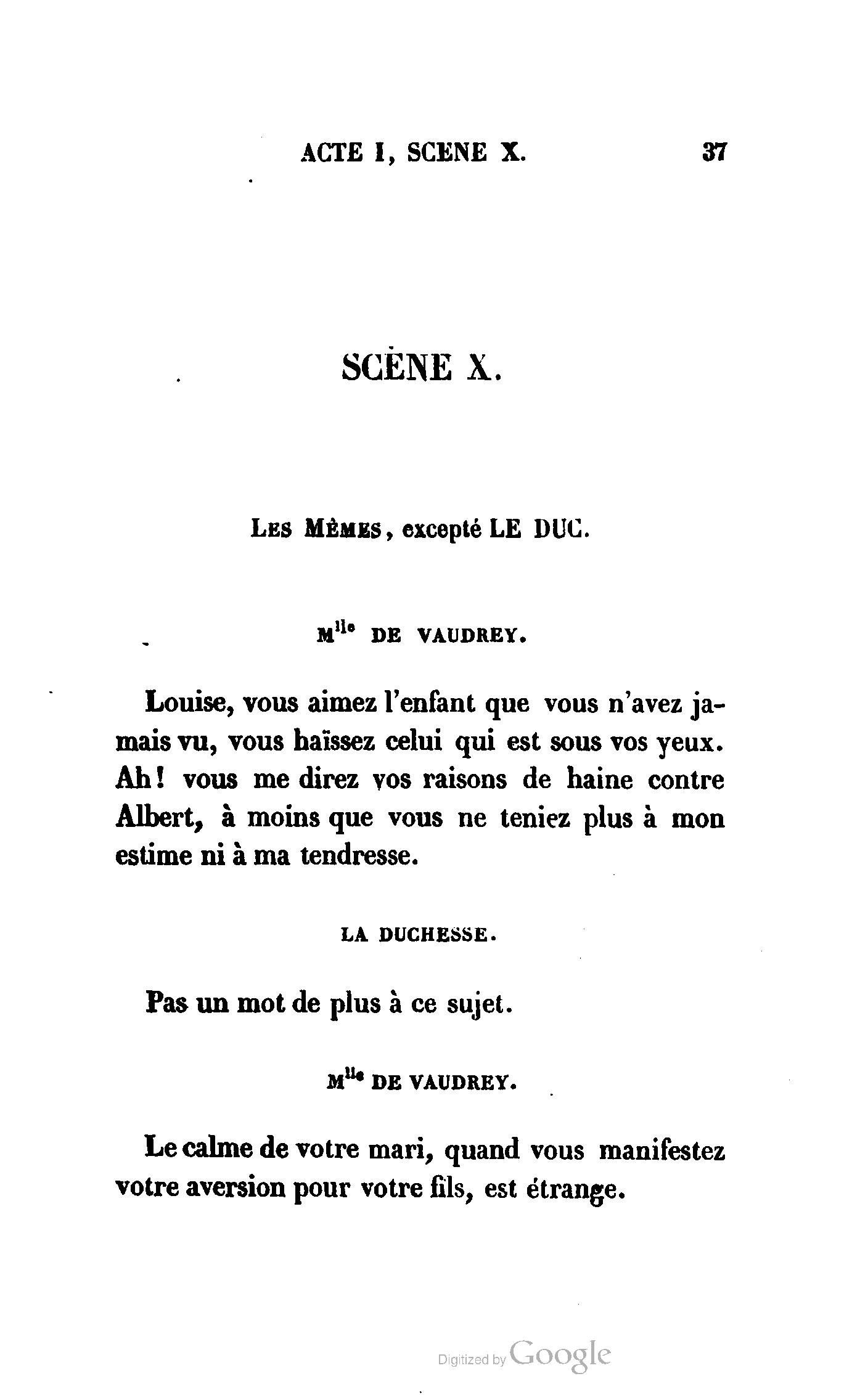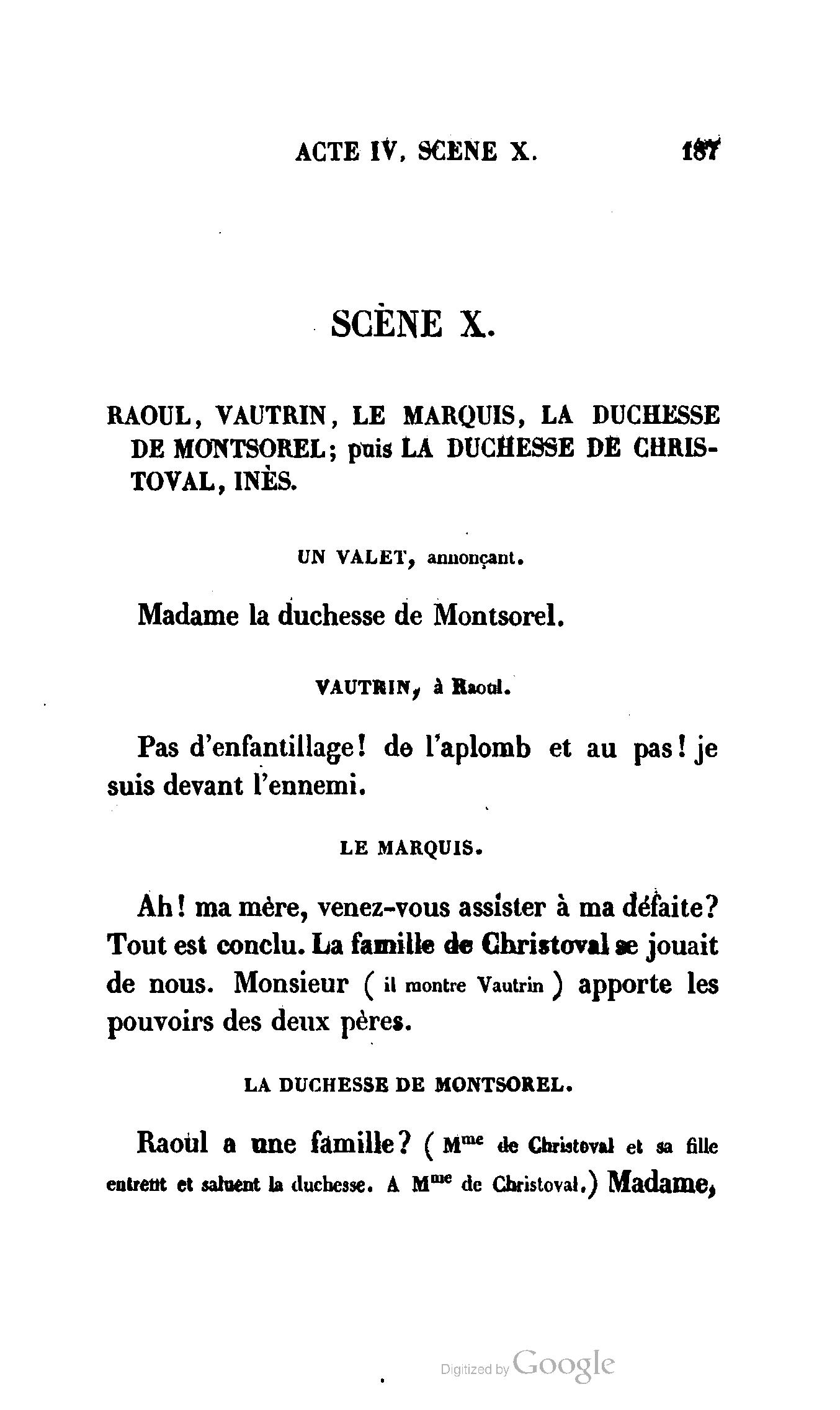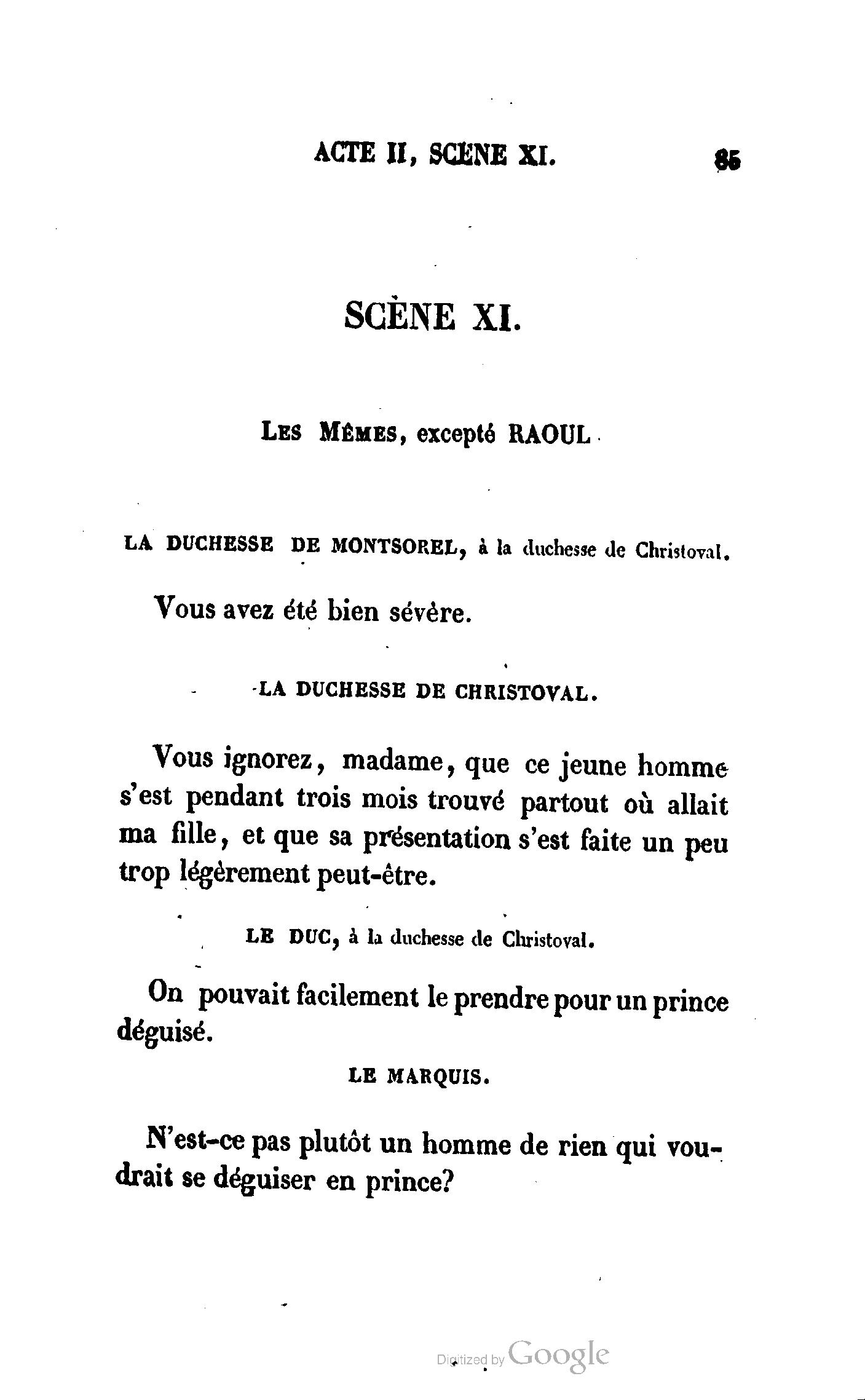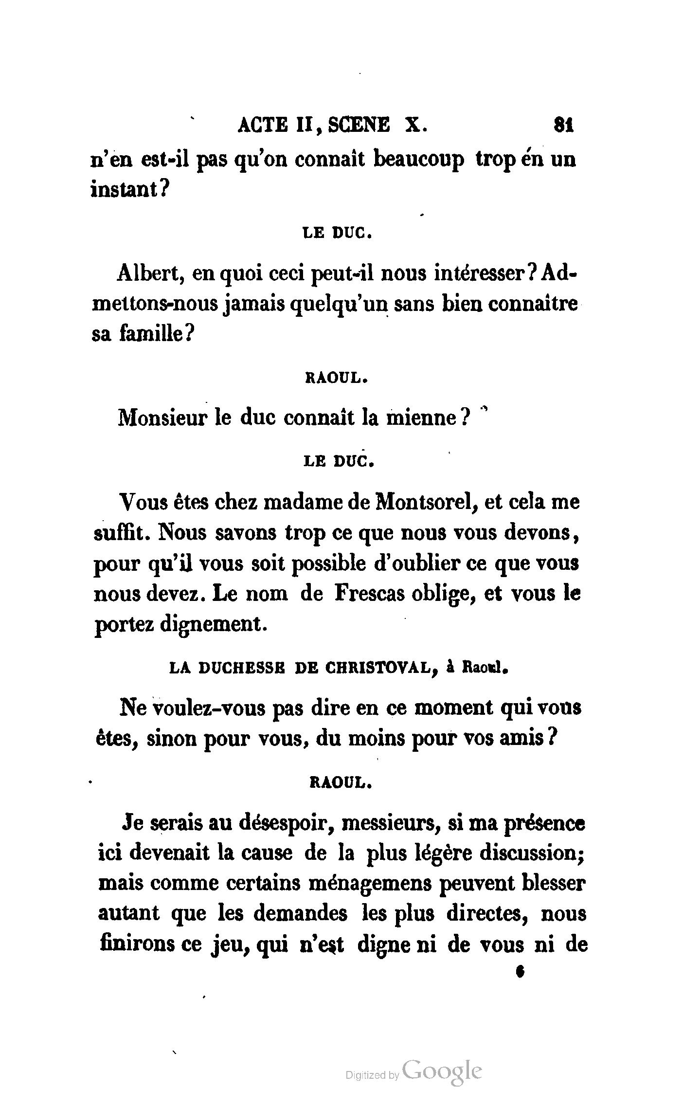 Que vous disais-je ? (À Raoul). Souvenez-vous, Monsieur le marquis, que je vous ai d’avance absous de toute ingratitude. (À la duchesse.) L’enfant m’oubliera, et la mère ?