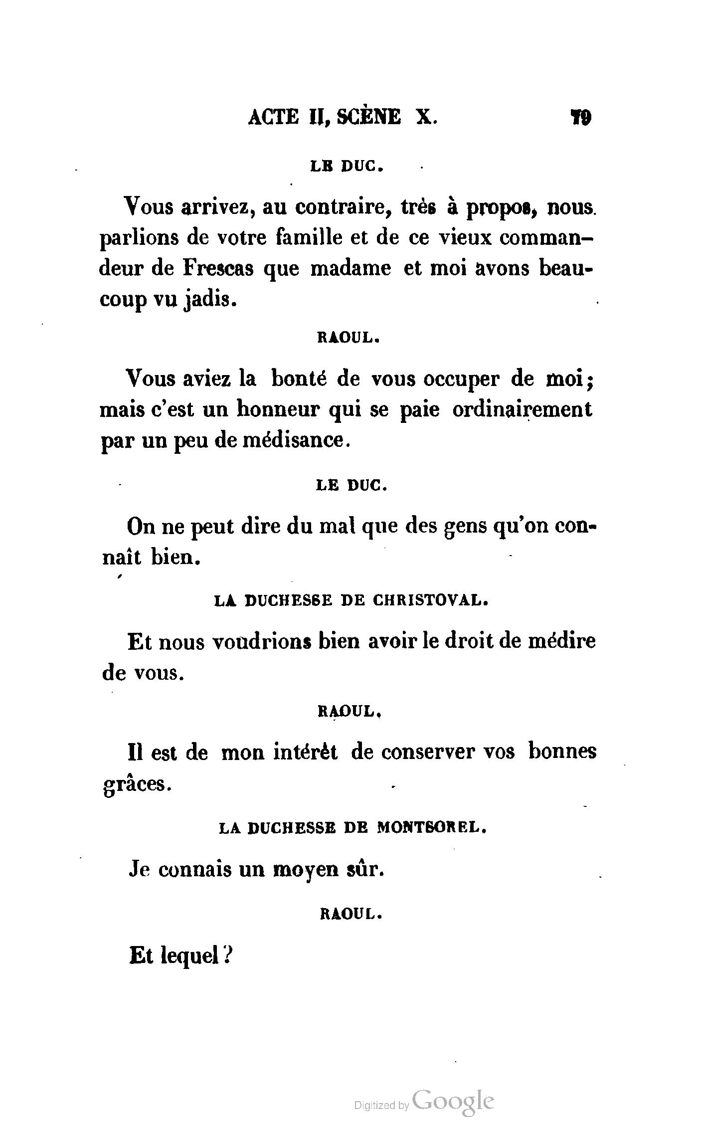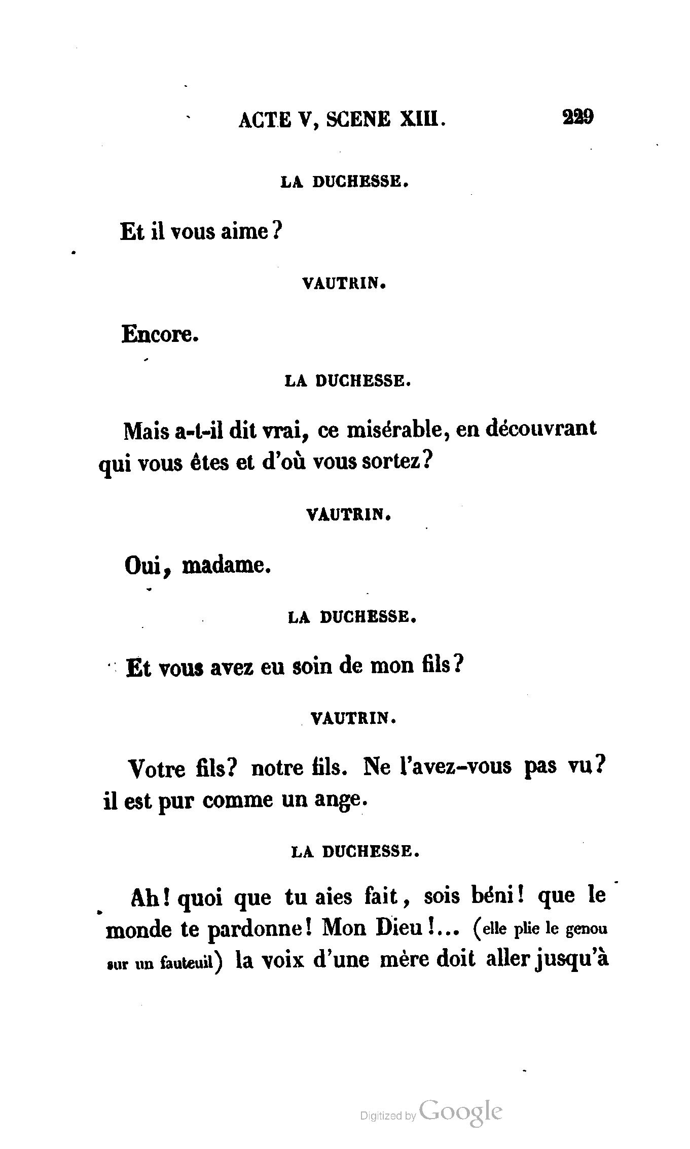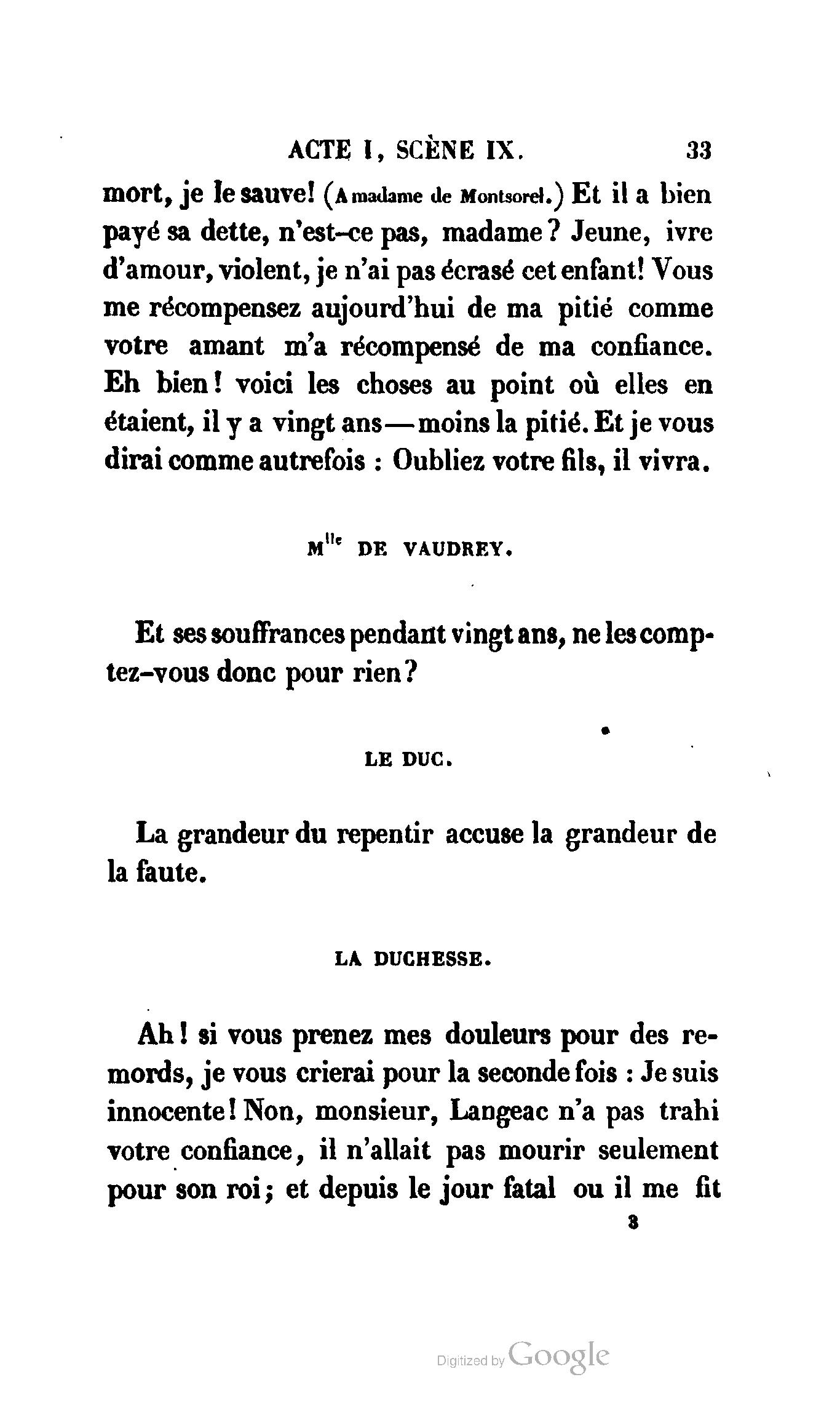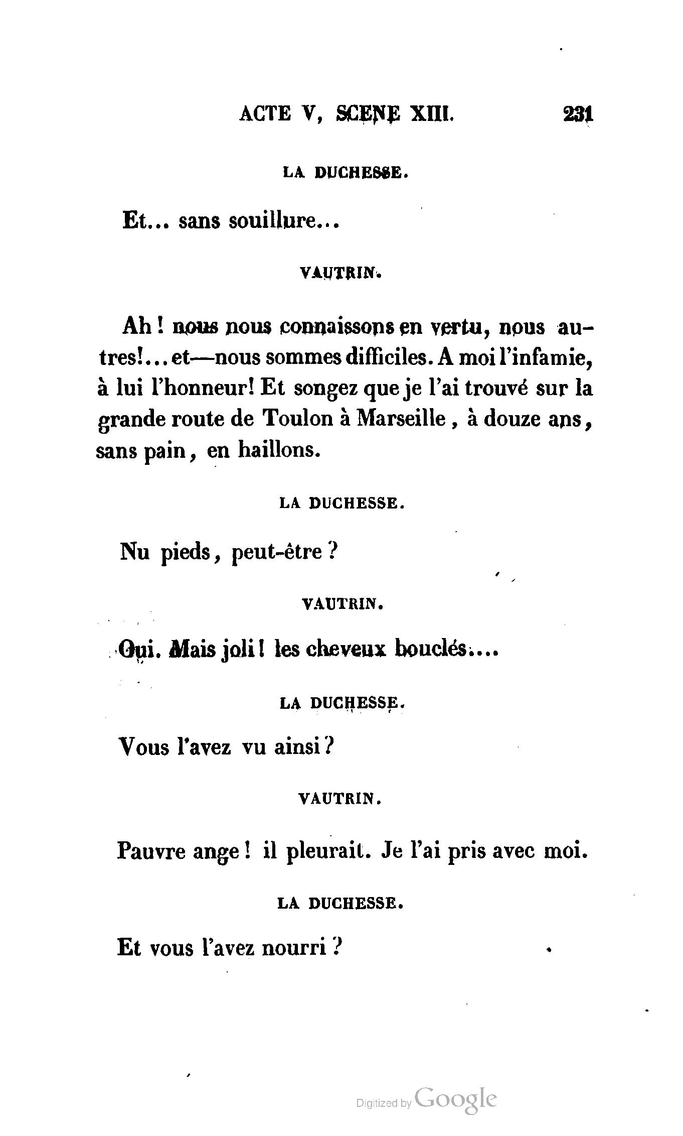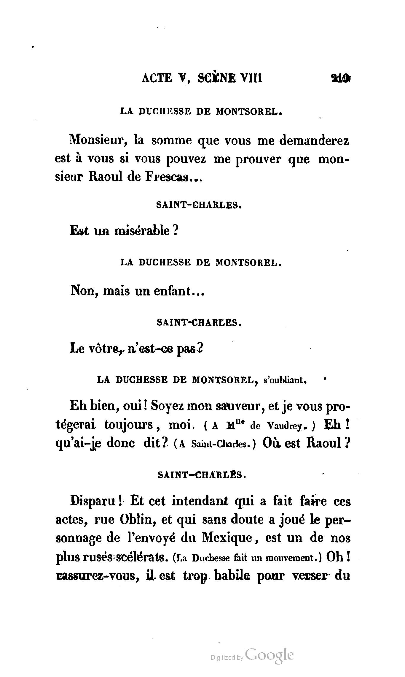 Que vous disais-je ? (À Raoul). Souvenez-vous, Monsieur le marquis, que je vous ai d’avance absous de toute ingratitude. (À la duchesse.) L’enfant m’oubliera, et la mère ?