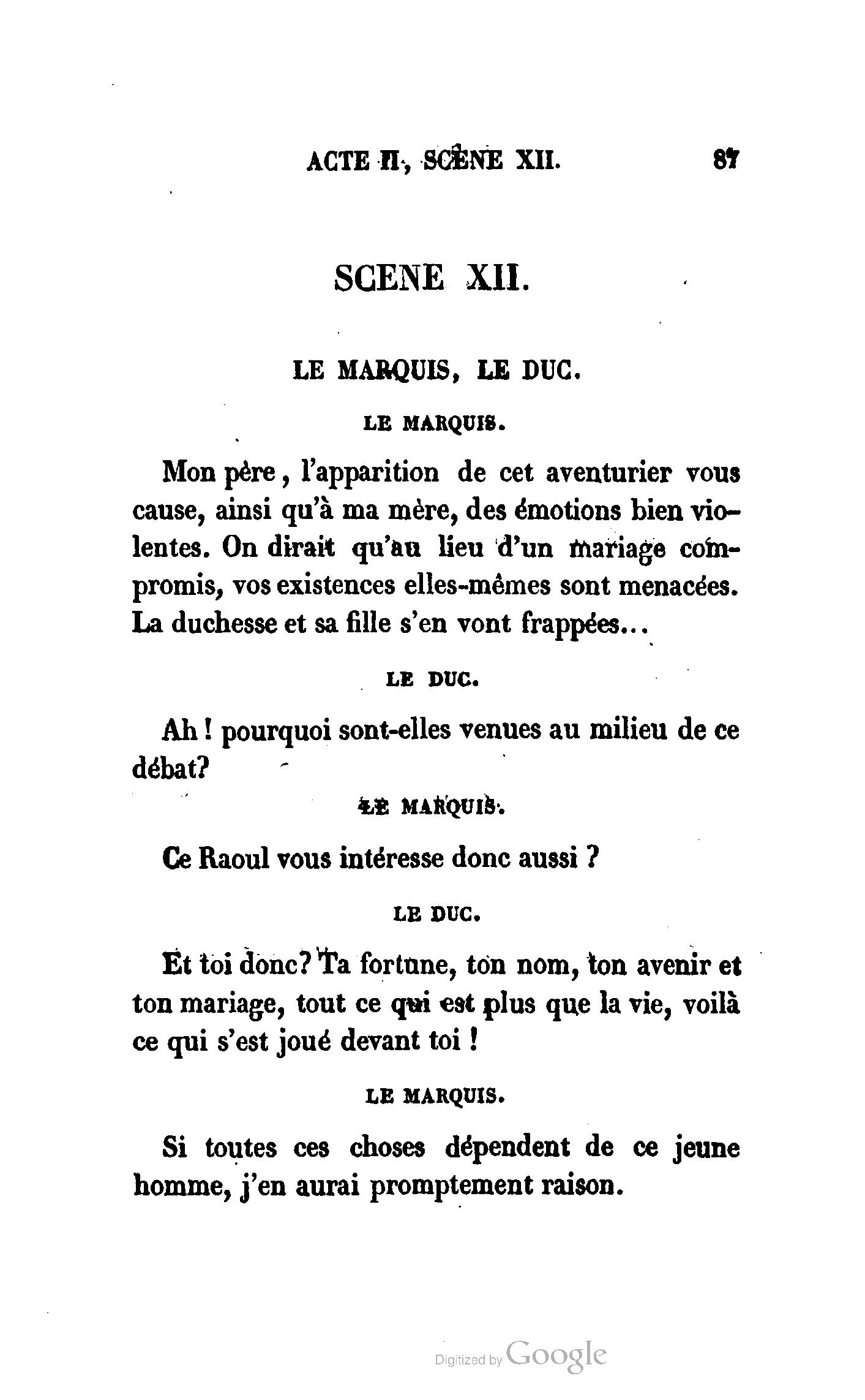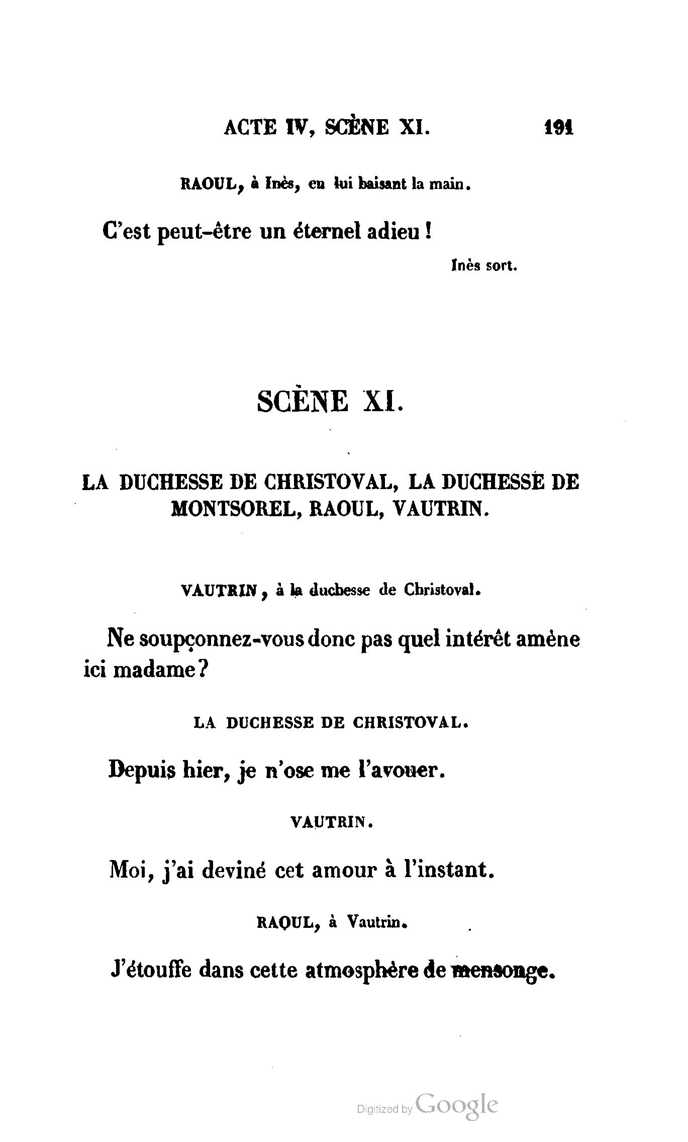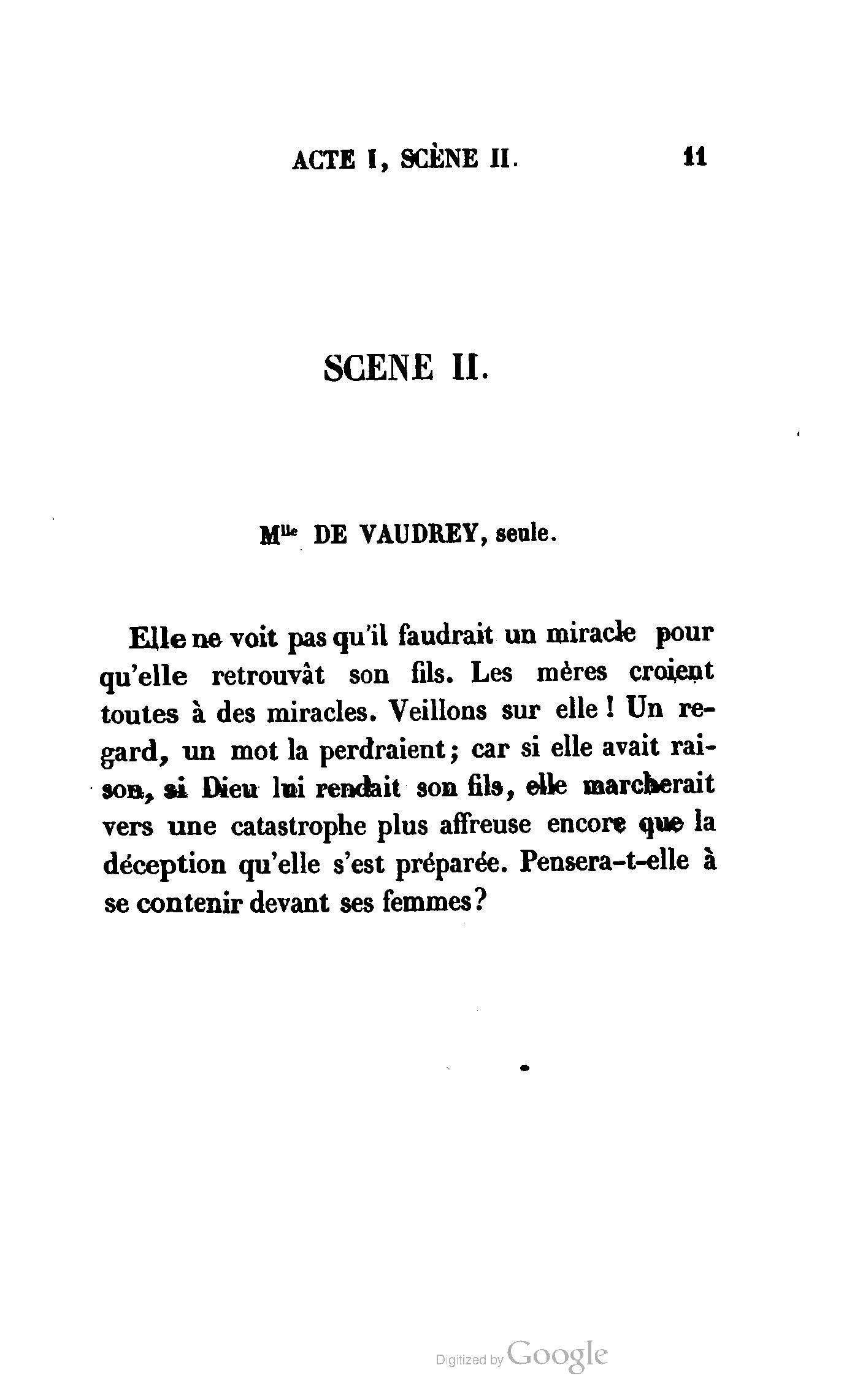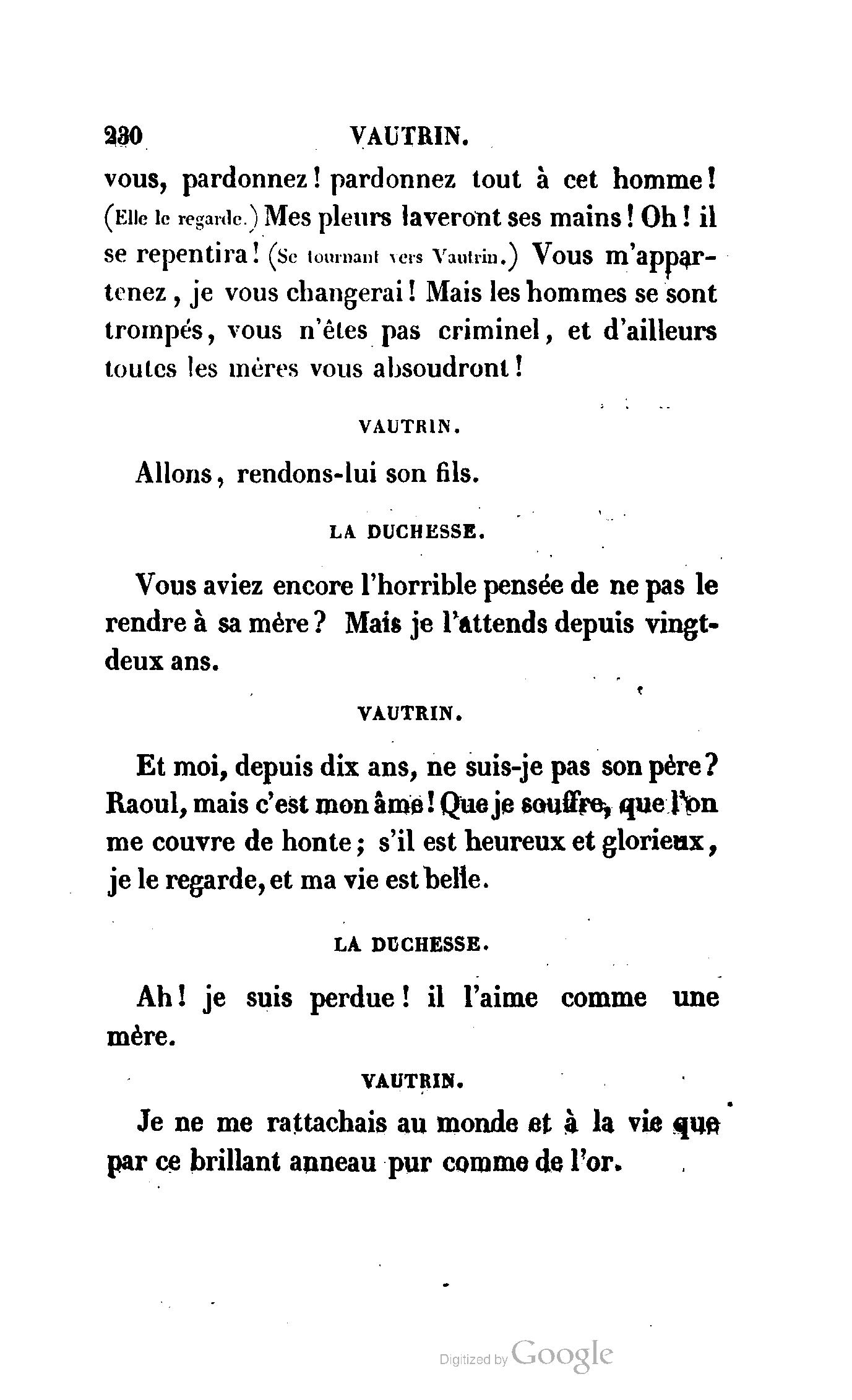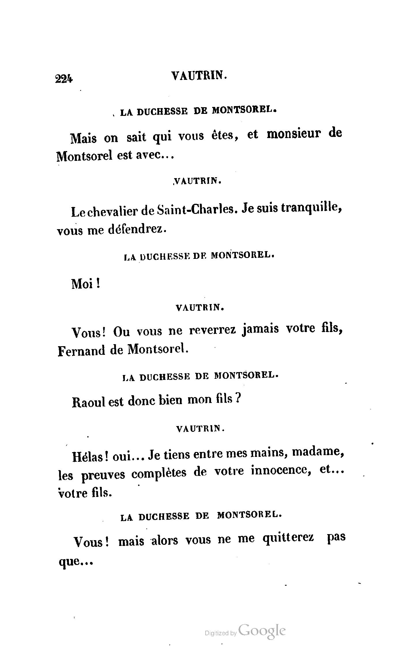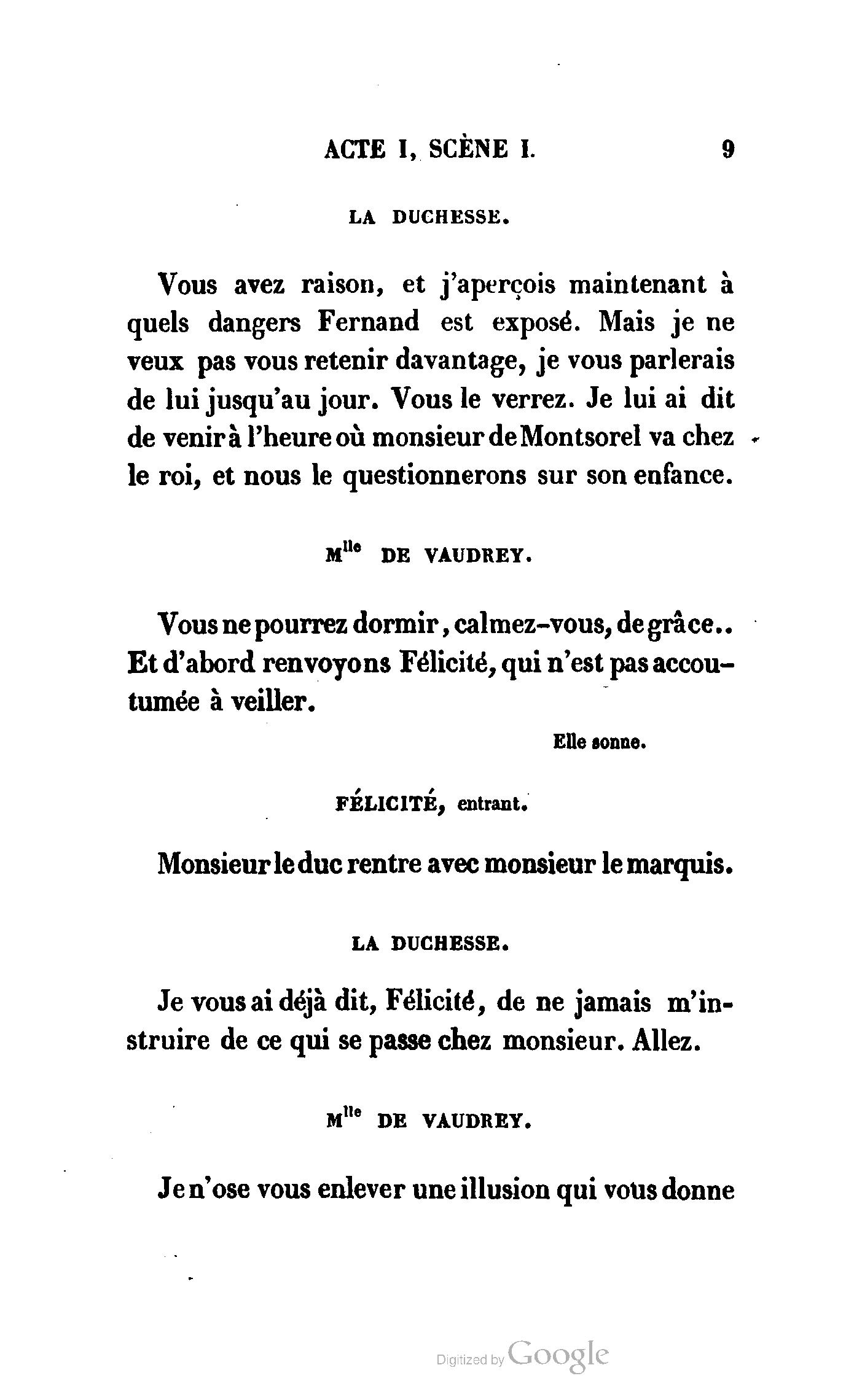 Que vous disais-je ? (À Raoul). Souvenez-vous, Monsieur le marquis, que je vous ai d’avance absous de toute ingratitude. (À la duchesse.) L’enfant m’oubliera, et la mère ?