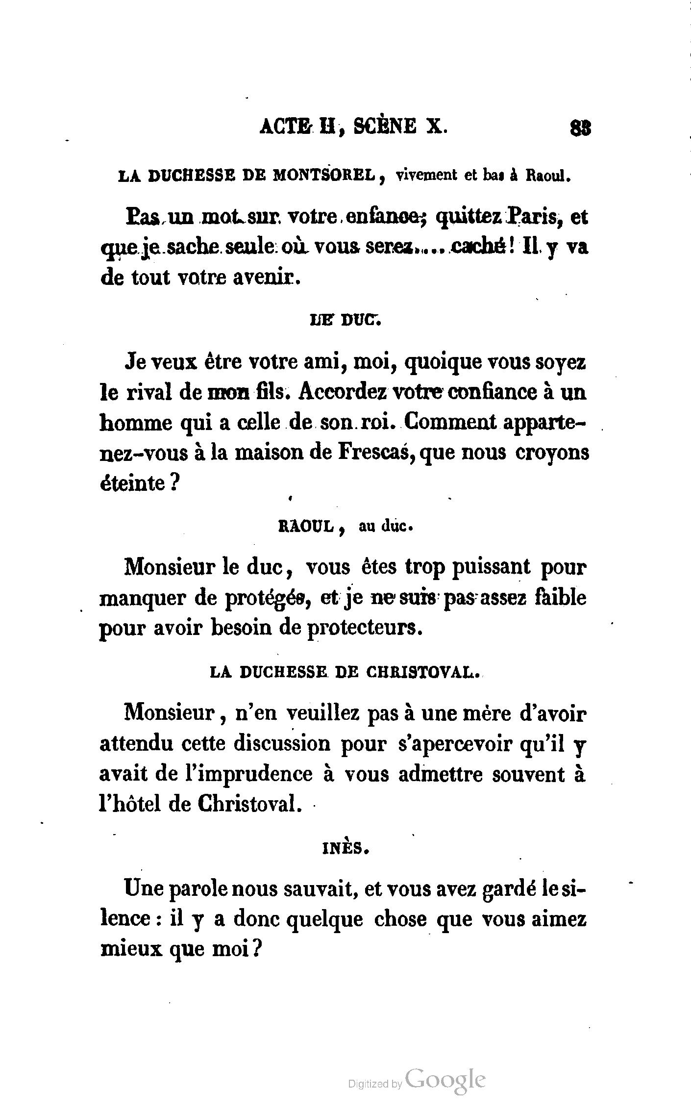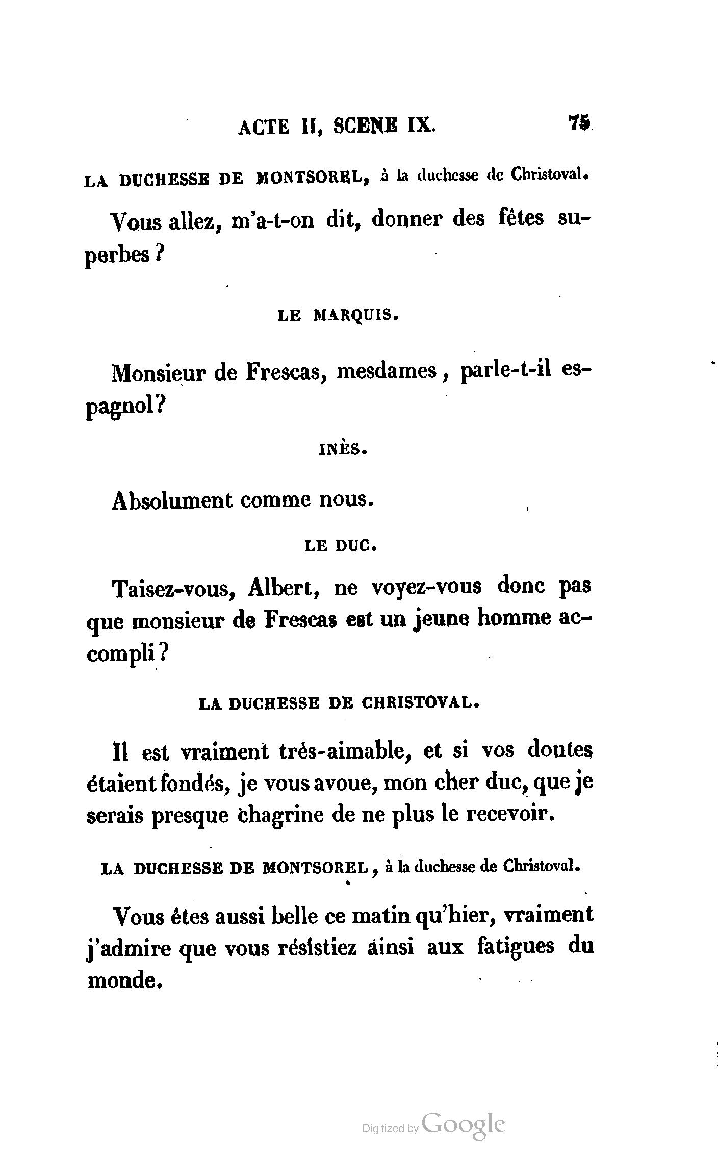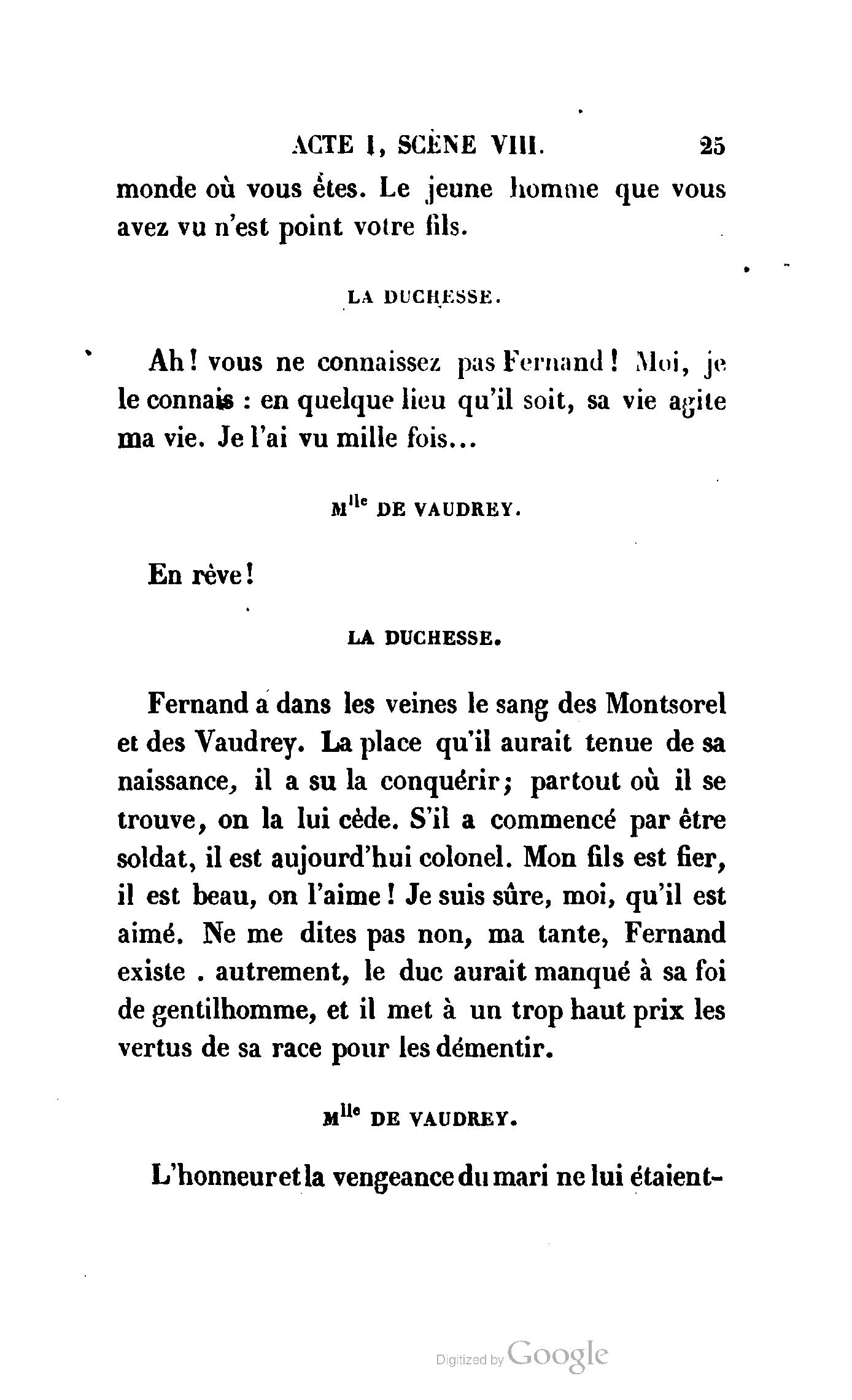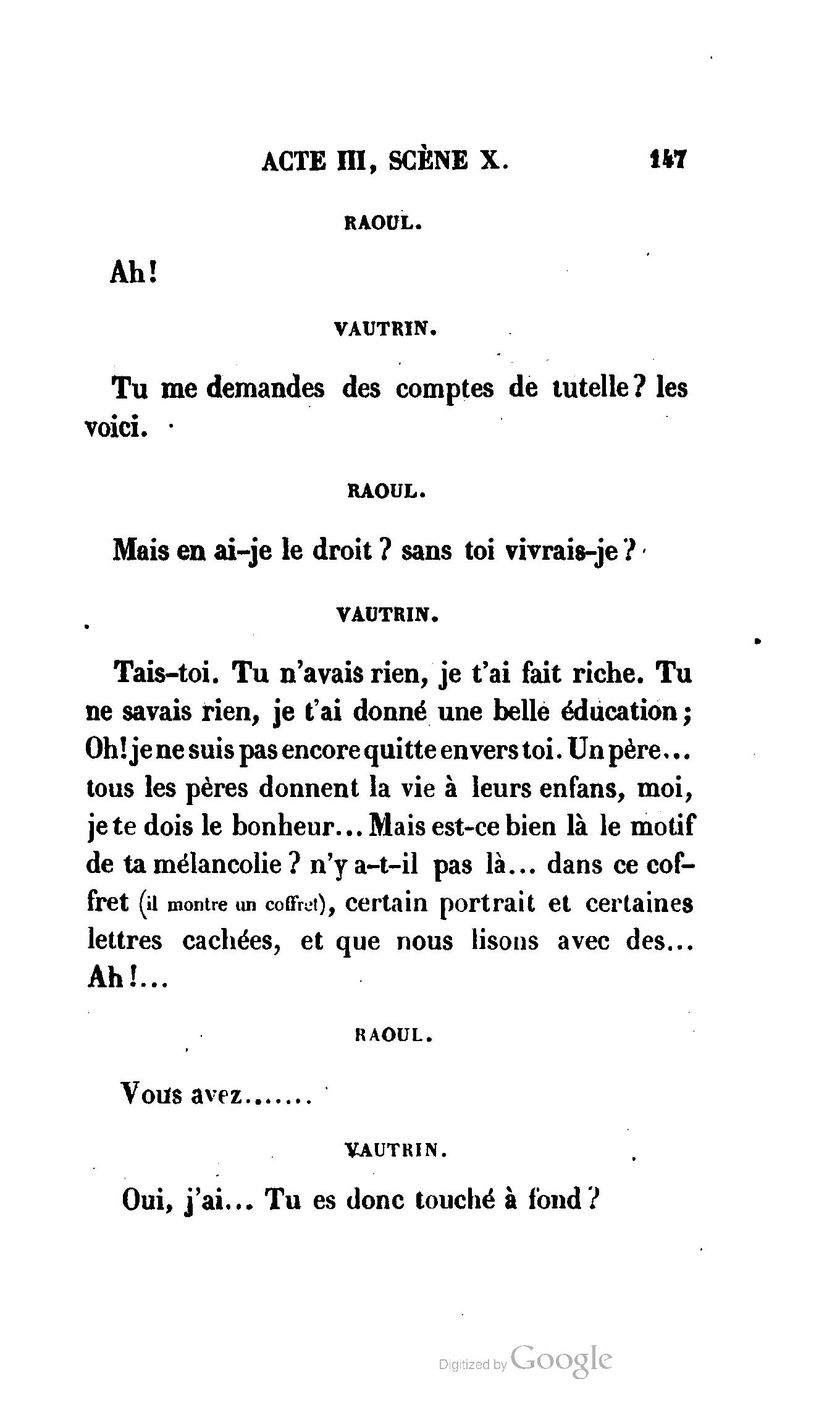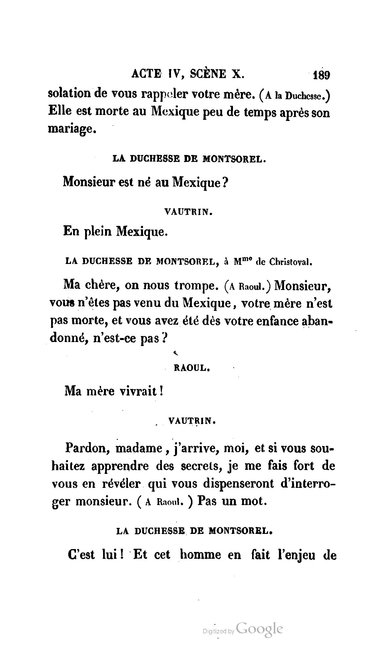 Que vous disais-je ? (À Raoul). Souvenez-vous, Monsieur le marquis, que je vous ai d’avance absous de toute ingratitude. (À la duchesse.) L’enfant m’oubliera, et la mère ?