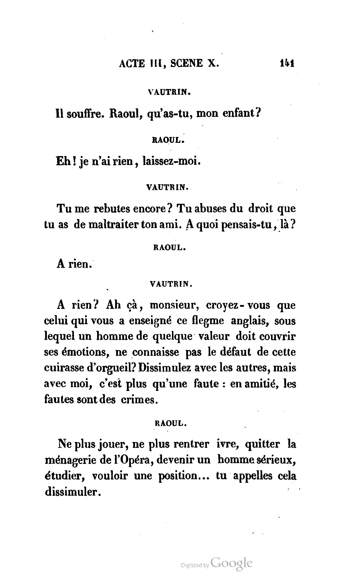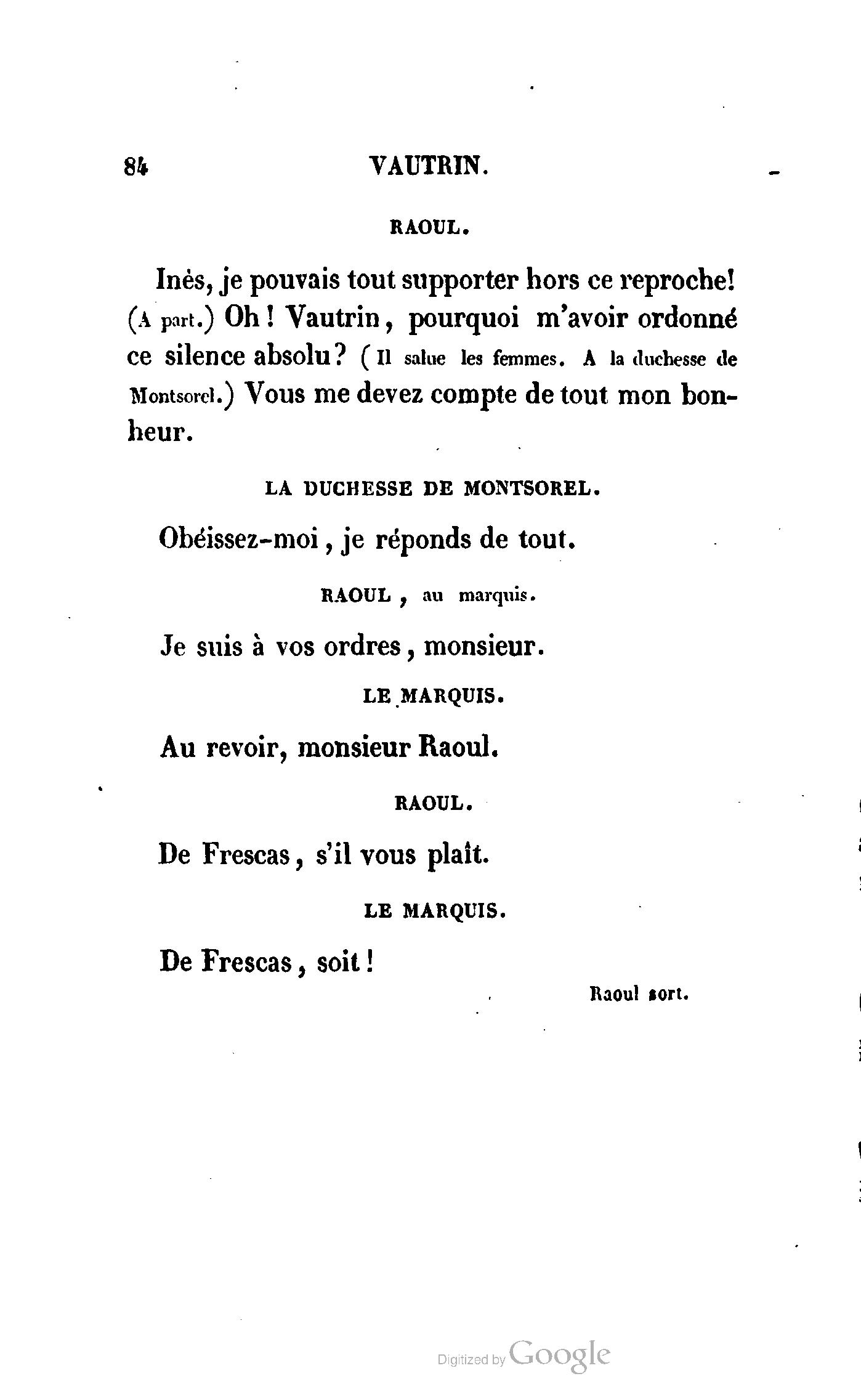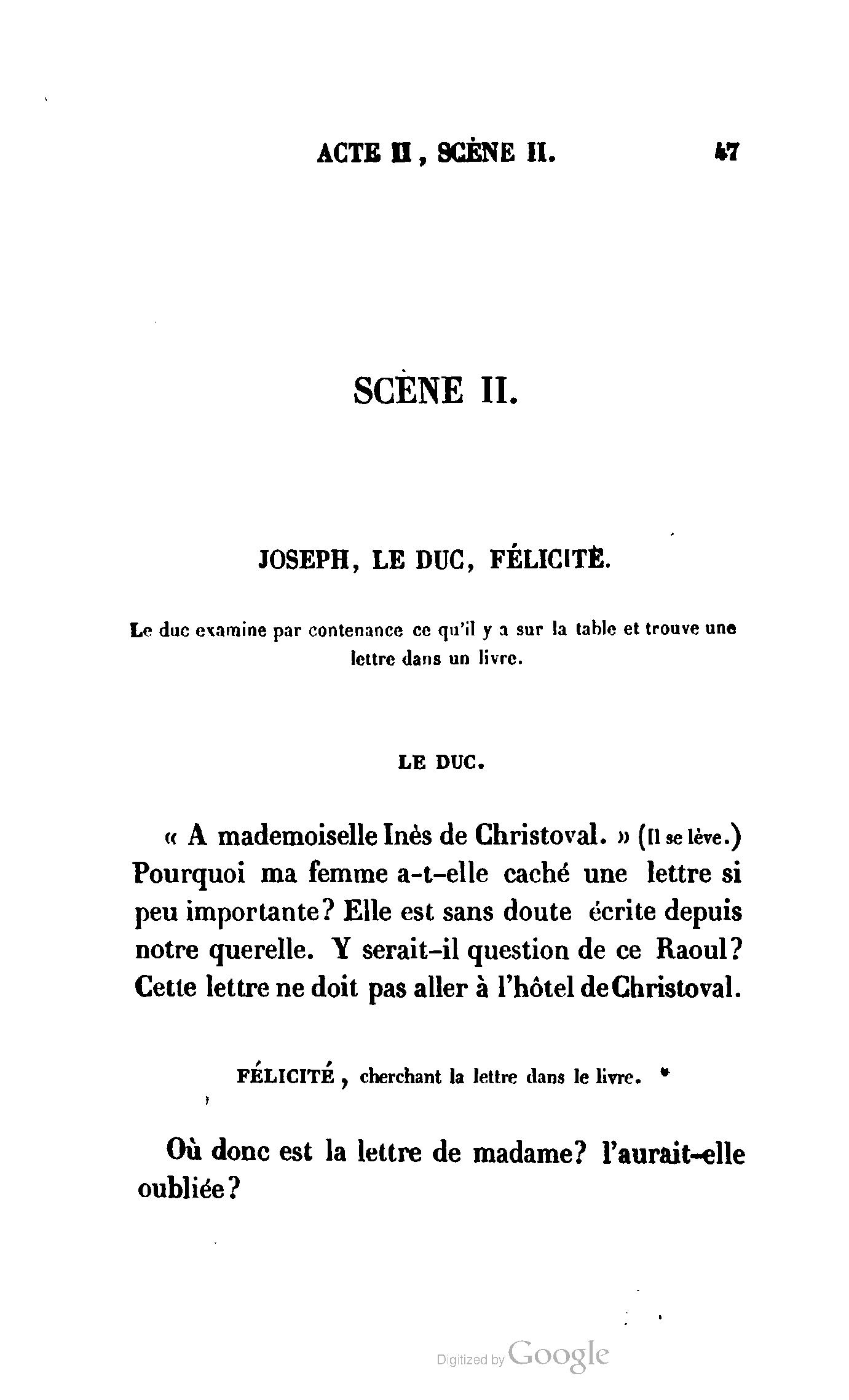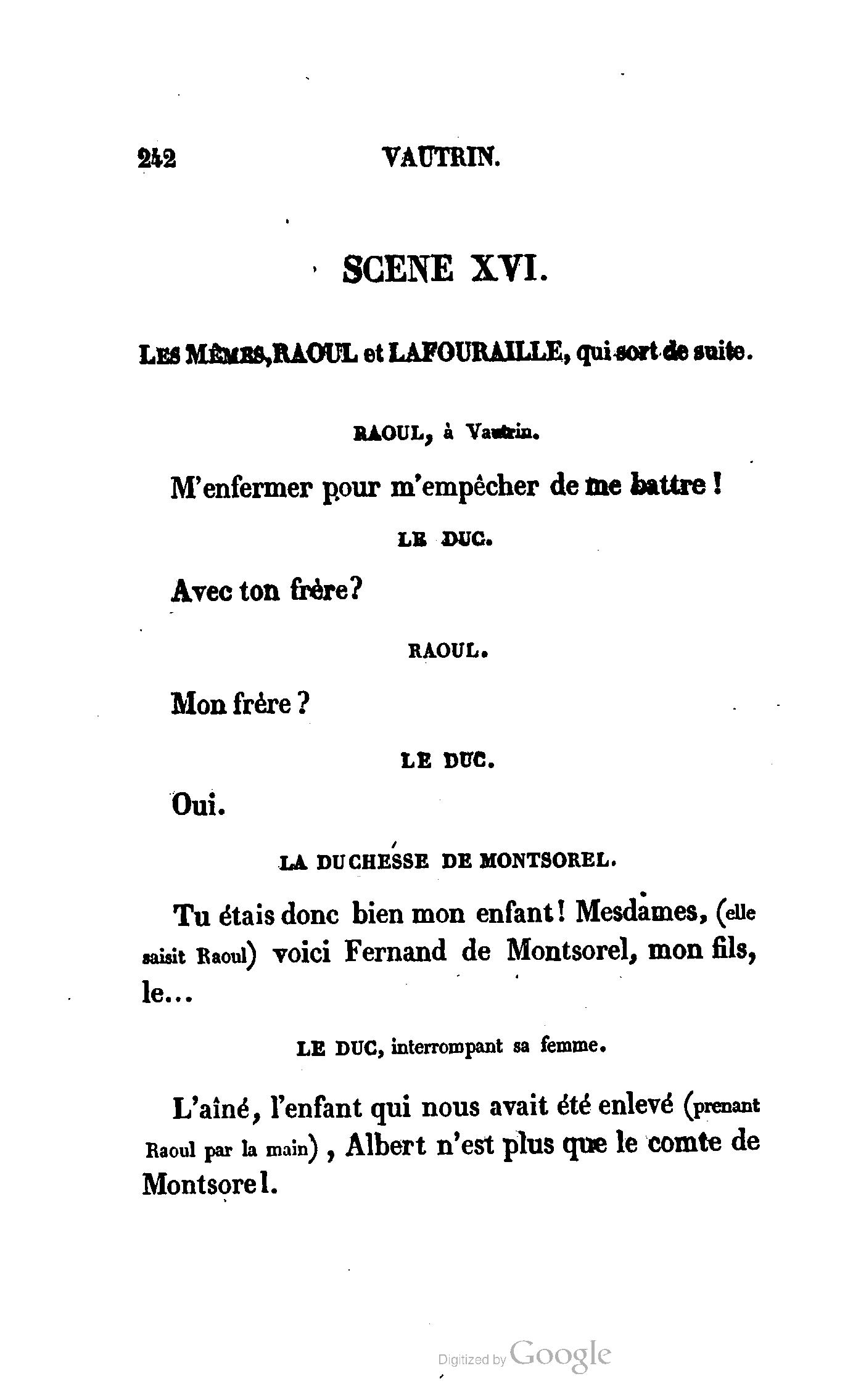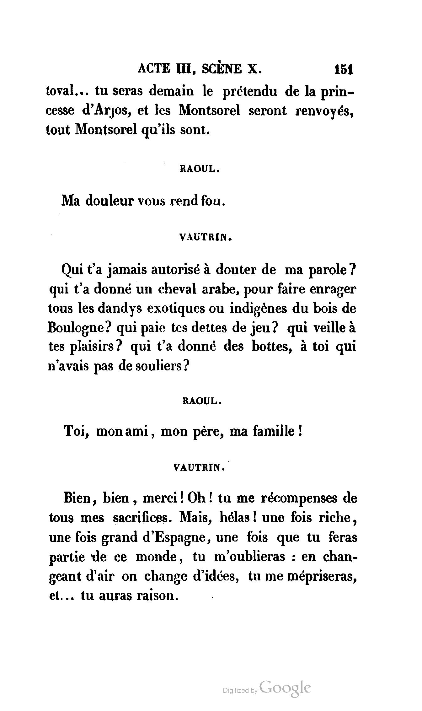 Que vous disais-je ? (À Raoul). Souvenez-vous, Monsieur le marquis, que je vous ai d’avance absous de toute ingratitude. (À la duchesse.) L’enfant m’oubliera, et la mère ?