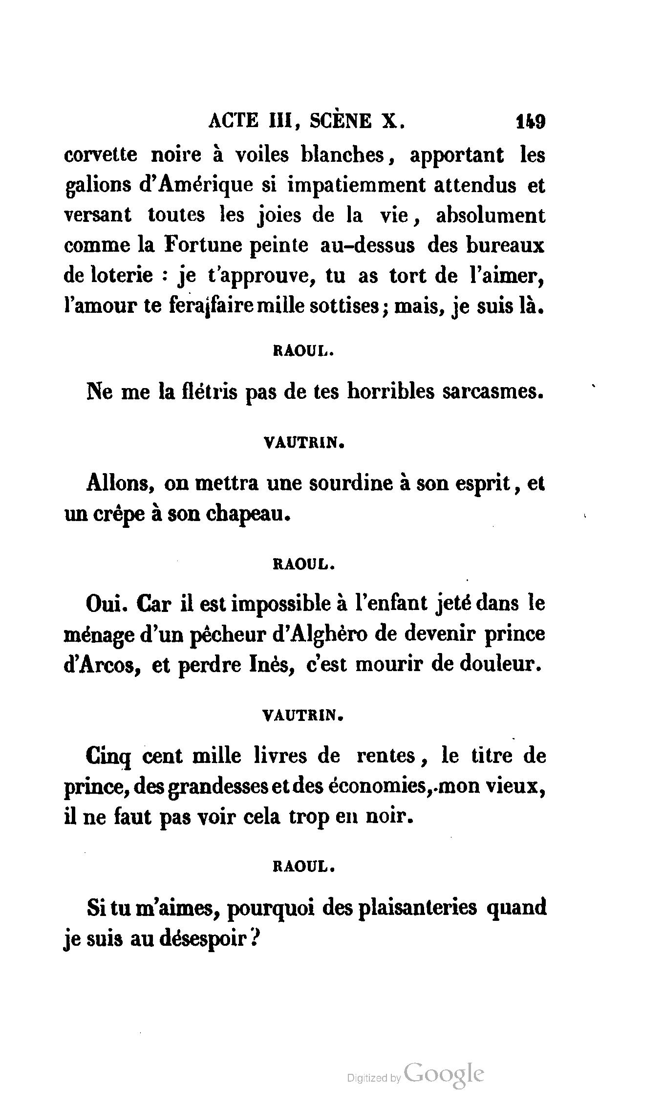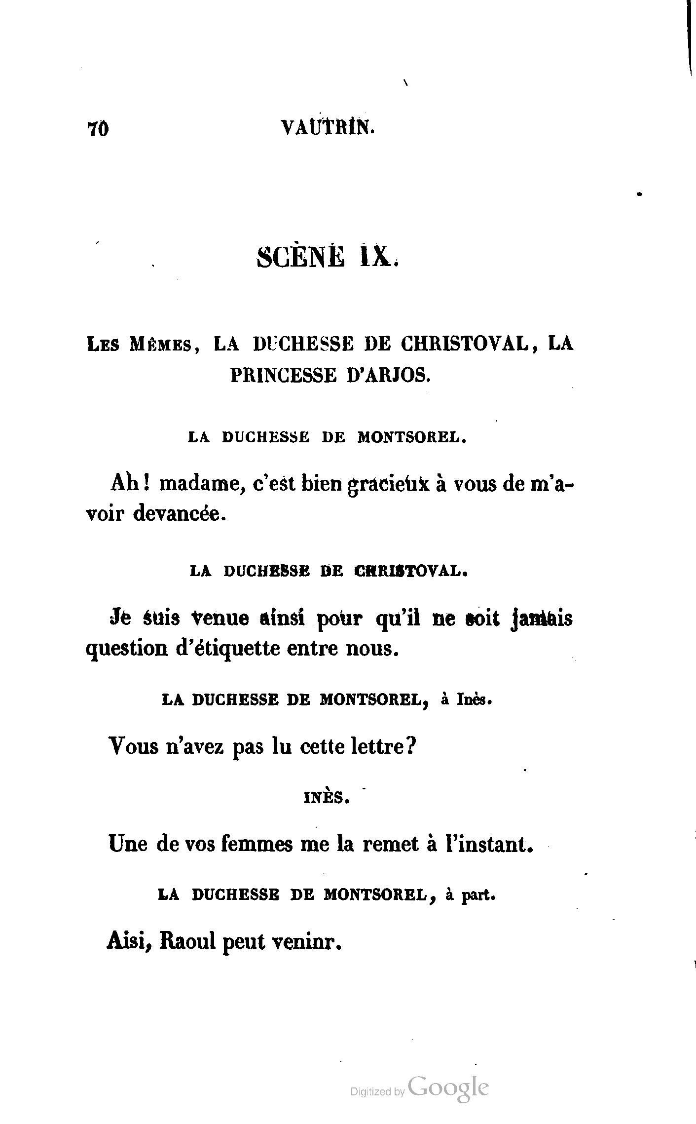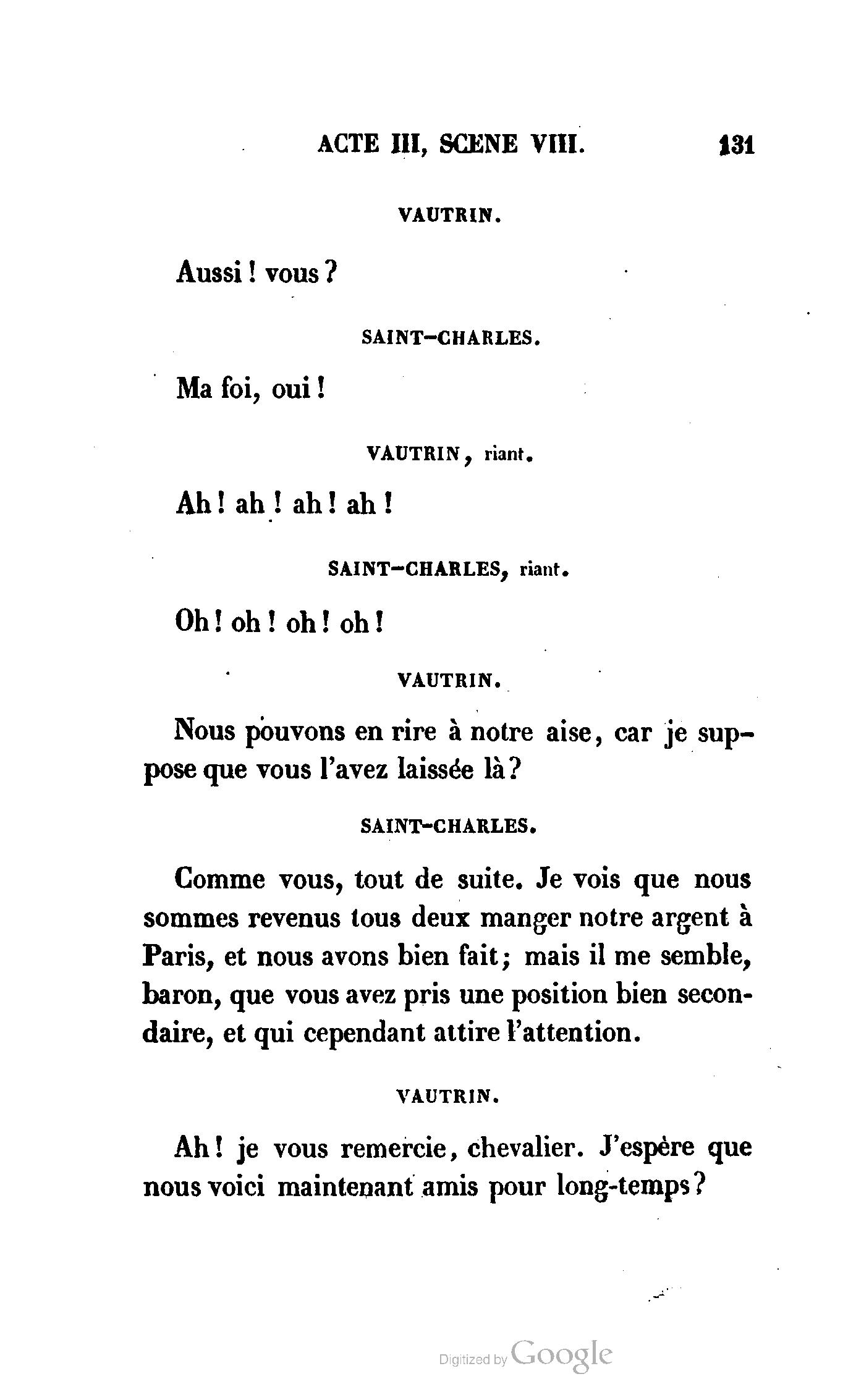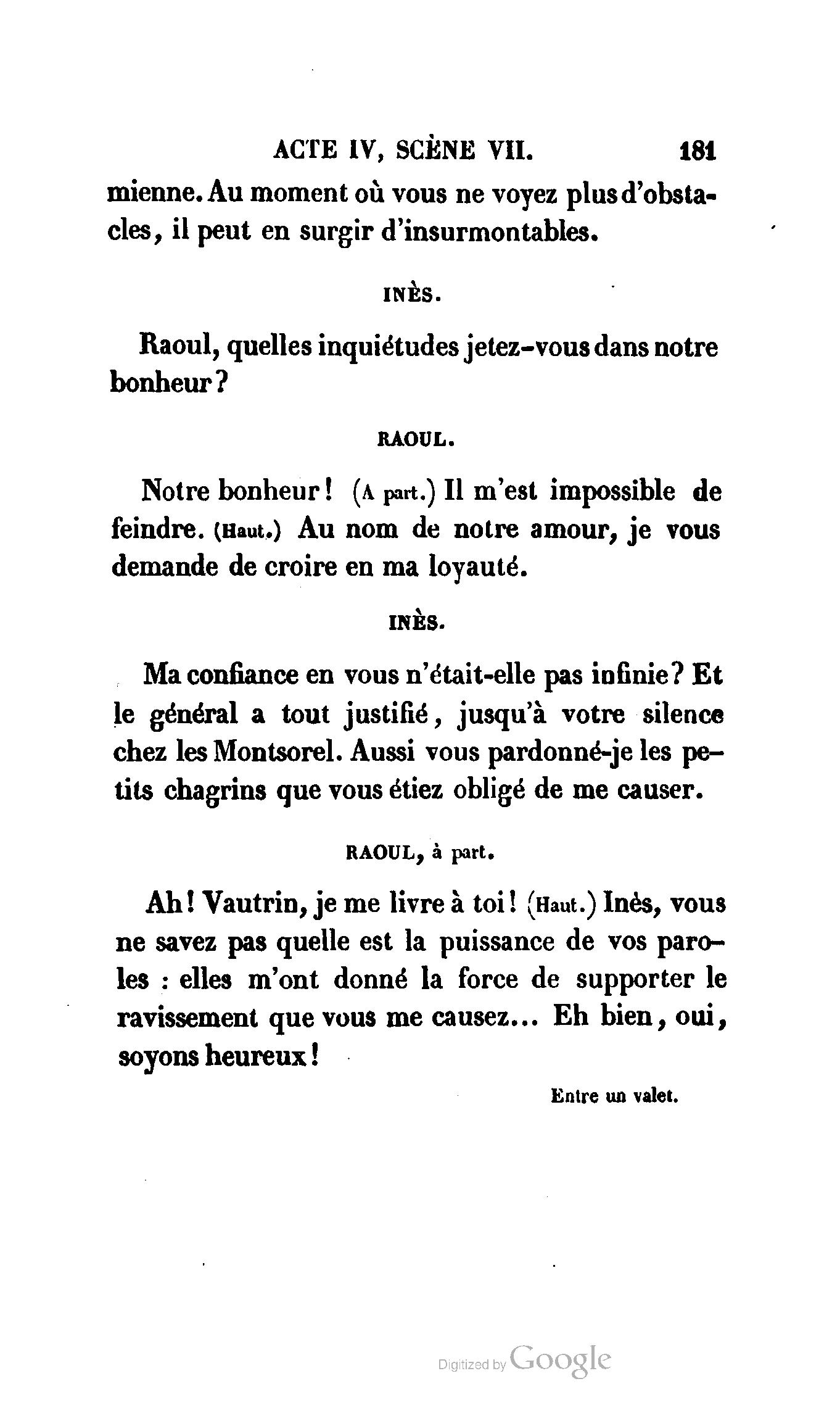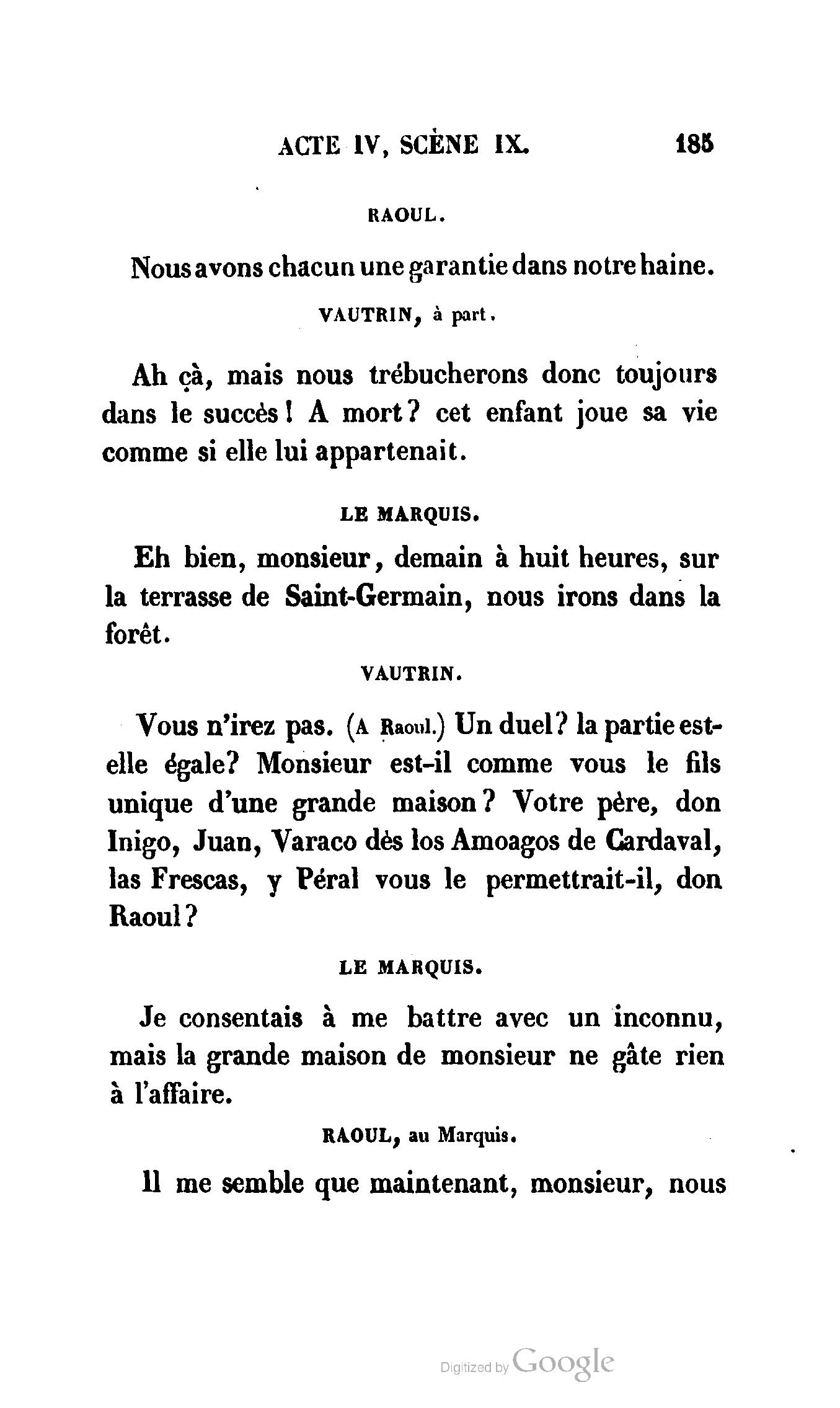 Que vous disais-je ? (À Raoul). Souvenez-vous, Monsieur le marquis, que je vous ai d’avance absous de toute ingratitude. (À la duchesse.) L’enfant m’oubliera, et la mère ?