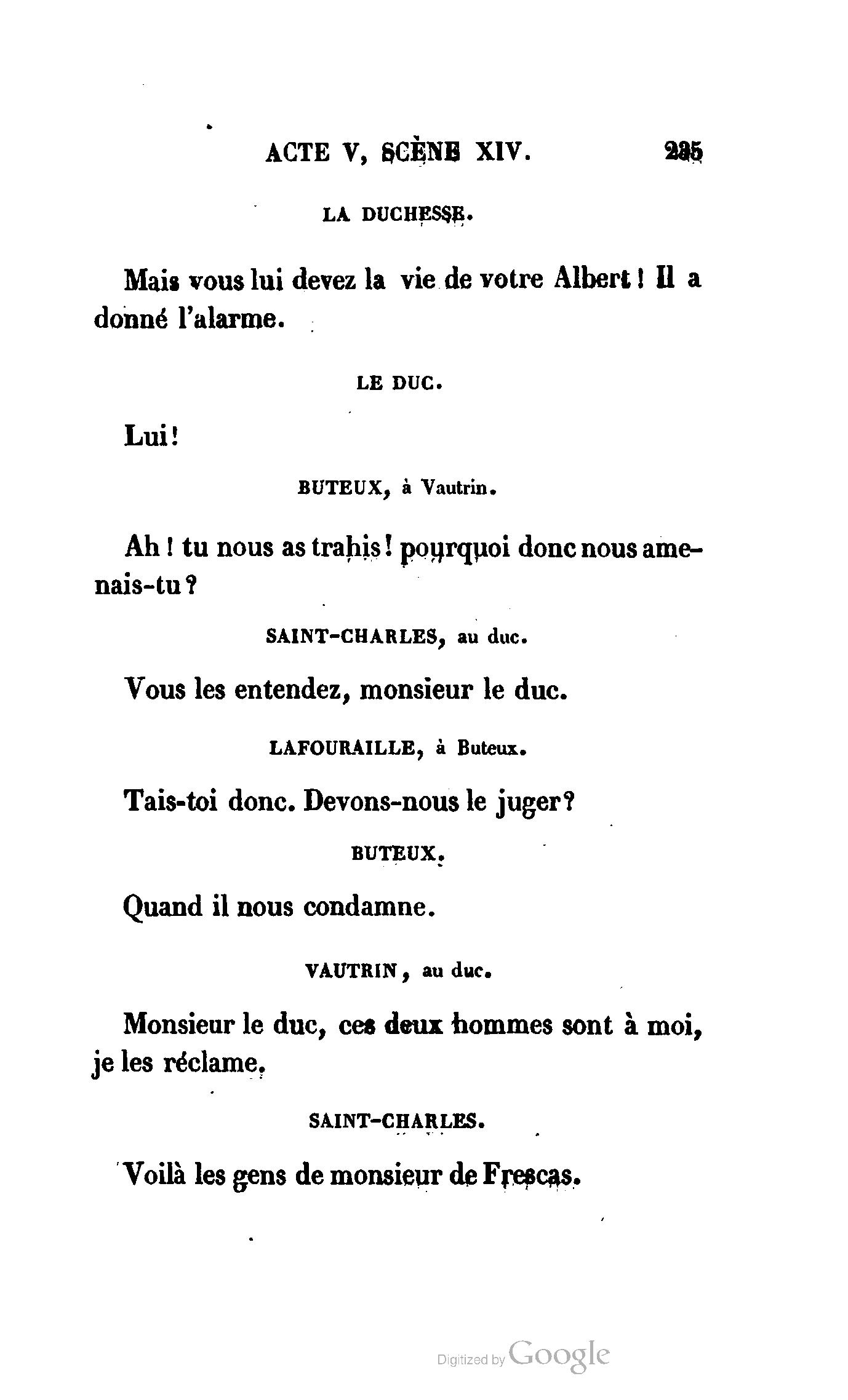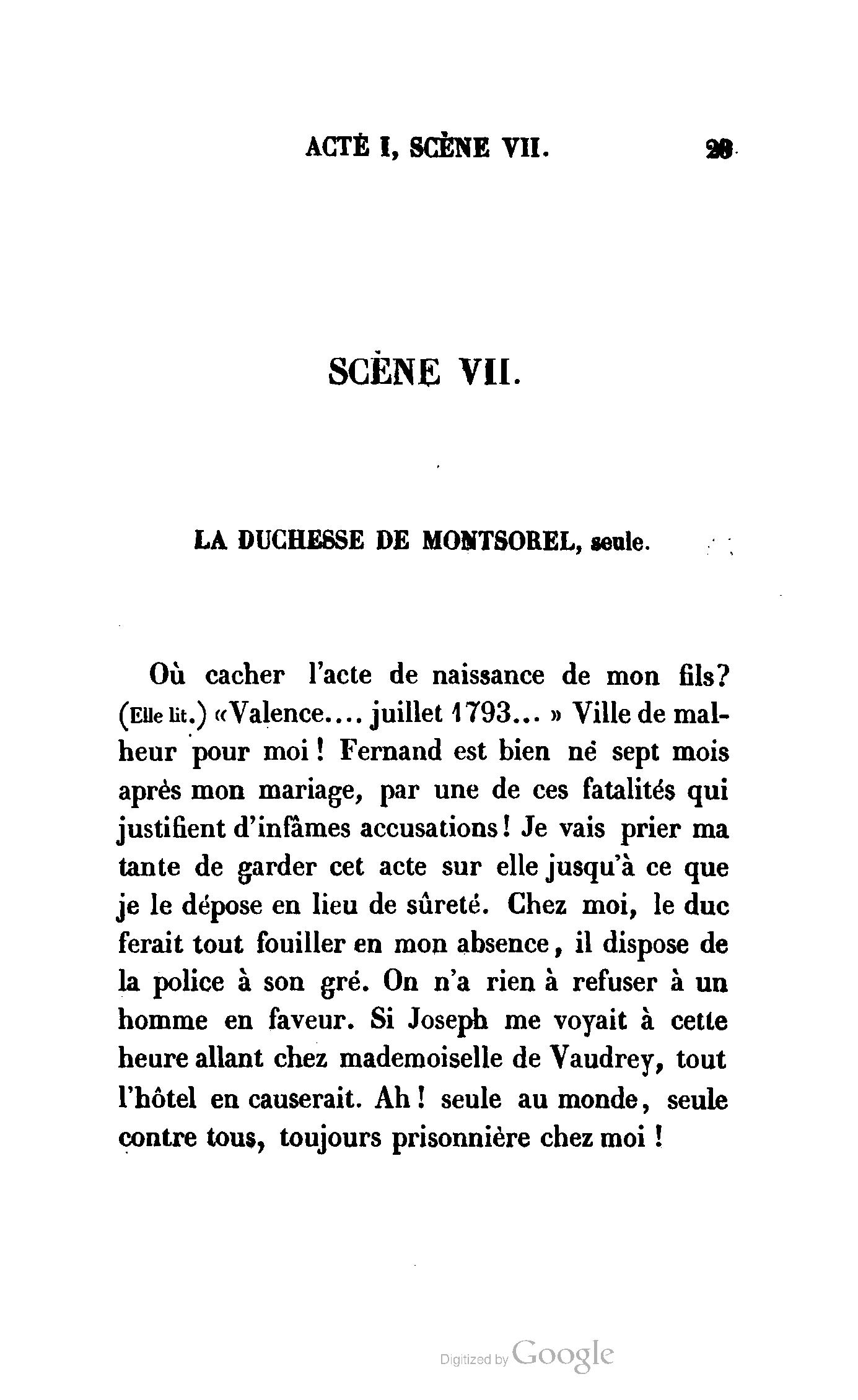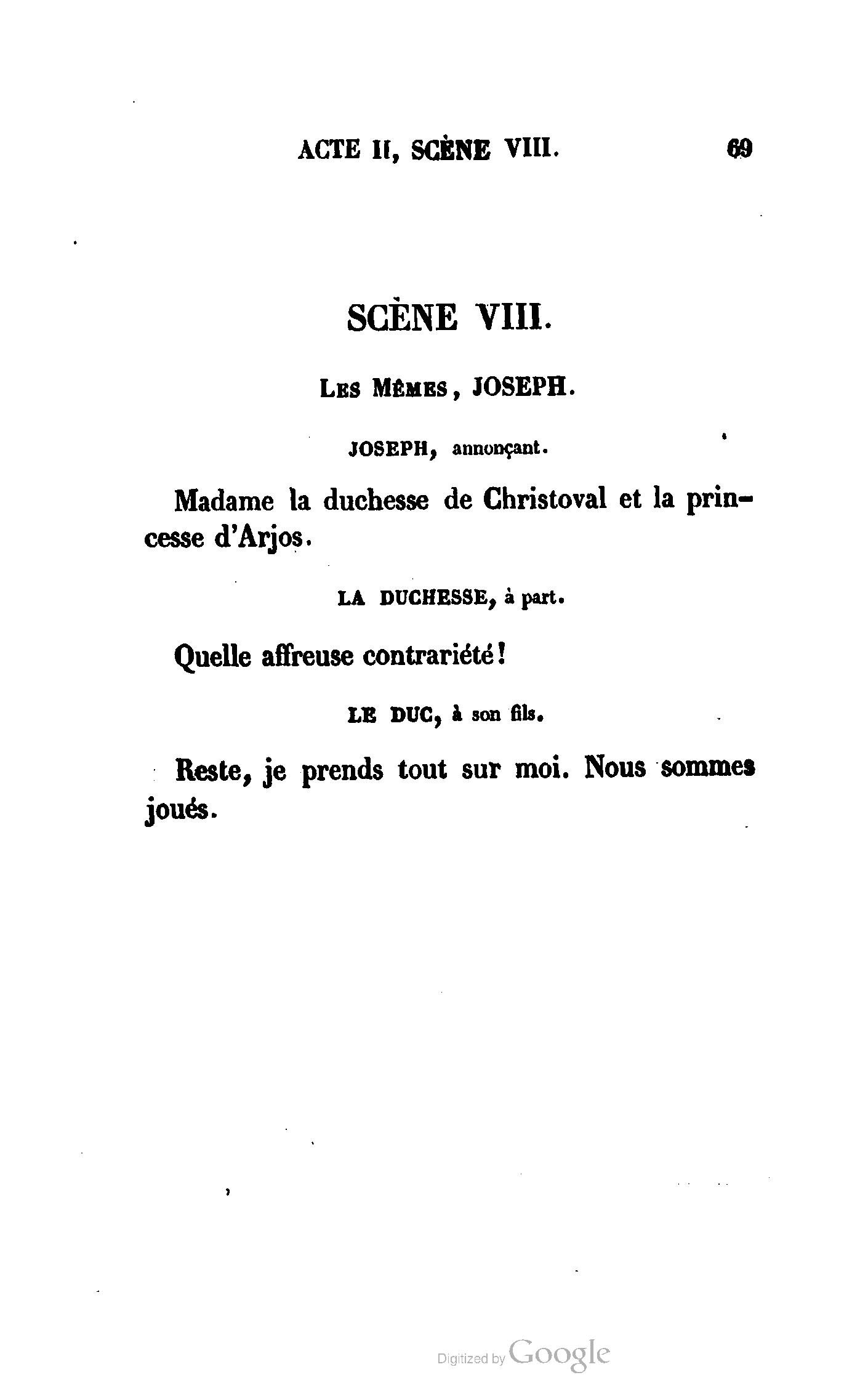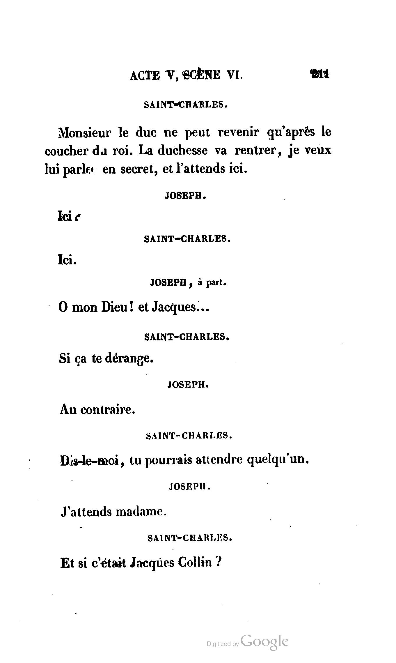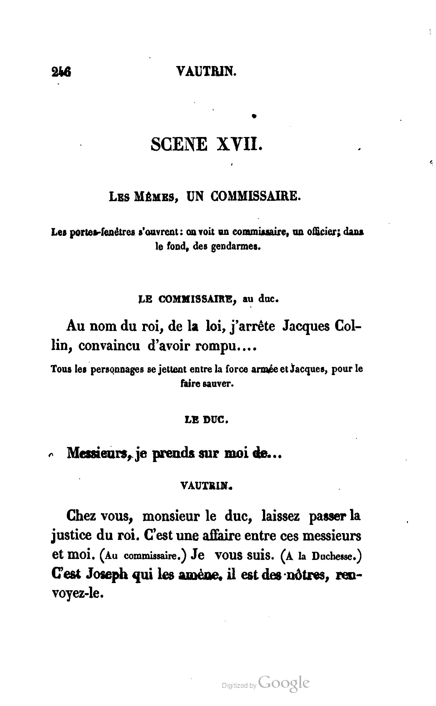Chez vous, Monsieur le duc, laissez passer la justice du roi. C’est une affaire entre ces Messieurs et moi. (Au commissaire.) Je vous suis. (À la duchesse.) C’est Joseph qui les amène ; il est des nôtres ; renvoyez-le.