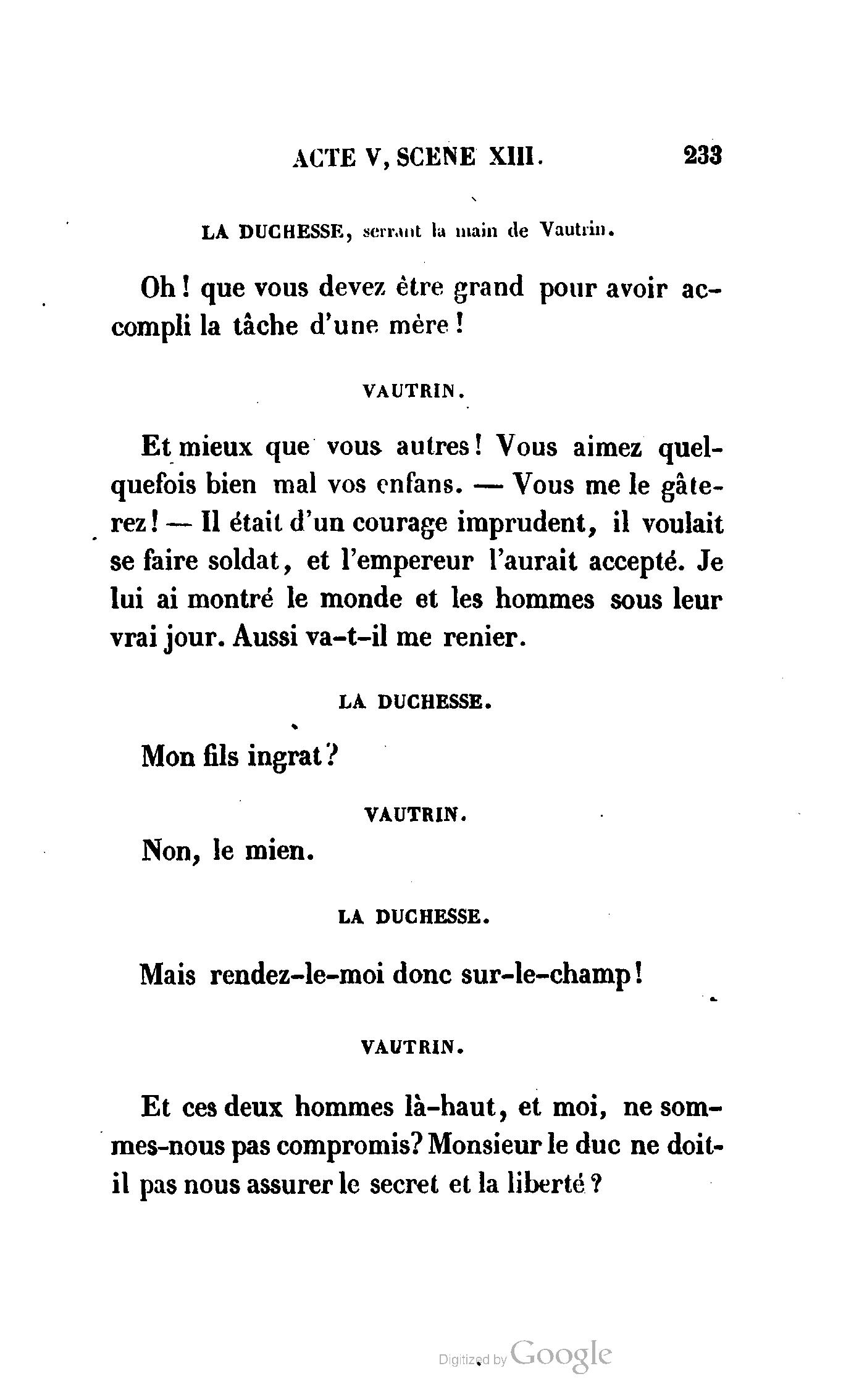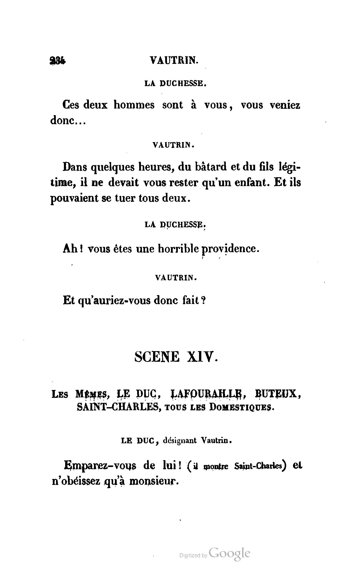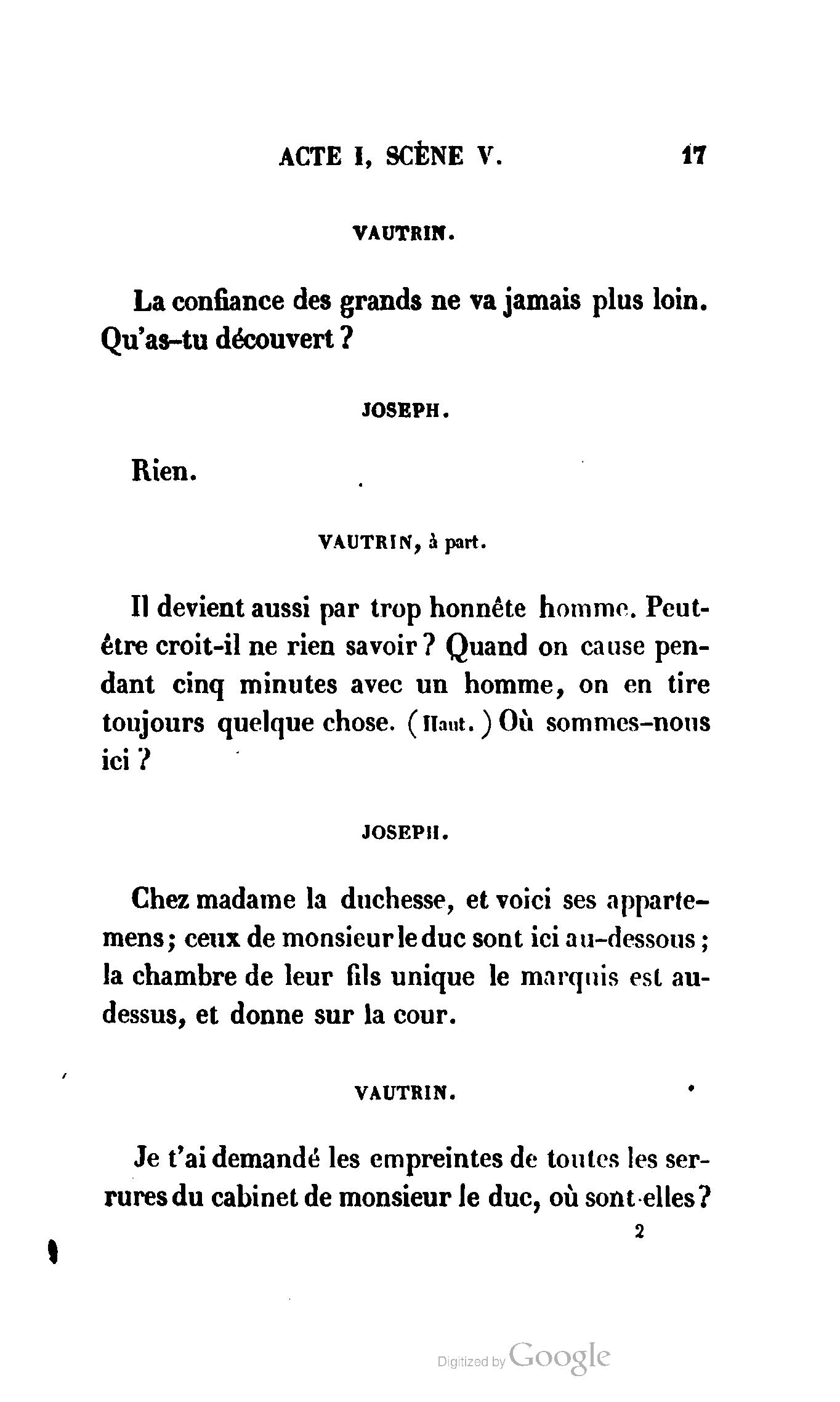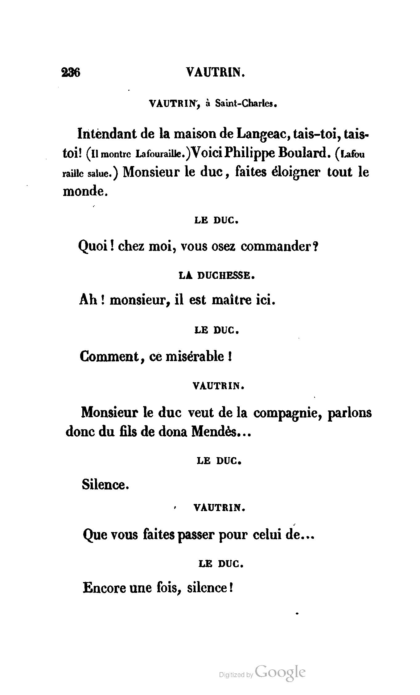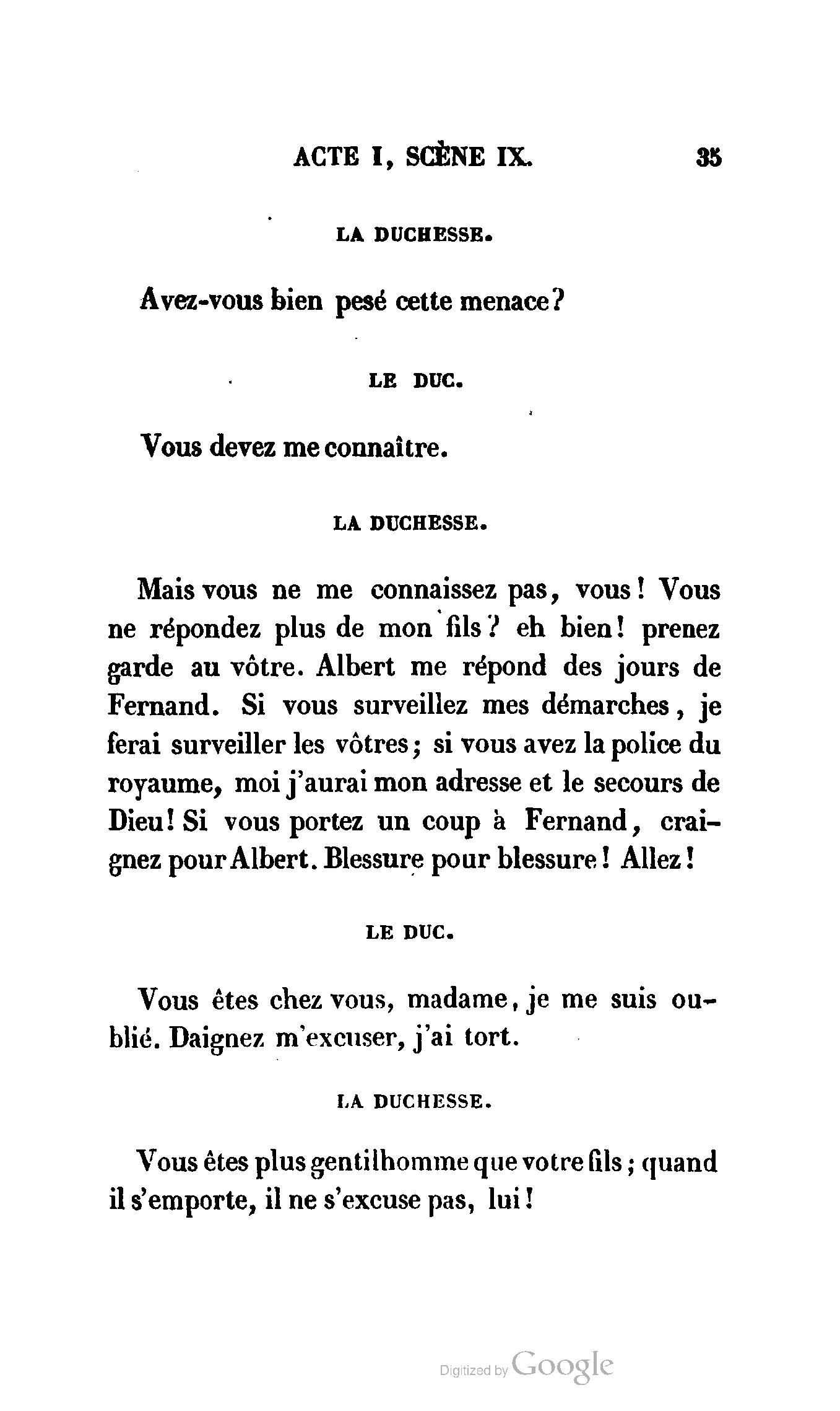 Chez vous, Monsieur le duc, laissez passer la justice du roi. C’est une affaire entre ces Messieurs et moi. (Au commissaire.) Je vous suis. (À la duchesse.) C’est Joseph qui les amène ; il est des nôtres ; renvoyez-le.