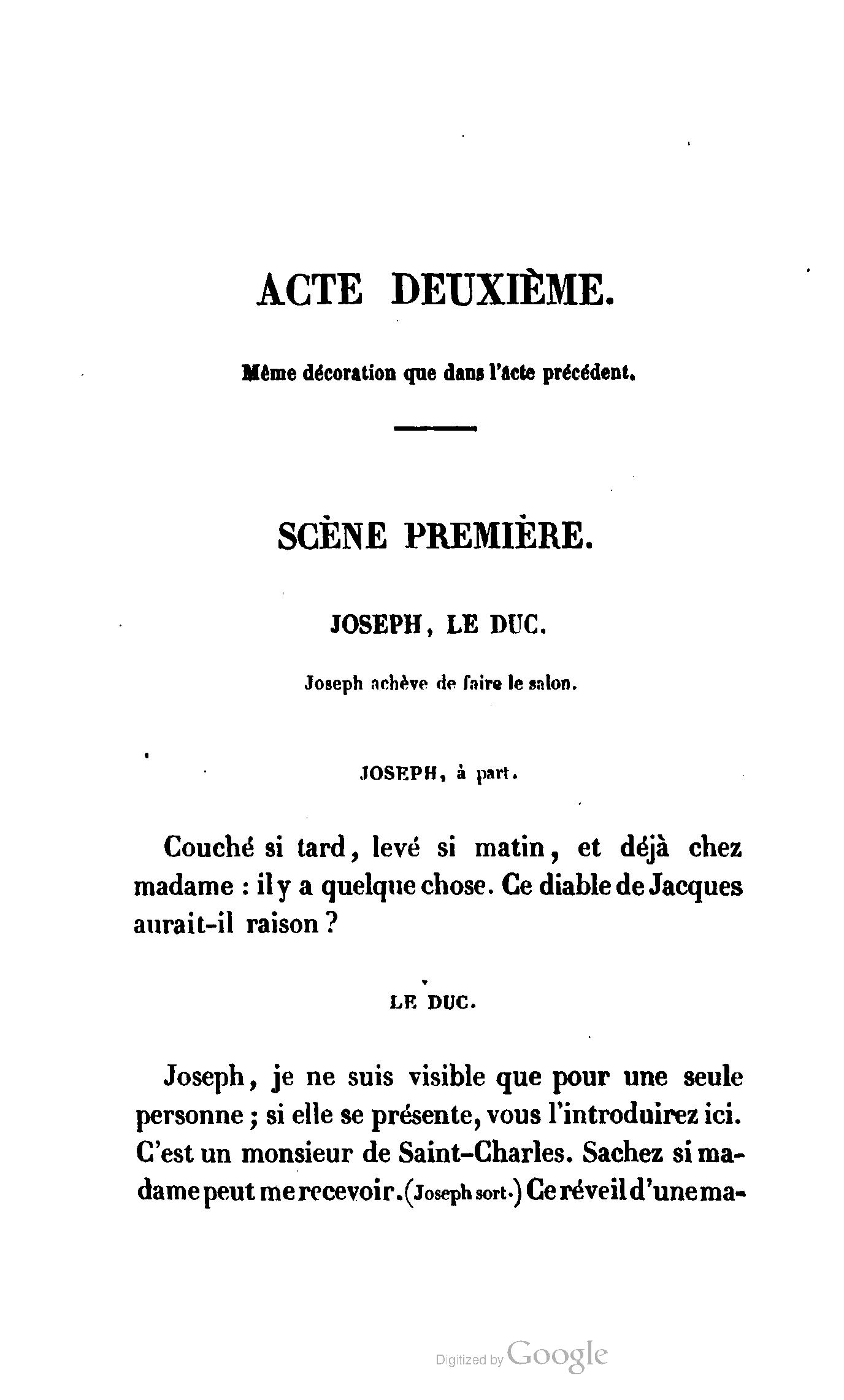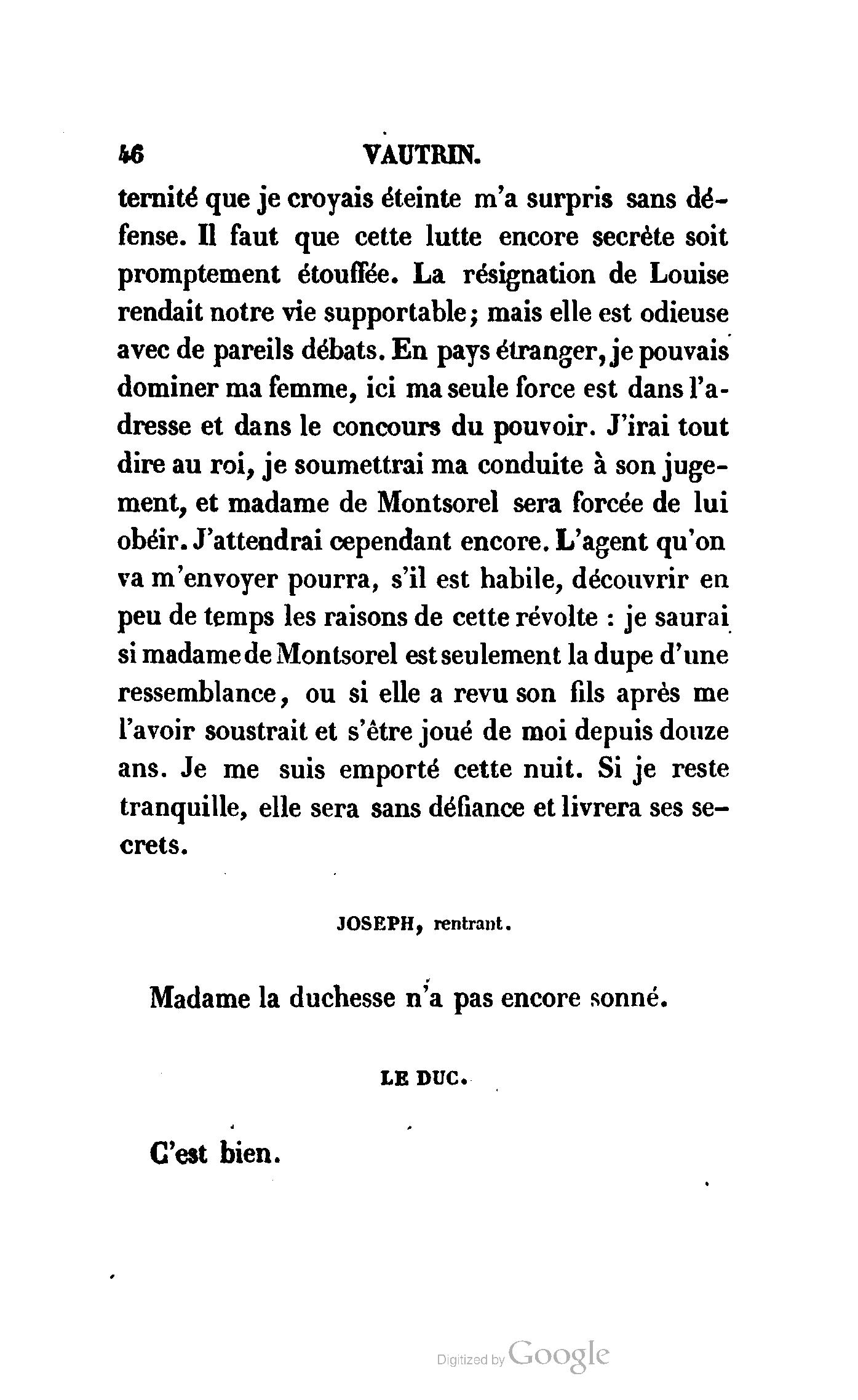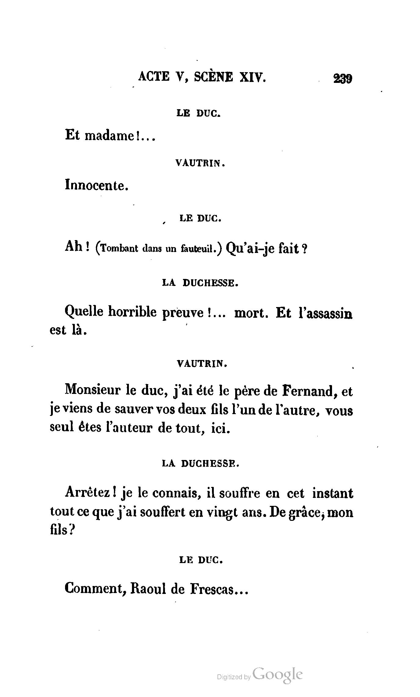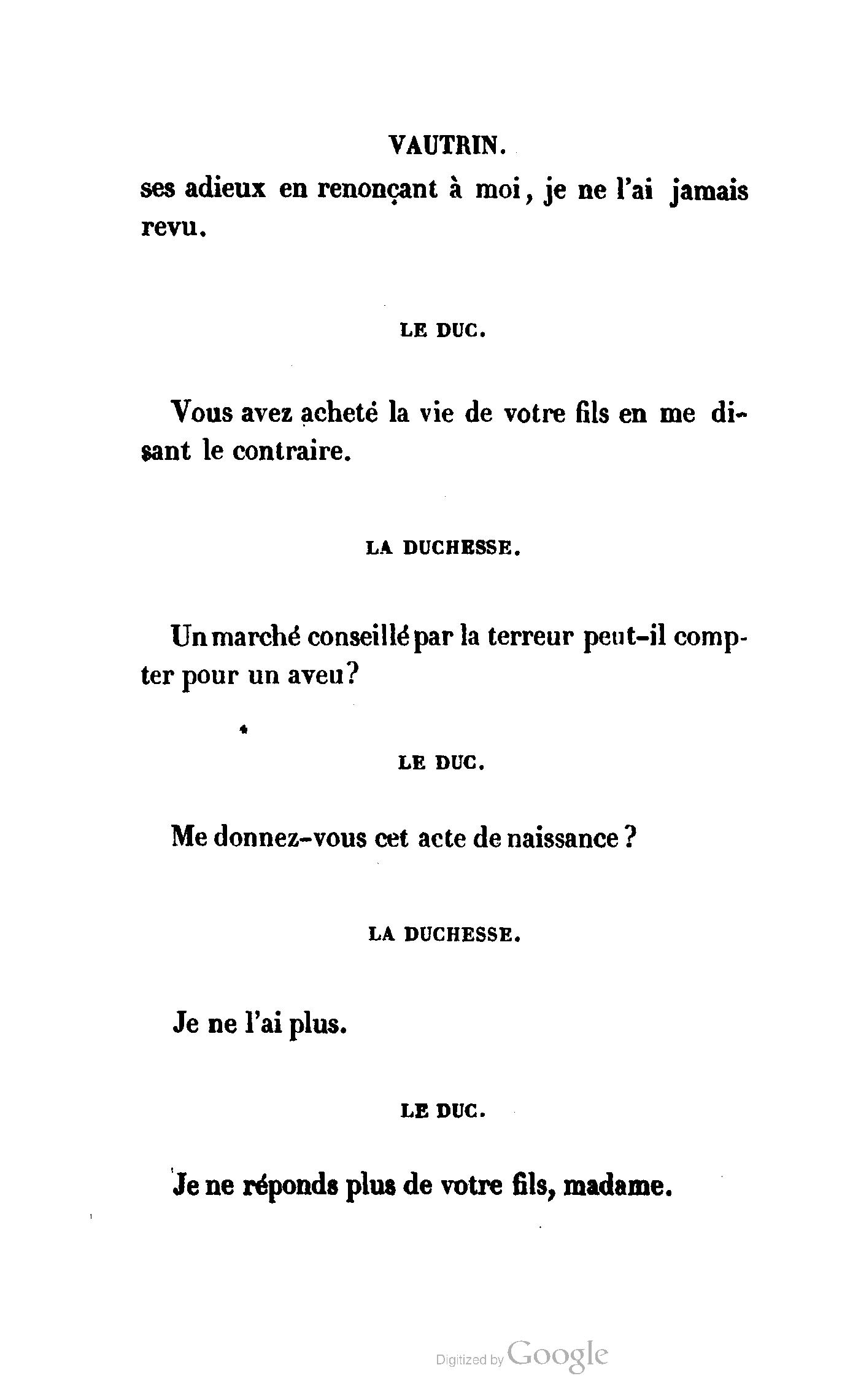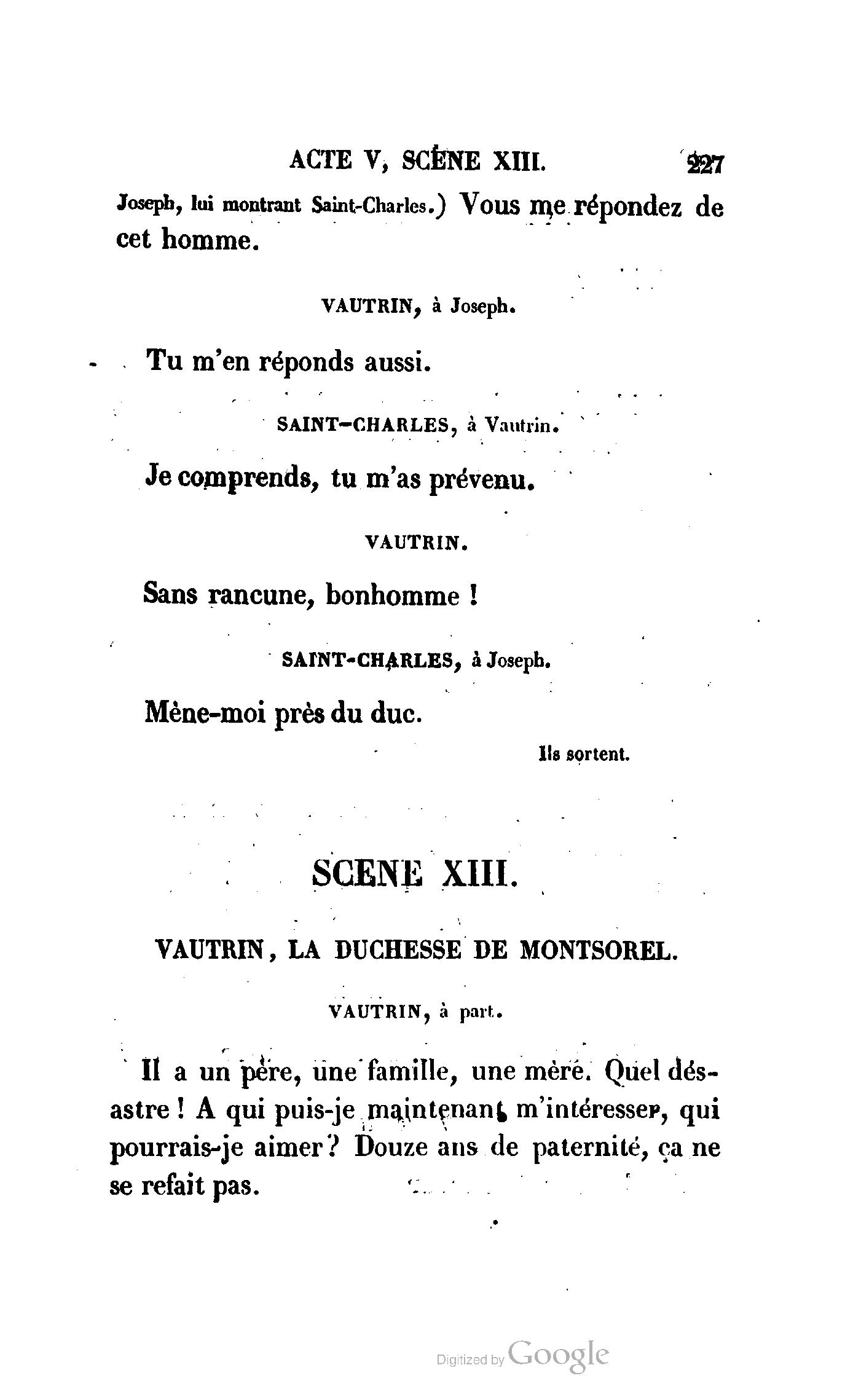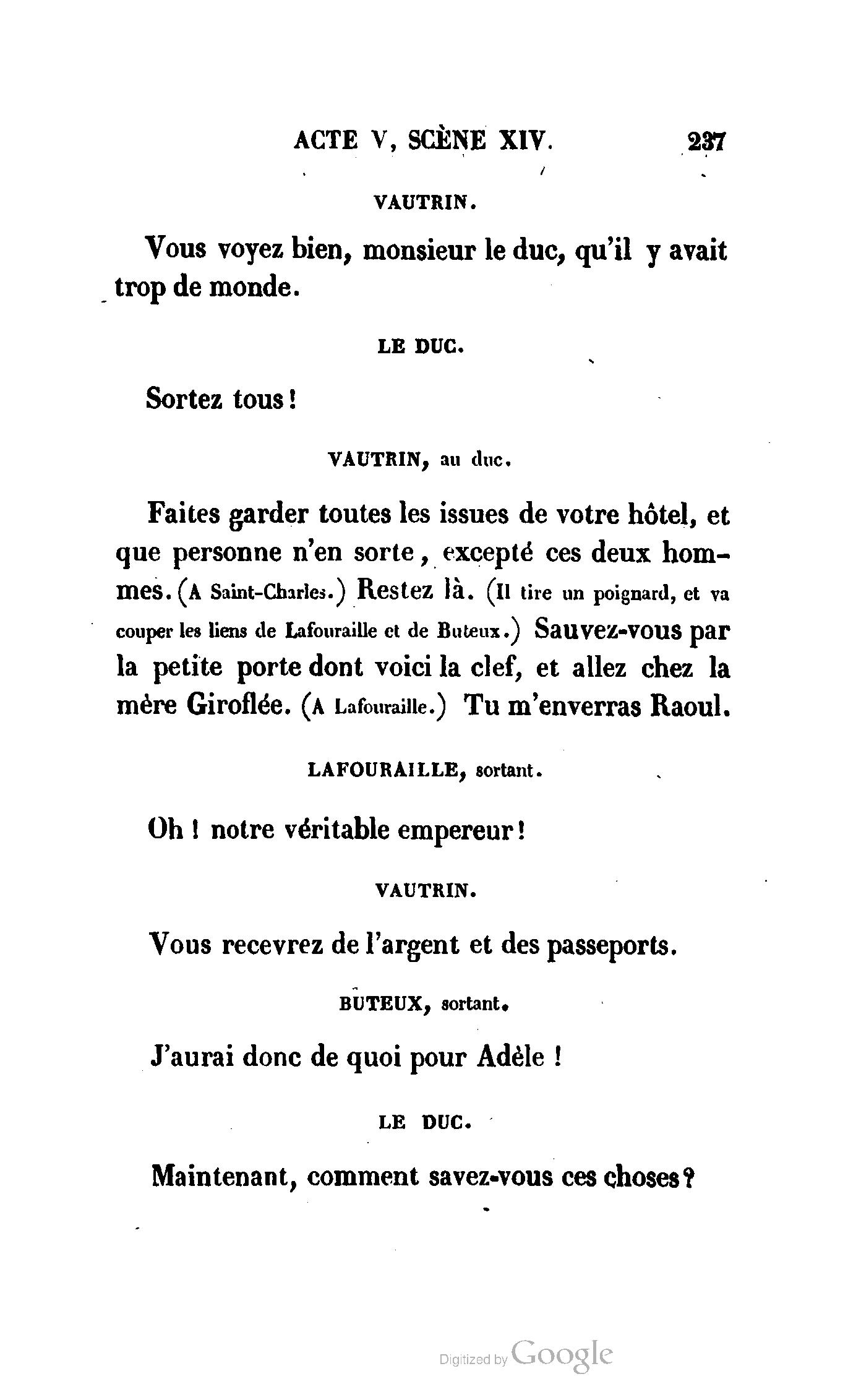 Chez vous, Monsieur le duc, laissez passer la justice du roi. C’est une affaire entre ces Messieurs et moi. (Au commissaire.) Je vous suis. (À la duchesse.) C’est Joseph qui les amène ; il est des nôtres ; renvoyez-le.