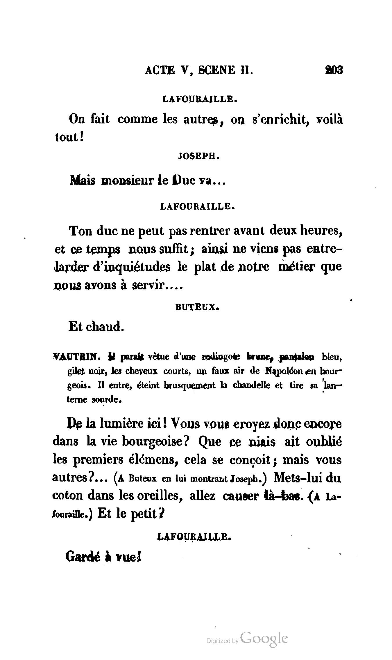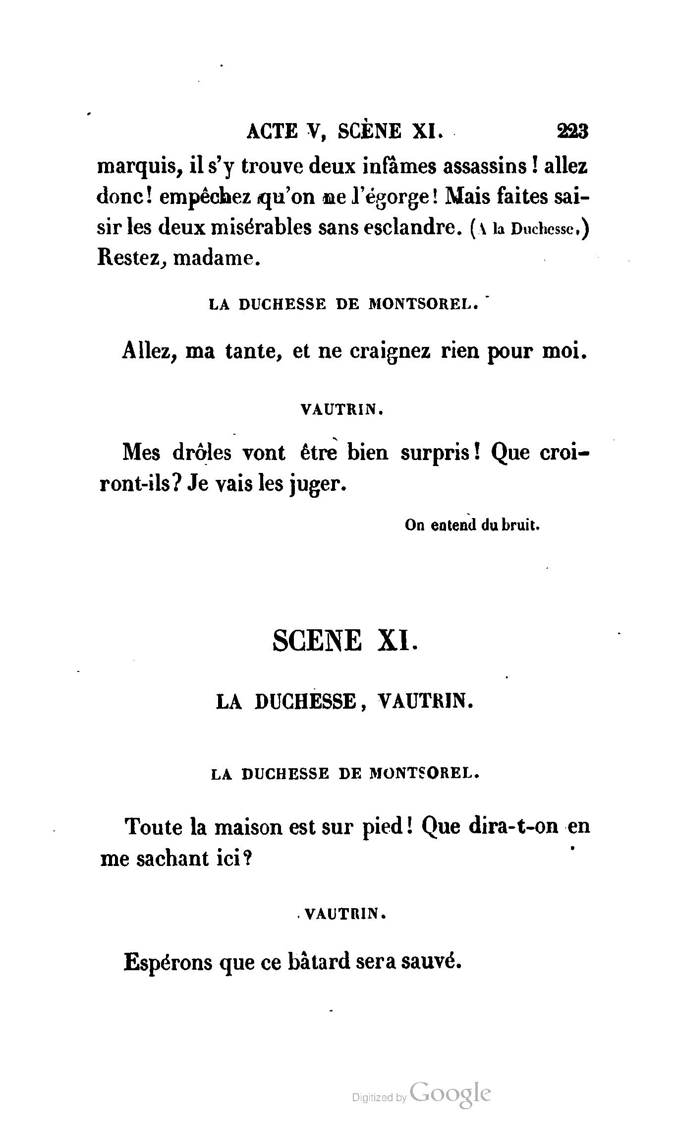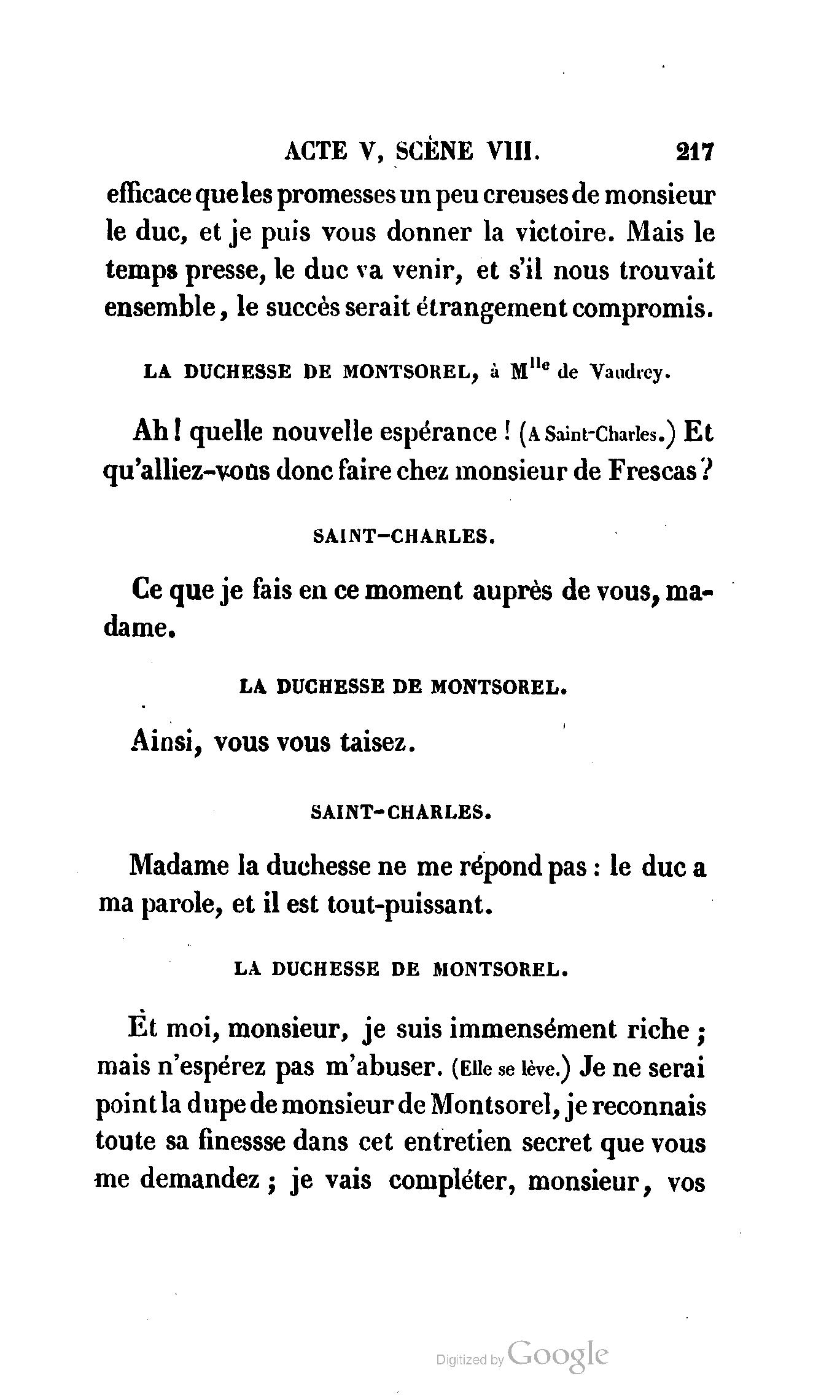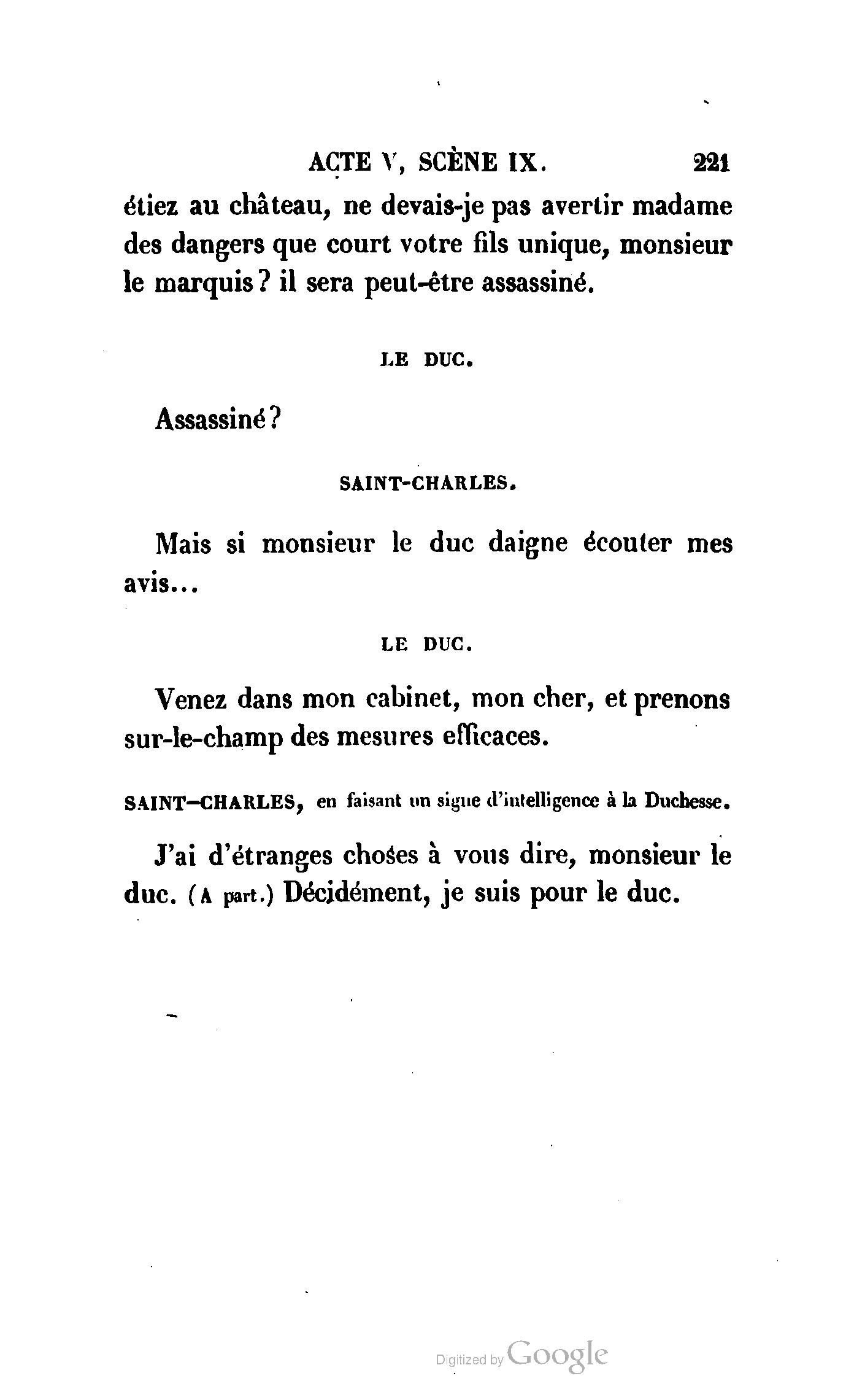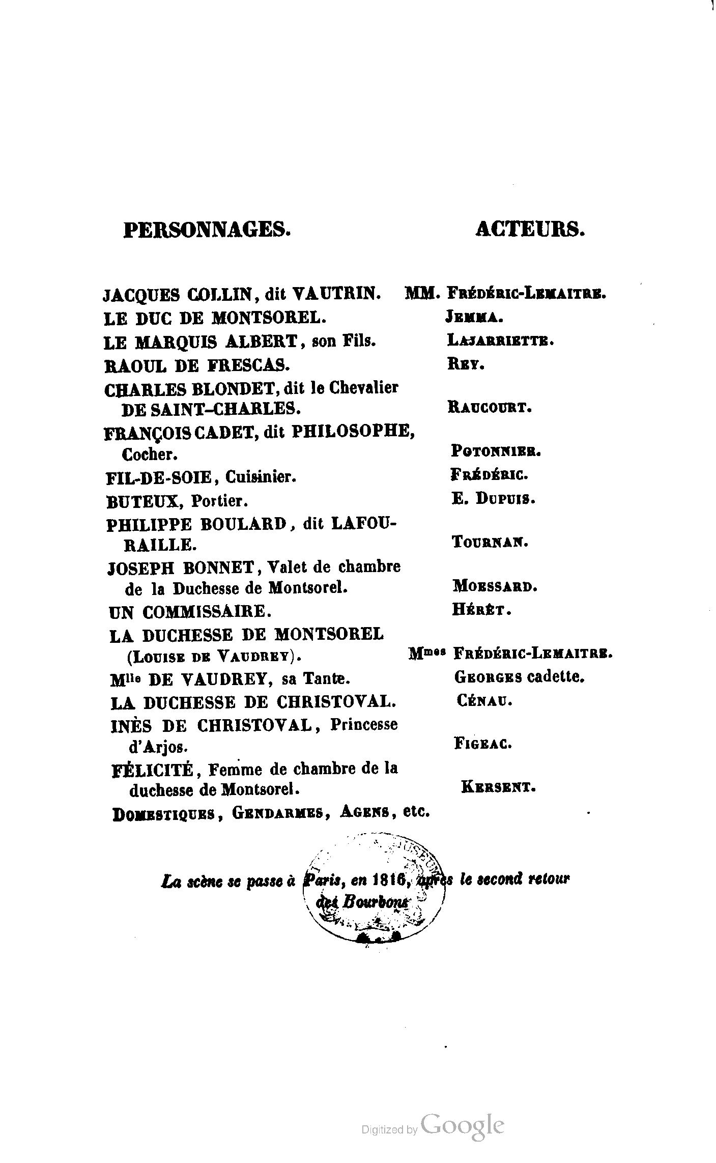 Chez vous, Monsieur le duc, laissez passer la justice du roi. C’est une affaire entre ces Messieurs et moi. (Au commissaire.) Je vous suis. (À la duchesse.) C’est Joseph qui les amène ; il est des nôtres ; renvoyez-le.