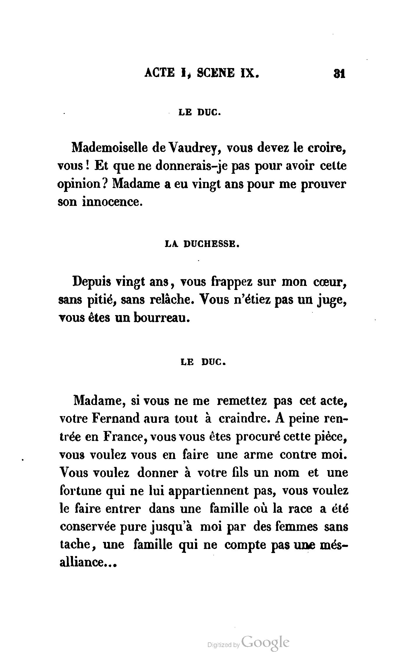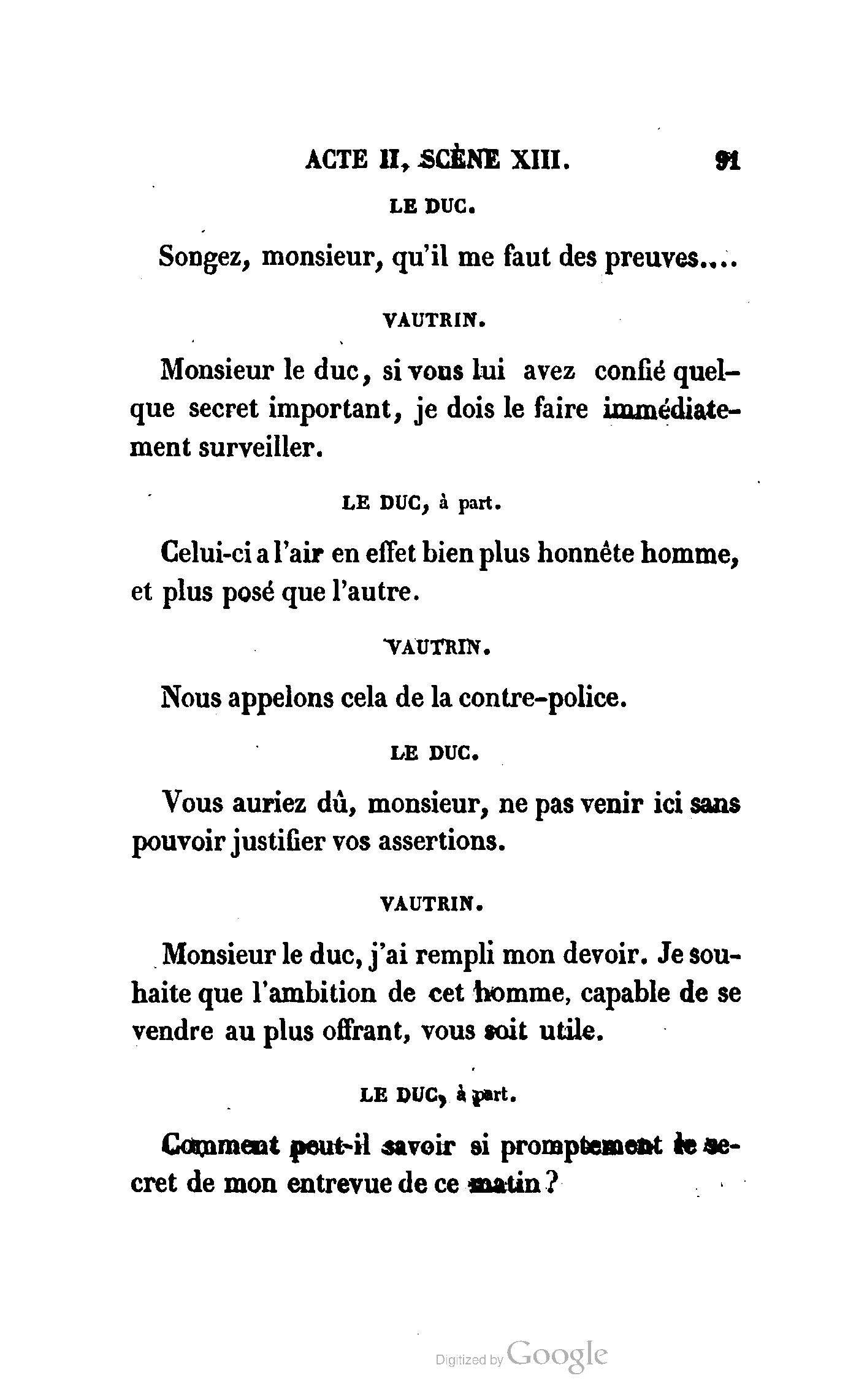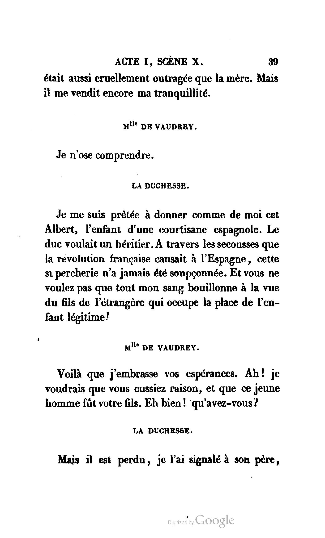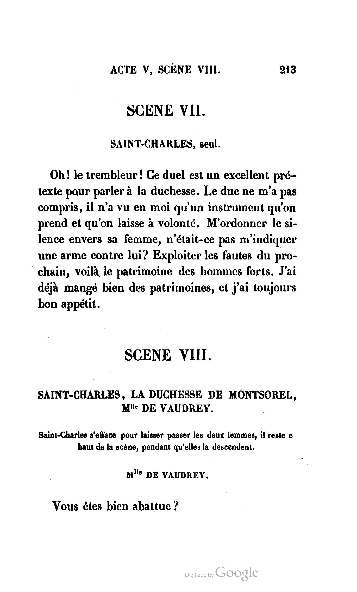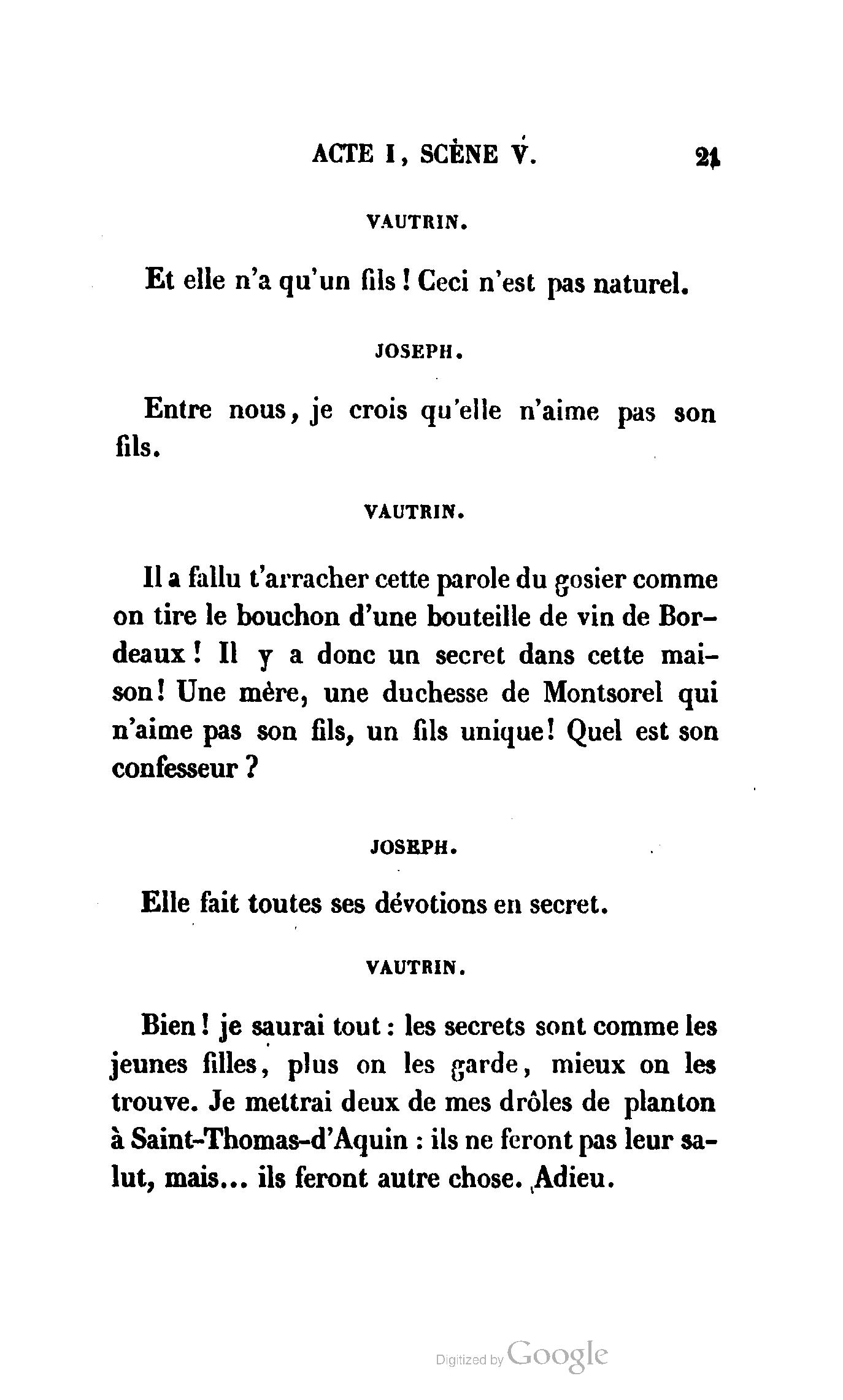 Chez vous, Monsieur le duc, laissez passer la justice du roi. C’est une affaire entre ces Messieurs et moi. (Au commissaire.) Je vous suis. (À la duchesse.) C’est Joseph qui les amène ; il est des nôtres ; renvoyez-le.