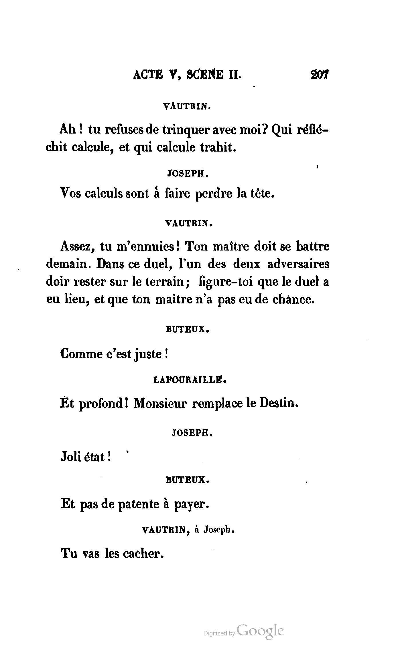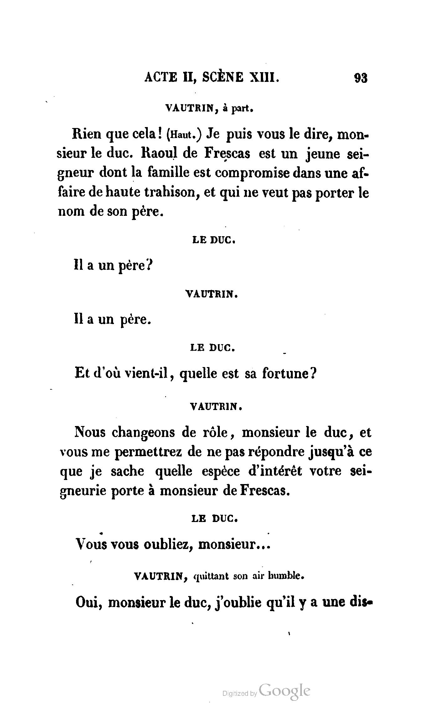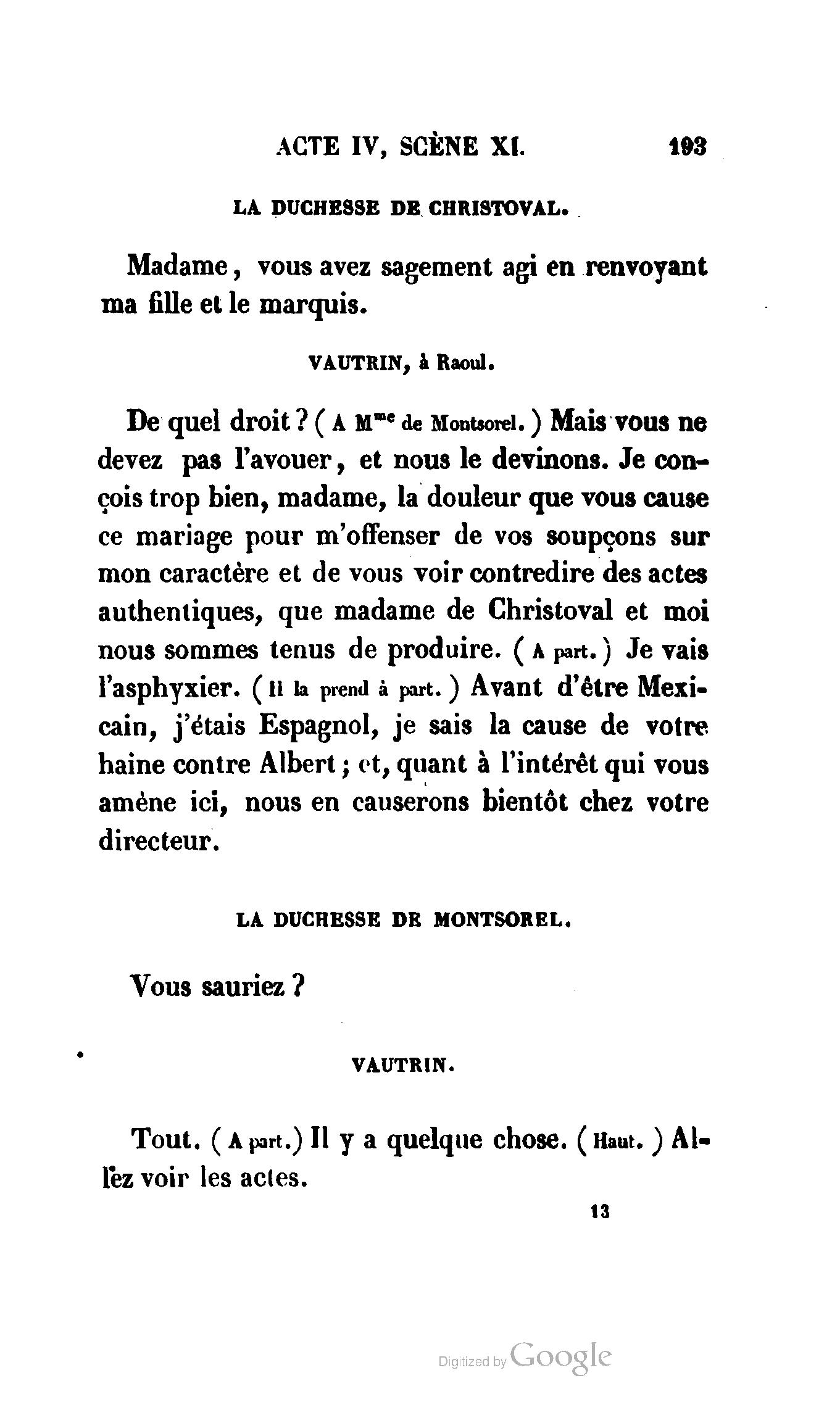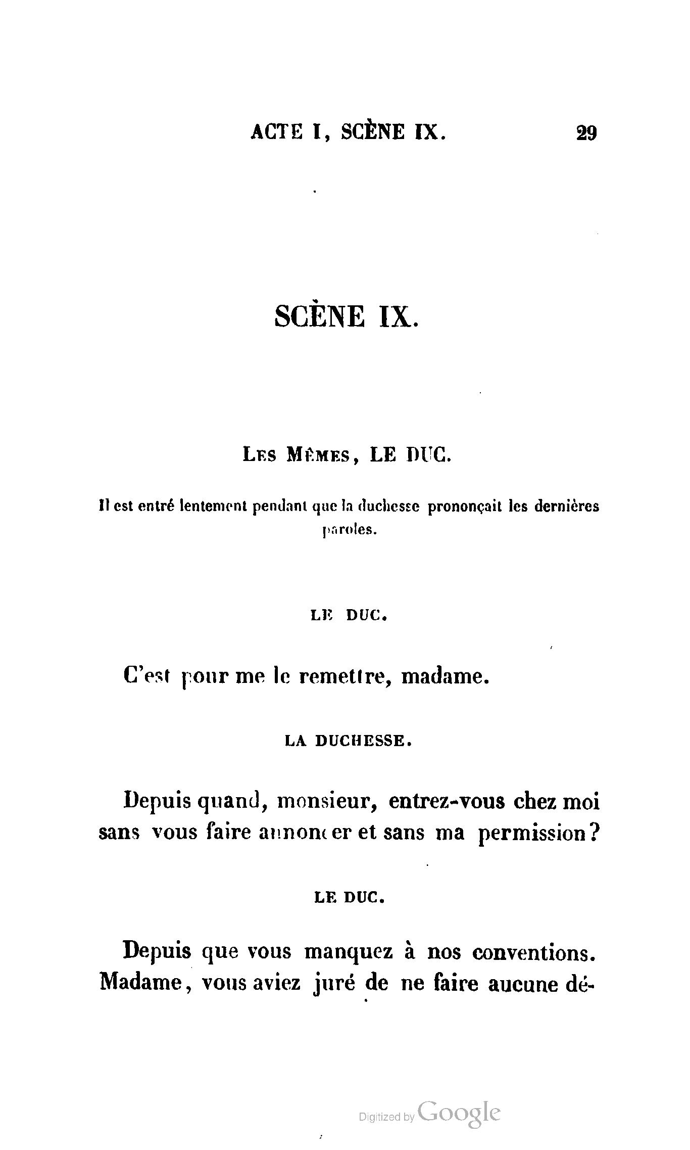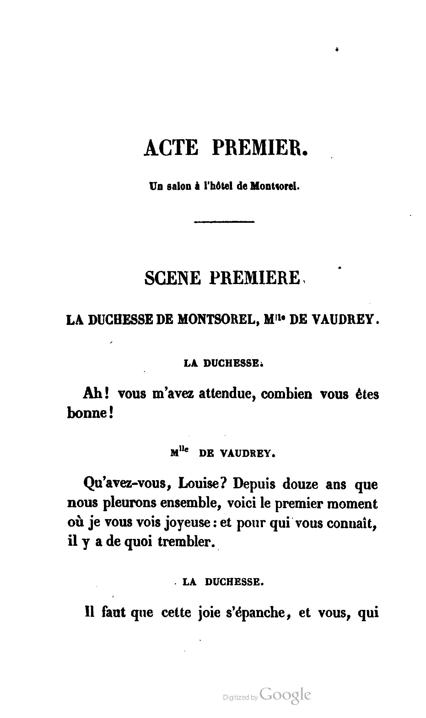 Chez vous, Monsieur le duc, laissez passer la justice du roi. C’est une affaire entre ces Messieurs et moi. (Au commissaire.) Je vous suis. (À la duchesse.) C’est Joseph qui les amène ; il est des nôtres ; renvoyez-le.