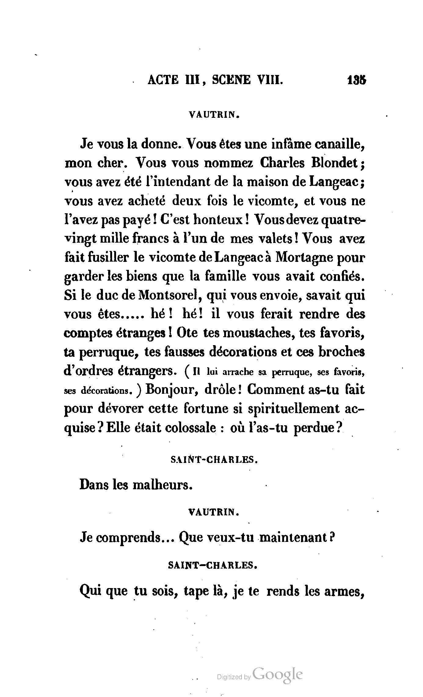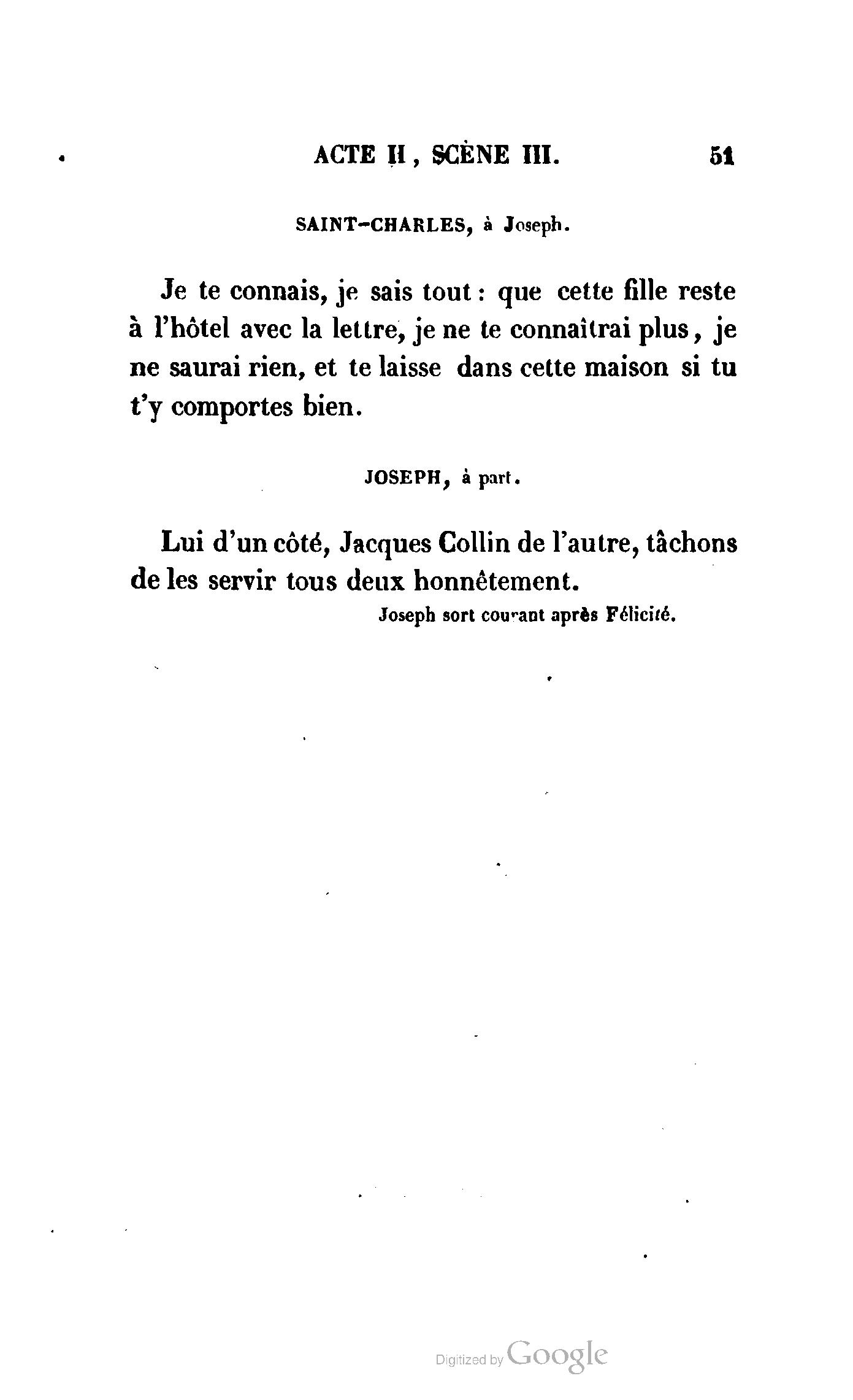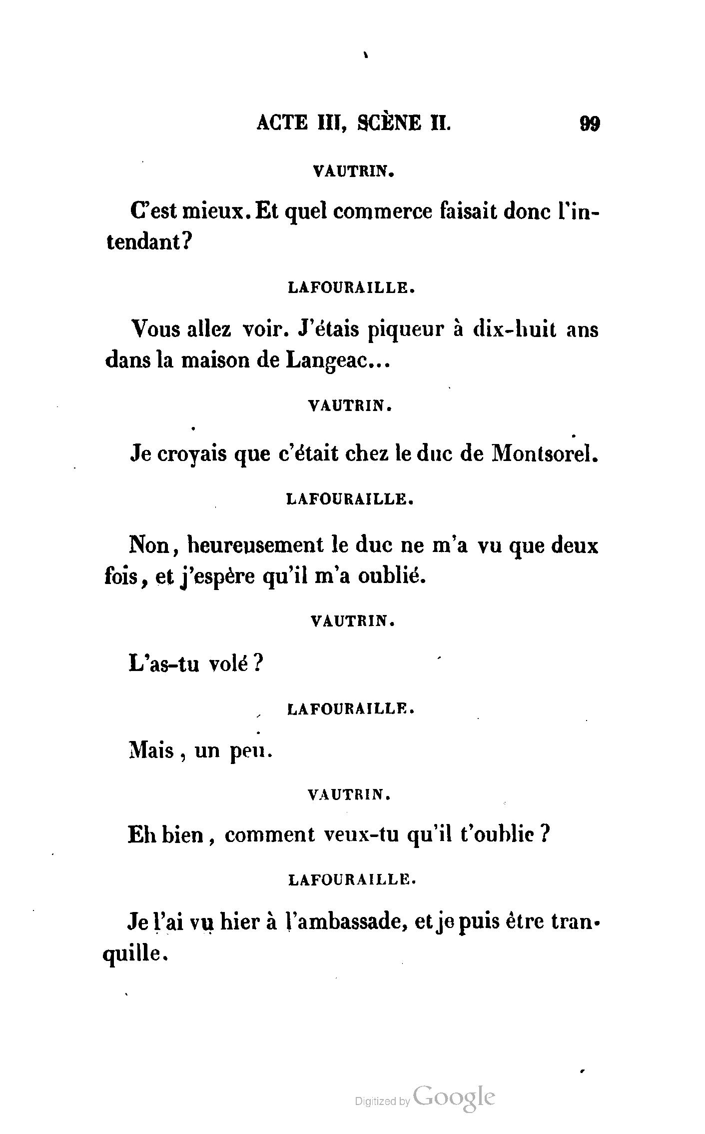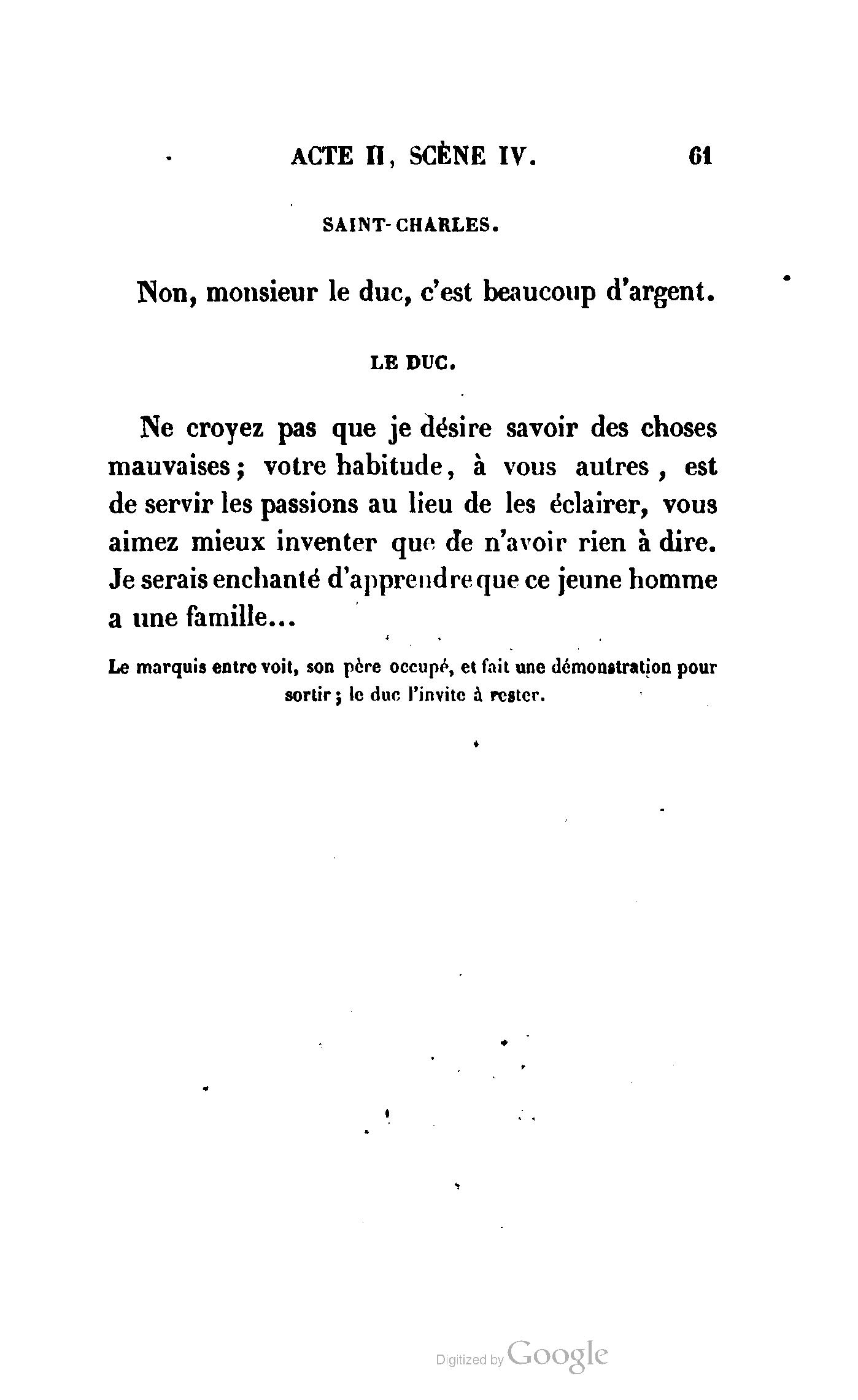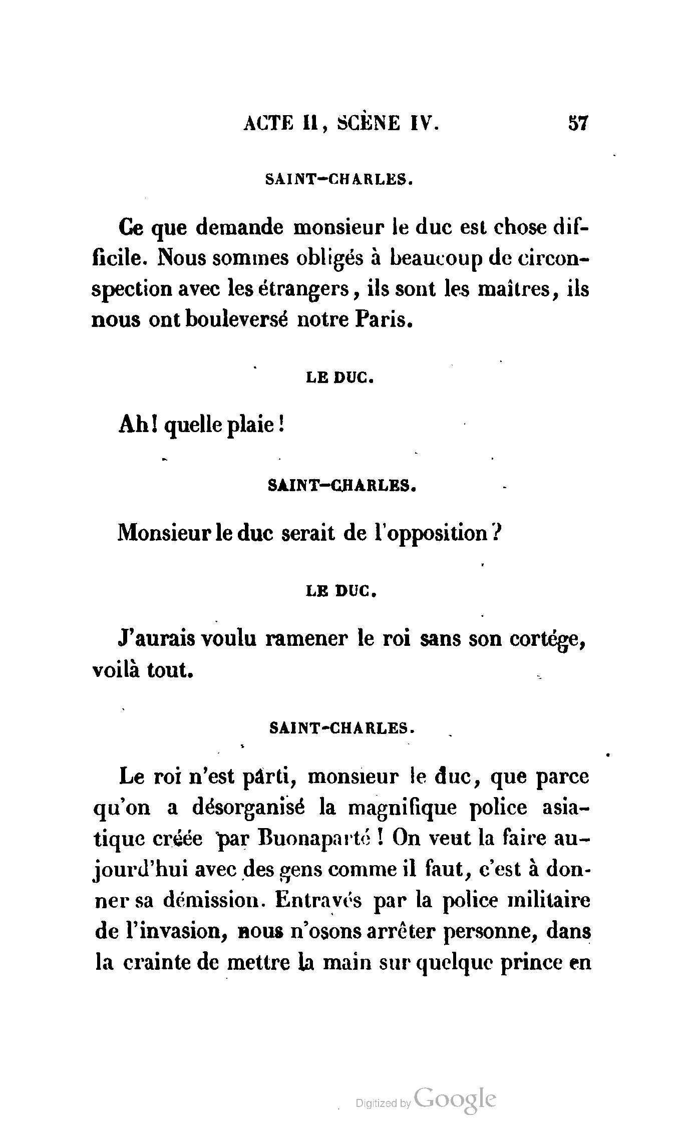 Chez vous, Monsieur le duc, laissez passer la justice du roi. C’est une affaire entre ces Messieurs et moi. (Au commissaire.) Je vous suis. (À la duchesse.) C’est Joseph qui les amène ; il est des nôtres ; renvoyez-le.