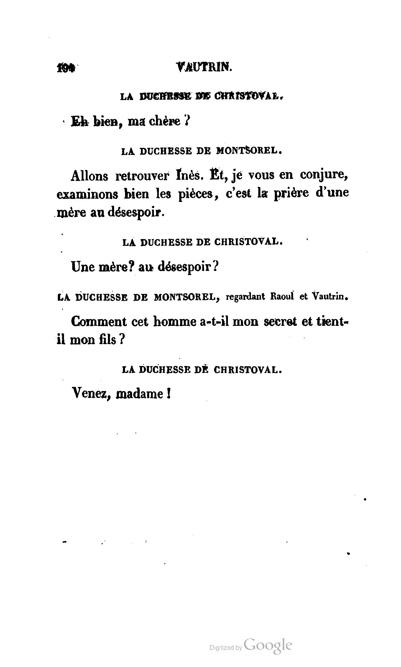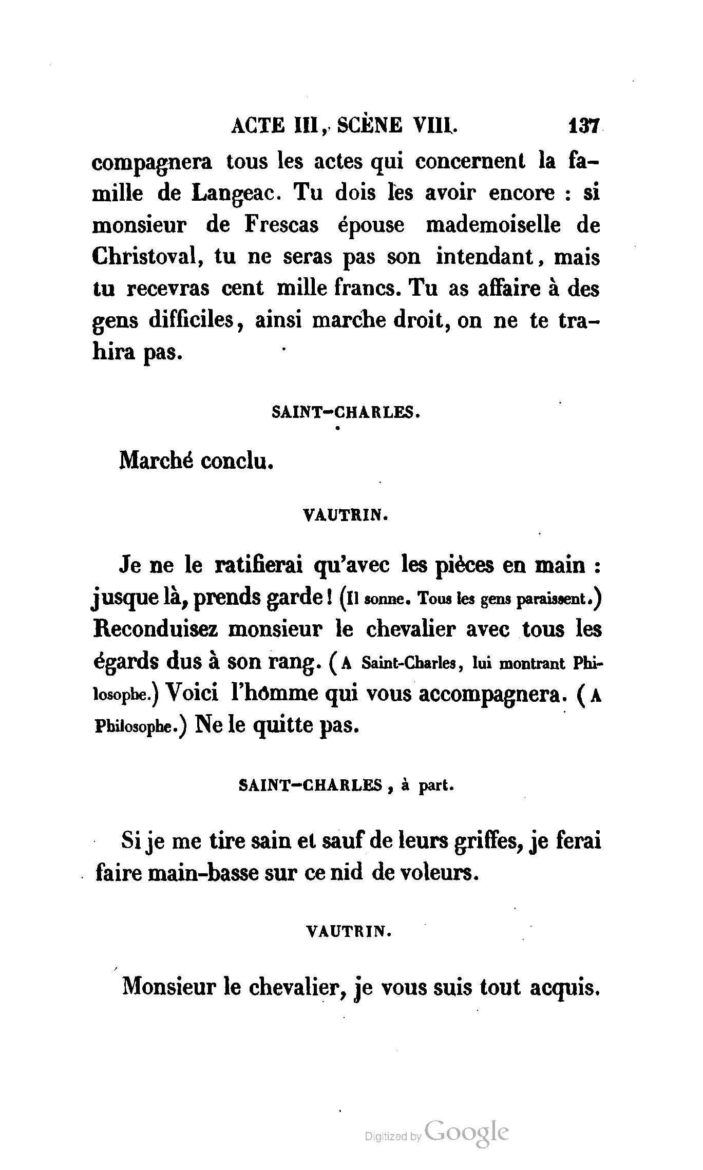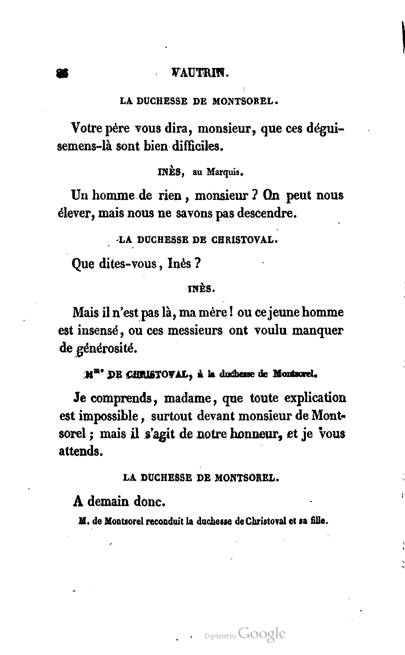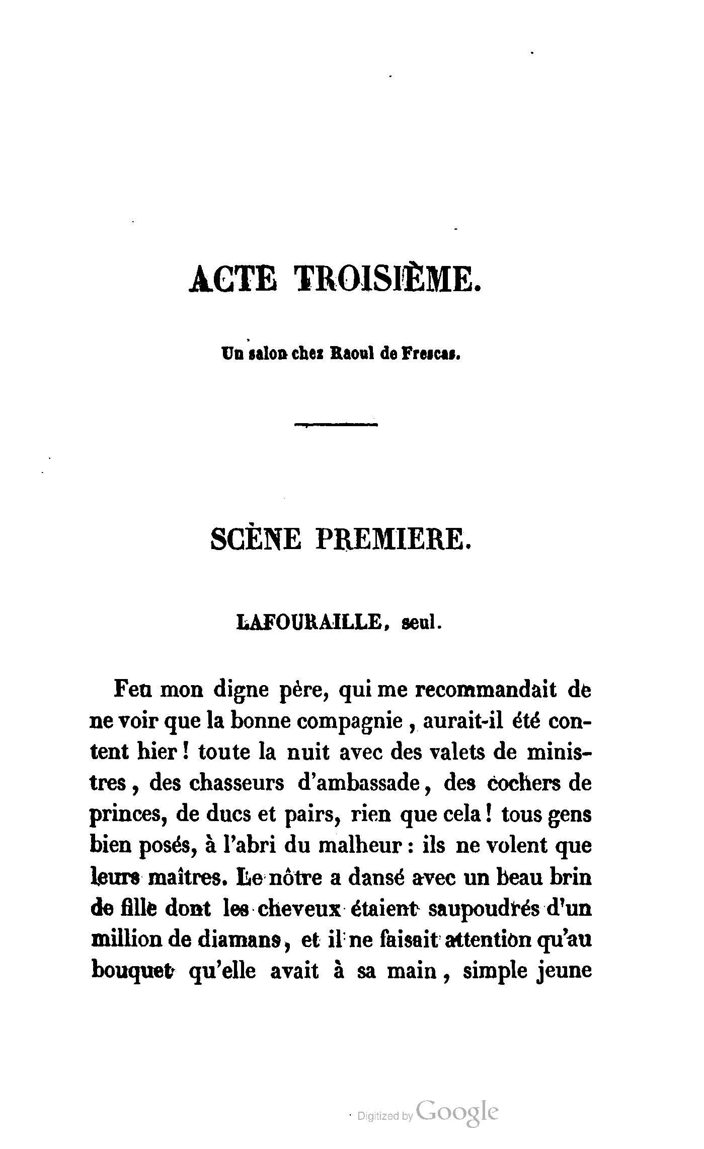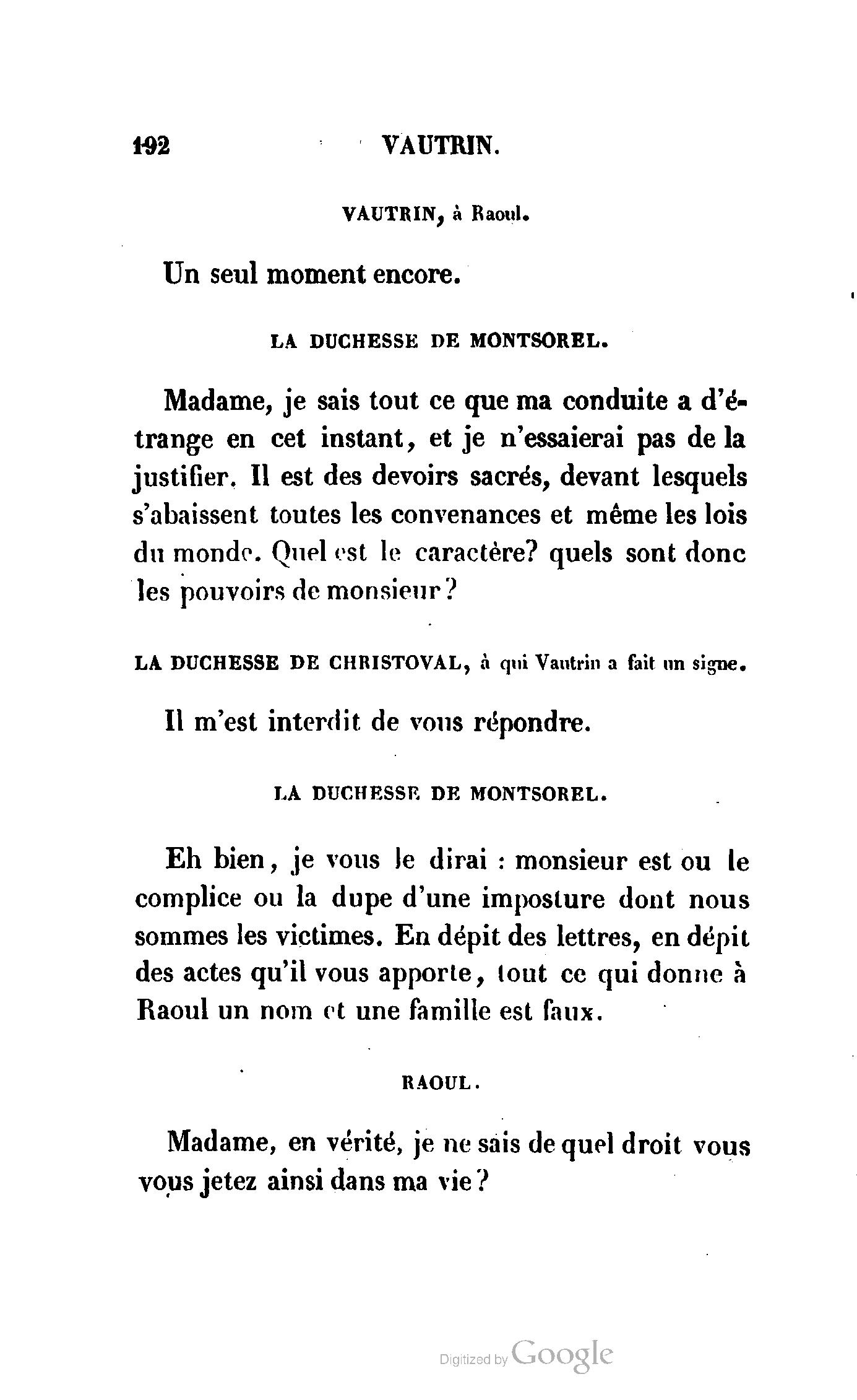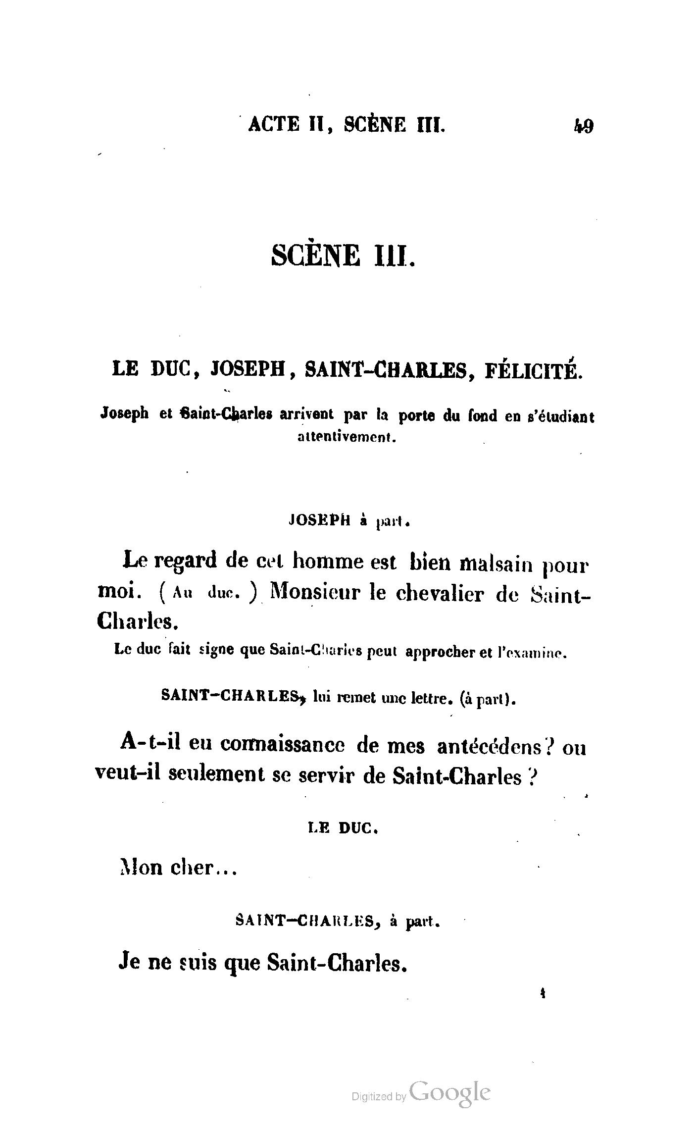 Chez vous, Monsieur le duc, laissez passer la justice du roi. C’est une affaire entre ces Messieurs et moi. (Au commissaire.) Je vous suis. (À la duchesse.) C’est Joseph qui les amène ; il est des nôtres ; renvoyez-le.