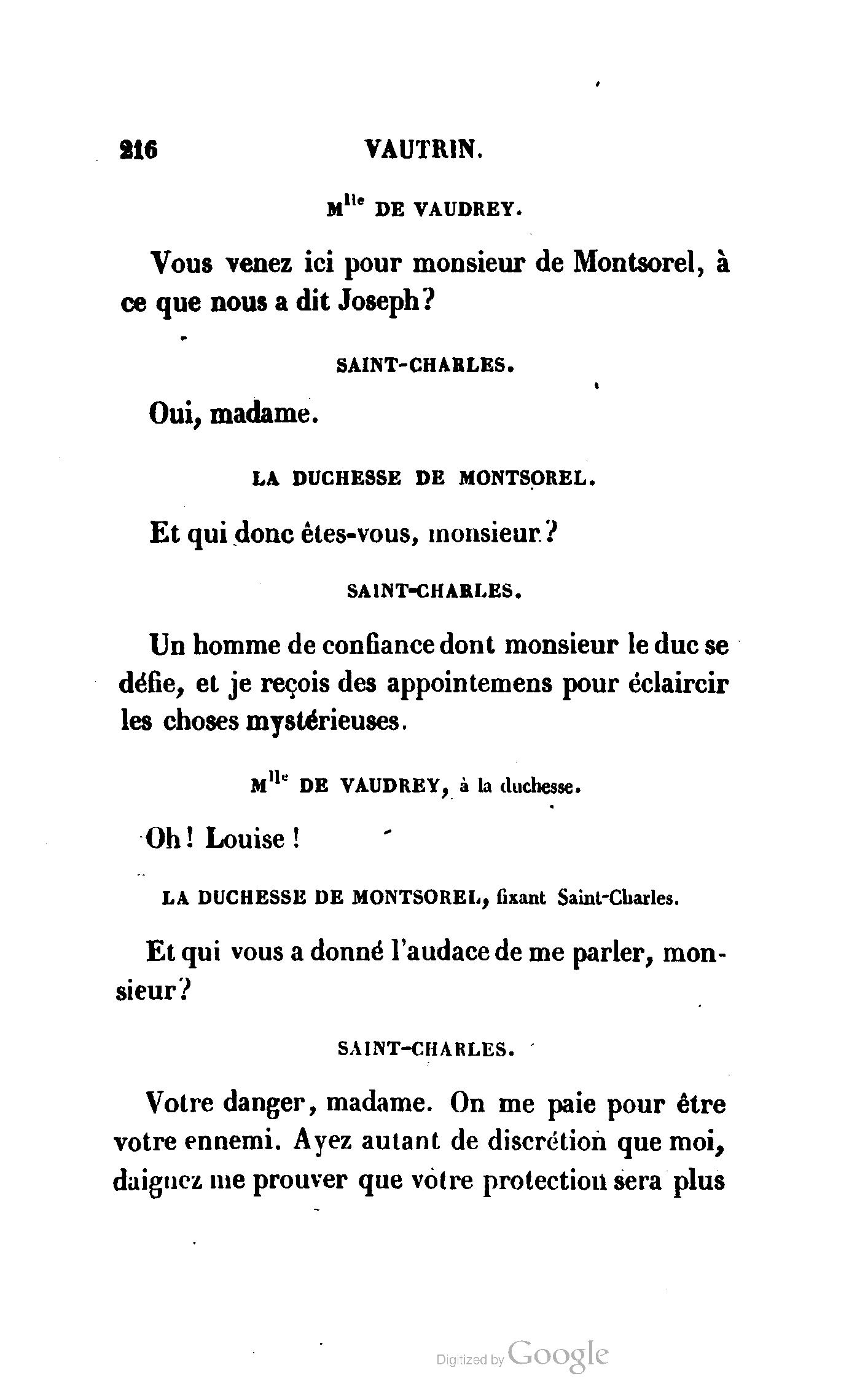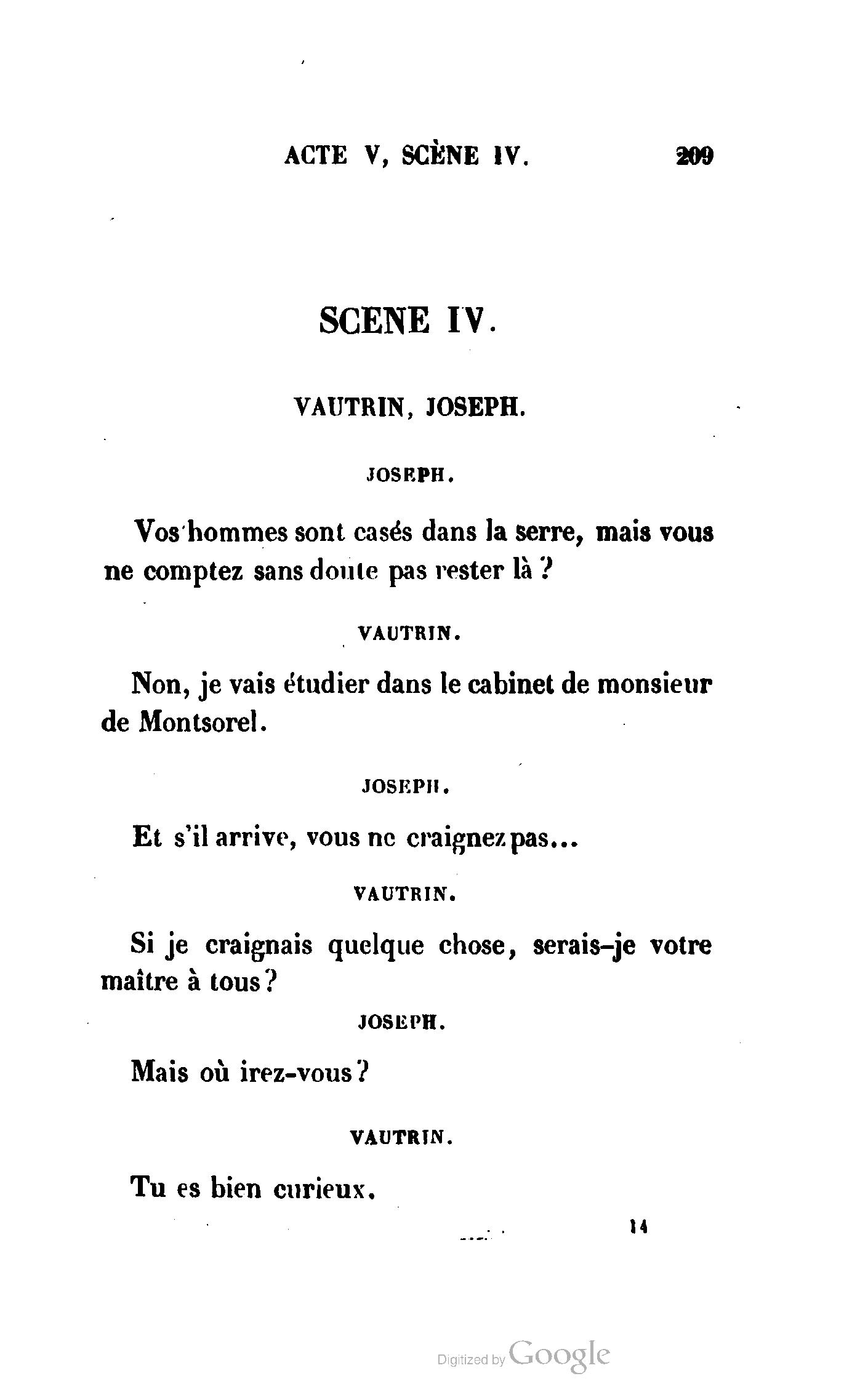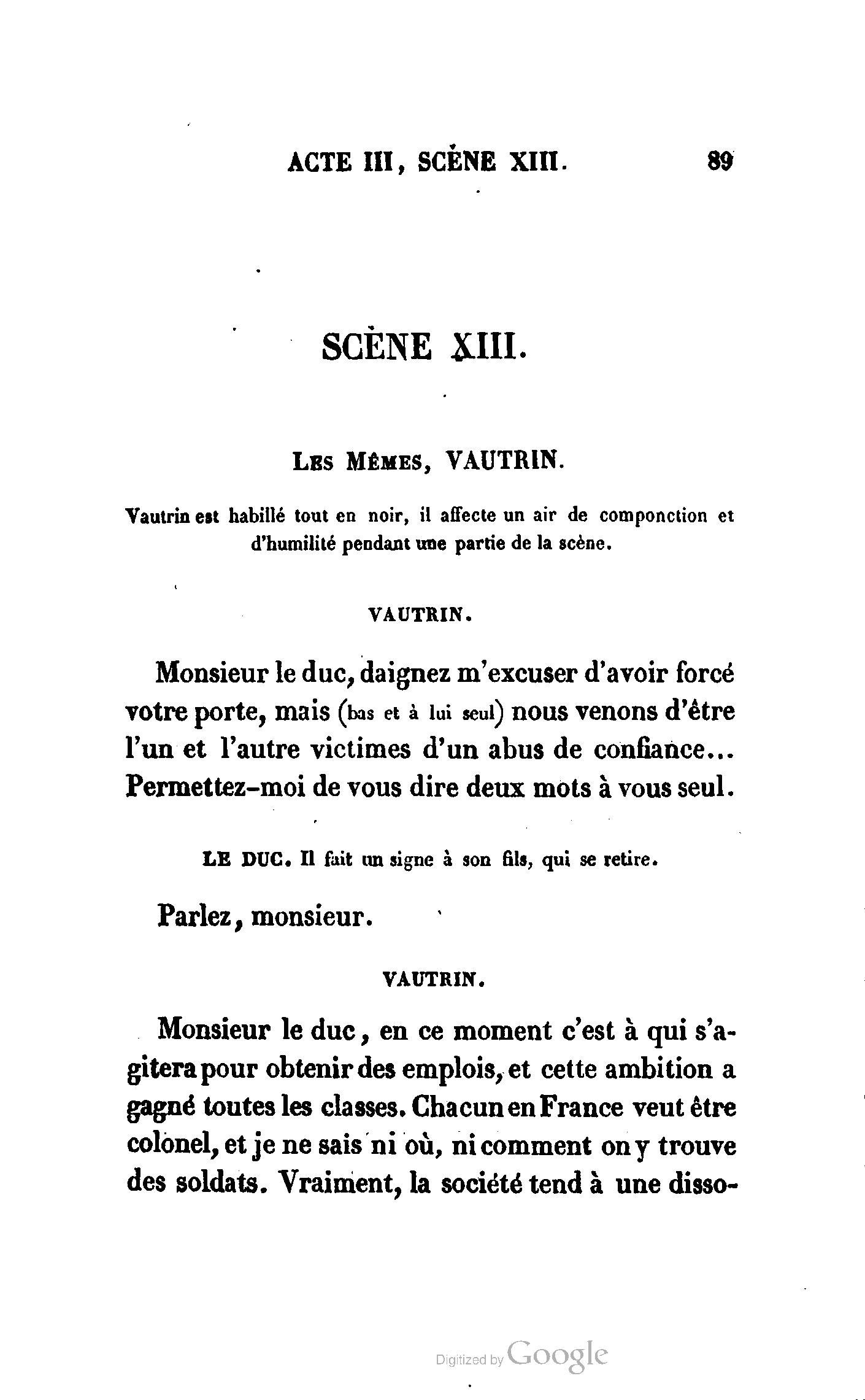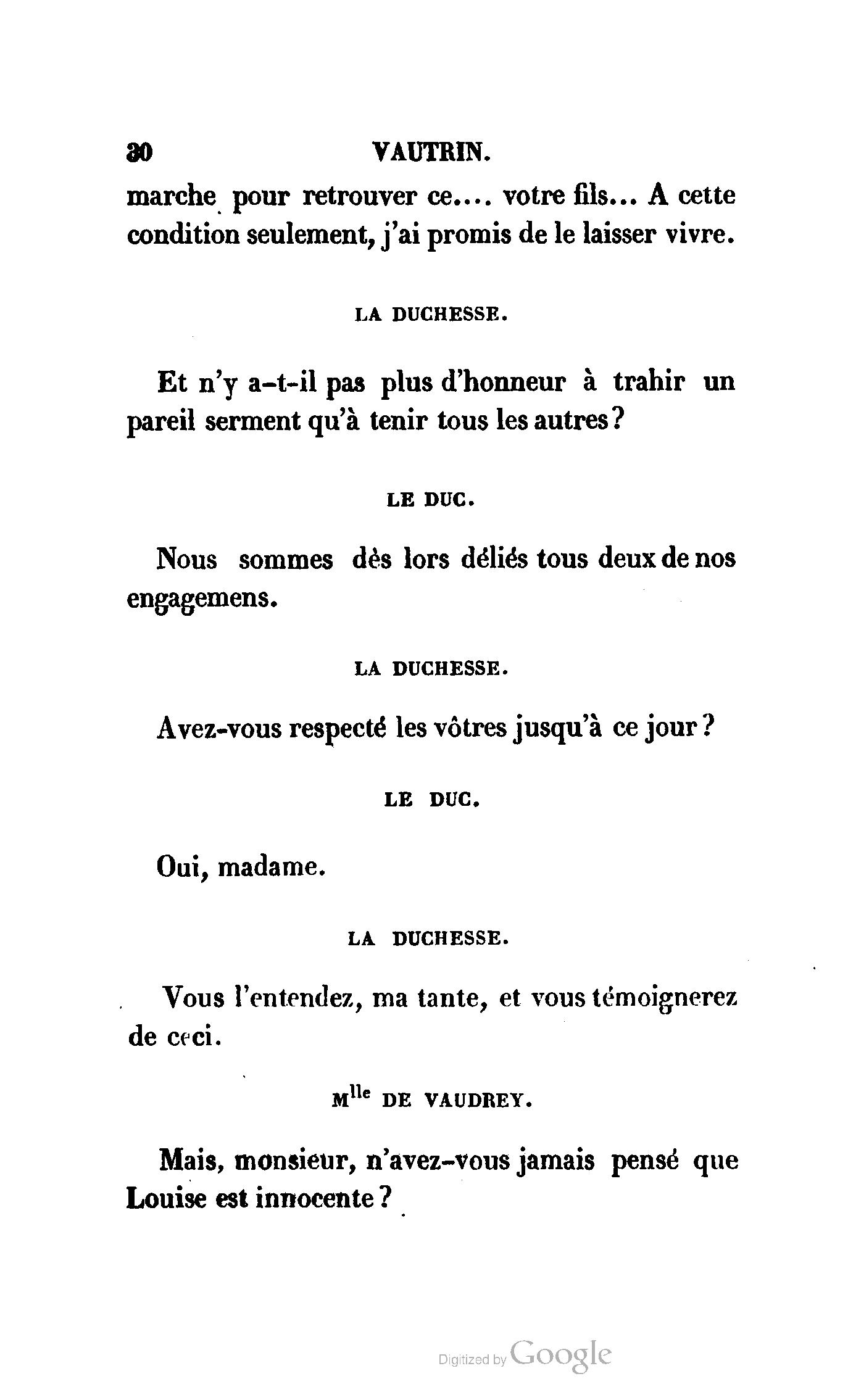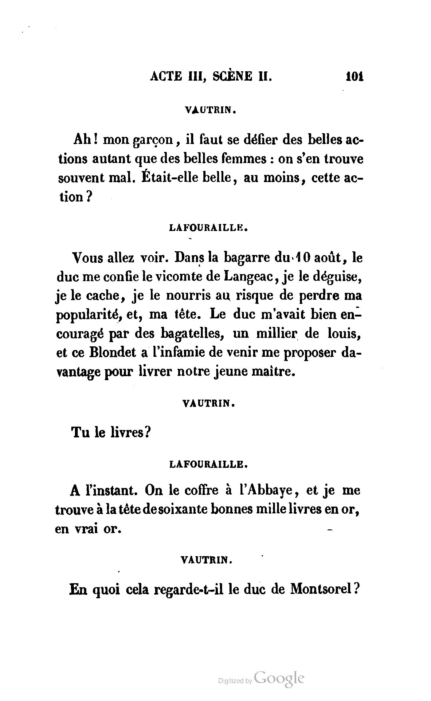 Chez vous, Monsieur le duc, laissez passer la justice du roi. C’est une affaire entre ces Messieurs et moi. (Au commissaire.) Je vous suis. (À la duchesse.) C’est Joseph qui les amène ; il est des nôtres ; renvoyez-le.