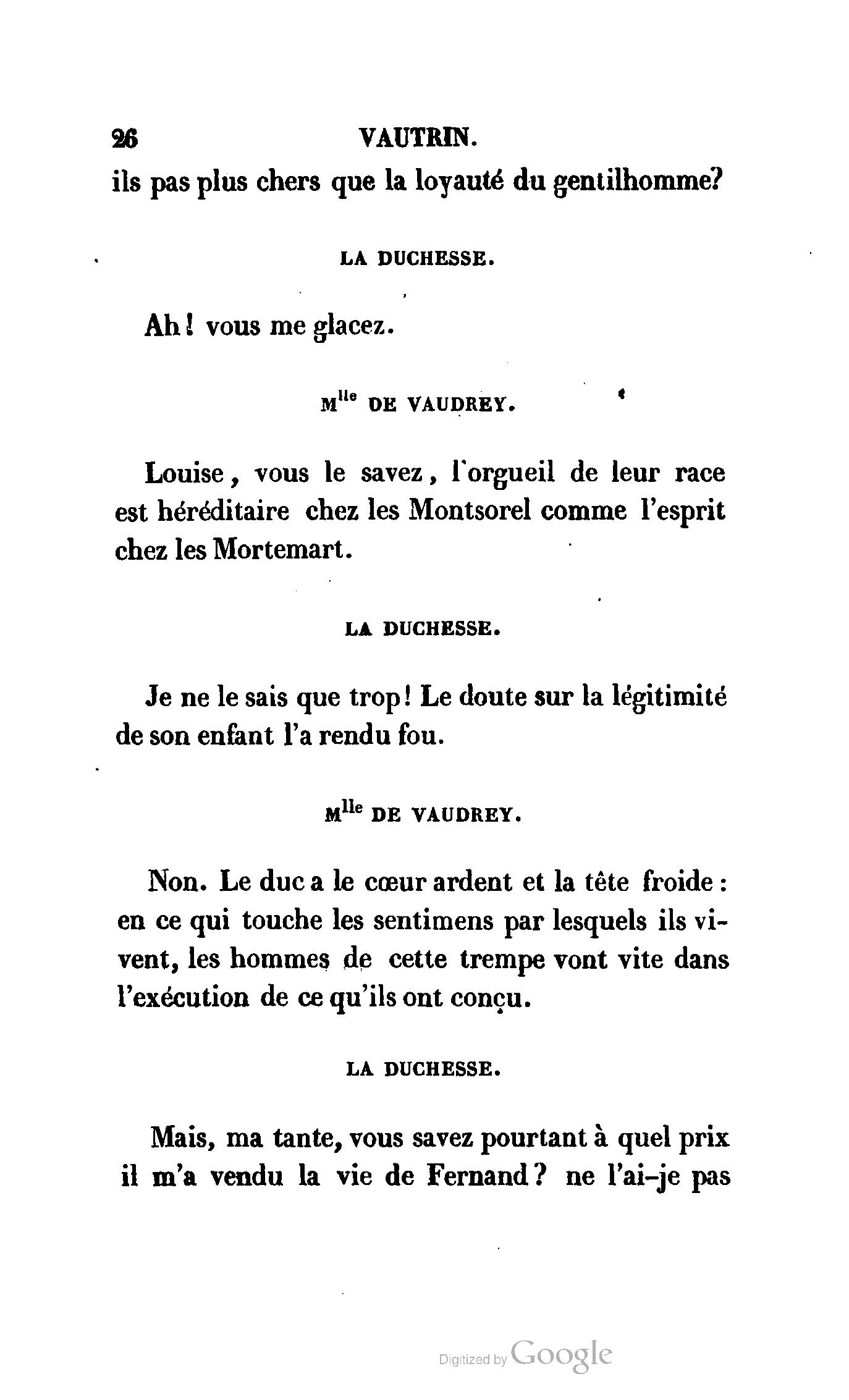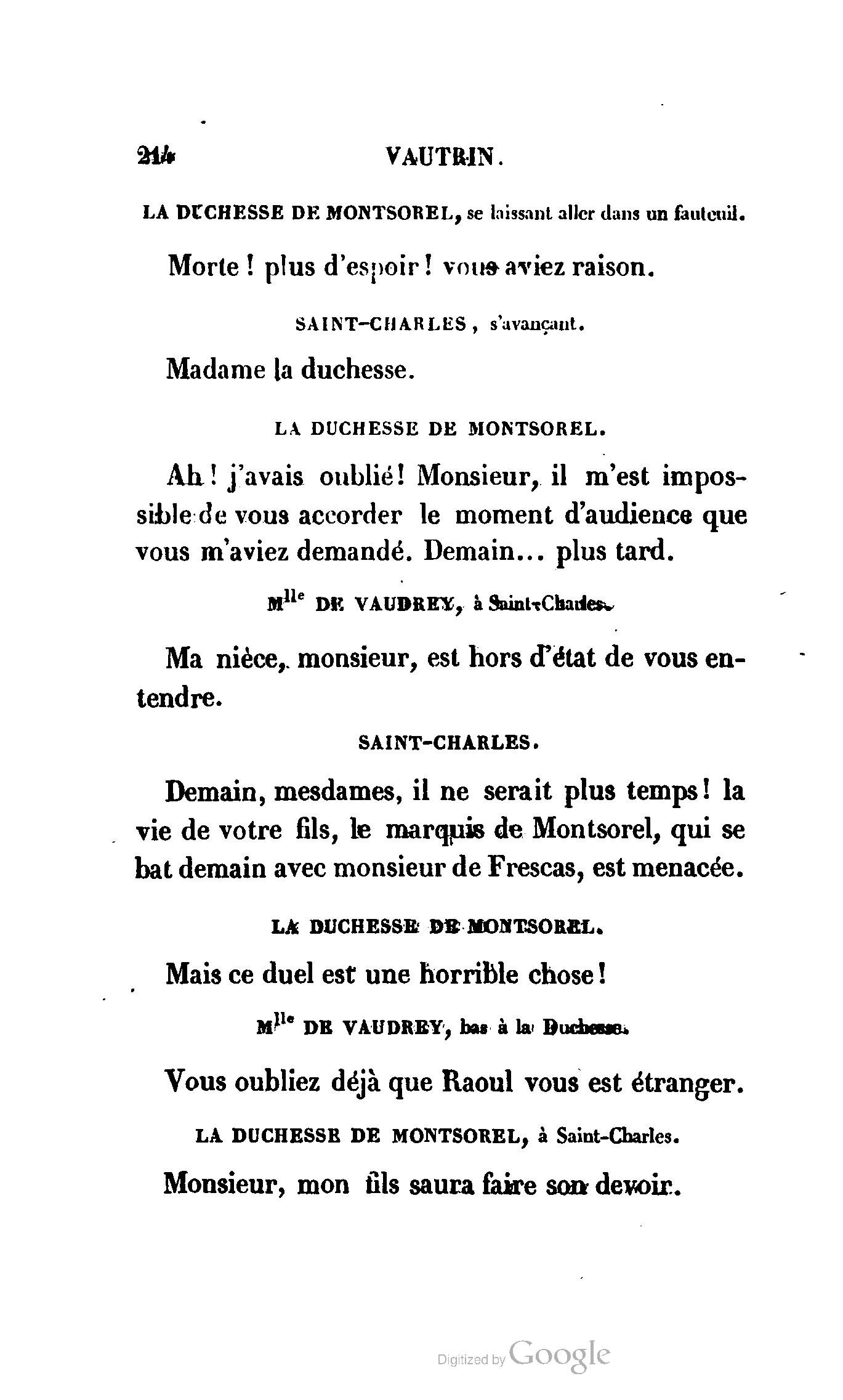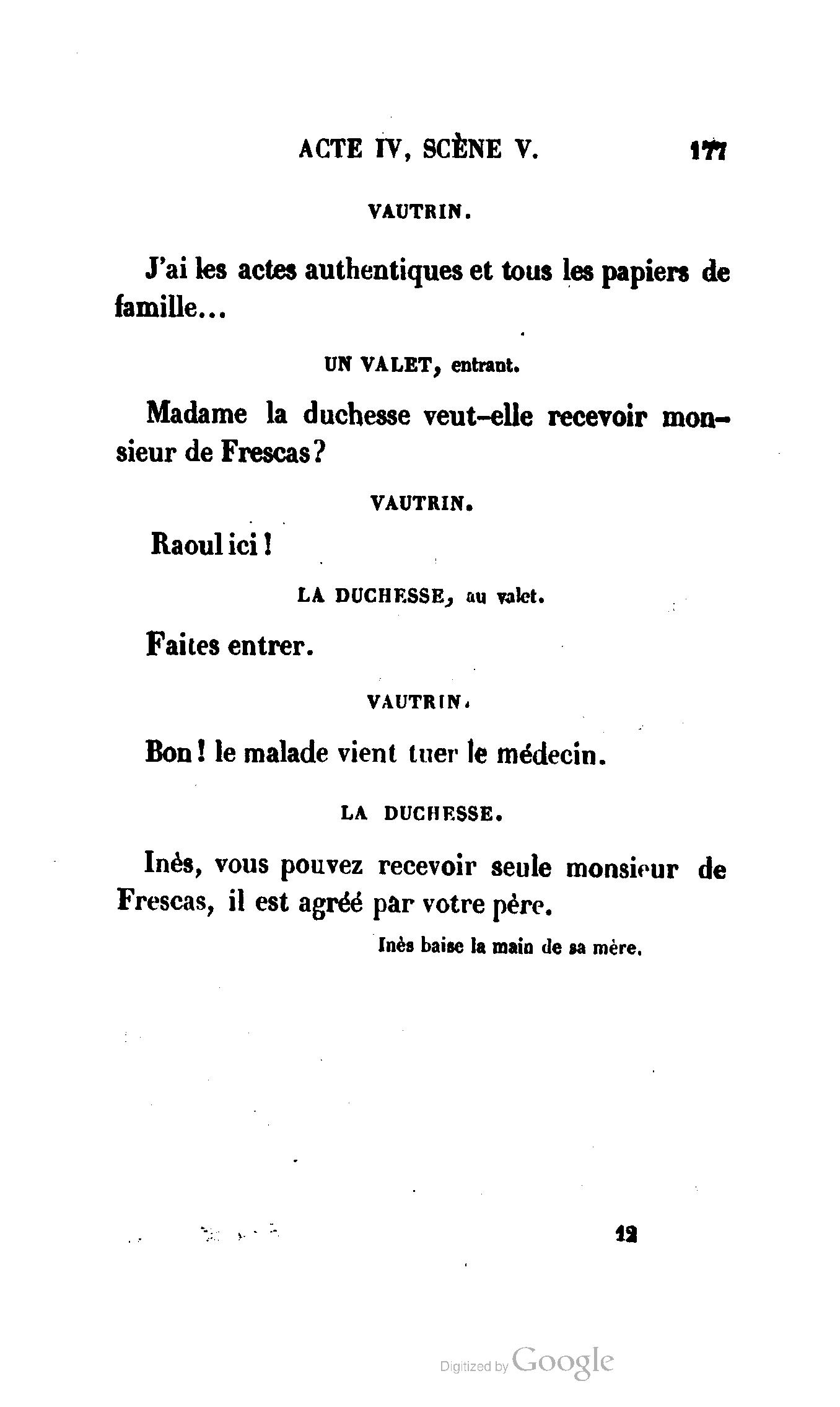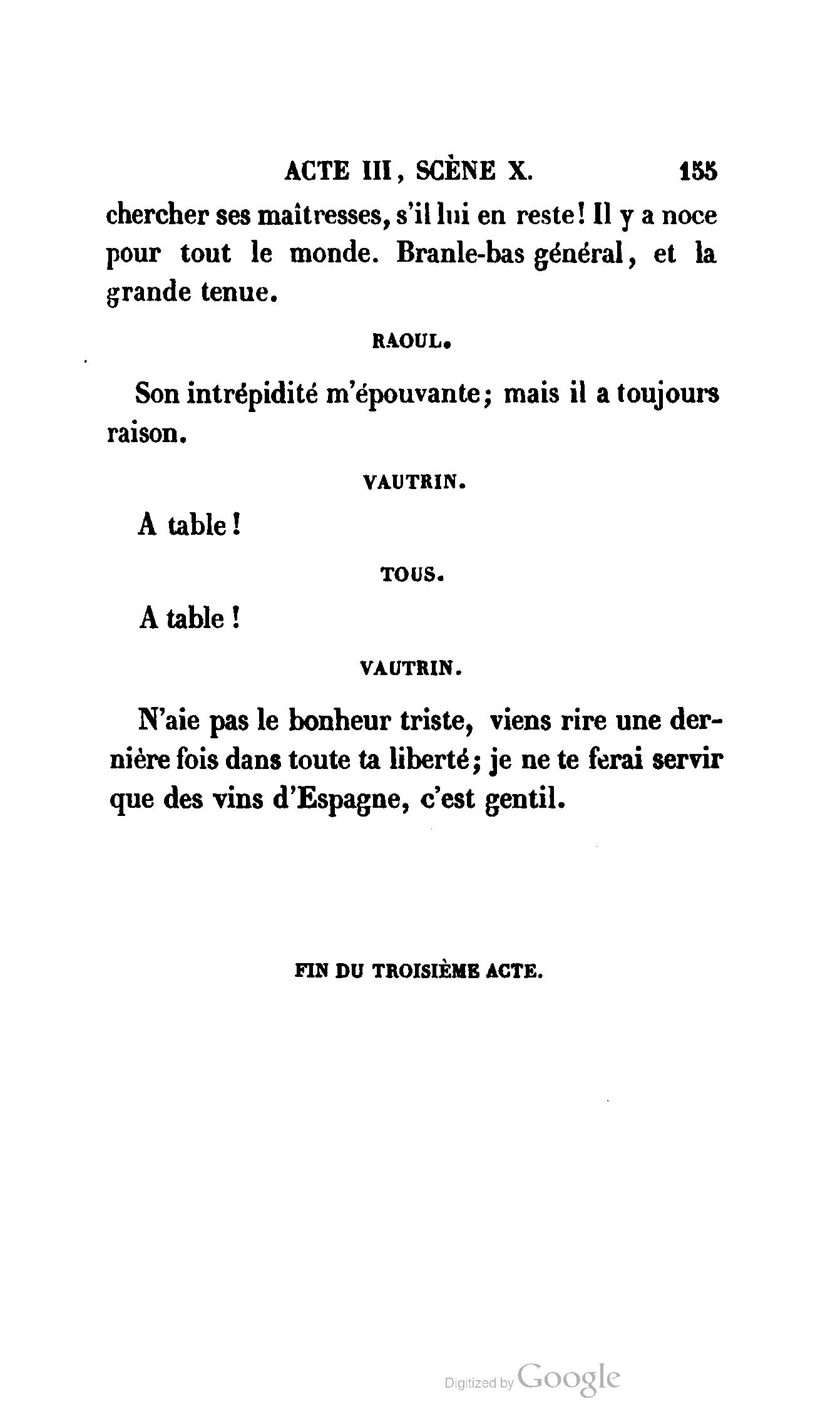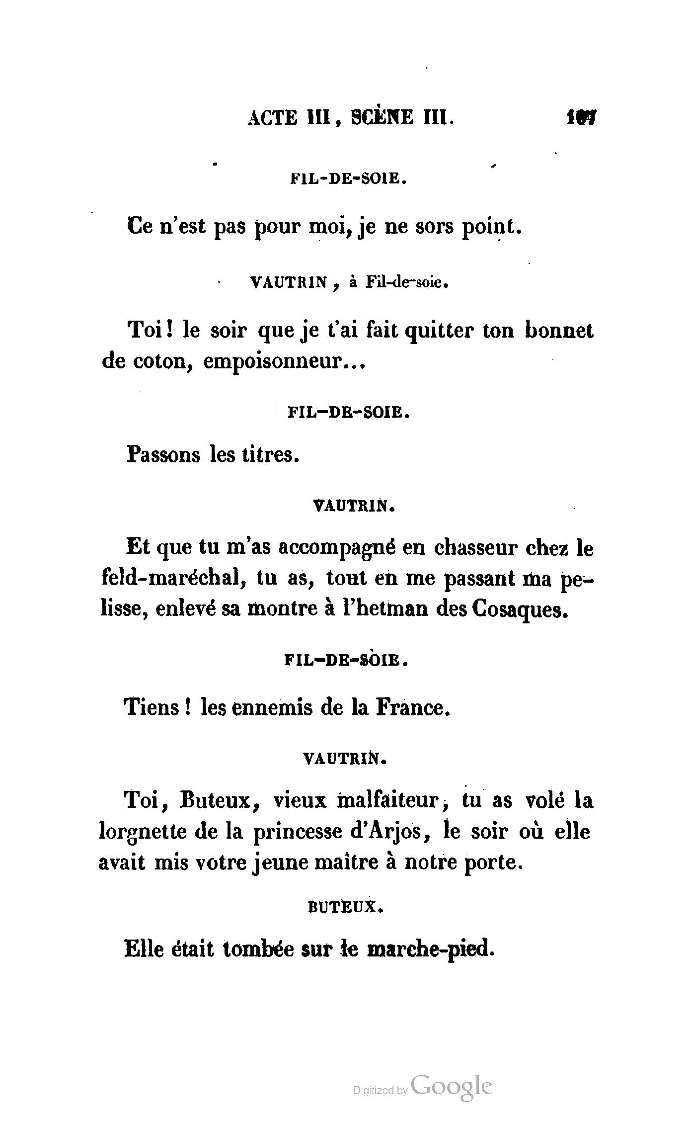 Chez vous, Monsieur le duc, laissez passer la justice du roi. C’est une affaire entre ces Messieurs et moi. (Au commissaire.) Je vous suis. (À la duchesse.) C’est Joseph qui les amène ; il est des nôtres ; renvoyez-le.