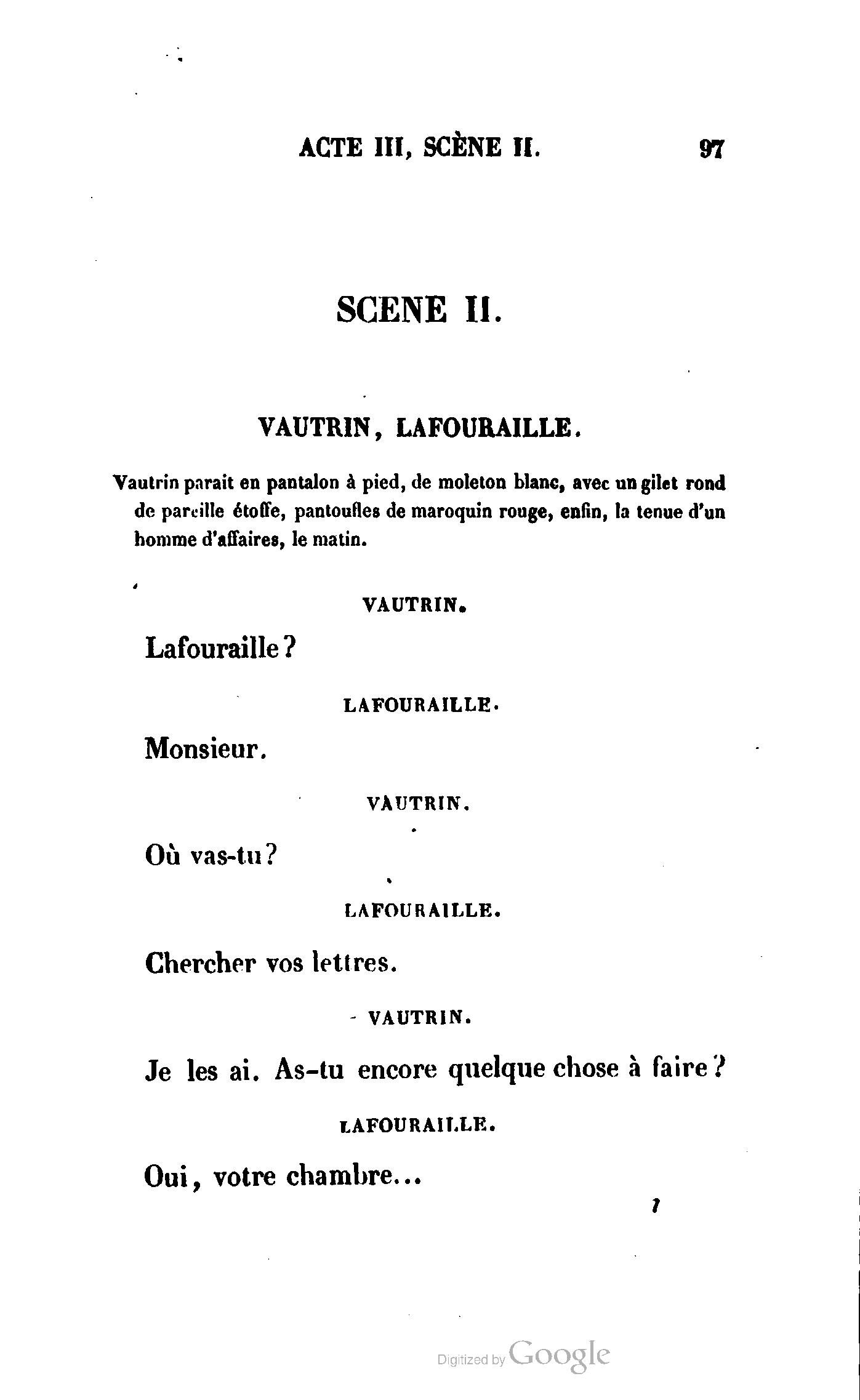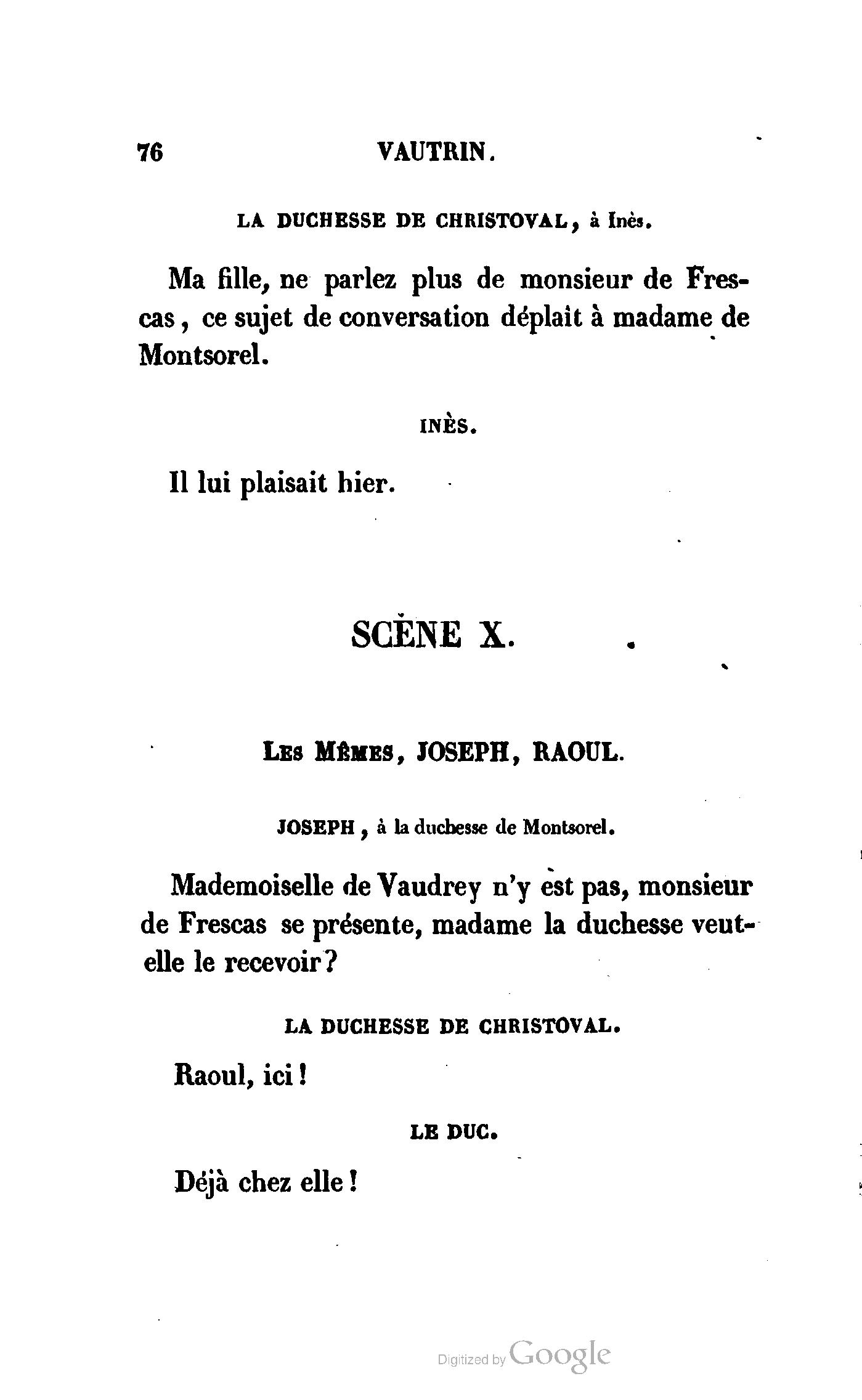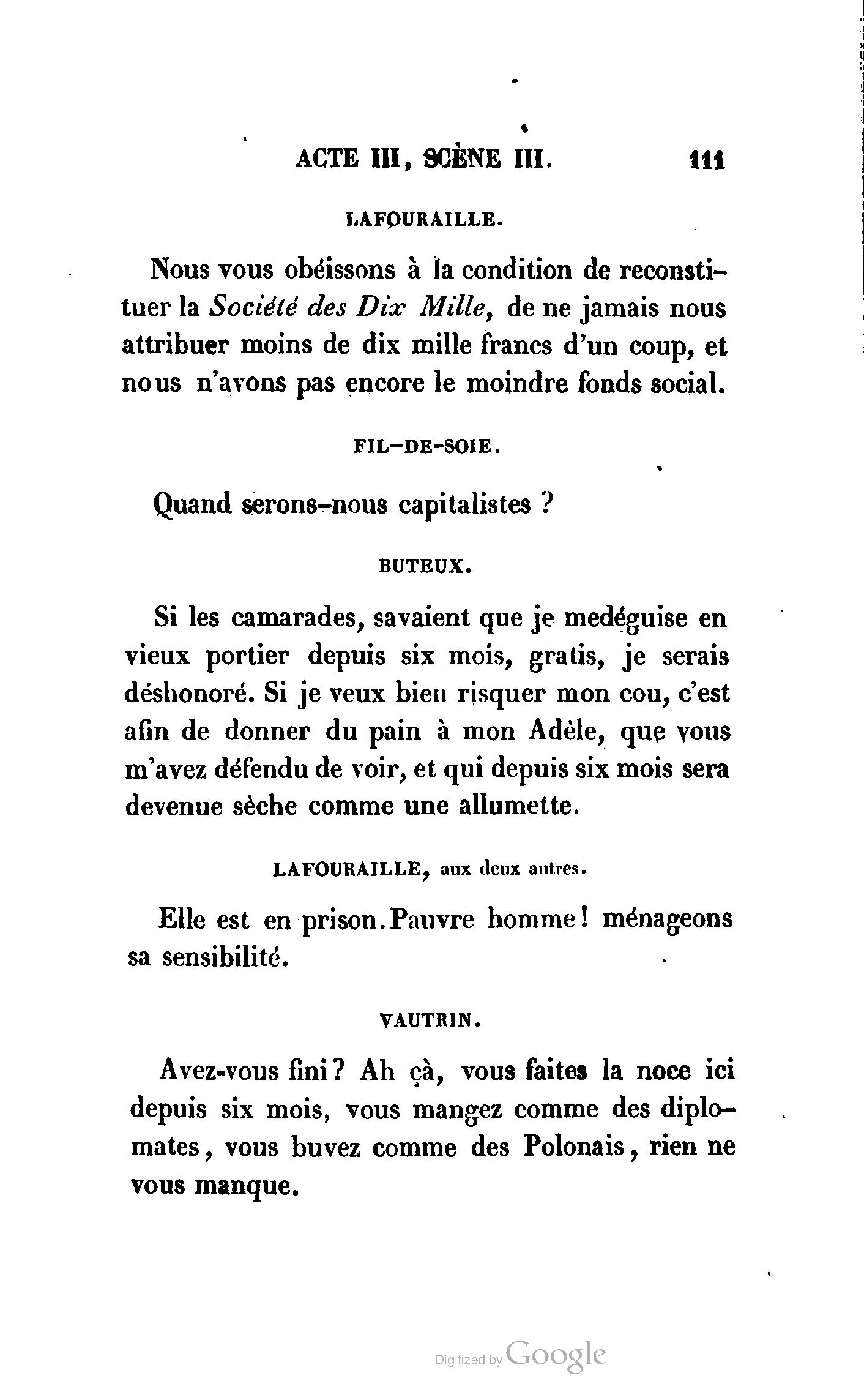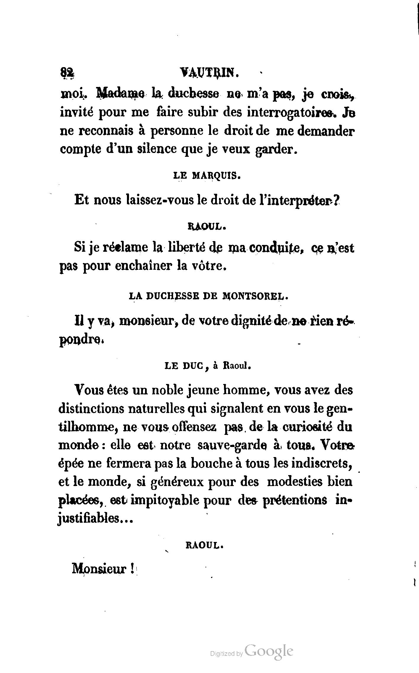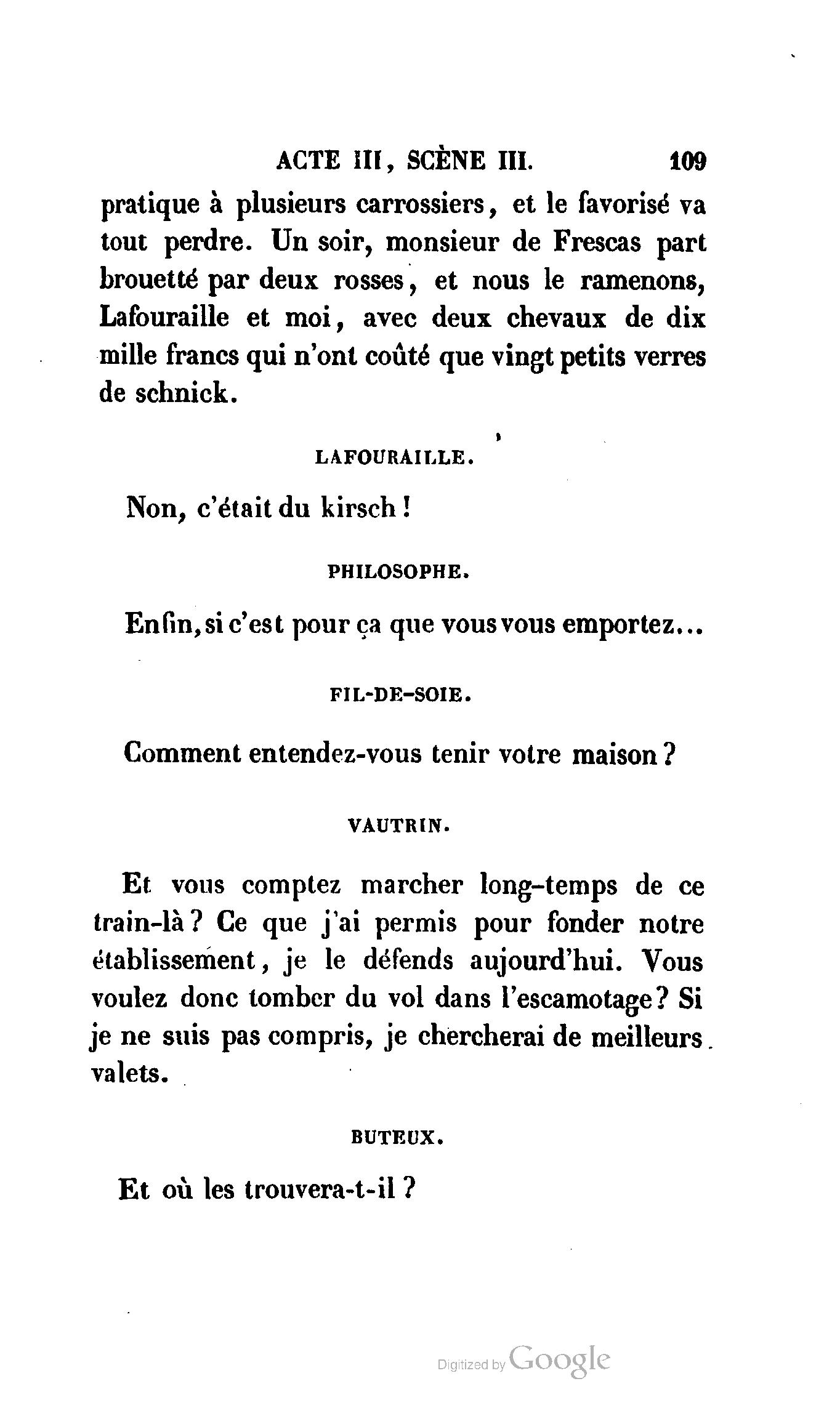 Chez vous, Monsieur le duc, laissez passer la justice du roi. C’est une affaire entre ces Messieurs et moi. (Au commissaire.) Je vous suis. (À la duchesse.) C’est Joseph qui les amène ; il est des nôtres ; renvoyez-le.