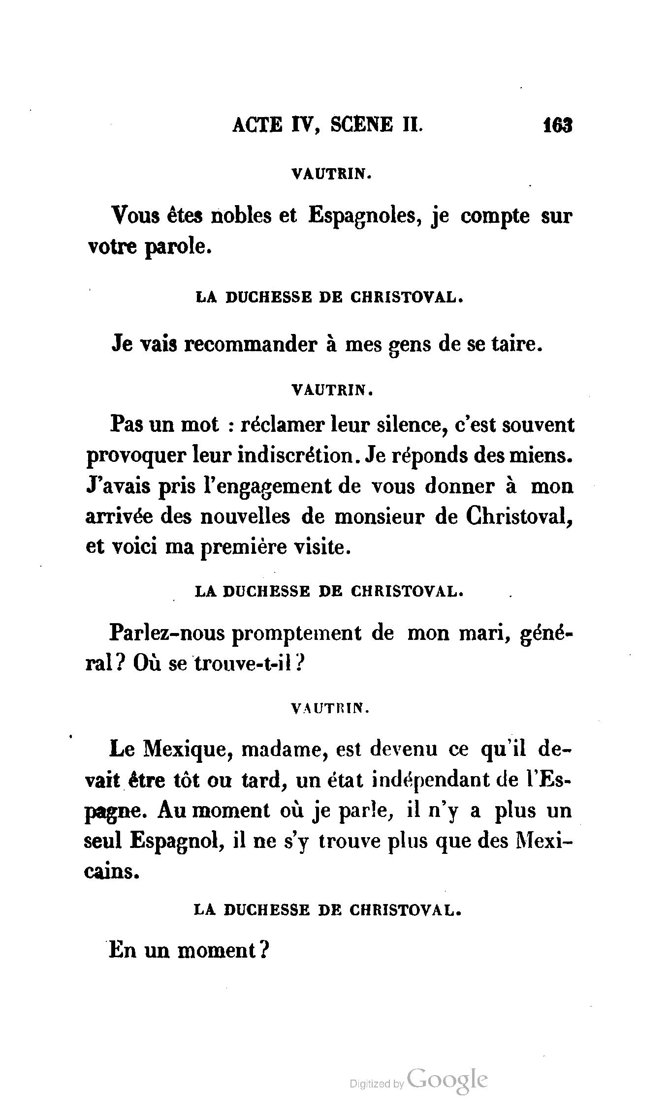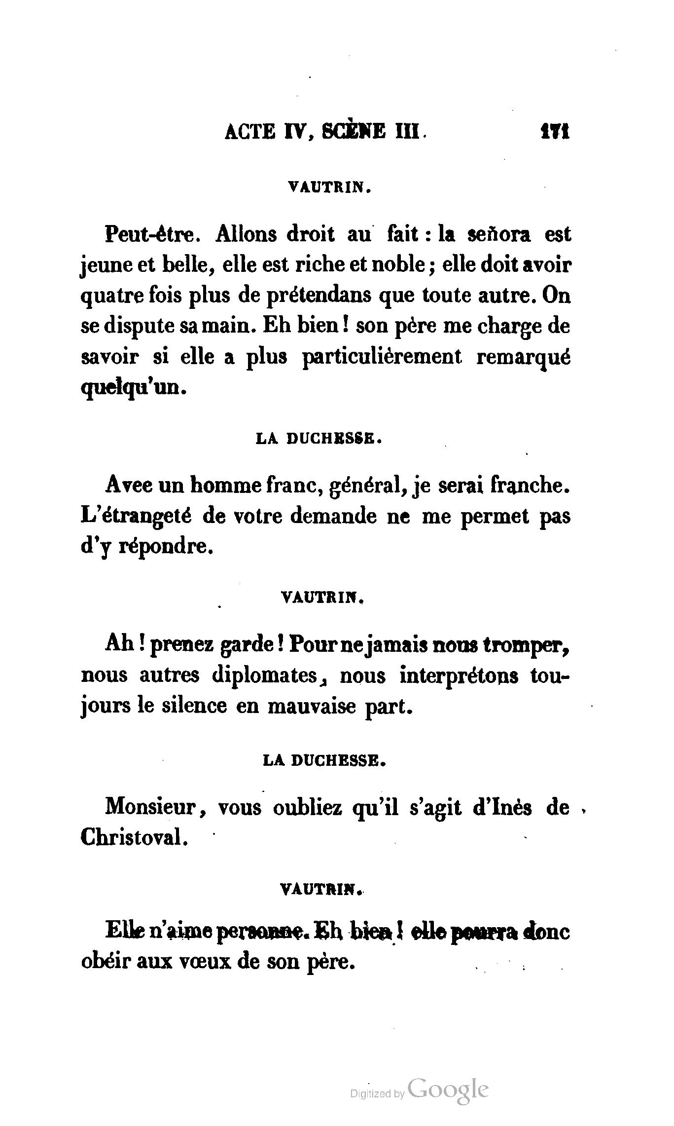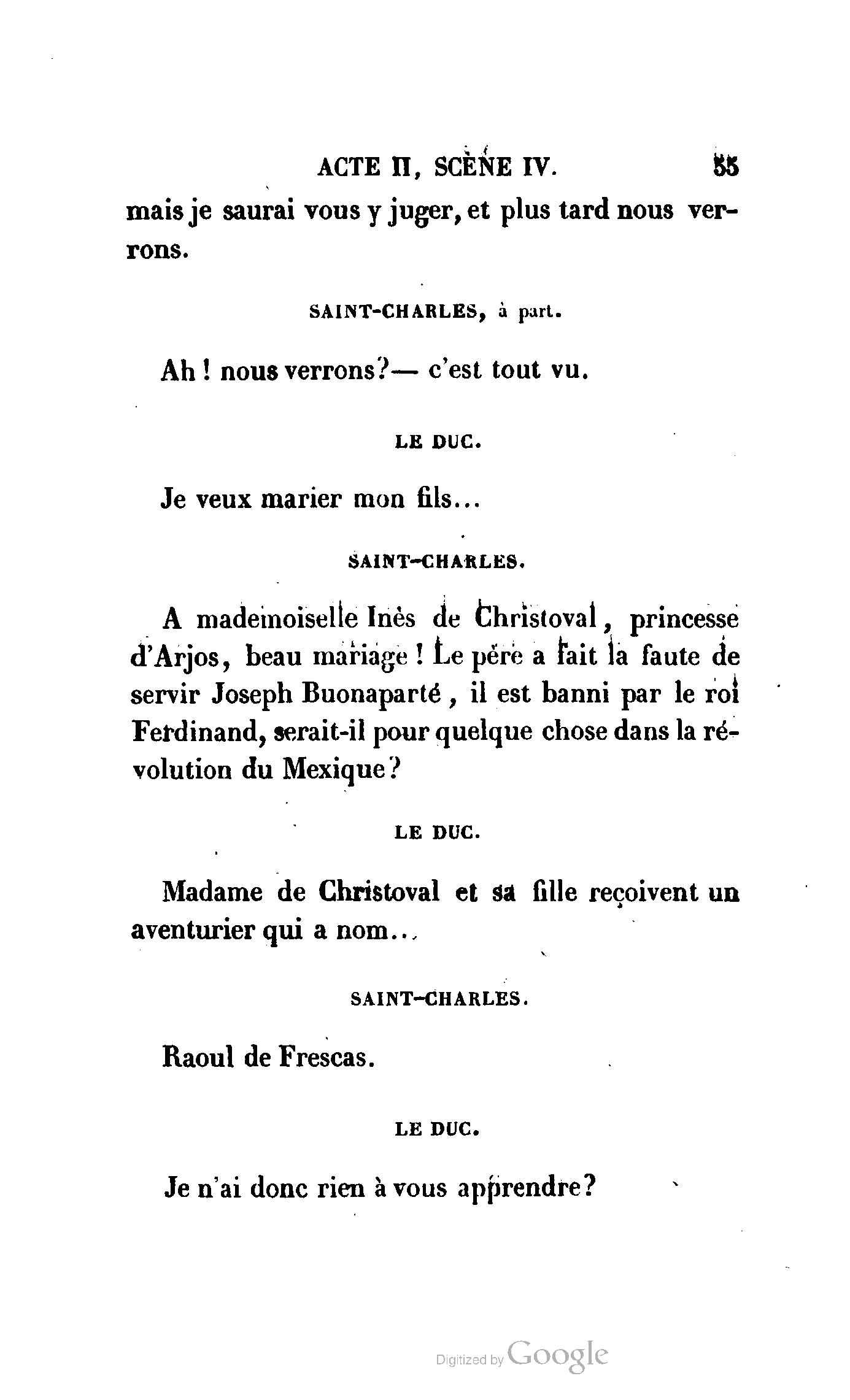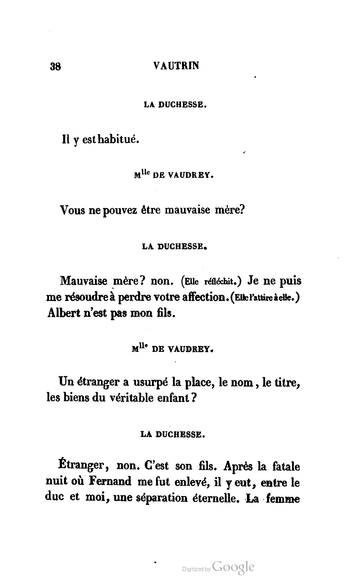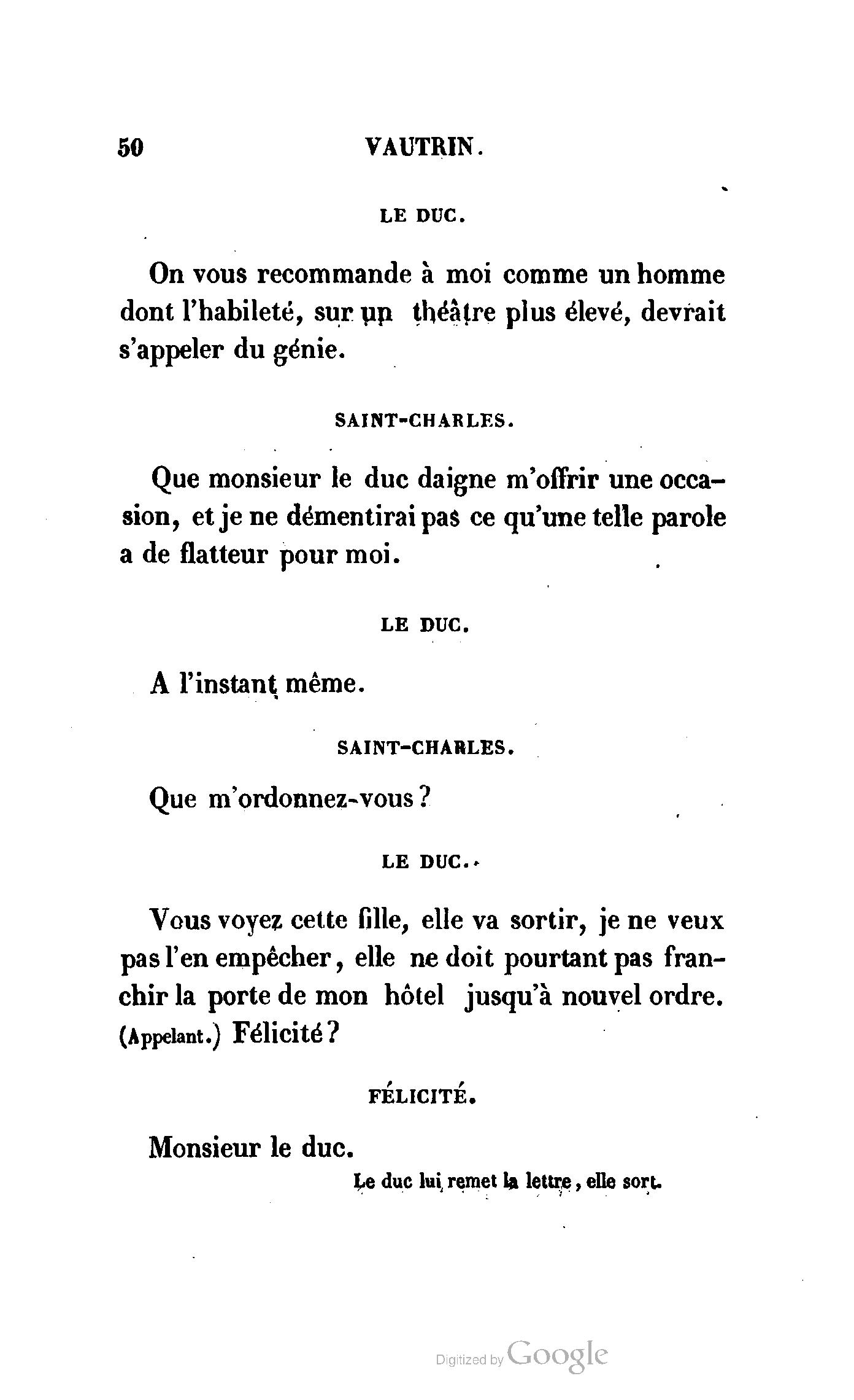 Chez vous, Monsieur le duc, laissez passer la justice du roi. C’est une affaire entre ces Messieurs et moi. (Au commissaire.) Je vous suis. (À la duchesse.) C’est Joseph qui les amène ; il est des nôtres ; renvoyez-le.